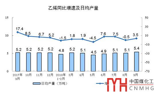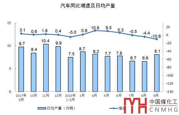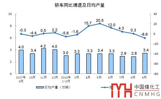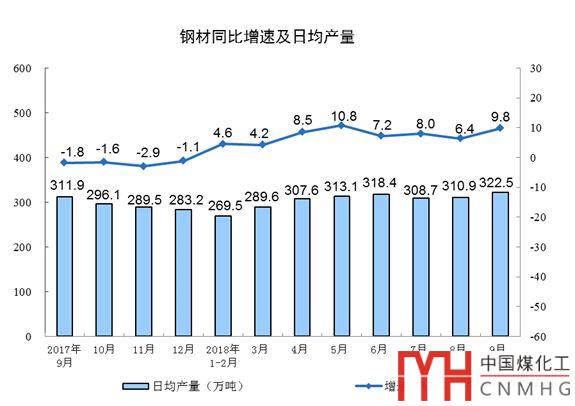 分產(chǎn)品看,9月份,596種產(chǎn)品中有324種產(chǎn)品同比增長。其中,鋼材9675萬噸,同比增長9.8%;水泥20781萬噸,增長5.0%;十種有色金屬456萬噸,增長5.8%;乙烯161萬噸,增長3.5%;汽車242.6萬輛,下降10.6%;轎車102.8萬輛,下降8.6%;發(fā)電量5483億千瓦時,增長4.6%;原油加工量5134萬噸,增長4.9%。