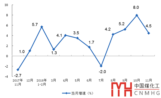 11月份,原煤產(chǎn)量3.2億噸,同比增長4.5%,比上月回落3.5個百分點(diǎn);日均產(chǎn)量1051萬噸,達(dá)到2015年12月以來最高水平。1-11月份,原煤產(chǎn)量32.1億噸,同比增長5.4%。