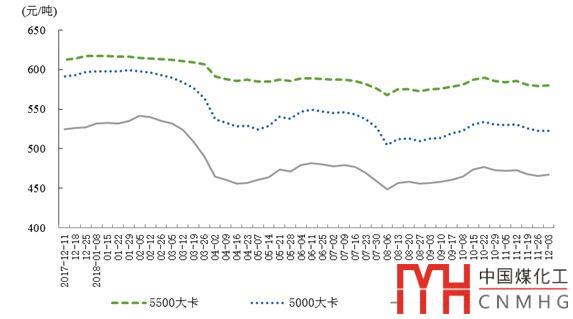 12月初,秦皇島港5500大卡煤炭綜合交易價格為每噸580元,比11月初下跌4元;5000大卡煤炭為每噸523元,下跌7元;4500大卡煤炭為每噸467元,下跌5元。