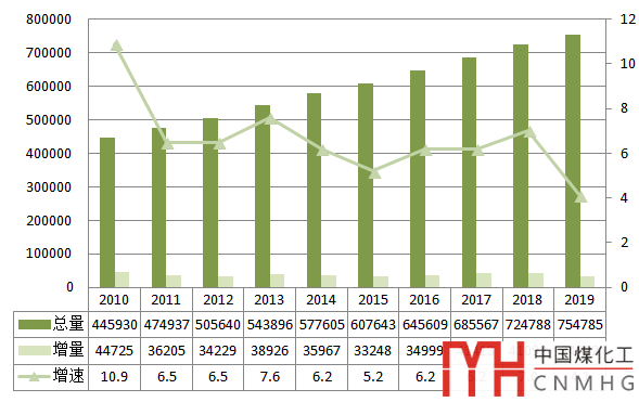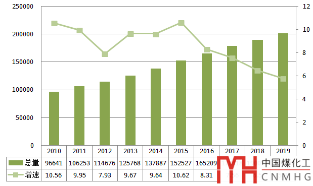 圖7 2010~2019年全國電力裝機及增速情況(單位:萬千瓦,%)