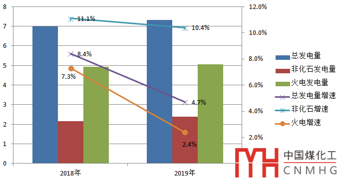 圖9 2018~2019年全國發(fā)電量及增速情況(單位:萬億千瓦時,%)