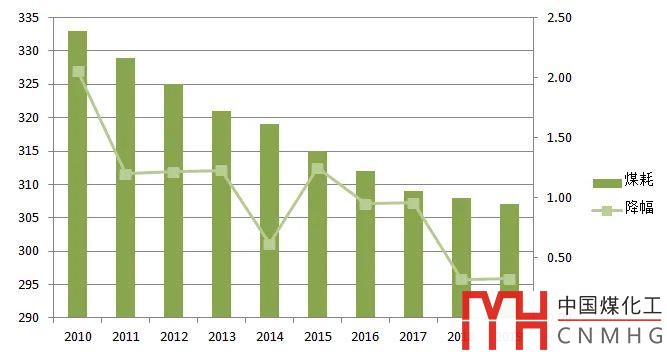 圖29 2010~2019年供電煤耗和降幅(單位:克/千瓦時,%)