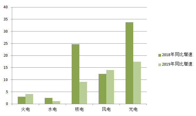 從裝機增速看,2019年,火電裝機同比增長4.1%,較2018年高出1.1個百分點。風電裝機同比增長14%,較2018年增速高出1.6個百分點。光伏發(fā)電、核電裝機雖仍以17.4%、9.1%的速度增長,但較上一年增速大幅下降,分別減少16.3、15.6個百分點。水電裝機同比增長1.1%,較2018年降低1.4個百分點。