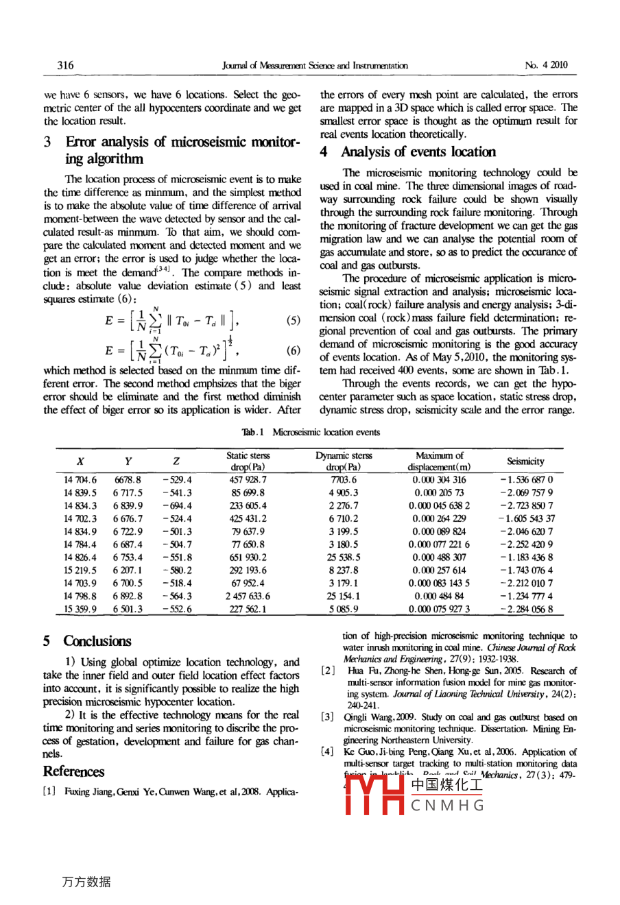 Vo. 1 No 4, Dec. 2010Journal of measurement science and InstrumentationSum No. 4Microseismic Monitoring Data Fusion Algorithmand Coal and Gas Outbursts PredictionZhi-gang ZHAO(趙志剛), Yun-liang TAN(譚云亮)Key Laboratory of Mine Disaster Prevertion and Control, Shandong University of science and Technology, @ingdao 266510, China)Abstract-The prediction study on coal and gas outbursts is carried with the microseismic information. In this paper, the mi-out by monitoring some indices which are sensitive to the initiation of coseismic monitoring data fusion algorithm and the prepal and gas outbursts. The values and changing rules of the indices diction method of coal and gas outbursts are studiedare the foundations of coal and gas outbursts prediction. But noonly the data of one key monitoring station is used in the coal and gas 2 Principle of microseismic monitoring lo-outbursts prediction practice, and the other data are ignored. In orderto overcome the human factor and make full use of the monitoring incationformation, the technique of multi-sensor target tracking is proposed toThe principle of microseismic monitoring location isseismic events, the activities of geological structure, fracture-depth of that: the sensors array is set up in the monitoring areastudies indicate that it is considerably possible to predict the coal and the signal can be pickup by the sensor and the signal isgas outbursts using microseismic monitoring with its inherent ability switched to voltage or electric charge; determine the ar-to remotely monitor the progressive failure caused by miningrival moment of signal, substitute the sensor coordinateKey words -aal and gns outbursts: microseismic monitoring: data and wave velocity into eqution groups; solve the equationand get the space- time parameters of hypocenterr:1674842(2010)040315Least squares method is a classic location algorithm,in which the equation group(1)is established according todio:10.399jisn.16748042.2010.04.03the signal arrival moment and the hypocenter location is1 Introduction(X1-X0)2+(Y-Y0)2+(Z-z0)2Coal and gas outburst is a dynamic phenomenon inV2×(T-T0)2coal exploitation, which causes great casualty and property Where X,, Yi, Z, is the number i sensor position; V,is thedamage. The damage caused by coal and gas outburst will wave velocity at number i sensor; T, is the signal arrivalbe more serious in deeper mining. It is very important to moment; Xo, Yo, Zo is the position of hypocenter; T; ispredict the occurance of coal and gas outbursts precisely the crack momentfor mine safety. There are many prediction methods forIf there are five sensors receive effective signal, thencoal and gasoutbursts, among them, method of drilling(x1-x)+(y1-y)2+(x1-z)2=v2x(t-t)2,bits, AE monitoring method and electromagnetic radiation(x2-x)2+(y2-y2+(x1-z)2=v2x(t;-t)2monitoring method are based on in-situ monitoring; and(x3-x)2+(y-y)2+(z1-z)2=v2×(t1-t)2,(2)the prediction is conducted through the analysis of data(x4-x)2+(y-y)2+(x1-z)2=v2x(t;-t)2and change rule for indices sensitive to coal and gas out(x3-x)2+(y-y)2+(x1-x)2=v2x(t-t)Eliminate the x.x, 2, t, then we can get the linTo hold the integrate situation about gas and coalear transcendental equationmass, multi-stations of seismic monitoring are set in genar+ by+a +d, t=eeral, and there are several groups of information available where a, b,, d,, e, are the coefficients.Letbout coal mass evolution. But only one key monitoringdata of the monitoring station instead of the others can bea, b ci dused to the prediction model at the same time in coal and2 b2 C2 da3 b3 c d,x=yBgas outbursts at present, so we have to select one repree3sentative key station to predict the occurance of coal andgas outbursts. In order to overcome the human factor andThen equation (3)is equal as AX= B, solve themake full use of the monitoring information, correspond- equation using least squares method and thening with the mobility of coal mass microseismic, the techBnique of multi-sensor target tracking is proposed to deal中國煤化工Ce 5 locations and ifCNMHGs Received: 2010-10-08Corresponding author: Zhi-gang ZHA316Jarmal of measurement Science and InstrumentationN.42010we have 6 sensors, we have 6 locations. Select the geo- the errors of every mesh point are calculated, themetric center of the all hypocenters coordinate and we get are mapped in a 3D space which is called error space. Thehe location resultsmallest error space is thought as the optimum result3 Error analysis of microseismic monitor-real events location theoreticallying algorithm4 analysis of events locationthe time difference as minmum, and the simplest method used in coal mine. The three dimensional images of roadis to make the absolute value of time difference of arrival way surrounding rock failure could be shown visuallymoment-between the wave detected by sensor and the calthrough the surrounding rock failure monitoring. throughculated result-as minmum. To that aim we should comthe monitoring of fracture development we can get the gaspare the calculated moment and detected moment and we migration law and we can analyse the potential room oftion is meet the demand 34 The compare methods in- coal and gas outburstsThe procedure of microseismic application is micro-clude:absolute value deviation estimate (5)and least seismic signal extraction and analysis; microseismic loca-squares estimate(6)tion; coal( rock)failure analysis and energy analysis; 3-diE‖To-T。(5) mension coal (rock )mass failure field determination; re-gional prevention of coal and gas outbursts. The primarywhich method is selected based on the minmum tim (6) demand of microseismic monitoring is the good accuracyE=N∑(T0-T)2of events location. As of May 5, 2010, the monitoringferent error. The second method emphsizes that the bigerThrough the events records, we can get the hypoerror should be eliminate and the first method diminish center parameter such as space location, static stress dropthe