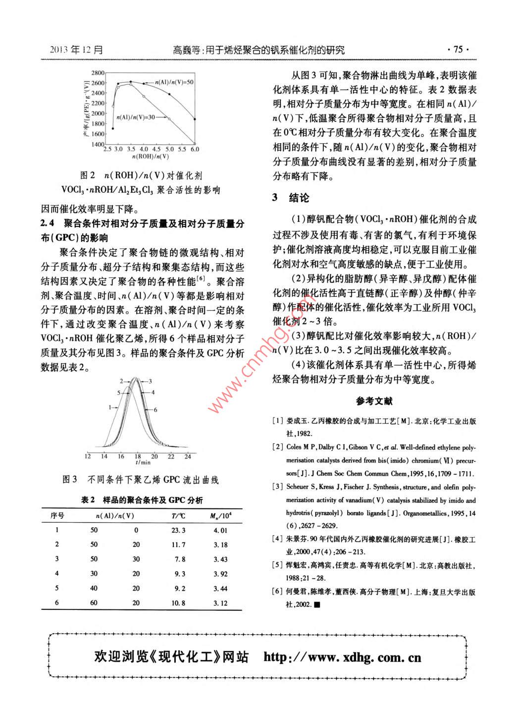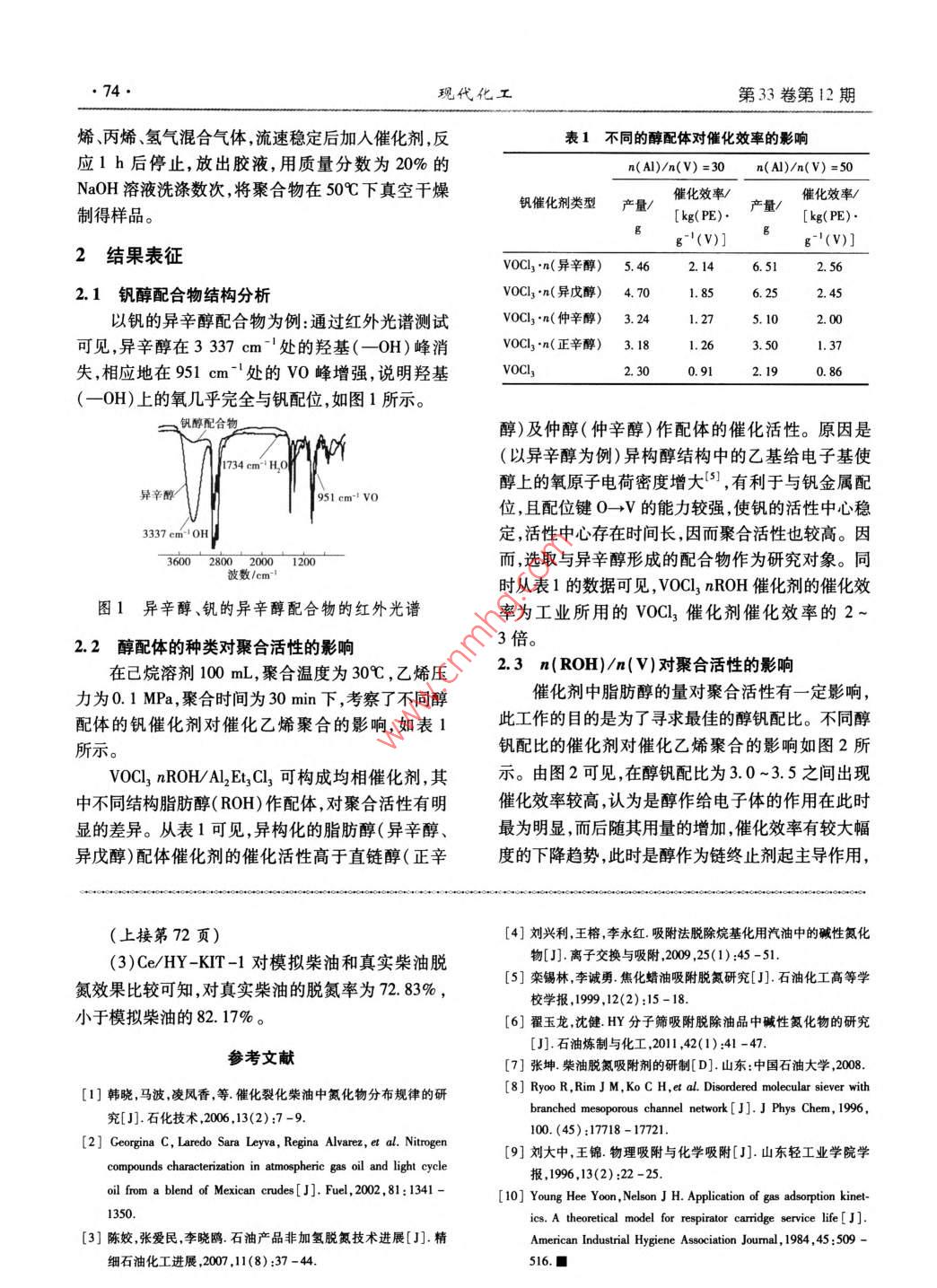 第33卷第12期現(xiàn)代化工Dee.20132013年12月\lodem Chenical iudustn73.用于烯烴聚合的釩系催化劑的研究高巍',張春英”,呂云霞',張學(xué)全*(1.吉林建筑大學(xué)城建學(xué)院,吉林長春130111;2.中國石油吉林石化研究院,吉林吉林132021;3.長春工業(yè)大學(xué),吉林長春130012;4.中科院長春應(yīng)用化學(xué)研究所,吉林長春13022)摘要:以V20s為原料,飽和烷烴為溶劑脂肪醇為萃取劑,采用錯流萃取方法獲得穩(wěn)定的飽和烷烴釩(V)配合物溶液,直接用作烯烴主要是乙丙橡膠聚合的催化劑。研究表明此制備方法條件溫和成本低,適合大規(guī)模工業(yè)制備.且用于烯烴聚合具有比工藝催化劑更好的催化性能。關(guān)鍵詞:乙丙橡膠;釩系催化劑;醇釩配合物;聚合活性中團(tuán)分類號:TQ316.1文獻(xiàn)標(biāo)志碼:A .文章編號:0253 - 4320(2013)12 -0073 -03Study on vanadium-based catalyst for olefin polymerizationGAO Wei , ZHANG Chun-ying , LV Yun-xia', ZHANG Xue-quan*(1. City College , Jilin Architectural and Civil Engineering Institute, Changchun 130111, China;2. Petro China Jilin Petrochemical Company Research Institute , Jilin 132021, China;3. Changchun University of Technology, Changchun 130012, China;4. Changchun Institute of Applied Chemistry, Chinese Academy of Sciences, Changchun 130022, China)Abstract: The stable saturated alkane-vanadium ( V) complexes solution can be obtained via cross-low extractionmethod using V2O3 as raw material , saturated alkane as the solvent, fatty alcohol as extracting agent, which can beemployed as a catalyst for olefins , espeially ethylene propylene rubber polymerization. This method takes advantage ofthe mild preparation conditions , low cost and better catalytic performance than process catalysts for olefin polymerization.It is suiable for large-scale industrial preparation.Key words: ethylene propylene rubber; vanadium-based catalyst; alcohol vanadium complexes; polymerizationactivity目前,乙丙橡膠工業(yè)化生產(chǎn)主要采用V-AI劑能溶于己烷,催化活性高于VOC],制備成本低、(釩-鋁)催化體系,此催化劑體系經(jīng)歷了V-A1、V-環(huán)境友好、穩(wěn)定的釩醇配體催化劑。Al-活化劑和V-Al-載體三代催化體系的演變過1實驗部分程,技術(shù)比較成熟。雖然存在催化效率較低,工藝過程需脫除殘留催化劑等不足,但在Ziegler-Natta聚1.1醇釩配合物 ( Voal, nROH)催化劑的合成合中”,釩系催化劑能夠產(chǎn)生窄相對分子質(zhì)量分布.1.1.1 原料的高相對分子質(zhì)量的聚合物,乙烯/a -烯烴共聚時,V2O, ,分析純,北京化工廠生產(chǎn);已烷,分析純,聚合物中a-烯烴含量較高,共聚物有較均勻的序列臺灣齊美公司生產(chǎn);鹽酸,分析純,北京化工廠生產(chǎn);分布,共聚上的獨特能力使其非常適合用于彈性體乙醇,分析純,北京化工廠生產(chǎn);濃H,SO,分析純,的合成(2-31。為此各大公司竟相開發(fā)新型的釩系催北京化工廠生產(chǎn);K2MnO, ,分析純,天津市化學(xué)試劑化劑|4)。一廠生產(chǎn);異辛醇,分析純,北京益利精細(xì)化學(xué)品有吉林化學(xué)工業(yè)公司是我國乙丙橡膠生產(chǎn)的主要限公司生產(chǎn)。廠家,生產(chǎn)工藝采用的是日本三井公司專利,催化劑1.1.2醇釩配合物的制備為VOCl; ,每年從日本進(jìn)口VOCl,價格昂貴,而且受將2.5 g V20, 用NaOH(10%)或Na2CO,制于人。VOCl,具有一個最重要的性質(zhì)是對水非常(10%)溶液溶解為釩酸鈉溶液,控制溶液pH在敏感,極微量的水分都會使之分解,生成大量氯化氫8 ~9,V( V )以NaVO,形式存在,此溶液中加入HCI氣體和五氧化二釩的紅粽色粉塵,對人體極為有害。80 mL可獲得VOCl,溶液。另外,VOCl3是由V20s高溫氯化制得,大量使用氯.2 乙烯-丙烯共聚合實驗氣不僅損害操作人員的健康,并且造成嚴(yán)重的環(huán)境在5L高壓釜中進(jìn)行聚合反應(yīng),聚合釜經(jīng)抽真污染?;诖斯P者開發(fā)了以V203為原料,且催化空、氮氣置換后加入已烷(1 000 mL), 然后通人乙收稿日期:2013 -08 -30作者簡介:高巍(1977- ),女,碩土研究生,講師,主要從事高分子材料及基礎(chǔ)化學(xué)的研究與教學(xué)jzgaowei@e 163. com?!?4.現(xiàn)代化工第33卷第12期烯、丙烯、氫氣混合氣體,流速穩(wěn)定后加入催化劑,反表1不同的醇配體對催化效率的影響應(yīng)1 h后停止,放出膠液,用質(zhì)量分?jǐn)?shù)為20%的n(A)/n(V) =30n(A1)/n(V) =50NaOH溶液洗滌數(shù)次,將聚合物在50C下真空干燥催化效率/制得樣品。釩催化劑類型產(chǎn)量/[kg( PE).[kg(PE).gg~"'(V)]g~'(V)]2結(jié)果表征VOCl,.n(異辛醇) 5.462.146.512. 562.1釩醇配合物結(jié)構(gòu)分析VOCl3.n(異戊醇)4.701.856.252.45以釩的異辛醇配合物為例:通過紅外光譜測試VOCl;.n(仲辛醇)3. 241. 275.102.00可見,異辛醇在3337 cm~處的羥基(- -OH)峰消VOCl3 °n(正辛醇)3. 181.263.501.37失,相應(yīng)地在951 cm-'處的VO峰增強(qiáng),說明羥基VOCl,2. 300.912.190.86(-0H).上的氧幾乎完全與釩配位,如圖1所示。、釩醇配合物醇)及仲醇(仲辛醇)作配體的催化活性。原因是(以異辛醇為例)異構(gòu)醇結(jié)構(gòu)中的乙基給電子基使1734 cm'! HO醇_上的氧原子電荷密度增大'5],有利于與釩金屬配異辛醇951 cm! vo位,且配位鍵0-→V的能力較強(qiáng),使釩的活性中心穩(wěn)33 em-oH定,活性中心存在時間長,因而聚合活性也較高。因3600 2800 2000 1200而,選取與異辛醇形成的配合物作為研究對象。同波數(shù)/cm-時從表1的數(shù)據(jù)可見,VOCl, nROH催化劑的催化效圖1異辛醇、釩的異辛醇配合物的紅外光譜率為工業(yè)所用的VOCl, 催化劑催化效率