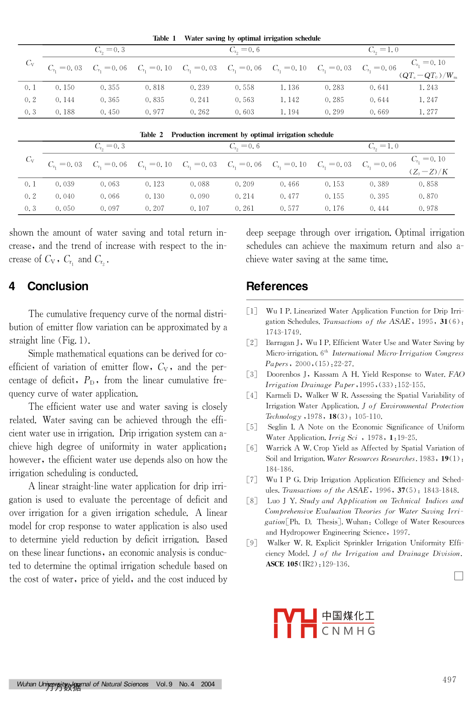 Vol.9 No. 42004 493-497WUJNSWuhan University Journal of Naturai SciencesArticle ID: 1007-1202(2004)04-0493-05The Effect of Water Saving and ProductionIncrement by Drip Irrigation Schedules0IntroductionC ] QIU Yuan-feng, LUO Jin-yaot,MENG GeState Key Laboratory of Water Resources and Hydropowerhe irrigation schedule of drip irrigation system is aEngineering Science, Wuhan University, Wuhan 430072,Hubei, Chinafunction of water requirement, the output of the irri-gation system, the allowed deficit condition and the irriga-tion application eficiencyI"]. The irigation application effi-Abstract: Drip irigation system can achieve high uniformity.When the system is designed for uniformity cofficient equal orciency is determined from the emitter flow variation of themore than 70%,the water application in the field can be ex-drip irigation system and the allowable deficit of water ap-pressed as a normal distribution and further simplfied to a linearplication. The total emitter flow variation that is mainly af -distribution. This paper will describe the irrigation schedulingparameters, percent of deficit, application efficiency and coffi-fected by hydraulic design and manufacturer’ s variation cancient of variation by simple mathematical model. Using this ef-be considered as a normal distribution [1.2]. This can befective model and the irrigation application, the total yield affect-justified when the manufacturer's variation is normally dis-ed by the total water application for different uniformity of irri-gation application can be determined. More over, this paper usestributed and the hydraulic variation contributes only a smallthe cost of water, price of yield, uniformity of the drip irigationportion in the total variationl2. In 2000,the study of tes-system, crop response to water application and environmentalting normality of drip irrigation emitter flow through a com-concerns of pollution and contamination to determine the optimalirrigation schedule. A case study shows that the optimal iriga-puter simulation of about 2000 combinations showed thattion schedule can achieve the effect of water saving and produc-the emitter flow can be presented as normal distribu-tion increment compared with the conventional irrigation scheduletion[2.3]. The cumulative frequency curve of the normal dis-in which the whole field is fully irrigated.Key words: drip rrigation;linear cumulative frequency curve;tribution shows that a percentage of area receives irrigationoptimal irrigation schedule; water saving ; production incrementequal or less than a given depth of water. With a known re-CLC number: TV 139. 1quired irrigation application, this curve can indicate the are-as over irrigated and under irrigated. This curve can beused to evaluate application efficiency for drip irrigation aswell as sprinkler irigation-31. The curve from a normal dis-tribution can be approximated by using a straight line 41.This linear cumulative frequency curve offers a direct andReceived date: 2003-05-16easy solution of irrigation application efficiency and schedu-Foundation item: Supported by the National Natural Science Foundationof China (59379407)ling5]. This paper is a further evaluation of this approachBiography: QIU Yuan feng(1973-), male, Ph. D, research direction:of linear中國煤化工r distribution and willwater saving rrigation theory and techniques. E- mail: yfqiu @ wuhee.edu. cnuse the li片CNMHGurvetomakeananaly-t To whom correspondence should be addressed. E-mail: Luojy@ wuhee.sis on the effect of water saving and production incrementdu. cnby drip irrigation. .493Wuhan Unprpys數(shù)rnal of Natural Sciences Vol.9 No.4 20041 Material Methodsferent cofficient of variations can be plotted by calculat-ing b from Eq. (2). As shown in Fig. 2, two parametersDrip irigation system can achieve high uniformity.a and b can be used to characterize the linear cumulativeWhen the system is designed for a cofficient of variation,frequency straight line; a+b is the intercept and b is theCv,equal or less than 30% or uniformity coefficient,slope. When a required relative depth X is superimposedUc,equal or more than 70%,the water application inon Fig. 2, the percent area fully irrigated, the deficit are-the field can be expressed as a normal distribution anda,the percent of deficit and irrigation efficiency can befurther simplified to a linear straight line distributionE6] .calculated. A linear equation can be used to express theThe cumulative frequency curve of a normal distributionstraight line .for the coefficient of variation (Cv) as0. 1 is plotted di-X= (a+b)-bPx(4)mensionless as shown in Fig. 1. The dimensionless plotwhere X is a depth ratio and a, b are two cofficients andshows the relationship between the percent of area PAPA is the percent of area.and the relative irrigation depth X which is the ratio ofFromFig.2,itcanbeseenthataandbcanbethe amount of water required for the maximum yield tcexpressed by the following equationthe total amount of water application. A linear cumula-a= 1-6/2tive frequency straight line is drawn for the same CvThe percent of area under deficit can be shown as(0.1) and superimposed on the curve in Fig. 1. It is(1- PA) and expressed ashoped that the straight line can approximate the curve.Ap= (x-a)/bThe linear cumulative frequency is produced from awhere Ap is the percent area under deficit. The percentuniform frequency distribution whose density function isof deficit by volume can be expressed as,rectangle. The cumulative frequency is a straight linePr= (x- a)2/(26X)(7)shown in Fig. 2 with a minimum value a, a maximumwhere Pp is percent of deficit. The application efficiencyvalue a+b and the slope of the line b. The cofficient ofwhich is defined as the irrigation water store in the zonevariation Cv can be evaluated through the two equal tri-divided by the total amount applied.angles in Fig. 2 by integrating Ox2 along the base, forE= X(1- Pp)(8)simplicity, using the base as t, therefore .' Jwhere E is t
