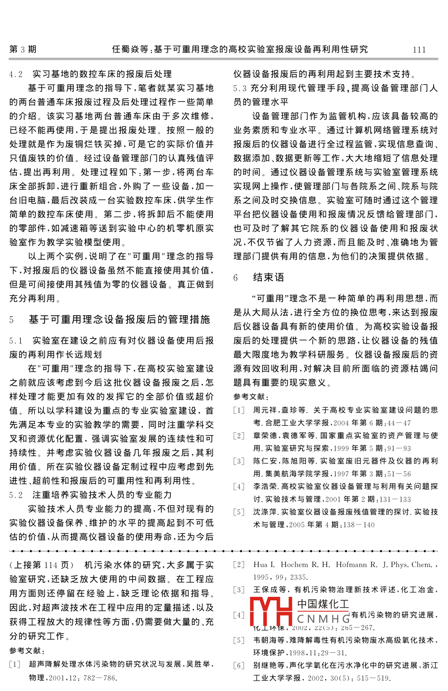第22卷第3期甘肅科技Vol.22 No. 32006年3月Gansu Science and TechnologyMar.2006聲化學技術(shù)在污水處理中的研究許云峰' ,張文玲3(1.蘭州交通大學環(huán)工學院,甘肅蘭州730070;2.河北交通職業(yè)技術(shù)學院,天津300381)摘要:本文對聲化學在污水處理中的研究進展作了綜述,并對此技術(shù)存在的問題和發(fā)展方向進行了討論。關(guān)鍵詞:聲化學;超聲空化;污水處理中圖分類號:TQ016.1 X703現(xiàn)代工業(yè)的快速發(fā)展和城市化的加速,導致水2聲化學在污水處理中的應用現(xiàn)狀體的污染和水資源的短缺,這已成為世界各國普遍存在的問題,控制水體污染,降解污水中的有毒有害聲化學氧化處理廢水是利用超聲空化效應所帶成分以減少對自然水域和城市地下水源的污水,提來的高溫高壓.使幾乎任何污染物在此條件下完全高非飲用水的重復利用率,關(guān)鍵在于水處理技術(shù)方氧化降解。聲化學處理廢水效率很高,但其發(fā)生裝法的研究。-般的工業(yè)和生活污水可以通過組合傳置復雜.且由于高溫引起廢水溫度升高,從而使相應統(tǒng)而得到適當?shù)奶幚?對于難降解的有機污染物廢的冷卻系統(tǒng)復雜化,提高了廢水處理成本5]。聲化水的處理,由于技術(shù)和經(jīng)濟之類的原因還設(shè)有形成學處理利廢水的的發(fā)展仍在實驗室研究所段。完整而有效的治理對策。要使其達到完全無害化,因此,采用超聲技術(shù)處理有機污染物時,其總的不產(chǎn)生二次污染,已成為當前主要的研究目標1。反應結(jié)果與有機物高溫焚燒處理相似,但該技術(shù)不污染水體在超聲的輻照下利用超聲產(chǎn)生的空化效應會將污染物從水中富集,也不受有機物種類和品種來降解水體的污染物,是近幾年來國內(nèi)外研究者關(guān)的限制,是-種正在發(fā)展中的處理有機污染物,特別注的熱點領(lǐng)域之- -[2] 。是處理水中有機污染物的有效方法[8]。1聲化學理論基礎(chǔ)3聲化學在污水處理中的研究方向聲化學(Sonocbemktly)主要是指利用超聲波超聲輻射降解水體中的化學污染物作為近年來加速化學反應和提高產(chǎn)率的一門新興的交叉學科,興起的一個研究領(lǐng)域,目前還處于探索階段,要進-其反應主要源于聲空化效應以及由此引發(fā)的物理和步發(fā)展,還要考慮它的實用性和協(xié)同性[6]化學變化問。超聲空化是指液體中的微小氣泡核在目前對于超聲波降解的研究,多為單組分模擬超聲波作用下被激化,表現(xiàn)為泡核的振蕩、生長、收物系,而實際的污染水體中含有多種污染物,如何開縮及崩潰等一系列動力學過程,該過程是集中聲場展難降解物系的多組分研究,已成為目前研究的一能量并迅速釋放的絕熱過程41。在空化氣泡崩潰的個方向。極短時間內(nèi),空化氣泡及其周圍極小空間范圍內(nèi)出雖然使用超聲波降解水體中化學污染物具有操現(xiàn)熱點,產(chǎn)生高達5000K以上的高溫和5x10°Pa的作簡單、方便等優(yōu)點,但是從經(jīng)濟.上來考慮,與其它高壓,還存在水蒸氣熱解產(chǎn)生的●0H和●H自由水處理的物理方法相比較.仍存在有處理量小、費用基,因此可能發(fā)生直接熱解和自由基反應。此過程高的中國煤化工要提高聲能的利用率并伴生強烈的沖擊波和時速高達400 km/h 的射和降YHCNMHG用超聲空化是聲化學的流,這就為在一般條件下難以實現(xiàn)的化學反應提供主要研究方向.將超聲降解與其它降解方法相結(jié)合,了一種非常特殊的物理環(huán)境,打開了新的化學反應從而產(chǎn)生協(xié)同效應,提高有機物的降解效率。通道。這些極端條件可以直接或間接地使有機物降超聲化學研究在國內(nèi)外已有-些報導,但仍處解4。于探索階段,有關(guān)超聲輻照降解有(下轉(zhuǎn)第111頁)第3期任蜀焱等:基于可重用理念的高校實驗室報廢設(shè)備再利用性研究4.2實習基地的數(shù)控車床的報廢后處理儀器設(shè)備報廢后的再利用起到主要技術(shù)支持。基于可重用理念的指導下,筆者就某實習基地5.3充分利用現(xiàn)代管理手段,提高設(shè)備管理部門人的兩臺普通車床報廢過程及后處理過程作一些簡單員的管理水平的介紹。該實習基地兩臺普通車床由于多次維修,設(shè)備管理部門作為監(jiān)管機構(gòu),應該具備較高的已經(jīng)不能再使用,于是提出報廢處理。按照一般的業(yè)務素質(zhì)和專業(yè)水平。通過計算機網(wǎng)絡(luò)管理系統(tǒng)對處理就是作為廢銅爛鐵買掉,可是它的實際價值并報廢后的儀器設(shè)備進行全過程監(jiān)管,實現(xiàn)信息查詢、只值廢鐵的價值。經(jīng)過設(shè)備管理部門的認真殘值評數(shù)據(jù)添加、數(shù)據(jù)更新等工作,大大地縮短了信息處理估,提出再利用。處理過程如下:第一步,將兩臺車的時間。通過儀器設(shè)備管理系統(tǒng)與實驗室管理系統(tǒng)床全部拆卸.進行重新組合,外購了一些設(shè)備,加一實現(xiàn)網(wǎng)上操作,使管理部門與各院系之間、院系與院臺舊電腦,最后改裝成-臺實驗數(shù)控車床,供學生作系之間及時交換信息。實驗室可隨時通過這個管理簡單的數(shù)控車床使用。第二步,將拆卸后不能使用平臺把儀器設(shè)備使用和報廢情況反饋給管理部門,的零部件,如減速箱等送到實驗中心的機零機原實也可及時了解其它院系的儀器設(shè)備使用和報廢狀驗室作為