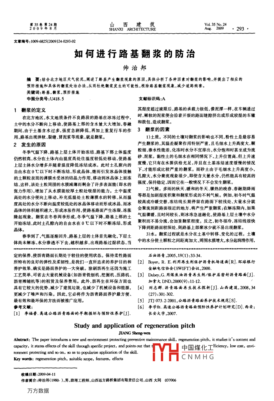 第35卷第24山西建筑2922009年SHANXI ARCHITECTUREAug.2009章編號(hào):10096825(2009)240292瀝再生的研究與應(yīng)用江生文摘要:介紹了一種新穎、環(huán)保的預(yù)防性養(yǎng)護(hù)技術(shù)——瀝再生,對(duì)其組成成分及路用性能進(jìn)行了研究,并通過具體工程實(shí)例闡述了瀝再生技術(shù)取得的效果,指出其具有工效高、成本低、環(huán)保等優(yōu)點(diǎn),以期推廣該技術(shù)的應(yīng)用。關(guān)鍵詞:瀝再生,適用范圍,特點(diǎn),效果中圖分類號(hào):U414.1文獻(xiàn)標(biāo)識(shí)碼:A由于瀝青路面較水泥混凝土路面具有行車平穩(wěn)、不反光、噪最佳時(shí)期。瀝再生改變了以往待路面出現(xiàn)病害影響行車及使用聲低、粉塵少、翻挖方便等優(yōu)點(diǎn)隨著近年工程機(jī)械性能大幅度提功能后再進(jìn)行養(yǎng)護(hù)維修的觀念,而在路面未出現(xiàn)病害或剛出現(xiàn)輕髙,使得路用瀝青材質(zhì)的質(zhì)與性能得到了保證和提高,使近年微病害時(shí)即對(duì)路面進(jìn)行保養(yǎng),使其恢復(fù)路面的彈性及柔韌性,使路新建成的路面及橋面幾乎全部采用了瀝青路面。隨著時(shí)間的推面長期處于較佳的使用狀態(tài)。這正是我們所要追求的養(yǎng)護(hù)效果。移,瀝青路面將會(huì)逐漸硬化失去彈性出現(xiàn)裂縫、坑槽,直至老3瀝再生施工中應(yīng)注意的事項(xiàng)化、嚴(yán)重龜裂,因此瀝青路面需要進(jìn)行養(yǎng)護(hù)。瀝青路面養(yǎng)護(hù)技術(shù)1)安全防護(hù)要到位。因?yàn)榇朔N方法通常要保證車輛正常通可分為修補(bǔ)性養(yǎng)護(hù)與預(yù)防性養(yǎng)護(hù)兩種方式。修補(bǔ)性養(yǎng)護(hù)常常因車的情況下施工,所以施工安全尤其重要。施工現(xiàn)場嚴(yán)格按要求為路面病害零星線長、面廣,較為分散,所以造成施工繁瑣、工效擺放柝志施工人員身著反光安全服佩戴安全眼鏡。低成本高。如何延長瀝青路面的壽命,提高工效,減少維護(hù)費(fèi)用,并使之能長期保持在良好的使用狀態(tài)。這就需要我們采取2)在涂抹瀝再生之前應(yīng)該清除道路表面塵土和其他雜質(zhì)。3)瀝再生只能在路面保持干燥和表面溫度不低于10℃的情種以預(yù)防性養(yǎng)護(hù)為主的養(yǎng)護(hù)方法,而不是等到路面出現(xiàn)病害(甚況下涂抹,同時(shí)切勿在施工現(xiàn)場抽煙或生火。以內(nèi)就穩(wěn)固下來至嚴(yán)重病害)后再進(jìn)行修補(bǔ)性養(yǎng)護(hù)。國外一些發(fā)達(dá)國家早在4)瀝再生通常只涂覆一層,并通常在24h20世紀(jì)60年代已開始進(jìn)行瀝青路面的預(yù)防性養(yǎng)護(hù)技術(shù)。而我國5)瀝再生與黑砂的用量嚴(yán)格控制。則最早于2001年5月在昆明試用一種新型的瀝青路面的預(yù)防性養(yǎng)護(hù)技術(shù)—瀝再生。案例分析1瀝再生簡介2005年7月在山東濟(jì)聊高速公路K10+300~K10+700右瀝再生具有輕微揮發(fā)性氣味,為黑色油狀液體,是一種用于幅段進(jìn)行了瀝再生試驗(yàn)段的施工。實(shí)施前狀況:路段細(xì)小裂縫較瀝青路面的三合一維護(hù)劑,其主要成分為35%~50%的煤焦油多但未形成深層路面的破壞和沉陷、坑槽等病害;路面泛油老32%~42%的石油燕餾液和15%-40%的三合一煤焦油再生劑化外觀較差。(人造樹脂石油乳劑、經(jīng)提煉的煤焦油和主要由煤焦、煤焦油、石具體實(shí)施步驟為油溶劑合成的滲透劑)。瀝再生的技術(shù)參數(shù)如表1所示1)按養(yǎng)護(hù)施工技術(shù)規(guī)范的要求封閉行車道,施工機(jī)械、車輛衰1瀝再生技術(shù)參數(shù)人員進(jìn)場;測試標(biāo)準(zhǔn)參數(shù)要求2)先計(jì)算該路段的瀝再生計(jì)劃用量,試驗(yàn)人員用小毛刷在選ASTM UNO最小1.04定的位置上將瀝再生均勻地涂刷一層,測得每平方米的實(shí)際用量恩式粘度ASTM D1665最小80為0.212kg水體積百分比ASIM D9最大2軾化點(diǎn)ASIM LY6最大653)用空壓機(jī)吹去表面塵土;瀝再生是一種極其高效的具有滲透性的瀝青再生密封劑。4)沿標(biāo)線貼透明膠帶紙,以起到防護(hù)作用;其特點(diǎn)主要有:1)具有抵抗汽油、防水、防化學(xué)品侵蝕和抵抗其他5)施工人員用滾刷以上述試驗(yàn)用量0.212kg/m2刷涂在膠損害性雜質(zhì)影響的特性:2)具有不政變?yōu)r青表面結(jié)構(gòu)就能起到密帶紙范圍內(nèi)的路面封和再生作用的特性;3)能滲透到瀝青表層,變成瀝青層整體的6)人工以0.9kgm2左右的用量施撒黑砂,并用膠輪壓路機(jī)部分,與之共同收縮和膨脹。不像普通表面密封劑那樣易于剝壓實(shí)以縮短開放交通時(shí)間(正常需封閉24h左右);落、開裂和脫層,因而具有較強(qiáng)的溫度適應(yīng)性,十分耐久。它不僅7)封閉交通4h-6h,待表面干燥粘結(jié)后開放交通。是一種高效密封劑而且是一種充滿活性、能滲透瀝青表層,并將5瀝再生的效果瀝青激活的結(jié)合劑,可使瀝青路面表層約15mm厚瀝青的硬化程使用瀝再生后,路面呈均勻黝黑覆蓋層,并在24h內(nèi)穩(wěn)固。度和脆性顯著降低,從而可增強(qiáng)路面的柔韌性和彈性1個(gè)月后滲透深度達(dá)到105cm以上,使原瀝青路面恢復(fù)柔韌性和2瀝再生的適用范圍彈性,并可抵抗外來物質(zhì)的侵蝕保持原有的凝聚性、粘聚性和穩(wěn)路面裂小5m時(shí)使用才能達(dá)到質(zhì)期效果:當(dāng)路面裂不小6結(jié)V凵中國煤化工于5mm時(shí)須