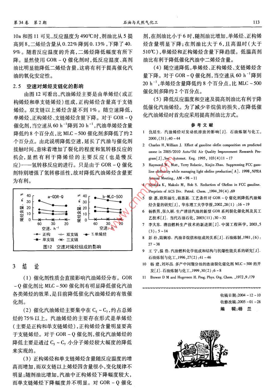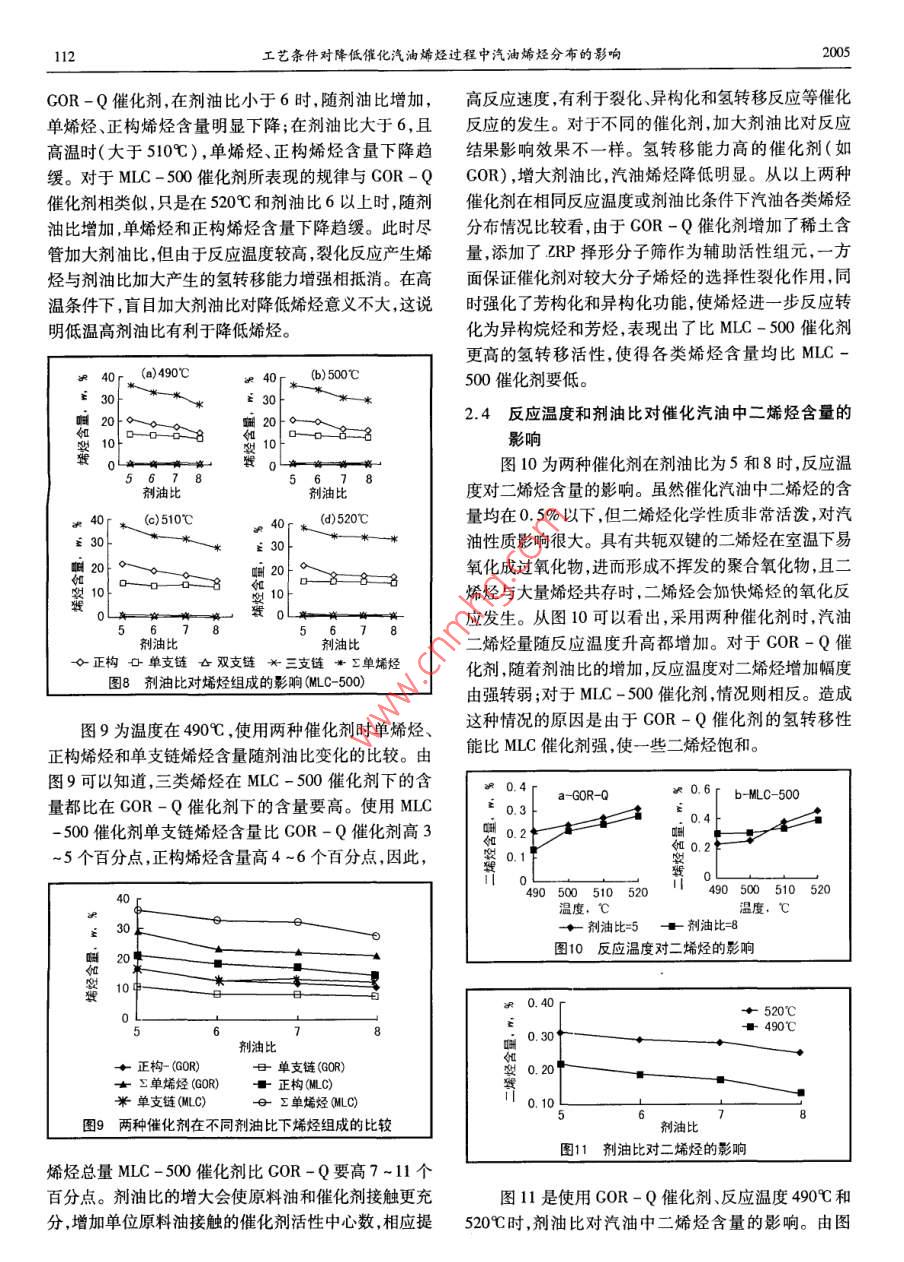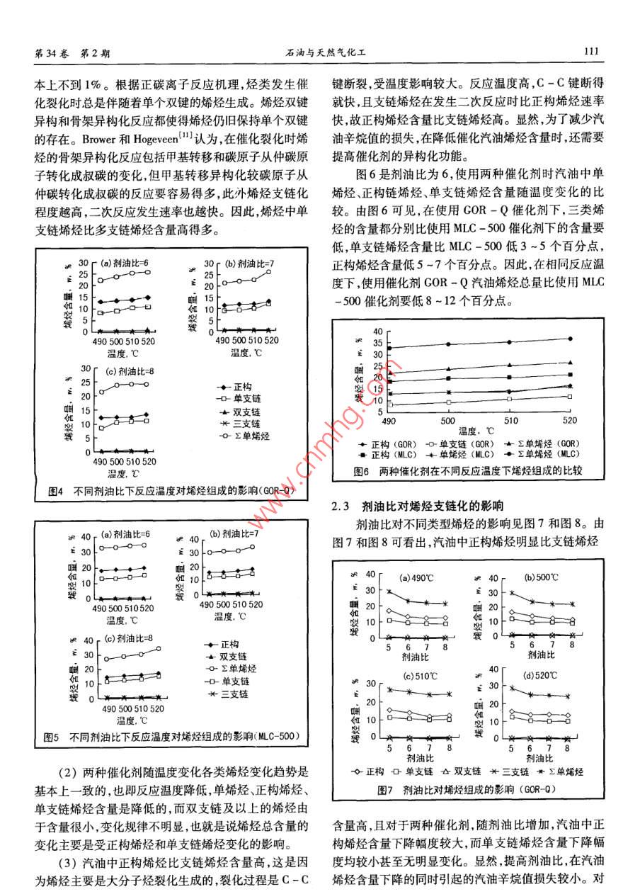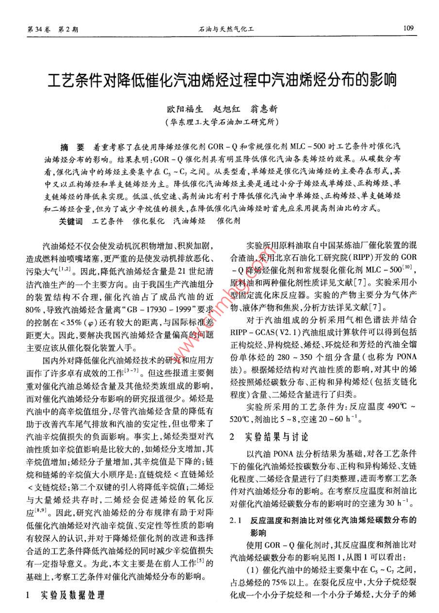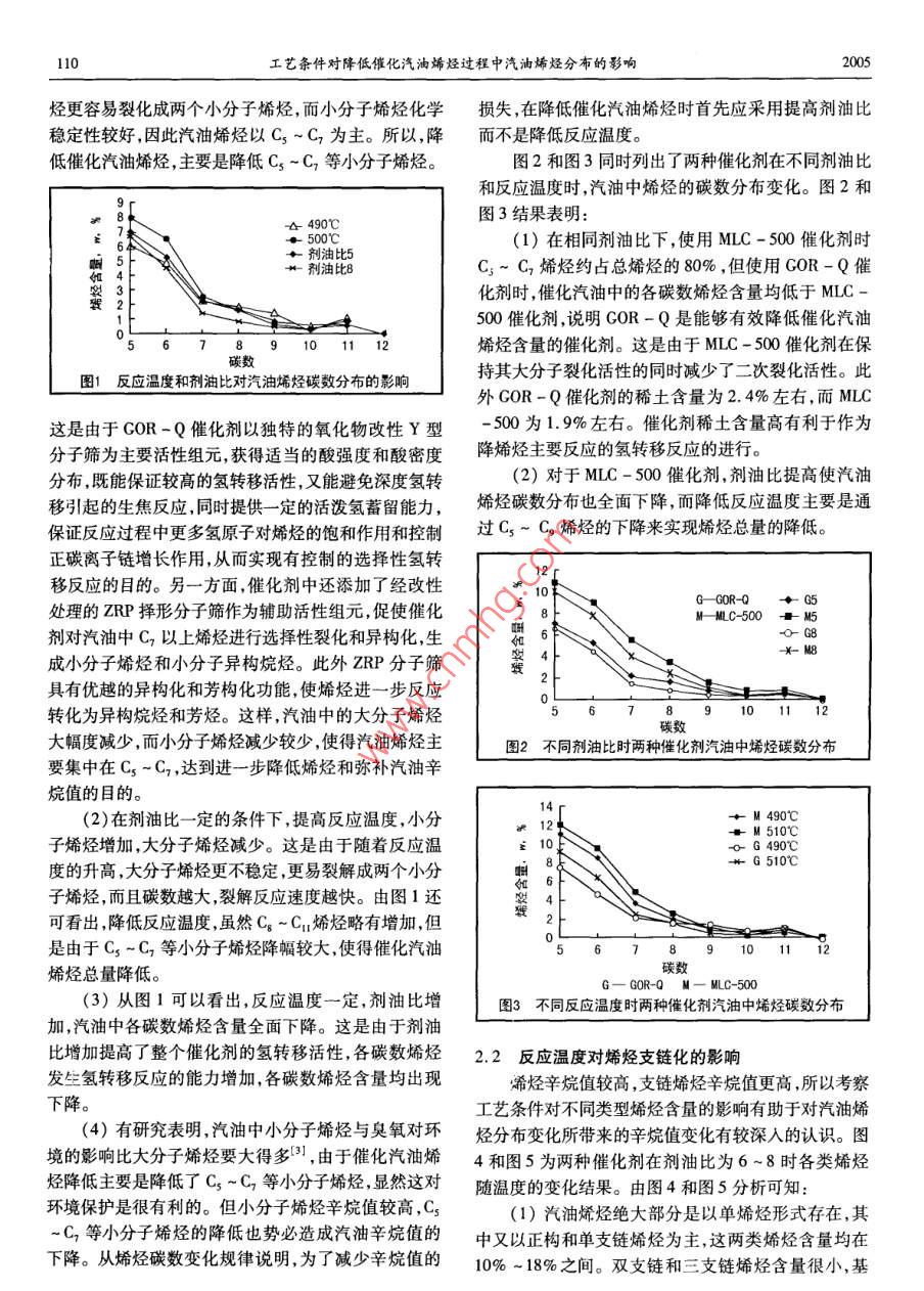 第34卷第2期石油與天然氣化工工藝條件對降低催化汽油烯烴過程中汽油烯烴分布的影響歐陽福生趙旭紅翁惠新(華東理工.大學(xué)石油加工研究所)摘要著重考察了在使用降烯烴催化劑GOR -Q和常規(guī)催化劑MLC -500時工藝條件對催化汽油烯烴分布的影響。結(jié)果表明:GOR -Q催化劑具有明顯降低催化汽油各類烯烴的效果。從碳數(shù)分布看,催化汽油中的烯烴主要集中在C,~C,之間。從類型看,單烯烴是催化汽油烯烴的主要存在形式,其中又以正構(gòu)烯烴和單支鏈烯烴為主。降低催化汽油烯烴主要是通過小分子烯烴或單烯烴、正構(gòu)烯烴、單支鏈烯烴的降低來實現(xiàn)。低溫、低空速、高劑油比有利于降低催化汽油中單烯烴、正構(gòu)烯烴、單支鏈烯烴和二烯烴含量,但為了減少辛烷值的損失,在降低催化汽油烯烴時首先應(yīng)采用提高劑油比的方式。關(guān)鍵詞工藝條件 催化裂化汽油烯烴催化劑汽油烯烴不僅會使發(fā)動機沉積物增加、積炭加劇,實驗所用原料油取自中國某煉油廠催化裝置的混造成燃料油噴嘴堵塞,更嚴(yán)重的是使發(fā)動機排放惡化、合渣油,采用北京石油化工研究院( RIPP)開發(fā)的GOR污染大氣[12。因此,降低汽油烯烴含量是21世紀(jì)清-Q降烯烴催化劑和常規(guī)裂化催化劑MLC-500[10],潔汽油生產(chǎn)的- - 個主要方向。由于我國生產(chǎn)汽油組分原料油和兩種催化劑性質(zhì)詳見文獻[7]。實驗采用小的裝置結(jié)構(gòu)不合理,催化汽油占了成品汽油的近型固定流化床反應(yīng)器。實驗的產(chǎn)物主要分為氣體產(chǎn)80% ,導(dǎo)致汽油烯烴含量離“CB - 17930 - 1999”要求物、液體產(chǎn)物和焦炭,分析方法詳見文獻[7]。的控制在<35%(p)還有較大的距離,與國際標(biāo)準(zhǔn)差對于汽油組成的分析采用氣相色譜法并結(jié)合距更大。因此,要解決我國汽油烯烴含量偏高的問題RIPP - GCAS( V2.1)汽油組成計算軟件可以得到包括主要應(yīng)該從催化裂化裝置人手。正構(gòu)烷烴.異構(gòu)烷烴、烯烴、環(huán)烷烴和芳烴的汽油全餾國內(nèi)外對降低催化汽油烯烴技術(shù)的研究和應(yīng)用方份單體烴的280~350個組分含量(也稱為PONA面作了許多卓有成效的工作(63-7。但這些報道主要側(cè)法)。根據(jù)烯烴結(jié)構(gòu)對汽油性質(zhì)的影響,對其中的烯重對催化汽油總烯烴含量及其他烴類族組成的影響,烴按照烯烴碳數(shù)分布、正構(gòu)和異構(gòu)烯烴(包括支鏈化而對催化汽油烯烴分布影響的研究報道很少。烯烴是程度)含量、二烯烴含量進行了歸類。汽油中的高辛烷值組分,盡管汽油烯烴含量的降低有實驗所采用的工藝條件為:反應(yīng)溫度490C ~助于改善汽車尾氣排放和汽油的安定性,但也帶來了520C ,劑油比5-8,空速20~60 h。汽油辛烷值損失的負(fù)面影響。事實上,烯烴類型對汽2實驗結(jié)果與討論油性質(zhì)如辛烷值影響是比較大的,如烯烴分支增加,其以汽油PONA法分析結(jié)果為基礎(chǔ),對各工藝條件辛烷值增加;烯烴分子量增加,其辛烷值是下降的;鏈下的催化汽油烯烴按碳數(shù)分布、正構(gòu)和異構(gòu)烯烴、支鏈烷和鏈烯的辛烷值大小順序是:直鏈烷烴<直鏈烯烴化程度、二烯烴含量進行了歸類整理,進而考察工藝條<支鏈烷烴;第二個雙鍵的引人將降低辛烷值;二烯烴件對汽油烯烴分布的影響。在考察反應(yīng)溫度和劑油比與大量烯烴共存時,二烯烴會促進烯烴的氧化反對催化汽油烯烴碳數(shù)分布的影響時的空速為30 h-1。應(yīng)8,9]。因此,研究汽油烯烴的分布規(guī)律有助于對降2.1反應(yīng)溫度和劑油比對催化汽油烯烴碳數(shù)分布的低催化汽油烯烴對汽油辛烷值、安定性等性質(zhì)的影響有較深人的認(rèn)識,并對于降烯烴催化劑的改進和選擇使用COR-Q催化劑時,其反應(yīng)溫度和劑油比對影響合適的工藝條件降低汽油烯烴的同時減少辛烷值損失汽油烯烴碳數(shù)分布的影響見圖1,從圖1可以看出:有一定指導(dǎo)意義。為此,本文主要是在前人工作(5]的(1)催化汽油中的烯烴主要集中在Cs ~C,之間,基礎(chǔ)_上,考察I藝條件對催化汽油烯烴分布的影響。占總烯烴的75%以上。在裂化反應(yīng)中,大分子烷烴裂1實驗及數(shù)據(jù)處理化成一-個小分子烷烴和一個小分子烯烴,大分子的烯110工藝條件對降低催化汽油烯烴過程中汽油烯烴分布的影響2005烴更容易裂化成兩個小分子烯烴,而小分子烯烴化學(xué)損失,在降低催化汽油烯烴時首先應(yīng)采用提高劑油比穩(wěn)定性較好,因此汽油烯烴以Cs ~C;為主。所以,降.而不是降低反應(yīng)溫度。低催化汽油烯烴,主要是降低Cs ~ C,等小分子烯烴。圖2和圖3同時列出了兩種催化劑在不同劑油比和反應(yīng)溫度時,汽油中烯烴的碳數(shù)分布變化。圖2和圖3結(jié)果表明:A 490C5002(1)在相同劑油比下,使用MLC-500催化劑時+劑油比5女劑油比8.C;~C,烯烴約占總烯烴的80%,但使用GOR-Q催化劑時,催化汽油中的各碳數(shù)烯烴含量均低于MLC -500催化劑,說明GOR-Q是能夠有效降低催化汽油烯烴含量的催化劑。這是由于MLC-500催化劑在保圖1反應(yīng)溫度和劑油比對汽油烯烴碳 數(shù)分布的影響持其大分子裂化活性的同時減少了二次裂化活性。此外GOR-Q催化劑的稀土含量為2.4%左右,而MLC這是由于GOR-Q催化劑以獨特的氧化物改性Y型-500為1.9%左右。催化劑稀土含量高有利于作為分子篩