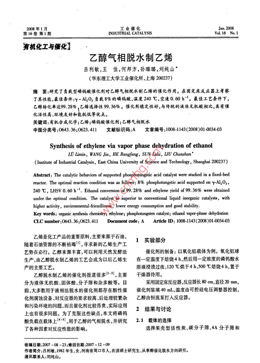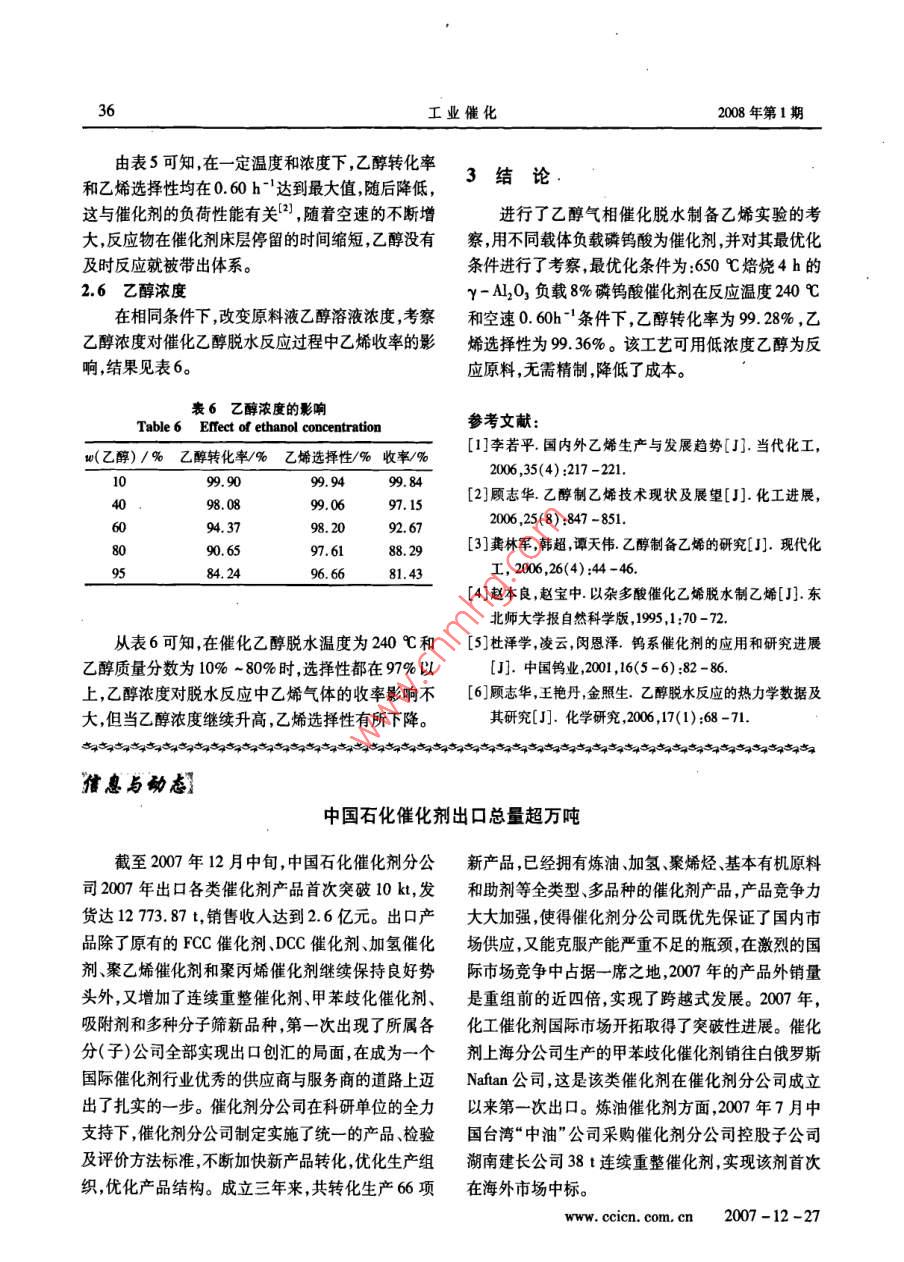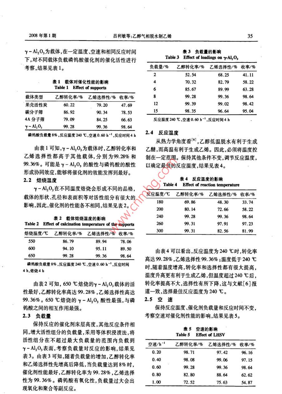 2008年1月工業(yè)催化Jan.2008第16卷第1期INDUSTRIAL CATALYSISVol 16 No 1有機(jī)化工與催化】乙醇?xì)庀嗝撍埔蚁﹨卫?王佳,何邦方,孫璐璐,劉純山(華東理工大學(xué)工業(yè)催化所,上海200237)摘要:研究了負(fù)載型磷鎢酸催化劑對(duì)乙醇?xì)庀嗝撍埔蚁┑拇呋饔谩T诠潭ù卜磻?yīng)器上考察了其性能,最住條件:γ-Al2O3負(fù)載8%的磷鎢酸,溫度240℃,空速0.60h。最佳工藝條件下,乙醇轉(zhuǎn)化率達(dá)99.28%,乙烯選擇性9.36%。催化劑穩(wěn)定性好,與傳統(tǒng)的液體無(wú)機(jī)酸相比,具有催化活性高、環(huán)境友好和能耗低等優(yōu)點(diǎn)。關(guān)鍵詞:有機(jī)合成化學(xué);乙烯;磷鎢酸催化劑;乙醇?xì)庀嗝撍袌D分類(lèi)號(hào):0643.36;0623.411文獻(xiàn)標(biāo)識(shí)碼:A文章編號(hào):1008-43(2008)01003403Synthesis of ethylene via vapor phase dehydration of ethanolD Limin, WANG Jia, he Bangfang, SUN Lulu, LU Chunshan( Institute of Industrial Catalysis, East China University of Science and Technology, Shanghai 200237)Abstract: The catalytic behaviors of supported phosphotungstic acid catalyst were studied in a fixed-bedreactor. The optimal reaction condition was as follows: 8% phosphotungstic acid supported on Y-A2O3240C, LHSV 0.60 h". Ethanol conversion of 99. 28% and ethylene yield of 99. 36%were obtainedunder the optimal condition. The catalyst is superior to conventional liquid inorganic catalysts, withhigher activity, environmental-friendliness, lower energy consumption and good stabilityKey words: organic synthesis chemistry; ethylene; phosphotungsten catalyst; ethanol vapor-phase dehydrationCLC number: 0643.36: 0623. 411 Document code: A Article ID: 1008-1143(2008 )01-0034-03乙烯是化工產(chǎn)品的重要原料,主要來(lái)源于石油實(shí)驗(yàn)部分隨著石油資源的不斷枯竭,尋求新的乙烯生產(chǎn)工藝勢(shì)在必行。乙醇來(lái)源豐富,可以利用天然發(fā)酵法催化劑的制備:以氧化鋁載體為例。氧化鋁球生產(chǎn),由乙醇脫水制乙烯的工藝會(huì)成為以后乙烯生在一定溫度下焙燒4h,然后用一定濃度的磷鎢酸水產(chǎn)的主要工藝。溶液浸漬過(guò)夜,120℃烘干4h,500℃焙燒4h,置于乙醇脫水制乙烯的催化劑報(bào)道很多2-3,主要干燥器待用。分為液體無(wú)機(jī)酸、固體酸、分子篩和雜多酸等。目采用固定床反應(yīng)器反應(yīng)器長(zhǎng)80cm,直徑20m,前,大多數(shù)用于液相法脫水的催化劑都存在酸性催催化劑裝填40mL,溫度由可控硅電壓調(diào)整器控制,化劑腐蝕設(shè)備對(duì)反應(yīng)器的要求較高后處理較繁雜乙醇由恒流泵打入反應(yīng)器。和污染環(huán)境的問(wèn)題,而且催化劑比較昂貴,實(shí)際應(yīng)用2結(jié)果與討論上也有很多問(wèn)題。為了克服這些缺點(diǎn),本文將磷鎢酸負(fù)載在載體上4-3,用于乙醇的氣相脫水,并研究2.1載體的選擇了各種因素對(duì)反應(yīng)性能的影響選擇果殼型活性炭、碳分子篩、4A分子篩和收稿日期:2007-08-23;修回日期:2007-12-09作者簡(jiǎn)介:呂利敏1982年生,女,河南省周口市人,在讀碩士研究生,從事醇催化脫水方向研究通訊聯(lián)系人:劉純山2008年第1期呂利敏等:乙醇?xì)庀嗝撍埔蚁﹜-A2O2為載體在一定溫度、空速和相同反應(yīng)時(shí)間衰3負(fù)載量的影響下,對(duì)不同載體負(fù)載磷鎢酸催化劑的催化活性進(jìn)行Table 3 Effect of loadings on rAL, O,考察,結(jié)果見(jiàn)表1。負(fù)載量/%乙醇轉(zhuǎn)化率/%乙烯選擇性/%收率/%52.5468.2541.11表1載體對(duì)催化性能的影響246870.3282.7958.22Table 1 Effect of supports8999載體類(lèi)型乙醇轉(zhuǎn)化率/%乙烯選擇性/%收率/%99.36果殼活性炭60.2279.2047.6999.02碳分子篩86.92903478531598.396.6495.04分子篩79.0984.2566.63反應(yīng)溫度240℃,空速0.60h-1,反應(yīng)時(shí)間4hy-A20,9.289369864磷鉤酸負(fù)載量8%,反應(yīng)溫度210℃空速060b1,反應(yīng)時(shí)間4b2.4反應(yīng)溫度從熱力學(xué)角度看6,乙醇低溫脫水有利于生成由表1可知,Y-Al2O3為載體時(shí),乙醇轉(zhuǎn)化率和乙醚而高溫有利于生成乙烯。因此,必須將溫度控乙烯選擇性都高于其他載體,分別為928%和制在一定范圍。保持其他條件不變調(diào)節(jié)反應(yīng)溫度,9.36%??赡苁莥-Al2O,的酸性與磷鎢酸的酸性以確定最佳的反應(yīng)溫度結(jié)果見(jiàn)表4。形成協(xié)同效應(yīng)能夠?qū)⒋呋瘎┑男馨l(fā)揮到最好。2.2焙燒溫度表4反應(yīng)溫度的影響Table 4 Effect of reaction temperaturey-Al2O3在不同溫度焙燒會(huì)形成不同的晶格,載體的形狀孔徑和表面積等對(duì)活性組分有很大的反應(yīng)溫度/℃乙醇轉(zhuǎn)化率%乙烯選擇性/%收率/%影響,因此,催化劑的性能各不相同,結(jié)果見(jiàn)表2。80.1472.6658.22表2載體焙燒溫度的影響99.2899.3698.64Table2 Efect of calcination temperature of the supports99.319791焙燒溫度/℃乙醇轉(zhuǎn)化率/%乙烯選擇性/%收率/%86.7989.9478.0694.1095.1189.50由表4可以看出,反應(yīng)溫度為240℃時(shí)轉(zhuǎn)化率98.64高達(dá)9.28%,乙烯選擇性99.36%;溫度低于240℃磷鎢酸負(fù)載量8%,反應(yīng)溫度240℃,空速0.60h,反應(yīng)時(shí)間4h培燒4h時(shí),隨著溫度增高,轉(zhuǎn)化率和選擇性都有很大提高,溫度升高更有利于生成乙烯,但溫度超過(guò)240℃后由表2可知,650℃焙燒的y-A2O3載體的活轉(zhuǎn)化率提高不大選擇性有所下降,這與文獻(xiàn)[6]報(bào)性最好,乙醇轉(zhuǎn)化率高達(dá)99.28%,乙烯選擇性高達(dá)道一致,選擇最佳反應(yīng)溫度為240℃
