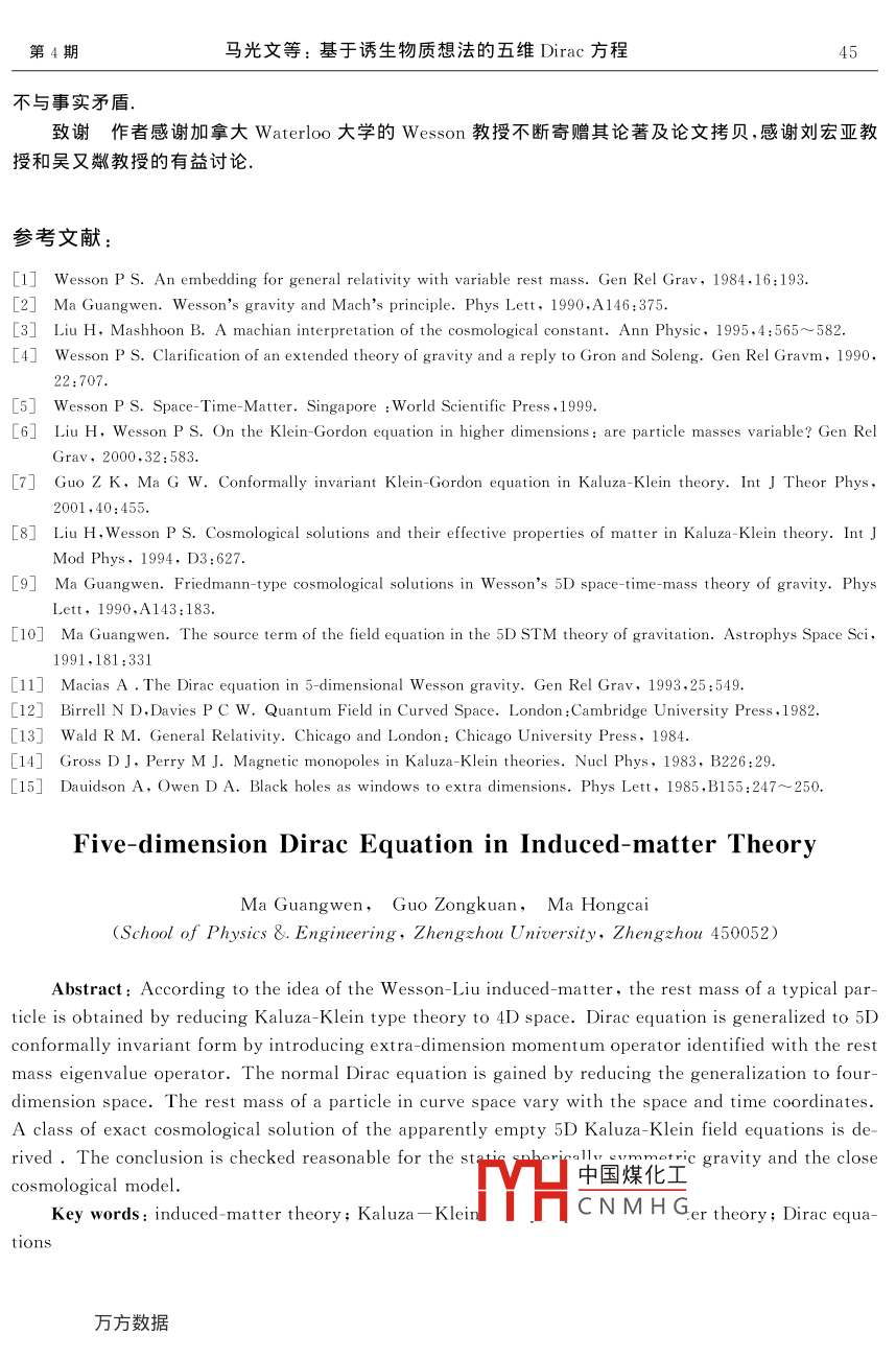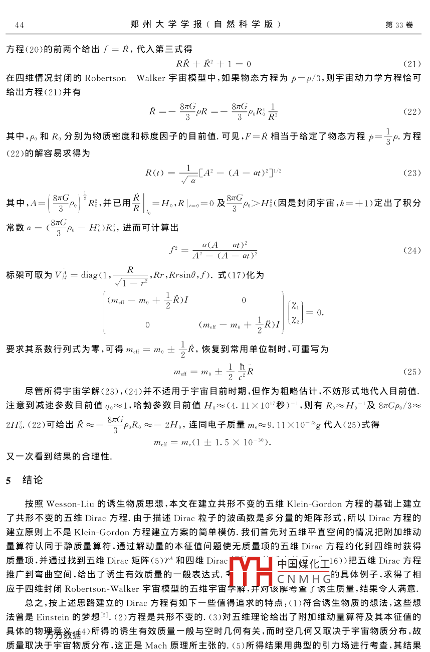 第33卷第4期鄭州大學(xué)學(xué)報(自然科學(xué)版)Vol 33 No 42001年12月JOURNAL OF ZHENGZHOU UNIVERSITYDee.2001基于誘生物質(zhì)想法的五維 Dirac方程馬光文,郭宗寬,馬紅彩(鄭州大學(xué)物理工程學(xué)院鄭州450052)摘要:根據(jù) Wesson-Liu誘生物質(zhì)的想法,典型粒子的靜質(zhì)量可通過 Kaluza- Klein型理論約化到四維空時而獲得.通過引入附加維的動量算符并把它認同于靜質(zhì)量本征值算符而將 Dirac方程推廣到五維共形不變形式.當約化到四維空時時得到類似通常形式的 Dirac方程,粒子靜質(zhì)量對彎曲空時是隨空時坐標變化的.具體求解了五維宇宙學(xué)問題,并考察了所得的封閉宇宙模型和靜態(tài)球?qū)ΨQ引力場所得結(jié)果的合理性關(guān)鍵詞:誘生物質(zhì)理論; Kaluza- Klein理論;空-時-質(zhì)理論; Dirac方程中圖分類號:O412.1文章編號:1001-8212(2001)04-0040—06在 Kaluza- Klein型理論的現(xiàn)代發(fā)展中,有一類有趣的理論即 Wesson十幾年前提出的五維空一時質(zhì)理論門.該理論把附加的維度即第五維與典型粒子的靜質(zhì)量聯(lián)系起來,從而把質(zhì)量納入幾何體系.它的一個顯著特點是,一般地將得到典型粒子靜質(zhì)量可變的結(jié)論,這在某種意義上體現(xiàn)了Mach精神23.一個讓 Wesson反復(fù)思索的問題是如何將 Einstein引力場方程推廣到五維空間,即五維能動張量應(yīng)取什么形式.最終, Wesson確定了自己的想法:五維能動張量恒為零,即五維引力場方程的一般形式為RMN=0,其中,M,N取0,1,2,3,4.當它約化到四維時能得到通常的 Einstein引力場方程87G(l(1)其中,μ,ν取0,1,2,3.這里有效的四維物質(zhì)場能動張量T是通過如下的對應(yīng)從附加維得到的,即TR,e-(RWesson把這樣的思想稱為誘生物質(zhì)理論:.在此后的很多工作中, Wesson及其合作者都力圖貫徹這想法.最近,文獻匚6基于誘生物質(zhì)的想法,把標量場的 Klein-Gordon方程以如下方式推廣到五維彎曲空間,即使當約化到四維時,與附加維有關(guān)的部分視為等效的質(zhì)量項.鑒于共形變換能夠保時空的因果結(jié)構(gòu)不變,故場方程的共形不變形式是值得追求的.把[6]中的方程(3)進一步由最小耦合情況推廣到共形不變的形式)g"Np+1R4=0并在此基礎(chǔ)上考査了某些典型引力場中典型標量粒子的靜質(zhì)量,得到了更為理想的誘生可變靜質(zhì)量的結(jié)果H中國煤化工考慮到對于任何一個新理論,從其提出到其最終被CNMHG各個角度對其進行考查檢驗和完善,對于 Kaluza Klein型的可變引力理論(即丑維仝呵一頂埋化),這樣的工作一直在進行著8.馬也曾提出過對于附加維的新解釋及關(guān)于五維能動張量的另一建議10. Macias討論了在此基收稿日期:2001-04-20作者簡分月?lián)?-).男,教授,主要從事高維引力研究第4期馬光文等:基于誘生物質(zhì)想法的五維 Dirac方程41礎(chǔ)上的 Dirac方程.本文則從誘生物質(zhì)的思想出發(fā),研究 Dirac方程的五維推廣方案及其特征.由于Dirac方程的波函數(shù)的多分量特征,原則上會遇到不同于 Klein- Gordon方程的新問題,解決這些問題也是本文的目的點之1五維平空間中的 Dirac方程四維空時中的Drac方程的協(xié)變形式為iyymoy=0其中,選取了c=h=1的單位制, Dirac矩陣γ滿足反對易關(guān)系,即(6)其中,"= diagonal(+1,-1,-1,-1),而y的一種標準表示為其中,取1,2,3;Ⅰ為2×2的單位矩陣;σ為泡利矩陣.按照誘生物質(zhì)的概念, Dirac方程推廣到五維平直空間是簡單的,取”yy,M=0,{5m",3),y}=25n,5mm=diag(+1,1).其中,5y"仍取為(7)式,5)y4可取為y=y1y2y3然而,如果直接按照文獻[6]和[門的做法,令y(x")=y(x")em,把(9)約化到四維時得到bymoDy=0它不是熟知的四維 Dirac方程(5),這似乎是個困難,但這一困難不是實質(zhì)性的,容易解決.例如,如果把P=y“i這一動量算符的附加維度分量認同于靜質(zhì)量算符,考慮自由Diac粒子,則其波函數(shù)為y=a(p,m0)expi(px+mx1-Et).代入方程(8)得ElEl其中,x1=上邊的方程有解的必要條件是左邊系數(shù)行列式為零,即y29AEⅠp·a+im。IEl由此得E=士(P2十m3)2.其中,E和E分別為正能解和負能解.若進一步定解,可解自旋本征值方程,這里不再給出.由此可以看出這一解與方程(5)對自由 Dirac粒子的解完全一樣實際上,如果以sy°左乘(8)兩邊可得yy=0其中,a=(5)y06y=an0/:2=(xoy=i10易驗證它們滿足關(guān)系中國煤化工故(9)式正是Drac方程的通常形式,即方程(5)的等價CNMHG當然,也可以以(-(5y4)左乘(8)式兩邊,并記亦即易驗證,γ滿足上邊的反對易關(guān)系(6).方程(8)現(xiàn)在化為42鄭州大學(xué)學(xué)報(自然科學(xué)版)第33卷y把(10)定義的矩陣γ視為四維空時的 Dirac方程,則方程(11)就是另一旋量表示中的方程(5)2彎曲空間中的 Dirac方程先回憶四維空時的情況.當考慮引力場對 Dirac旋量粒子的影響,即要把四維 Dirac方程推廣到彎曲空時時,必須引入標架場1213vu(x)-a5x(r)其中,(x)為X點的局部慣性坐標;a是空時的 Lorentz指標,其升降用m.顯然,gm=VVn,旋量協(xié)變導(dǎo)數(shù)定義為y=(+r)v.其中,n為自旋聯(lián)絡(luò)n=1V"Va,.=1[,y]為 Lorentz群生成元. Dirac方程到彎曲空時的推廣形式為iyvy- my=0其中,γ滿足反對易關(guān)系{γ",γ}=2g灬.按誘生物質(zhì)思想,五維時 Dirac方程在彎曲空間的推廣為(14)所涉及到的 Dirac矩陣、標架、自旋、聯(lián)絡(luò)和旋量協(xié)變導(dǎo)數(shù)均是四維情況的直接推廣,3五維理論中的 Dirac粒子的有效質(zhì)量當把五維彎曲空間中的 Dirac方程(14