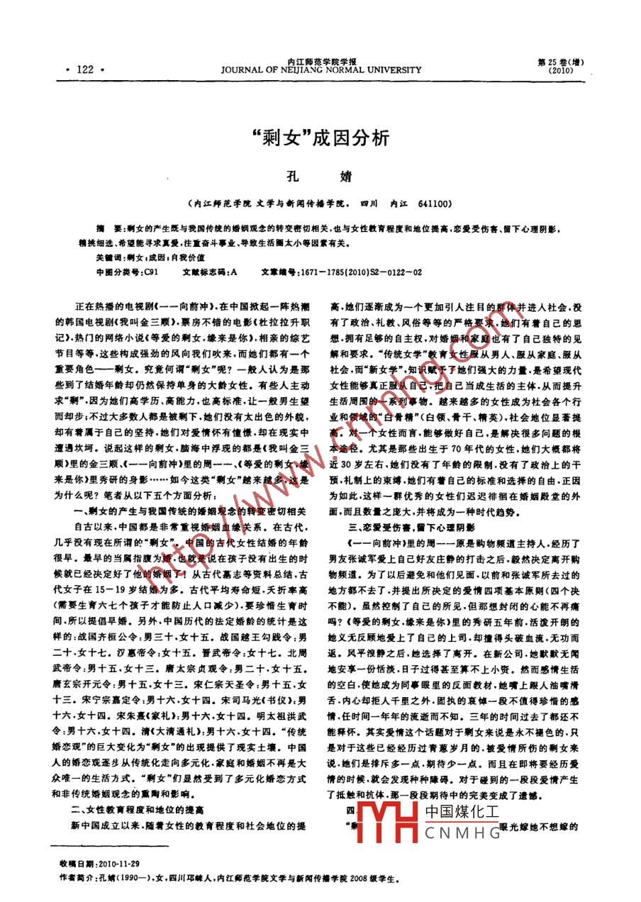 第25卷(增)●122●JOURNAL OF NEUIANG NORMAL UNIVERSITY“剩女”成因分析孔(內(nèi)江師范學(xué)院文學(xué)與新聞傳格學(xué)院,四川內(nèi)江 641100)擒要:剩女的產(chǎn)生既與我國(guó)傳統(tǒng)的婚姻觀念的轉(zhuǎn)變密切相關(guān),也與女性教育程度和地位提高.戀愛(ài)受傷害、留下心理陰影,精挑細(xì)選、希望能尋求真愛(ài),注1重奮斗事業(yè)導(dǎo)致生活圈太小等因素有關(guān)。關(guān)鍵詞:剩女;成因;自我價(jià)值中圈分類號(hào):C91文獻(xiàn)標(biāo)志碼:A文章編號(hào):1671-1785(2010)S2-0122-02正在熱播的電視劇(--向前沖),在中國(guó)掀起一陣熱潮高 .她們逐漸成為一個(gè)更加引人注目的群體并進(jìn)人社會(huì),沒(méi)的韓國(guó)電視劇<我叫金三順),票房不錯(cuò)的電影{杜拉拉升職有了政治、禮教、風(fēng)俗等等的嚴(yán)格要求,她們有著自己的思記>.熱門(mén)的網(wǎng)絡(luò)小說(shuō)<等愛(ài)的剩女.緣來(lái)是你).相親的綜藝想 .擁有足夠的自主權(quán),對(duì)婚姻和家庭也有了自己獨(dú)特的見(jiàn)節(jié)目等等.這些構(gòu)成強(qiáng)勁的風(fēng)向我們吹來(lái),而她們都有-個(gè)解和要求?!皞鹘y(tǒng)女學(xué)”教育女性服從男人、服從家庭、服從.重要角色一-剩女。 兗竟何謂“剩女”呢? -般人認(rèn)為是那社會(huì) .而“新女學(xué)”,知識(shí)賦予了她們強(qiáng)大的力量.是希望現(xiàn)代些到了結(jié)婚年齡卻仍然保持單身的大齡女性。有些人主動(dòng)女性能夠真正服從自己,把自己當(dāng)成生活的主體.從而提升求“剩".因?yàn)樗齻兏邔W(xué)歷、高能力,也高標(biāo)準(zhǔn),讓一般男生望生活周圍的一 系列事物。越來(lái)越多的女性成為社會(huì)各個(gè)行而卻步;不過(guò)大多數(shù)人都是被剩下.她們沒(méi)有太出色的外貌,業(yè)和領(lǐng)域的“白骨精”(白領(lǐng)、骨干、精英),社會(huì)地位顯著提卻有著屬于自己的堅(jiān)持●她們對(duì)愛(ài)情懷有僮憬.卻在現(xiàn)實(shí)中離。對(duì)一個(gè)女性而言.能夠做好自己,是解決很多問(wèn)題的根遭遇坎坷。說(shuō)起這樣的剩女。腦海中浮現(xiàn)的都是(我叫金三本途徑。尤其是那些出生于70年代的女性,她們大概都將順>里的金三順、(--向前沖)里的周一- -、{等愛(ài)的剩女,緣近30歲左右,她們沒(méi)有了年齡的限制.沒(méi)有了政治上的干來(lái)是你)里秀研的身...如今這類“剩女”越來(lái)越多,這是預(yù).禮制上的束縛.她們有著自己的標(biāo)準(zhǔn)和選擇的自由.正因?yàn)槭裁茨?筆者從以下五個(gè)方面分析:為如此這樣-群優(yōu)秀的女性們遲遲徘徊在婚姻殿堂的外一、剿女的產(chǎn)生與我國(guó)傳統(tǒng)的婚姻觀念的轉(zhuǎn)變密切相關(guān)面,而且數(shù)之龐大,并將成為一種時(shí)代趨勢(shì)。自古以來(lái),中國(guó)都是非常重視婚姻血緣關(guān)系。在古代.三、戀愛(ài)受傷害,留下心理陰影幾乎沒(méi)有現(xiàn)在所謂的“剩女"。中國(guó)的古代女性結(jié)婚的年齡《- -向前沖)里的周一一原是購(gòu)物頻遭主持人,經(jīng)歷了很早.最早的當(dāng)屬指腹為婚.也就是說(shuō)在孩子沒(méi)有出生的時(shí)男友張誠(chéng)軍愛(ài)上自己好友莊靜的打擊之后.毅然決定離開(kāi)購(gòu)候就已經(jīng)決定好了他的婚姻了!從古代墓志等資料總結(jié),古物頻道.為了以后避免和他們見(jiàn)面,以前和張誠(chéng)軍所去過(guò)的代女子在15- 19歲結(jié)婚為多。古代平均壽命短.天折率高地方都不去了.并提出所決定的愛(ài)情四項(xiàng)基本原則(四個(gè)決(需要生育六七個(gè)孩子才能防止人口減少).要珍惜生育時(shí)不能)。雖然控制了自己的所見(jiàn).但那想封閉的心能不再痛間、所以提倡早婚.另外.中國(guó)歷代的法定婚齡的統(tǒng)計(jì)是這嗎? (等愛(ài)的剩女.緣來(lái)是你)里的秀研五年前.活潑開(kāi)朗的樣的:戰(zhàn)國(guó)齊桓公令:男三十.女十五。戰(zhàn)國(guó)越王勾賤令:男她義無(wú)反顧地愛(ài)上了自己的上司.卻擅得頭破血流.無(wú)功而二+.女十七.漢惠帝令:女十五.晉武帝令:女十七.北周返.風(fēng)平浪靜之后。她選擇了離開(kāi).在新公司.她默默無(wú)聞武帝令:男十五.女十三。唐太宗貞觀令:男二十.女+五。地安享-份恬談.日子過(guò)得甚至算不上小資。然而感情生活唐玄宗開(kāi)元令:男十五.女十三。宋仁宗天圣令:男十五,女的空白,使她成為同事眼里的反面教材.她嘴上跟人油嘴滑十三.宋寧宗嘉定令:男十六.女十四.宋司馬光{書(shū)儀):男舌.內(nèi)心卻拒人千里之外.固執(zhí)的哀悼一段不值得珍惜的感十六.女十四.宋朱熹(家禮):男十六.女十四。明太祖洪武情.任時(shí)間一年年的流逝而不知。三年的時(shí)間過(guò)去了都還不令:男十六,女十四.清<大清通禮):男十六.女十四?!皞鹘y(tǒng)能釋?xiě)?。其?shí)愛(ài)情這個(gè)話題對(duì)于剿女來(lái)說(shuō)是永不提色的.只婚戀觀"的巨大變化為“剩女”的出現(xiàn)提供了現(xiàn)實(shí)土壤。中國(guó)是對(duì)于這些已經(jīng)經(jīng)歷過(guò)青蔥歲月的.被愛(ài)情所傷的剩女來(lái)人的婚戀觀逐步從傳統(tǒng)化走向多元化.家庭和婚姻不再是大說(shuō).她們是排斥多一點(diǎn).期待少一點(diǎn)。而且在即將要經(jīng)歷愛(ài)眾唯一的生活方式?!笆E眰冿@然受到了多元化