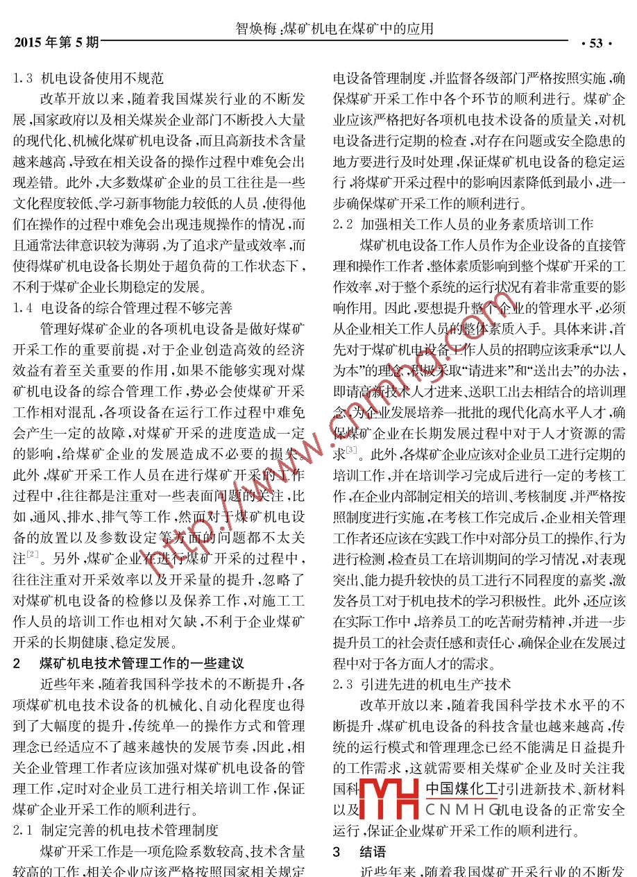 機(jī)械管理開發(fā)總第147期M ECHANICAL M ANAGEM ENT AND DEV ELOPM ENTTotal of 1472015年第5期No.52015應(yīng)用技術(shù)煤礦機(jī)電在煤礦中的應(yīng)用智煥梅(同煤集團(tuán)云岡礦供電隊(duì),山西大同037003)摘要:分析了目前我國煤礦行業(yè)的發(fā)展現(xiàn)狀,對(duì)存在的問題制定相應(yīng)的解決措施,為煤礦的安全生產(chǎn)提供了可靠的保障,具有巨大的經(jīng)濟(jì)和社會(huì)效益。關(guān)鍵詞:煤礦機(jī)電技術(shù);機(jī)電技術(shù)管理;應(yīng)用研究中圖分類號(hào): TD79文獻(xiàn)標(biāo)識(shí)碼: A文 章編號(hào):1003-773X(2015 )05-0052-02DOI :10. 16525/j .cnki .cn14-1134/th .2015. 05. 020引言會(huì)在實(shí)施工作的過程中出現(xiàn)混亂的工作局面,而改革開放以來,我國煤炭行業(yè)得到了突飛猛進(jìn)且會(huì)大大提升煤礦機(jī)電設(shè)備的損壞率,煤礦開采的發(fā)展,煤礦開采的現(xiàn)狀和面貌也得到了很大的改的成本也相應(yīng)提升了,影響整個(gè)煤礦企業(yè)的經(jīng)濟(jì)善,即便如此,重大安全事故也時(shí)有發(fā)生,為人民生效益”。此外,煤礦機(jī)電技術(shù)管理機(jī)制的不健全命財(cái)產(chǎn)安全造成了巨大的損失,造成了不好的影響。性,勢(shì)必會(huì)使各工作人員有機(jī)可乘,缺乏實(shí)際工作這些安全事故的產(chǎn)生,除了一些自然因素、社會(huì)因素的監(jiān)督,導(dǎo)致對(duì)于各項(xiàng)設(shè)備的檢修工作過于疏忽,的影響外,人為因素以及生產(chǎn)環(huán)境的不安全狀況占從而影響到工作任務(wù)完成的工期,影響煤礦企業(yè)據(jù)了主要地位。下面主要探討我國煤礦機(jī)電技術(shù)開采工作的效率,不利于企業(yè)的長(zhǎng)期穩(wěn)定發(fā)展。管理在煤礦生產(chǎn)中的應(yīng)用,并就煤礦安全生產(chǎn)中存1.2技術(shù)操作人員綜合素質(zhì)較低在的安全隱患作簡(jiǎn)要分析。由于目前我國煤礦開采的施工環(huán)境比較惡1煤礦機(jī)電技術(shù)使用中存在的問題劣,因此人員的流失率較大,這在-定程度上導(dǎo)致與傳統(tǒng)機(jī)電技術(shù)相比,我國現(xiàn)代煤礦機(jī)電技術(shù)從事煤礦機(jī)電技術(shù)操作工作人員的綜合素質(zhì)相對(duì)設(shè)備有了很大程度的提升,但是隨著我國煤礦開采較低。長(zhǎng)期下去,煤礦機(jī)電技術(shù)操作人員的綜合工作的不斷復(fù)雜化,機(jī)電技術(shù)設(shè)備在生產(chǎn)使用中還素質(zhì)較低,勢(shì)必會(huì)影響到煤礦企業(yè)的開采效率,大存在著一些問題,下面就相關(guān)問題作簡(jiǎn)要分析。大降低生產(chǎn)率,影響企業(yè)的長(zhǎng)期穩(wěn)定發(fā)展。下頁.1.1管理機(jī)制不夠完善圖1為煤礦機(jī)電技術(shù)操作人員進(jìn)行相關(guān)設(shè)備的學(xué)早在我國煤礦開采工作初期,我國政府就已習(xí)和檢修工作。經(jīng)制定了相關(guān)的規(guī)定,并利用法律的手段要求每一~煤礦企業(yè)都必須嚴(yán)格遵守相關(guān)煤礦開采管理規(guī)定進(jìn)行開采工作。然而,在現(xiàn)實(shí)生活中,仍有許多煤礦開采部門]或企業(yè)并沒有按照相關(guān)規(guī)定進(jìn)行操作,沒有將相關(guān)管理規(guī)定落實(shí)到實(shí)處,這樣很容易中國煤化工DHCNM HG收稿日期: 2015-04-30作者簡(jiǎn)介:智煥梅(1978- -),女,畢業(yè)于山東理工大學(xué)機(jī)電一體化專業(yè),助理工程師,現(xiàn)就職于同圖1操作人員學(xué)習(xí)設(shè)備圖煤集團(tuán)云岡礦供電隊(duì),從事煤礦機(jī)電工作。智煥梅:煤礦機(jī)電在煤礦中的應(yīng)用2015年第5期1.3機(jī)電設(shè)備使用不規(guī)范電設(shè)備管理制度,并監(jiān)督各級(jí)部門]嚴(yán)格按照實(shí)施,確改革開放以來,隨著我國煤炭行業(yè)的不斷發(fā)保煤礦開采工作中各個(gè)環(huán)節(jié)的順利進(jìn)行。煤礦企展,國家政府以及相關(guān)煤炭企業(yè)部廣]不斷投人大量業(yè)應(yīng)該嚴(yán)格把好各項(xiàng)機(jī)電技術(shù)設(shè)備的質(zhì)量關(guān),對(duì)機(jī)的現(xiàn)代化、機(jī)械化煤礦機(jī)電設(shè)備,而且高新技術(shù)含量電設(shè)備進(jìn)行定期的檢查,對(duì)存在問題或安全隱患的越來越高,導(dǎo)致在相關(guān)設(shè)備的操作過程中難免會(huì)出地方要進(jìn)行及時(shí)處理,保證煤礦機(jī)電設(shè)備的穩(wěn)定運(yùn)現(xiàn)差錯(cuò)。此外,大多數(shù)煤礦企業(yè)的員工往往是一些行,將煤礦開采過程中的影響因素降低到最小,進(jìn)一文化程度較低、學(xué)習(xí)新事物能力較低的人員,使得他步確保煤礦開采工作的順利進(jìn)行。們?cè)诓僮鞯倪^程中難免會(huì)出現(xiàn)違規(guī)操作的情況,而2.2加強(qiáng)相關(guān)工作人員的業(yè)務(wù)素質(zhì)培訓(xùn)工作且通常法律意識(shí)較為薄弱,為了追求產(chǎn)量或效率,而煤礦機(jī)電設(shè)備工作人員作為企業(yè)設(shè)備的直接管使得煤礦機(jī)電設(shè)備長(zhǎng)期處于超負(fù)荷的工作狀態(tài)下,理和操作 工作者,整體素質(zhì)影響到整個(gè)煤礦開采的工不利于煤礦企業(yè)長(zhǎng)期穩(wěn)定的發(fā)展。作效率,對(duì)于整個(gè)系統(tǒng)的運(yùn)行狀況有著非常重要的影1.4 電設(shè)備的綜合管理過程不夠完善響作用。因此,要想提升整個(gè)企業(yè)的管理水平,必須管理好煤礦企業(