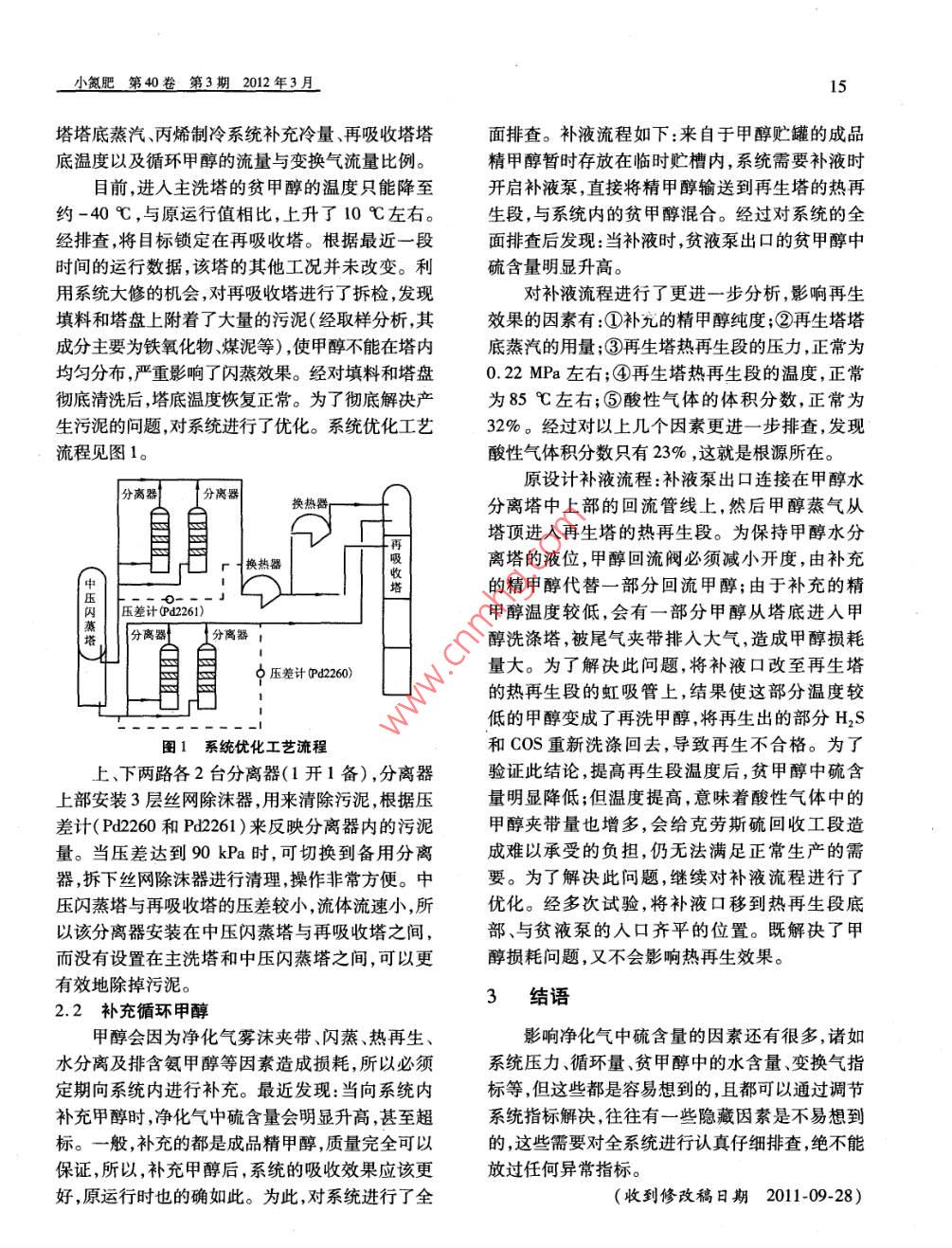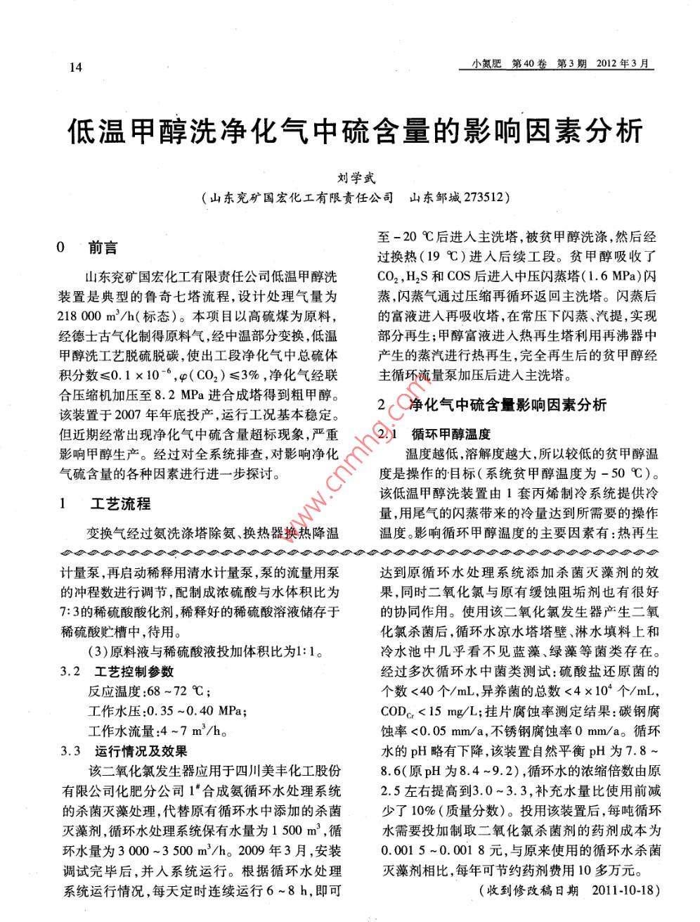 小氮肥第40卷第3期2012年3月低溫甲醇洗凈化氣中硫含量的影響因素分析劉學(xué)武(山東兗礦國宏化工有限責(zé)任公司山東鄒城273512)0前言至-20℃后進(jìn)入主洗塔,被貧甲醇洗滌,然后經(jīng)過換熱(19℃)進(jìn)入后續(xù)工段。貧甲醇吸收了山東兗礦國宏化工有限責(zé)任公司低溫甲醇洗CO2,H2S和COs后進(jìn)入中壓閃蒸塔(1.6MPa)閃裝置是典型的魯奇七塔流程,設(shè)計(jì)處理氣量為蒸,閃蒸氣通過壓縮再循環(huán)返回主洗塔。閃蒸后2180m3/h(標(biāo)態(tài))。本項(xiàng)目以高硫煤為原料,的富液進(jìn)入再吸收塔,在常壓下閃蒸、汽提,實(shí)現(xiàn)經(jīng)德士古氣化制得原料氣,經(jīng)中溫部分變換,低溫部分再生;甲醇富液進(jìn)入熱再生塔利用再沸器中甲醇洗工藝脫硫脫碳,使出工段凈化氣中總硫體產(chǎn)生的蒸汽進(jìn)行熱再生,完全再生后的貧甲醇經(jīng)積分?jǐn)?shù)≤01×10°,4(CO2)≤3%,凈化氣經(jīng)聯(lián)主循環(huán)流量泵加壓后進(jìn)入主洗塔。合壓縮機(jī)加壓至8.2MPa進(jìn)合成塔得到粗甲醇。該裝置于2007年年底投產(chǎn),運(yùn)行工況基本穩(wěn)定。2凈化氣中硫含量影響因素分析但近期經(jīng)常出現(xiàn)凈化氣中硫含量超標(biāo)現(xiàn)象,嚴(yán)重2.1循環(huán)甲醇溫度影響甲醇生產(chǎn)。經(jīng)過對全系統(tǒng)排查,對影響凈化溫度越低,溶解度越大,所以較低的貧甲醇溫氣硫含量的各種因素進(jìn)行進(jìn)一步探討。度是操作的目標(biāo)(系統(tǒng)貧甲醇溫度為-50℃1工藝流程該低溫甲醇洗裝置由1套丙烯制冷系統(tǒng)提供冷量,用尾氣的閃蒸帶來的冷量達(dá)到所需要的操作變換氣經(jīng)過氨洗滌塔除氨、換熱器換熱降溫溫度。影響循環(huán)甲醇溫度的主要因素有:熱再生計(jì)量泵,再啟動(dòng)稀釋用清水計(jì)量泵,泵的流量用泵達(dá)到原循環(huán)水處理系統(tǒng)添加殺菌滅藻劑的效的沖程數(shù)進(jìn)行調(diào)節(jié),配制成濃硫酸與水體積比為果,同時(shí)二氧化氯與原有緩蝕阻垢劑也有很好7:3的稀硫酸酸化劑,稀釋好的稀硫酸溶液儲(chǔ)存于的協(xié)同作甪。使用該二氧化氯發(fā)生器產(chǎn)生二氧稀硫酸貯槽中,待用?;葰⒕?循環(huán)水涼水塔塔壁、淋水填料上和(3)原料液與稀硫酸液投加體積比為1:1。冷水池中幾乎看不見藍(lán)藻、綠藻等菌類存在。3.2工藝控制參數(shù)經(jīng)過多次循環(huán)水中菌類測試:硫酸鹽還原菌的反應(yīng)溫度:68~72℃?zhèn)€數(shù)<40個(gè)/mL,異養(yǎng)菌的總數(shù)<4×104個(gè)/mL,工作水壓:0.35~0.40MPa;cOD<15mg/L;掛片腐蝕率測定結(jié)果:碳鋼腐工作水流量:4~7m/h。蝕率<0.05mm/a,不銹鋼腐蝕率0mm/a。循環(huán)3.3運(yùn)行情況及效果水的pH略有下降,該裝置自然平衡pH為7該二氧化氯發(fā)生器應(yīng)用于四川美豐化工股份8.6(原pH為8.4~9.2),循環(huán)水的濃縮倍數(shù)由原有限公司化肥分公司1合成氨循環(huán)水處理系統(tǒng)2.5左右提高到3.0~3.3,補(bǔ)充水量比使用前減的殺菌滅藻處理,代替原有循環(huán)水中添加的殺菌少了10%(質(zhì)量分?jǐn)?shù))。投用該裝置后,每噸循環(huán)滅藻劑,循環(huán)水處理系統(tǒng)保有水量為1500m3,循水需要投加制取二氧化氯殺菌劑的藥劑成本為環(huán)水量為3000~3500m3/h。2009年3月,安裝0.0015~0.0018元,與原來使用的循環(huán)水殺菌調(diào)試完畢后,并入系統(tǒng)運(yùn)行。根據(jù)循環(huán)水處理滅藻劑相比,每年可節(jié)約藥劑費(fèi)用10多萬元。系統(tǒng)運(yùn)行情況,每天定時(shí)連續(xù)運(yùn)行6~8h,即可(收到修改稿日期2011-10-18)小氮肥第4卷第3期2012年3月15塔塔底蒸汽、丙烯制冷系統(tǒng)補(bǔ)充冷量、再吸收塔塔面排査。補(bǔ)液流程如下:來自于甲醇貯罐的成品底溫度以及循環(huán)甲醇的流量與變換氣流量比例。精甲醇暫時(shí)存放在臨時(shí)貯槽內(nèi),系統(tǒng)需要補(bǔ)液時(shí)目前,進(jìn)入主洗塔的貧甲醇的溫度只能降至開啟補(bǔ)液泵,直接將精甲醇輸送到再生塔的熱再約-40℃,與原運(yùn)行值相比,上升了10℃左右。生段,與系統(tǒng)內(nèi)的貧甲醇混合。經(jīng)過對系統(tǒng)的全經(jīng)排査,將目標(biāo)鎖定在再吸收塔。根據(jù)最近一段面排查后發(fā)現(xiàn):當(dāng)補(bǔ)液時(shí),貧液泵出口的貧甲醇中時(shí)間的運(yùn)行數(shù)據(jù),該塔的其他工況并未改變。利硫含量明顯升高。用系統(tǒng)大修的機(jī)會(huì),對再吸收塔進(jìn)行了拆檢,發(fā)現(xiàn)對補(bǔ)液流程進(jìn)行了更進(jìn)一步分析,影響再生填料和塔盤上附著了大量的污泥(經(jīng)取樣分析,其效果的因素有:①補(bǔ)宄的精甲醇純度;②再生塔塔成分主要為鐵氧化物煤泥等),使甲醇不能在塔內(nèi)底蒸汽的用量;③再生塔熱再生段的壓力,正常為均勻分布,嚴(yán)重影響了閃蒸效果。經(jīng)對填料和塔盤0.22MPa左右;④再生塔熱再生段的溫度,正常徹底清洗后塔底溫度恢復(fù)正常。為了徹底解決產(chǎn)為85℃左右;⑤酸性氣體的體積分?jǐn)?shù),正常為生污泥的問題,對系統(tǒng)進(jìn)行了優(yōu)化。系統(tǒng)優(yōu)化工藝32%。經(jīng)過對以上幾個(gè)因素更進(jìn)一步排查,發(fā)現(xiàn)流程見圖1。酸性氣體積分?jǐn)?shù)只有23%,這就是根源所在。原設(shè)計(jì)補(bǔ)液流程:補(bǔ)液泵出口連接在甲醇水分離分離塔中上部的回流管