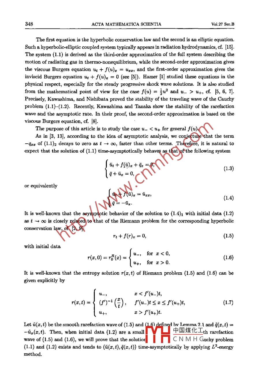 Available online at www.sciencedirect.comMalhemadlFgintiaScienceDirect數(shù)學(xué)物理學(xué)報(bào)Acta Mathematica Scientia 2007,27B(2):347-360http://actams.wipm.ac.cnASYMPTOTIC STABILITY OF RAREFACTIONWAVE FOR HYPERBOLIC-ELLIPTIC COUPLEDSYSTEM IN RADIATING GAS*Ruuan Lizhi (阮立志)Laboratory of Nonlinear Analysis, Department of Mathematics, Central China Normal University,Wuhan 430079, ChinaDepartment of Applied Mathematics, South-Central University for Nationalities, Wuhan 430074, ChinaE-mail: ruandmagon1976@169.comZhang Jing(張晶)Laboratory of Nonlinear Analysis, Departrnent of Mathematics, Central China Normal University,Abstract In this article, authors study the Cauch problem for a model of hyperbolicelliptic coupled system derived from the one dimensional system of the radiating gas.By considering the initial data as a 8mall disturbances of rarefaction wave of inviscidBurgers equation, the global existence of the solution to the corresponding Cauchy problemand asymnptotic stability of rarefaction wave is proved. The analysis is based on a prioriestimates and L2.energy method.Key words Hyperbolic eliptie coupled Bystemn, rarefaction wave, asymptotic stability,L2-energy method I2000 MR Subject Classification 35M10, 35Q351 IntroductionIn this article, we will consider the Cauchy problem for a byperbolic -lliptic coupled systemin radiation hydrodynamicsut+ f(u)x+qx= 0,(1.1)l-qxx+q+4x=0,with initial datau(x,0)= u(x)→u比,as $→士∞, .(1.2)where f(u)∈C3(R) satisfies f"(u)> 0 foru∈R.中國(guó)煤化工*Received December 5, 2004. The reeearch was supportedMYHCNMHG,ProjetoftheNatural Science Foundation of China (10431060), the Key Project of Chinese Ministry of Education (104128),and the South-Central University For Nationalities Natural Science Foundation of China (YZY05008)348ACTA MATHEMATICA SCIENTIAVol.27 Ser.BThe first equation is the hyperbolic conservation law and the second is an eliptic equation.Such a hyperbolicelliptic coupled system typically appears in radiation hydrodynamics, cf. [15].The system (1.1) is derived as the third-order approximation of the full system describing themotion of radiating gas in thermo-nonequilibrium, while the 8econd-order approximation givesthe viscous Burgers equation ut + f(u)x = Uxz, and the first-order approximation gives theinviscid Burgers equation ut + f(u)z = 0 (see [5]). Hamer [1] studied these equations in thephysical respect, especially for the steady progressive shock wave solutions. It is also studiedfrom the mathematical point of view for the case f(u) =氣u2 and u_ > u+, cf. [5, 6, 7].Precisely, Kawashima, and Nishibata proved the stability of the traveling wave of the Cauchyproblem (1.1)-(1.2). Recently, Kawashima and Tanaka show the stability of the rarefactionwave and the asymptotic rate. In their proof, the second- order approximation is based on theviscous Burgers equation, cf. [8].The purpose of this article is to study the case u_ < u+ for general f(u).As in {3, 13], according to the idea of asymptotic analysis, we conjecture that the term-9xx of (1.1)2 decays to zero as t→∞, faster than other terms. Therefore, it is natural toexpect that the solution of (1.1) time -asymptotically behaves as that of the following system) + f(@)x +亞=0,(1.3)[q+x=0,or equivalentlyi + f()x= urx,(1.4)( g=-lx.It is well-known that the asymptotic behavior of the solution to (1.4)1 with initial data (1.2)ast→∞is closely related to that of the Riemann problem for the corresponding hyperbolicconservation law, cf. [2, 9]:rt+f(r)x=0,(1.5)with initial datau_,for x<0,r(x,0) =唱(x) =u+,for x>0.(1.6)It is well-known that the entropy solution r(x, t) of Riemann problem (1.5) and (1.6) can begiven explcitly byu_,r< f'(u_),r(x,t)={ (')-(),f"(u_)t≤τ≤ j"(u4)t,(1.7)x> f'(u+)t.Let u(x, t) be the smooth rarefaction wave of (1.5) and (1.6) defined bv Lemma21 and (x,t) =-ux(x,t). Then, when initial data (1.2) are a small中國(guó)煤化工th rarefactionwave of (1.5) and (1.6), we will prove that the solutiorYHC N M H Guchy problem(1.1) and (1.2) exists and tends to (&(x, t), q(x, t)) time asymptotically by applying L2. energymethod.No.2Ruan & Zhang: ASYMPTOTIC STABILITY OF RAREFACTION WAVE349Notations Hereafter, we denote several positive constants by C; (i = 0,1,2,..) or onlyC without confusion. For function spaces, L2(R) and L°(R) be usual Lebesgue spaces on R =(-∞,∞) with norms lfIr2(RB) = (r |f(x)|dx)* and |f|L∞(R) = sup|f(x), respectively, wealso write |HI|L2(R)= l1I|I and !IILx∞(n)=川. HIL∞. H*(R) denotes the usual h. th orderSobolev space with norm |I|k =(12川)For simplicity, |If(, t)|z2 and lf(,t)h aredenoted by |f()|L2 and I()|k, respectively.2 Smooth A pproximation and PreliminariesAs in [10, 11, 16, 20], we first consider the following Cauchy problem, which will be usedto construct the smooth approxinate solution of the Riemann problem (1.5) and (1.6)元+辯x=0,(,)=io(x)=g(r+ +r-)+號(hào)(r+-r-)Kody_(2.1)1+y’wherer+= f'(u+) and K is a constant such that K seo科= 1.Let (x,t)= (f)-(x,)). Then }(x,t)|≤C|(x, t)| and (x,t) satisfesin+ f(網(wǎng))x= 0,(2.2)試(x,0) = uo(x) =(f)-(0(x))→u士,a8 x→t∞.For the Cauchy problem (2.2), we have the following fundamental properties (see [10, 11, 16,20]):Lemma 2.1 Letu_ < u+ and f(w) ∈C2(R) satisfy f"(u)> 0 for u∈r. Then theCauchy problem (2.2) admits a unique global smooth solution i(x, t) satisfyingiz> 0,|II∞ ≤C|iIlL∞, .(2.3)and( {i(t)呢?!蹸h(u+-u_ )(1+t)-P+1, 1≤p<∞,|&awx()I|2≤Ch(u+-u-)(1+t)-2-*,k= 0,1,2,3,|150xxx()|2≤Ch(u+-u_ -)(1+t)-4-k, k=0,1,“些≤Ch(u+-u-)(1 +t)一量,(2.4)J-∞Uxdx≤Ch(u+-u >)(1 +t)-3,元[* da≤Ch(4+-u_-)(1 +)-號(hào),where h(u+ -u_) is a function of u+一u_ and satis中國(guó)煤化工Let:YHCNMHGI w(x,t) = u(x,t) - u(x,t),(2.5)\z(x,t) = q(x,t) - (x,t),350ACTA MATHEMATICA SCIENTIAVol.27 Ser.Bwhere i(x, t) is the solution of (2.2) obtained by Lemma 2.1 and (x,t)= -ix(x,t).Then the system (1.1) can be 