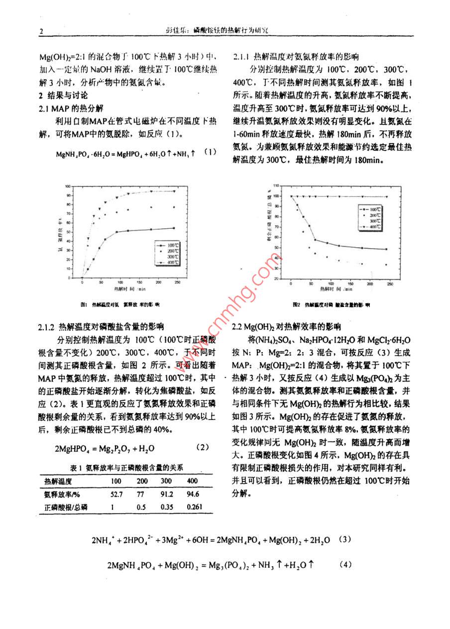2009年第7湖化學(xué)T程|裝備2009年7月Chemical Engineering 段Equipaent磷酸銨鎂的熱解行為研究彭佳樂,周康根,姜科(湖南長沙中南大學(xué)冶金院,湖南長沙410083)摘要:為了明確磷酸銨鎂的熱解性能,考察了100C、200C、300C、400C 下磷酸銨鎂熱解過程中的氨氮釋放韋和正磷酸根含量隨時(shí)間的變化規(guī)律:考察了氫氧化鎂與氫氧化鈉對(duì)磷酸銨鎂熱解行為的影響,發(fā)現(xiàn)氫氧化鎂能促進(jìn)氨的釋放并抑制正磷酸根向焦磷酸根轉(zhuǎn)化:投加氫氧化鈉可在正磷酸根不損失的前提下,使MAP中的氨氤釋放率達(dá)到9%以上。關(guān)鍵詞:磷酸銨鎂;熱解;氫氧化鎂;氫氧化鈉前言1.1主要試劑與材料氮是生物活動(dòng)必需的營養(yǎng)元素之一,但是如果試劑: Na2HPO:12H2O ,MgCl26H2O ,水體中氮的含量太高又會(huì)造成環(huán)境污染。在我國水(NH)2SO4,NaOH, 以上均為分析純。納氏試體污染因素中氨氮是非常重要的污染物["2)。目前對(duì)劑9、 鉬酸銨、釩酸銨0。模擬氨氦廢水:用銨鹽這類廢水主要是通過生物法叫、化學(xué)沉淀法、吹脫加去離子水配制。法(、折點(diǎn)氯法')進(jìn)行處理,各種方法均存在一定優(yōu)1.2主要儀器:缺點(diǎn)。磷酸銨鎂(MAP)化學(xué)沉淀法處理高濃度氨JB-3定時(shí)恒溫磁力攪拌器,420酸度計(jì),氮廢[外叼,具有簡單、快速、高效等優(yōu)點(diǎn),然而該VIS-7220可見光分光光度計(jì),管式屯磁爐。法消耗大量磷鹽和鎂鹽,造成反應(yīng)成本高,以及磷1.3實(shí)驗(yàn)方法酸銨鎂容易造成二次污染,一直以來都是限制該方1.3.1 MAP的制備及熱解法實(shí)際應(yīng)用的最重要因素。因此如何降低藥劑消配制7200mg/L的(NH4)2SO4溶液,按N: P:耗,開發(fā)磷酸銨鎂的回用和綜合利用技術(shù),對(duì)于磷Mg=1: 1: 1,順次將NazHPO;:12H2O和MgClr6H2O酸銨鎂沉淀法在實(shí)際工程中的應(yīng)用具有重要意義。加入IL該溶液中(待前一藥劑全部溶解后再加入后磷酸銨鎂在不同溫度下發(fā)生熱分解反應(yīng),其分一藥劑), 用5mol/L NaOH穩(wěn)定廢水pH值為9"。解產(chǎn)物可循環(huán)用于氨氮的吸附,是降低藥劑消耗的20C下磁力攪拌20分鐘后過濾,將得到的固相沉淀可能途徑。根據(jù)分解溫度的不同,磷酸銨鎂可分解物洗滌后,在干燥箱中于40C卜下干燥48小時(shí),產(chǎn)物成不同的產(chǎn)物,包括:Mg3(PO4): MgHPO4 和充分研磨后密封保存,即得到MAP。將制得的MAPMg2P2O7. Mg3(PO)2、 MgHPO4 和MgzP:Oy對(duì)廢水置于管式電磁爐中,在特定熱解溫度下熱解3小時(shí),中氨氨的吸附能力不同, Shigeru Sugiyama等同研究取其熱解產(chǎn)物, 分析產(chǎn)物中的氨氮含量和正磷酸根表明以上這三種物質(zhì)去除氨氮能力為:含量。MgHPO, > Mg,(PO,)2 > Mg;RO.因此,如何提高1.3.2 Mg(OH)2對(duì)熱解效率的影響利用NazHPO:12H2O和MgCl2:6H2O按N: P:熱解時(shí)磷酸氨鎂中氨的釋放率,而又不影響其熱解Mg=2: 2: 3制備成MAP: Mg(OH)2=2: 1的混合產(chǎn)物對(duì)氨氮的吸附效果是解決磷酸氨鎂化學(xué)沉淀物,制備步驟同前。將此混合物置于管式電磁爐中,法的關(guān)鍵內(nèi)容。本文針對(duì)此難題,對(duì)磷酸銨鎂的熱在特定熱解溫度下熱解3小時(shí),取其熱解產(chǎn)物,分解行為展開研究,以求通過實(shí)現(xiàn)磷酸銨鎂熱解放氨析產(chǎn)物中的氨氮含斌和正磷酸根含量。后,可作為氨氮吸附劑實(shí)現(xiàn)循環(huán)利用。1.3.3 NaOH對(duì)脫氨效率的影響1實(shí)驗(yàn)部分在以Mg;(POJ)z 為主體的熱解產(chǎn)物(MAP:2彭佳樂:磷酸銨飫的熱解行為研究Mg(OH)=2:1的混合物于100C卜F熱解3小時(shí))中,21.1熱解溫度對(duì)氨氮科放率的影響加入一定量的NaOH溶液,繼續(xù)置T 100"C繼續(xù)熱分別控制熱解溫度為100C, 200C,300C,解3小時(shí),分析產(chǎn)物中的氨氮含敏。400C,于不同熱解時(shí)間測(cè)其氨氮釋放率,如圖|2結(jié)果與討論所示。隨著熱解溫度的升高,氨氨釋放率不斷提高,2.1 MAP的熱分解溫度升高至300C時(shí),氨氮釋放率可達(dá)到90%以上,利用口制MAP在管式屯磁爐在不同溫度卜熱繼續(xù)升溫氨氮科放效果則沒有明顯變化。且氦氮在解,可將MAP中的氨脫除,如反應(yīng)(1)。1-60min科放速度最快,熱解180min后,不再釋放MgNH,PO. .6H20= MgIHPO, +6H:O↑+NH2↑(1)氨氮。為兼顧氨氮釋放效果和能源節(jié)約選定最佳熱解溫度為300C,最佳熱解時(shí)間為180min.一一10C”100T。.國加220熱解時(shí)間an200朽朝時(shí)同min斷熱幅疆度咐氨 氨野放事的影響圍2熱解溫度對(duì)周 酸鹽含最的影響2.1.2熱解溫度對(duì)磷酸鹽含量的影響2.2 Mg(OH)對(duì)熱解效率的影響分別控制熱解溫度為100C ( 100C時(shí)正磷酸將NH4)SO4、Na;HPO; 12H20和MgCl:6H20根含量不變化) 200C,300C, 400C, 于不同時(shí)按N: P: Mg=2: 2: 3混合,可按反應(yīng)(3)生成間測(cè)其正磷酸根含量,如圖2所示。可看出隨著MAP: .Mg(OH)=2:1 的混合物,將其置于100C下MAP中氨氮的釋放,熱解溫度超過100C時(shí),其中. 熱解3小時(shí),又按反應(yīng)(4)生成以Mg3(PO4)為主的正磷酸鹽開始逐漸分解,轉(zhuǎn)化為焦磷酸鹽,如反體的混合物。測(cè)其氨氮釋放率和正磷酸根含量,并.應(yīng)(2)。表1更直觀的反應(yīng)了氨氮釋放效果和正磷與相同條件下無Mg(OH)2的熱解行為相比較,結(jié)果酸根剩余量的關(guān)系,看到氨氮釋放率達(dá)到90%以上如圖3所示。Mg(OH)2 的存在促進(jìn)了氨氮的釋放,后,剩余正磷酸根已不到總磷的40%。其中1