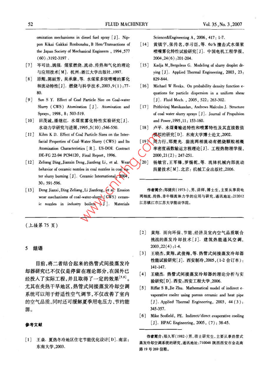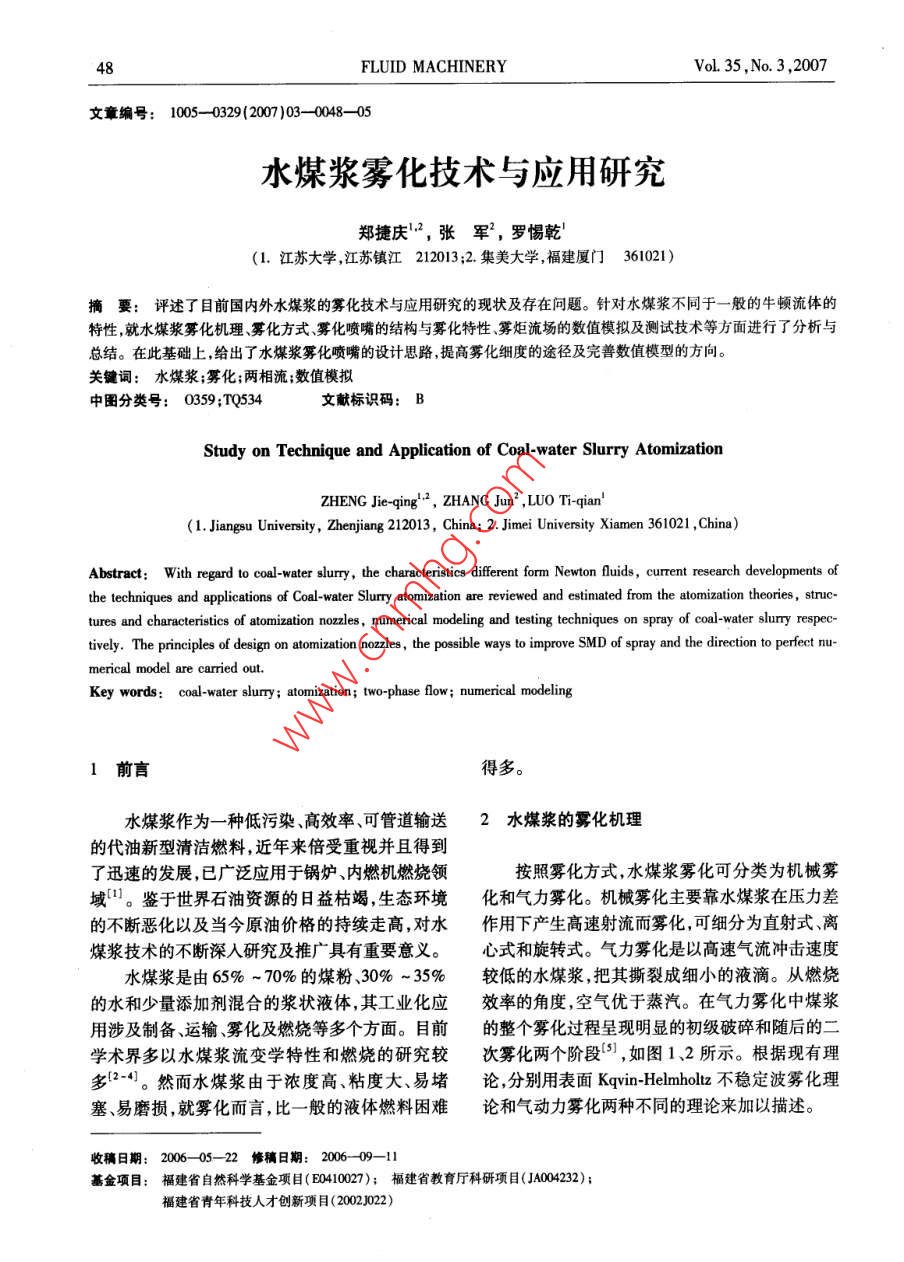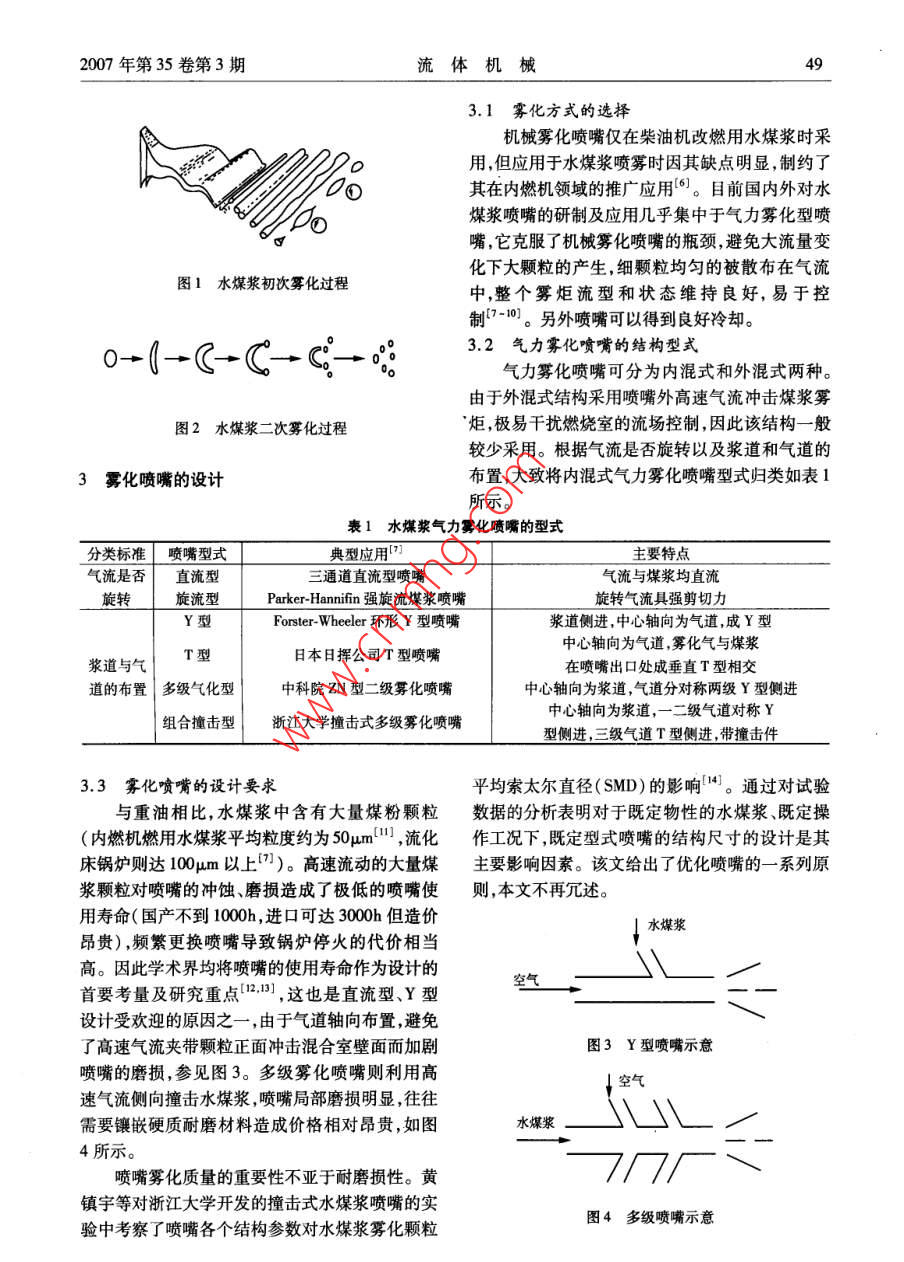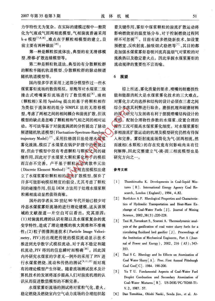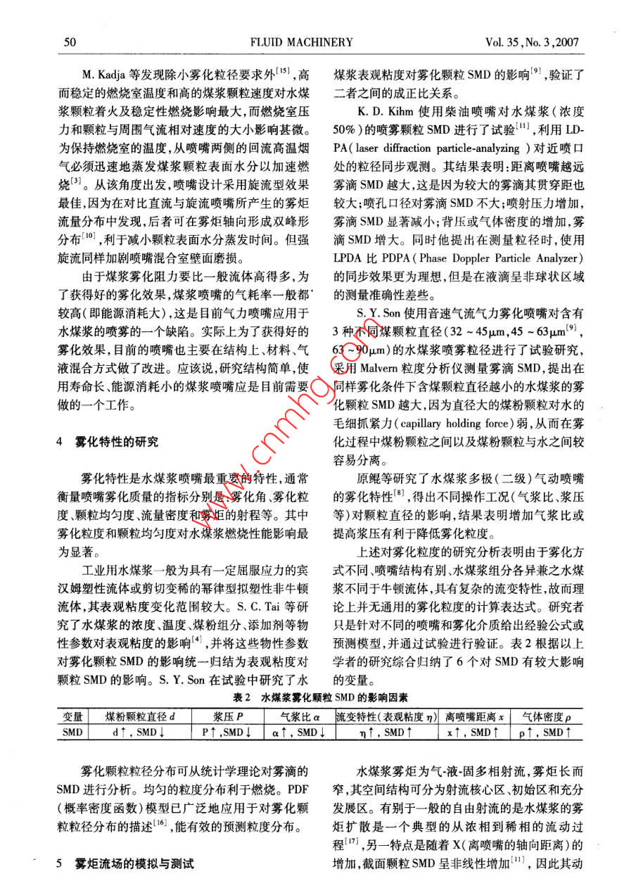 FLUID MACHINERYVol.35,No.3,2007文章編號:1005-0329(2007)03-0048-05水煤漿霧化技術(shù)與應(yīng)用研究鄭捷慶2,張軍,羅惕乾(1.江蘇大學(xué)江蘇鎮(zhèn)江212013;2集美大學(xué),福建廈門361021)摘要:評述了目前國內(nèi)外水煤漿的霧化技術(shù)與應(yīng)用研究的現(xiàn)狀及存在問題。針對水煤漿不同于一般的牛頓流體的特性,就水煤漿霧化機(jī)理、霧化方式霧化噴嘴的結(jié)構(gòu)與霧化特性霧炬流場的數(shù)值模擬及測試技術(shù)等方面進(jìn)行了分析與總結(jié)。在此基礎(chǔ)上,給出了水煤漿霧化噴嘴的設(shè)計(jì)思路,提高霧化細(xì)度的途徑及完善數(shù)值模型的方向。關(guān)鍵詞:水煤漿;霧化;兩相流;數(shù)值模擬中圖分類號:0359;TQ534文獻(xiàn)標(biāo)識碼:BStudy on Technique and application of Coal-water Slurry AtomizationZHENG Jie-qing, ZHANG Jun', LUO Ti-qia(1. Jiangsu University, Zhenjiang 212013, China; 2. Jimei University Xiamen 361021, China)Abstract: With regard to coal-water slurry, the characteristics different form Newton fluids, current research developments ofthe techniques and applications of Coal-water Slurry atomization are reviewed and estimated from the atomization theories, struc-tures and characteristics of atomization nozzles, numerical modeling and testing techniques on spray of coal-water slurry respec-tively. The principles of design on atomization nozzles, the possible ways to improve SMD of spray and the direction to perfect nu-merical model are carried outKey words: coal-water slurry; atomization; two-phase flow; numerical modeling1前言得多。水煤漿作為一種低污染高效率、可管道輸送2水煤漿的霧化機(jī)理的代油新型清潔燃料,近年來倍受重視并且得到了迅速的發(fā)展,已廣泛應(yīng)用于鍋爐、內(nèi)燃機(jī)燃燒領(lǐng)按照霧化方式,水煤漿霧化可分類為機(jī)械霧域1l。鑒于世界石油資源的日益枯竭,生態(tài)環(huán)境化和氣力霧化。機(jī)械霧化主要靠水煤漿在壓力差的不斷惡化以及當(dāng)今原油價(jià)格的持續(xù)走高,對水作用下產(chǎn)生高速射流而霧化可細(xì)分為直射式、離煤漿技術(shù)的不斷深入研究及推廣具有重要意義。心式和旋轉(zhuǎn)式。氣力霧化是以高速氣流沖擊速度水煤漿是由65%~70%的煤粉、30%~35%較低的水煤漿,把其撕裂成細(xì)小的液滴。從燃燒的水和少量添加劑混合的漿狀液體,其工業(yè)化應(yīng)效率的角度,空氣優(yōu)于蒸汽。在氣力霧化中煤漿用涉及制備、運(yùn)輸霧化及燃燒等多個(gè)方面。目前的整個(gè)霧化過程呈現(xiàn)明顯的初級破碎和隨后的二學(xué)術(shù)界多以水煤漿流變學(xué)特性和燃燒的研究較次霧化兩個(gè)階段,如圖1、2所示。根據(jù)現(xiàn)有理多2-·。然而水煤漿由于濃度高、粘度大、易堵論,分別用表面 Kevin- Helmholtz不穩(wěn)定波霧化理塞、易磨損,就霧化而言,比一般的液體燃料困難論和氣動(dòng)力霧化兩種不同的理論來加以描述。收稿日期:2006-05-22修稿日期:2006-09-11基金項(xiàng)目:福建省自然科學(xué)基金項(xiàng)目(E041007);福建省教育廳科研項(xiàng)目(JA004232);福建省青年科技人才創(chuàng)新項(xiàng)目(2002022)2007年第35卷第3期流體機(jī)械3.1霧化方式的選擇機(jī)械霧化噴嘴僅在柴油機(jī)改燃用水煤漿時(shí)采用,但應(yīng)用于水煤漿噴霧時(shí)因其缺點(diǎn)明顯,制約了其在內(nèi)燃機(jī)領(lǐng)域的推廣應(yīng)用6。目前國內(nèi)外對水煤漿噴嘴的研制及應(yīng)用幾乎集中于氣力霧化型噴嘴,它克服了機(jī)械霧化噴嘴的瓶頸,避免大流量變化下大顆粒的產(chǎn)生,細(xì)顆粒均勻的被散布在氣流圖1水煤漿初次霧化過程中,整個(gè)霧炬流型和狀態(tài)維持良好,易于控制另外噴嘴可以得到良好冷卻→Cc3.2氣力霧化噴嘴的結(jié)構(gòu)型式氣力霧化噴嘴可分為內(nèi)混式和外混式兩種。由于外混式結(jié)構(gòu)采用噴嘴外高速氣流沖擊煤漿霧圖2水煤漿二次霧化過程炬,極易干擾燃燒室的流場控制,因此該結(jié)構(gòu)一般較少采用。根據(jù)氣流是否旋轉(zhuǎn)以及漿道和氣道的3霧化噴嘴的設(shè)計(jì)布置,大致將內(nèi)混式氣力霧化噴嘴型式歸類如表所示。表1水煤漿氣力霧化噴嘴的型式分類標(biāo)準(zhǔn)噴嘴型式典型應(yīng)用主要特點(diǎn)氣流是否直流型三通道直流型噴嘴氣流與煤漿均直流旋轉(zhuǎn)旋流型Parker- Hannifin強(qiáng)旋流煤漿噴嘴旋轉(zhuǎn)氣流具強(qiáng)剪切力Y型Forster- Wheeler環(huán)形Y型噴嘴漿道側(cè)進(jìn),中心軸向?yàn)闅獾?成Y型中心軸向?yàn)闅獾?霧化氣與煤漿漿道與氣T型日本日揮公司T型噴嘴在噴嘴出口處成垂直T型相交道的布置多級氣化型中科院ZN型二級霧化噴嘴中心軸向?yàn)闈{道,氣道分對稱兩級Y型側(cè)進(jìn)組合撞擊型浙江大學(xué)撞擊式多級霧化噴嘴中心軸向?yàn)闈{道,一二級氣道對稱Y型側(cè)進(jìn),三級氣道T型側(cè)進(jìn),帶撞擊件3.3霧化噴嘴的設(shè)計(jì)要求平均索太爾直徑(SMD)的影響。通過對試驗(yàn)與重油相比,水煤漿中含有大量煤粉顆粒數(shù)據(jù)的分析表明對于既定物性的水煤漿、既定操(內(nèi)燃機(jī)燃用水煤漿平均粒度約為50μm1,流化作工況下,既定型式噴嘴的結(jié)構(gòu)尺寸的設(shè)計(jì)是其床鍋爐則達(dá)100μm以上)。高速流動(dòng)的大量煤主要影響因素。該文給出了優(yōu)化噴嘴的一系列原漿顆粒對噴嘴的沖蝕、磨損造成了極低