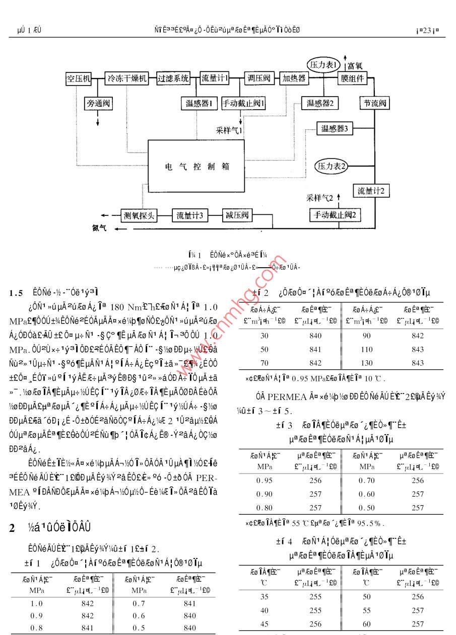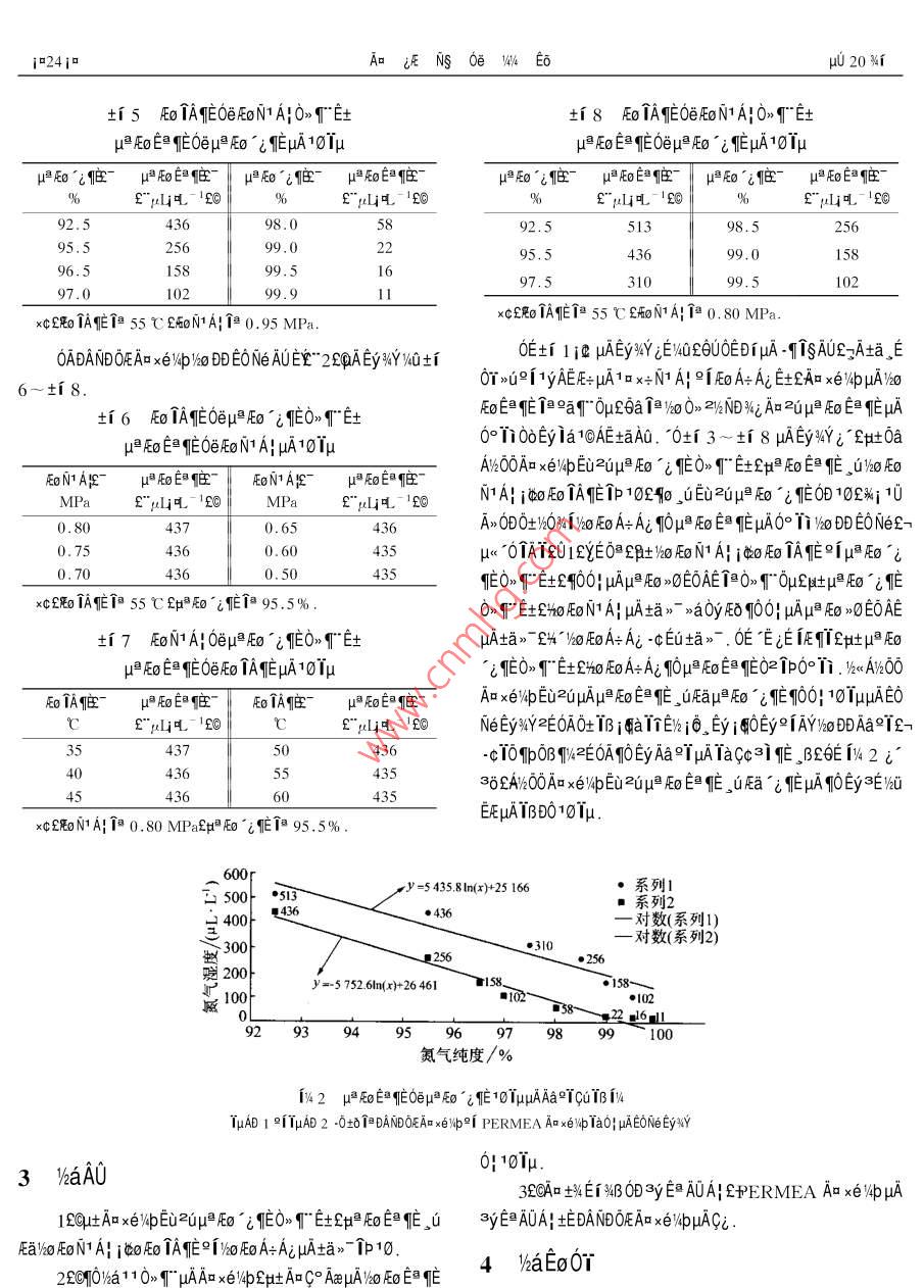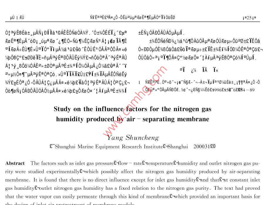 204p1/UVol 20 No. 12000Ae20AMEMBRANE SCIENCE AND TECHNOLOGYFeb.2000A800EUu0EacEμAO°i0oE0NI E3 3E£“EI£2°Ee±、ND%Eu£EI°20003120a0a40a¨NO2-0 AfaM HAV2o RoN1 Al ico foa÷Ai0AE°o0 aDCiEAU0°TiAE02U0A00600DAE0NeN%c103y30E框aaE00E0啊008A0B0±K0uA0°i±‰20oeE0T“E62中[0白0, H iE010Ec03EA啊010Tp.E0Ne土fA÷AEE同E啊A80 D%lCiHAEo L,A0AE6a1Ax白如bA000m1A1°, Eev ia1@AE00uAE0NeOA%Y00·E0A000aHAf- A TQ028 8A0OA0 EO OD HAuOeN啊0l-0 Au Eg I. EUAEHA2》l£N6土μE0Aopa,0N60 Ae OEEj Auxaom1EONe2i-Od0cμApo60WE50AE09C°E0A母正1001.1×°0A×eaEOU 80 Ae uoD EU% ON3EEi2c nHA IE1a0H OAE fo 101uFEOx°0 AxesEEC41EE%2Tp°Ea±u0T2AAcn0E096A1.2E0Ne2AAIIIEUND/ i°°EajU%a±030UNE0A0A-> Nd OF HA Aa xe vp i pERMEA 1E3401A∞0-·00Eμ×°0A和£E0AAE0A-E兩Axe如DANDOFEHAAa xe v piAAu PERMEA 1< E34HAAa xe p120 1. 3 0-0 OCKE:ED|a0 HAEoNe IDOAU±E£1x°OAμ AEe 4 la1c0B10OAIC Ai EB-Y2aAi OC 12aNO-0looCHAEONe Ey%Y9「·d EoNEAUEYEEr“1ymA00A始函A0帕 EyAE Aa Aa y ic£1000 EDiHA-HISA0、A±aE?1yAEA1aoNA120TA作Ej配0A印U框jp壓AAx÷N1A。「AA£62EN00012aAN[0AEE93 EOAEOT2TEy0eaμATa》¥10f0TAUa£“2SE"10uA2aAa0±2300,3EyE6yUTAx16lbu0UUa00A?y啊框0÷pN11剛AaA0U0TA0E“55℃E00 aco lain1啊0“0Aa0N幣0c£AyEc009,-9p配o0,“95.5%土世E、自N1AA氏0NSE·uAeD0aap13.Aa00Aaq10pU[oNA0TE”0.8 MPaf@I HRo0「氏00EμA0c6UN幣1A01N1E600EA四£“95.5%E土中0自作、自[A框A101E創(chuàng)E0N1A00°DA口μAE1@E0lμAay|Aμ AODDSE1AEUA0£60“0.8 MPaCCI o IA0”55℃£土中0E爬、E03A叫 CoDe eyou9=y3%£+%E0N660yE0apE0μA1ip.EB”10A2aA102,aEy0,”0ND%甲0μA“6B,8[D0N1A100AAc00aDE0Ne0100N0,}2aAa啊0{A0樂‰00TA作E9死000008auA10幣E0.aE0U199903-29EDb、 A, aEOu2EOEUE1999-08-24x÷8£9AB£1966A6EU£EE£1a3lE1I AEUNE3EA嗎d0.0E020u[ oEa rEa0。Tii"E力表富氧壓機冷凍干燥機過濾系統(tǒng)流量計]「調(diào)壓閼H加熱器}膜組件旁通閥溫感器1手動截止閥溫感器2節(jié)采樣氣溫感器3壓力表2采樣氣2[流量計2一測氧探頭[流址計3]減壓悶手動截止閥2氮氣ik1E0Nex°0Ax白3iHC LOE0Ne-1-¨01y3±2d00mHA0 oE EOe0A÷A0810lpON1 uuA 2u Fo Ai la 180 Nm2hEfoN1Ai Ta10EoA Aa- Fo EanEE- FoA: Ag- Eo E& neMPaE10±4E0Ne2E0 AHAAm xe /p o N0C0N1uA2uE"m計h-0ElAC0D0a£州0±0aN1§C°框0N1A3001.0MPa.002x÷1y310£E0AE0A0‰0U£6a50841110N210μ÷N1-°0EAN1A°A÷AEc°±aEE00130843±0aE00°yAE÷AyE0102a0DA÷10A土axc8NA印0.95MP2而0A10℃.2E0TAEμAμ+Ecr“yTA÷TAEA00 Daee OAOA PERMEA AD xe vp v2o DD EO Ne AU EE" 2fQA Ey % Y28BAu咔AA+地0Ery8A0士3-出5DDA£瓶 a ODie0±0E2No0c。A÷A21U2±3Ea們A哐0μ0‘E0TE0 DUH FO HAE(EEGo02E和10 AICAi EB-Y2aAC0c‰中0EE0N1AHA1lENeE±正 E/An xeApHAA-010A0A10AqeEoN1AgE- WEoE nE- FoN1AE- W EnEEliEE0NAUE1E0 D HA Ey 94Y2aE029·0士0APER0.9556MEA iDAND OF HA Au xe p A-120H'20-Ee AE I oa 2a EOTa10Ey%Y0.802572‰a10eAUxcoA155℃AEo‘框1但95.5%E0№eAUE1 EpAEy%Y1和0±f1£±2±140N1A0百μo‘0「E±1000nHA°6oE0eoN1AO810upoE爬 EeO IA爬EA1A001A”pE0自0NA題0自腔”E0N1A20EIPa ERli吼15MPa£"li吼l2558420.72558420.6840841840Au if NS Oe W4/ Eo±5{TA哐00N1A0TE土±「8oIAE0N1A0TE土p0EEO6p0^LμA10u中反0EE0epa框μA10l伯印‖p6”中題印腔o2印‖中A印e"pLiE"l吼E回E"Hli吼"099.015896.51697.0IIc£oTA1但55℃50N10.95MPaxc£ O IAEI55℃E560N1A}10.80MPa0 ADAND0EA口xebB0N白AUE“2£pAEy4Y如±f0E土1μ AEyYiE始0U0EDA1 SAUEA土aE0n∞° yAEfE- HA1ax÷NAA÷AE土A口x白A±f6{0TA0μEo‘E0,“E土0 EanElaga'“u6a1ao02N%A20白Au Eo Ea nEoe Eo N1Ai uA10 lu0° 0o Ey la1AE土aA.0±3~±8 AEy 4Yi^E0a0N7A四0印”0NA-甲印A20OAxe伸E02up0L0T”E士0E,00MPa E"gLi 20 MPa E" 'EGNA0.EoTA100印2upAo‘框0B10100.800.65436A0D0±10%[A÷A啊μE框μA0°TE0Ne£0.750.600AIU£E0°00NA如00LA框p0.70436435E0「“E土啊00}Ap0E0AE0「“0uE土Ea‘框c£0TAE1a55℃E框195.5%0TE土£為00NAA土aayA0AA壓0E0足EA0eμAa^哐EO,qHA0 E IAE「TEμ0壓E00 TA TEHA100“E土00A÷A啊中0a021p0°.A00Eo IAEE"0E1甲0EAx白E2pAp0 Ea gE, uEauaEo框們010TpAE0E"l吼回Epl噸18 Ne Ey Y2E0A0± B igaITEl26,Eyj歌0Ey°IAYo9Aa°TcI00啊20A啊 Ey AaTa. B£4243655435302A200A uu Eo Ea E uEa ' i EHA oEy3Ev2uxc£oNA0.80MPa2o‘框195.5%EEHAIBD0101uxy=54358ln(x)+25166·系列1二500}·513436對數(shù)(系列1)30對數(shù)(系列2)256寵20y=57526ln(x)+2646193氮氣純度/%142中印框0eoE10 IHAAaTCuTBfHAD 1 iTHAD 2-0t01aDANDOEA xeyp i PERMEA An xe%p Tao HAEoNe Ey aY3施AU0H10lμ3£cA口±4EB03 y E AUAH£護 ERMEA A xevApHA1£0吐A口xe如E2upa壓a‘L0「“E土0EE自3 yAgUa±DAND0 EAu xe apACaA80NAH100A9「.0A÷A元A±a。-p1022CT0a110mTI'HAAa xe pEp+ Anco Ae uA 2o Eo E E 4 2aEoOrNTE33Ef A i0-0Eu2uuaFEo E (EHAOTiO0EOi 25i0HyEe土 HANi DI la1AEE0Ne0AY.“0土0E±N10AD0 AUAOHAμ0A6B如pA0框0 Nu 1EC Ro N' Al I Eo IA土4EONN4a10A00A中0U0÷0020±EOa9IEoA印×0°而函A始a1E0E10AA300Ax白0BDOu0EB0a0aE±ED0E0co6Eb08c°±0 De IEmnuAyED0 AUEy%4YE000AyEA000a0319T啊AaC°o0 a iAiuAye80acoAy8000AE2±00A3E±%Q1040AA6Oka£6A"20aA③yE0c.x09AT01土4 TAuAEONe Ey21 i4 IAMYE000A0 Ai CiHAAaxe如£a}syEA0A02c2-1NEE.096i下Ns距·,A土lμ1310Eet,iAa000o N; OADOAUOAOWHAAu xevpf20FEo Ou HAi HA3E#4%i0μ×°0AμADE.c-Nsw4E6E+996£t5日"684-89Study on the influence factors for the nitrogen gashumidity produced by air- separating membraneYang shunchengE Shanghai Marine Equipment Research Institutef-Thanghai 200031ECAbstract The factors such as inlet gas pressuref-flow-ratef-temperaturefhumidity and outlet nitrogen gas pu-rity were studied experimentally Twhich possibly affect the nitrogen gas humidity produced by air-separatingnembrane. It is found that there is no direct influence except for inlet gas humidity and thatf at constant inletgas humidity outlet nitrogen gas humidity has a fixed relation to the nitrogen gas purity. The text had provedthat the water vapor can easily permeate through this kind of membrane which provided an important basis for