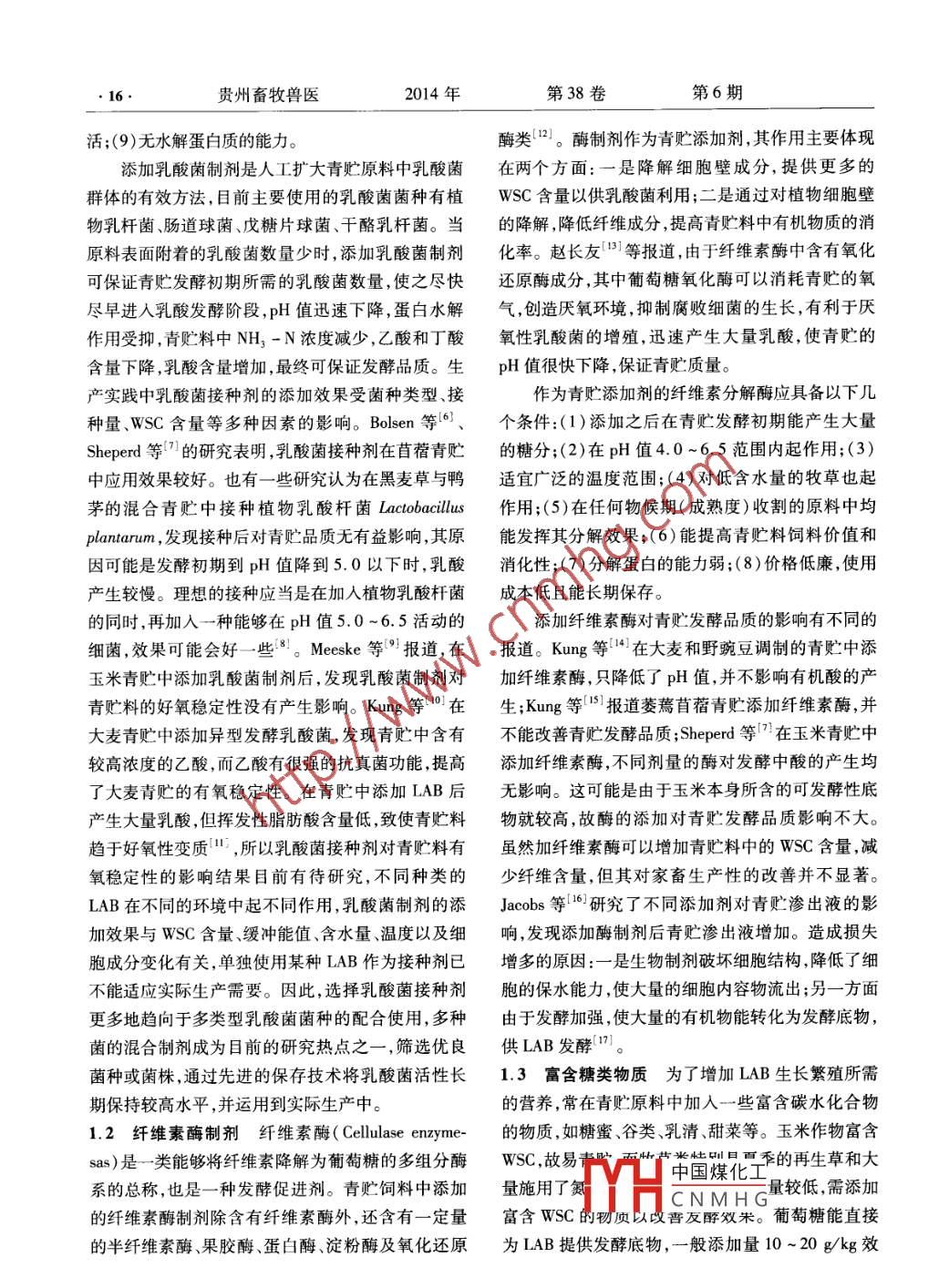 貴州畜牧獸醫(yī)2014年第38卷第6期. 15.飼草青貯添加劑研究進(jìn)展孫璀', 王育群',許留興”,張錦華°(1.湖南省雙峰縣畜牧水產(chǎn)局,湖南雙峰417700;2.貴州師范大學(xué),貴州貴陽5000; 3.貴州省畜牧獸醫(yī)研究所,貴州貴陽50005)摘要:為了提高飼草青貯發(fā)酵效率,改善發(fā)酵品質(zhì),調(diào)制青貯時常使用添加劑,文章綜述了近年來青貯添加劑的研究進(jìn)展。根據(jù)其作用機(jī)制青貯添加劑可以分為4類,分別是發(fā)酵促進(jìn)型添加劑、發(fā)酵抑制型添加劑、好氧性變質(zhì)抑制劑、營養(yǎng)型添加劑等。乳酸菌因具有促進(jìn)有氧穩(wěn)定性、抑制二次發(fā)酵、產(chǎn)生抗菌物質(zhì)、抑制有害微生物等特點(diǎn)已廣為應(yīng)用。纖維素酶制劑添加效果主要受酶本身的特性、青貯原料的特性及青貯時的管理等因素影響,其添加效果尚有待于進(jìn)一步 研究。綠汁發(fā)酵液是一種新型的青貯添加劑,具有取材方便、制作簡單的特點(diǎn),可明顯改善青貯原料的發(fā)酵品質(zhì)。未來飼草青貯添加劑應(yīng)用應(yīng)全面考慮環(huán)境要素,加強(qiáng)酶的活性研究,注重多學(xué)科綜合分析,用纖維素酶與乳酸菌、綠汁發(fā)酵液.蔗糖甲酸等常規(guī)青貯添加劑進(jìn)行復(fù)合青貯可能取得進(jìn)步。關(guān)鍵詞:飼草;添加劑;青貯;進(jìn)展中圖分類號: S816.5*3文獻(xiàn)標(biāo)識碼: A文章編號: 1007 - 1474(2014)06 -0015 -05.近年來,隨著國內(nèi)經(jīng)濟(jì)社會的發(fā)展,人均生活水.原料利用率等優(yōu)點(diǎn)。發(fā)酵促進(jìn)劑通過促進(jìn)乳酸菌平提高,對肉、奶、蛋的需求數(shù)量和質(zhì)量都呈.上升趨(LAB)的活動加快乳酸產(chǎn)生量,使青貯料的pH值勢,草地畜牧業(yè)的地位越加重要。發(fā)展草地畜牧業(yè)迅速 下降到4.0 +0.2,抑制有害微生物的繁殖。主是保障畜產(chǎn)品有效供給,緩解糧食供求矛盾,豐富居要包括乳酸菌類、含碳水化合物豐富的物質(zhì)和細(xì)胞民膳食結(jié)構(gòu)的重要途徑',青貯則是保存和開發(fā)飼壁降解酶等。料資源,發(fā)展“節(jié)糧型畜牧業(yè)的有效方式”12。青貯1.1 乳酸菌接種劑 -般情況下,青貯原料上附著加工研究發(fā)展的初期,青貯技術(shù)主要以前輩經(jīng)驗(yàn)借的乳酸菌數(shù)量不足,且多為不良菌種,而且青貯早期.鑒為主,伴隨著科學(xué)技術(shù)的深人發(fā)展,逐漸轉(zhuǎn)變到技乳酸菌繁殖緩慢,導(dǎo)致有害微生物迅速繁殖,抑制了術(shù)層面,而添加劑在整個青貯發(fā)展歷程中起到越來乳酸菌的繁殖,尤其是豆科牧草更為明顯。一般來越重要的作用。文章對近年來國內(nèi)外有關(guān)青貯添加說,使乳酸菌迅速增殖并占主導(dǎo)地位的植被中,乳酸劑研究進(jìn)展進(jìn)行了分析,并作出展望,旨在為今后的菌的有效濃度以10/g鮮草為標(biāo)準(zhǔn)值!3]。Tanaka4]青貯研究提供參考。和Bender G R{51等提出了作為青貯添加劑的乳酸菌接種劑應(yīng)具備以下條件:(1)生命力強(qiáng),在與其它微生1發(fā) 酵促進(jìn)劑物競爭中占主導(dǎo)地位;(2)能進(jìn)行同型乳酸發(fā)酵,使己發(fā)酵促進(jìn)劑是一-種復(fù)合型制劑,由酵母浸出物、糖發(fā)酵產(chǎn)生大量的乳酸,即對植物原料中碳水化合物酶制劑和無機(jī)鹽組成,具有增強(qiáng)原料的環(huán)境耐受力、有強(qiáng)的發(fā)酵能力;(3)有較強(qiáng)的耐酸能力,使pH值迅縮短發(fā)酵時間、優(yōu)化發(fā)酵指標(biāo)、促進(jìn)原料分解、提高速降至4.0以下,抑制其它微生物的活動;(4)能發(fā)酵果糖、葡萄糖、蔗糖、果聚糖,最好還能發(fā)酵戊糖;(5)收稿日期: 2014-06-15基金項(xiàng)目:十二五支撐計劃子課題“石漠化地區(qū)草地生產(chǎn)力維持及不能從蔗糖(果糖)產(chǎn)十葡空博式廿需醯,以上兩種過草畜平衡調(diào)控技術(shù)研究與示范”(2011BAC09B01 - 22) ;睛隆養(yǎng)羊家中國煤化工、庭牧場模式研究與示范(黔西南科合2013-8)程伴隨CO2形HHCNMHG文使有機(jī)酸發(fā)作者簡介:孫璀(1986-) ,男,碩士,獸醫(yī)師,主要從事重大動物疫病酵;(7)生長溫度范圍,可仕U~)U 范圍內(nèi)生長;防控、動物飼養(yǎng)管理方面的工作。*通訊作者(8)能夠在低含水率(如半干青貯)的青貯原料上存.貴州畜牧獸醫(yī)2014年第38卷第6期活;(9)無水解蛋白質(zhì)的能力。酶類(2]。酶制劑作為青貯添加劑,其作用主要體現(xiàn)添加乳酸菌制劑是人工擴(kuò)大青貯原料中乳酸菌在兩個方面:一是降解細(xì)胞壁成分,提供更多的群體的有效方法,目前主要使用的乳酸菌菌種有植WSC含量以供乳酸菌利用;二是通過對植物細(xì)胞壁物乳桿菌、腸道球菌、戊糖片球菌、干酪乳桿菌。當(dāng)?shù)慕到?降低纖維成分,提高青貯料中有機(jī)物質(zhì)的消原料表面附著的乳酸菌數(shù)量少時,添加乳酸菌制劑化率。趙長友[13] 等報道,由于纖維素酶中含有氧化可保證青貯發(fā)酵初期所需的乳酸菌數(shù)量,使之盡快還原酶成分,其中葡萄糖氧化酶可以消耗青貯的氧盡早進(jìn)人乳酸發(fā)酵階段,pH值迅速下降,蛋白水解氣,創(chuàng)造厭氧環(huán)境,抑制腐敗細(xì)菌的生長,有利于厭作用受抑,青貯料中NH, -N濃度減少,乙酸和丁酸氧性乳酸菌的增殖,迅速產(chǎn)生大量乳酸,使青貯的含量下降,乳酸含量增加,最終可保證發(fā)酵品質(zhì)。生pH值很