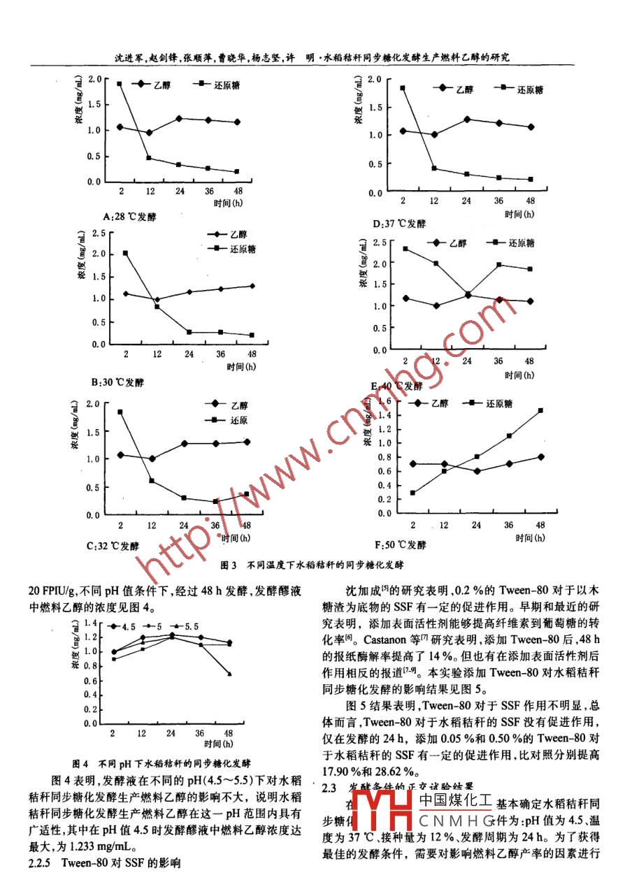 釀酒科技2010 年第2期(總第188期)-LIQUOR-MAKING SCIENCE & TECHNOLOGY 2010 No.2[Tol.188)水稻秸稈同步糖化發(fā)酵生產(chǎn)燃料乙醇的研究沈進(jìn)軍1.2,3 ,趙劍鋒1.2.3,張順萍3.4,曹曉華},楊志堅'2,許明(1.農(nóng)業(yè)部海峽兩岸農(nóng)業(yè)技術(shù)合作中心,福建福州350002;2.福 建農(nóng)林大學(xué)農(nóng)產(chǎn)晶品質(zhì)研兗所,福建福州350002;3.福建農(nóng)林大學(xué)生命科學(xué)學(xué)院,福建福州350002;4.福建農(nóng)林大學(xué) 菌物研究中心,福建福州350002)摘要:研究了培養(yǎng)基起始pH、發(fā)酵時間.發(fā)酵溫度、酵母接種量和吐溫80對水稻秸稈同步糖化發(fā)酵產(chǎn)乙醇的影響。結(jié)果表明,酵母接種量能有效地提高發(fā)酵液中乙醇的產(chǎn)率。水稻秸稈同步糖化發(fā)酵生產(chǎn)燃料乙醇的適宜發(fā)酵工藝條件為:起始pH值為4.0~4.5,培養(yǎng)溫度為32C,接種量為12%,發(fā)酵時間12~24h。在此條件下,生成乙醇的濃度為1.4 mg/mL,水稻秸稈原料的乙醇轉(zhuǎn)化率達(dá)7.02 %。關(guān)鍵詞:燃料乙醇; 水稻秸稈; 同步糖化發(fā)酵; 哈茨木霉中圖分類號:TS262.2;TS261.4;TS261.2文獻(xiàn)標(biāo)識碼:A文章編號: 1001-9286<2010)02- 0023-04Research on the Production of Fuel Ethanol by SimultaneousSaccharification and Fermentation of Rice StrawSHEN Jin-jun", ZHAO Jjan- feng'2, ZHANG Shun-ping3^ ,CAO Xiao-hua;,YANG Zhi-jian'2 and XU Ming(1. CrosStrait Agricultural Technology Cooperation Center ,Ministy of Agriculture, Fuzhou, Fujian 350002 ;2. AgriculuralProduct Quality Institute , Fujian Agriculture and Forestry University , Fuzhou, Fujian 350002 ;3. College ofLife Sciences,Fujian Agriculture and Forestry University ,Fuzhou, Fujan 350002;4. Mycological Research Center,Fujan Agriculture and Forestry University , Fuzhou,Fujian 350002, China)Abstract: The efeets of dfferent conditions incuding initial pH value of culture medium, fermentation time, fermentation temperature, and yeastinoculation quantity and Tween-80 on simultaneous saccharification and fermentation of rice straw to produce fuel ethanol were investigated. Theresults showed that yeast inoculation quantity could effectively increase ethanol yield in fermenting liquid. Under the optimum fermentation con-ditions (nitial pH as 4.0~4.5, fermentation temperature at 32 C, and yeast inoculation quantity was 12 %, and fernentation time was 12~ 24 b),the produced ethanol content was 1.4 mg/mL and the conversion rate from rice straw to ethanol was 7.02 %.Key words : fuel ethanol; rice straw; simulaneous saccharification and fermentation; Harianum Trichoderma以非糧食與經(jīng)濟(jì)作物為纖維素原料的生物燃料乙醇皮,葡萄糖20g,瓊脂粉20g,用水定容至1L。生產(chǎn)是決定未來大規(guī)模替代石油的關(guān)鍵。我國是農(nóng)業(yè)大基礎(chǔ)固體產(chǎn)酶培養(yǎng)基:稻草粉4g,麩皮1g,無機(jī)鹽國,每年可產(chǎn)生秸稈7億多t,相當(dāng)于315億t標(biāo)準(zhǔn)煤,但培養(yǎng)液15mL(KH2PO,4g/L,NH)zSO416g/L,Mg-目前大量秸稈就地焚燒既污染環(huán)境又浪費能源。因此,在SO41 g/ L)"。我國開發(fā)利用秸稈生產(chǎn)燃料乙醇更具有現(xiàn)實意義。而水- -級種子培養(yǎng)基:葡萄糖20 g/L,蛋白胨5g/L,酵母稻秸稈是我國三大農(nóng)作物秸稈之一,約占全國秸稈總量膏3g/L,自然pH。的25.10%。因此,研究利用水稻秸稈產(chǎn)乙醇是解決人類二級種子培養(yǎng)基:葡萄糖30g/L,蛋白胨5 gL,酵母糧食、能源、環(huán)境三大危機(jī)的重中之重,有利于解決秸稈就地焚燒造成的污染和浪費,并可增加農(nóng)民收入,這符合乙醇發(fā)酵培養(yǎng)基;稻草粉2 g,纖維素酶液按20 IU/g我國“三農(nóng)問題"的需求,也符合我國農(nóng)業(yè)可持續(xù)發(fā)展與稻草粉加入,酵母菌以10%接種量加入。生態(tài)農(nóng)業(yè)發(fā)展的需求。.2 菌種哈茨木霉(Harianum Trichoderma);葡萄牙假絲酵母1材料與方法(Candida lusitaniae)。1.1培養(yǎng)基馬鈴薯葡萄糖瓊脂(PDA)培養(yǎng)基:馬鈴薯200 g、去.中國煤化工稈2g,纖維素酶液按基金項目:省科技創(chuàng)新平臺建設(shè)計劃項目“福建省特種稻創(chuàng)新平臺建設(shè)"(2007S1YHC N M H G稻育種與綜合利用技術(shù)研究"(2008N20001-4)。收稿日期:2009-12-17作者簡介:沈進(jìn)軍(1983-),男,碩士研究生.研究方向:應(yīng)用微生物。通訊作者:許明(1978-),男,博士,主要從事特種稻育種與利用研究。23釀酒科技2010 年第2期(總第188期).LIQUOR-MAKING SCIENCE & TECHNOLOGY 2010 No.2(ol.188)20 IU/g稻草粉加入,酵母菌以10 %接種量加入,瓶口塞◆乙醇+還原糖橡皮塞(插有針頭,以排出生成的CO2)以控制厭氧條件,在不同溫度、不同時間、不同接種量、不同起始pH值等.成0條件下進(jìn)行燃料乙醇發(fā)酵的單因子影響試驗和正交試0.8驗,測定發(fā)酵醪液中燃料乙醇的濃度、糖分含量。0.60.441.4酶活力測定方法.0.2濾紙酶(FPA)活力:通常以濾紙酶活力(FPA)代表纖12維素酶的總活力,按照國際理論和應(yīng)用化學(xué)協(xié)會(IU-時間(h)PAC)推薦的國際標(biāo)準(zhǔn)方法測定叫,以國際單位IU表示。圖1時間對同步 糖化發(fā)酵的影響試管中放人1x6 cm whatmanNo.l濾紙(約50 mg)- - 條,接種的酵母數(shù)量有限,總代謝速度低于較高的酶解產(chǎn)糖加入0.5mL適當(dāng)稀釋的纖維素酶液和1.5mL檸檬酸緩速度所致。另外,采用的酵母對于底物中復(fù)雜的成分可能沖液(pH4.8),于50 C水浴60 min??瞻自囼炛谐敢菏滦枰欢ǖ倪m應(yīng)過程才可以發(fā)揮作用。在發(fā)酵中后期,發(fā)先滅活外,其余條件不