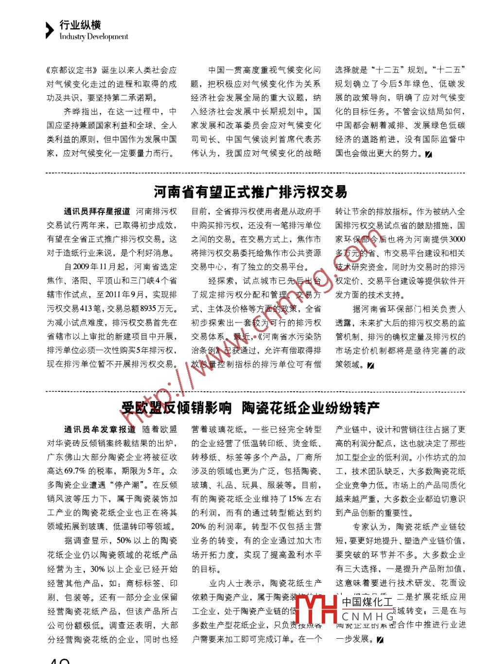 >行業(yè)縱橫Industry Development《京都議定書》誕生以來人類社會應中國一貫高度重視氣候變化問選擇就是“十二五”規(guī)劃。“十二五”對氣候變化走過的進程和取得的成題,把積極應對氣候變化作為關系規(guī)劃確立了今后5年綠色、低碳發(fā)功及共識,要堅持第二承諾期。經濟社會發(fā)展全局的重大議題,納展的政策導向,明確了應對氣候變齊曄指出,在這一-過程中,中入經濟社會發(fā)展中長期規(guī)劃中。國化的目標任務。不管會議結局如何,國應堅持兼顧國家利益和全球、全人家發(fā)展和改革委員會應對氣候變化中國都會朝著減排、發(fā)展綠色低碳類利益的原則,但中國作為發(fā)展中國司司長、中國氣候談判首席代表蘇經濟的道路前進, 沒有國際監(jiān)督中家,應對氣候變化- -定要 量力而行。偉認為,我國應對氣候變化的戰(zhàn)略國也會做出更大的努力。U河南省有望正式推廣排污權交易通訊員拜存星報道河南排污權目前,全省排污權使用者是從政府手轉讓節(jié)余的排放指標。作為被納入全交易試行兩年來,已取得初步成效,.中購買排污權,還沒有一筆排污單位國排污權交易試點省的鼓勵措施,國有望在全省正式推廣排污權交易。這之間的交易。在交易方式上,焦作市家環(huán)保部今后也將為河南提供3000對于造紙行業(yè)來說,是個利好消息。將排污權交易委托給焦作市公共資源多萬元的省、市交易平臺建設和相關自2009年11月起,河南省選定交易中心,有了獨立的交易平臺。技術研究資金,同時為交易時的排污焦作、洛陽、平頂山和三門峽4個省經探索,試點城市已先后出臺權定價、交易平臺建設等提供軟件開轄市作試點,至2011年9月, 實現(xiàn)排了規(guī)定排污權分配和管理、交易方發(fā)方面 的技術支持。污權交易413筆,交易總額8935萬元。式、主體及價格等方面的政策,全省據(jù)河南省環(huán)保部門相關負責人為減小試點難度,排污權交易首先在初步探索出一套較為可行的排污權透露, 未來擴大后的排污權交易的監(jiān)省轄市以上審批的新建項目中開展,交易體系。最近,《河南省水污染防管機制、排污的確權定量及排污權的排污單位必須- -次性購買5年排污權,治條例》已獲通過,允許有償取得排市場定價機制都將是亟待完善的政現(xiàn)在排污單位暫不開展排污權交易。放總量控制指標的排污單位可有償策領域。u受歐盟反傾銷影響陶瓷花紙企業(yè)紛紛轉產通訊員牟發(fā)章報道隨著歐盟營著玻璃花紙。一些已經完全轉型產業(yè)鏈中,設計和營銷往往占據(jù)了更.對華瓷磚反傾銷案終裁結果的出爐,的企業(yè)經營了低溫轉印紙、燙金紙、高的利潤分配點,這也就決定了那些廣東佛山大部分陶瓷企業(yè)將被征收轉移紙、標簽等多個產品。廠商所加工型企業(yè)的低利潤。 小作坊式的加高達69.7%的稅率,期限為5年。力涉及的領域也更為廣泛,包括陶瓷、工,技術團隊缺乏,大多數(shù)陶瓷花紙多陶瓷企業(yè)遭遇“停產潮"。在反傾玻璃、禮品、玩具、服裝等。目前,企業(yè)競爭力低。市場.上的產品同質化銷風波等壓力下,屬于陶瓷裝飾加有的陶瓷花紙企業(yè)維持了15%左右越來越嚴重,大多數(shù)企業(yè)都迫切意識工產業(yè)的陶瓷花紙企業(yè)也正在將其的利潤,而有的通過轉型能達到約到產品創(chuàng)新的重要性。領域拓展到玻璃、低溫轉印等領域。20%的利潤率。轉型不僅包括主營專家認為,陶瓷花紙產業(yè)鏈較據(jù)調查顯示,50%以上的陶瓷業(yè)務的轉變,有的企業(yè)通過加大市短,要更好地提升、塑造產業(yè)鏈價值,花紙企業(yè)仍以陶瓷領域的花紙產品場開拓力度,實現(xiàn)了提高盈利水平要突破的環(huán)節(jié)并不多。大多數(shù)企業(yè)經營為主,30%以上企業(yè)已經開始的目標。.有三大選擇,-是提升產品附加值,經營其他產品,如:商標標簽、印業(yè)內人士表示,陶瓷花紙生產這意味著要進行技術研發(fā)、花面設刷、包裝等。還有一部分企業(yè)保留依賴于陶瓷產業(yè),屬于陶瓷裝的戶中國煤化工二是擴展花紙應用經營陶瓷花紙產品,但該產品所占工企業(yè), 處于陶瓷產業(yè)鏈的低頁域轉變;三是在與TYHCN MH G_公司份額極低。調查還表明,大部多數(shù)生產型花紙企業(yè),只負責妝只脊陶甕正業(yè)的系密合作中推進行業(yè)進分經營陶瓷花紙的企業(yè),同時也經戶需 要來加工即可完成訂單。在- -個一步發(fā)展。 MA40 NO.2 20121 CHINA PAPER NEWSIETTER