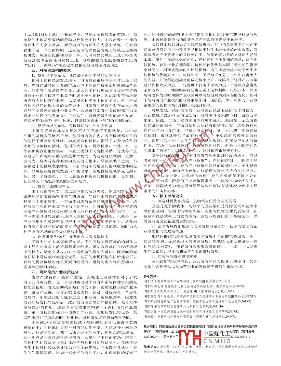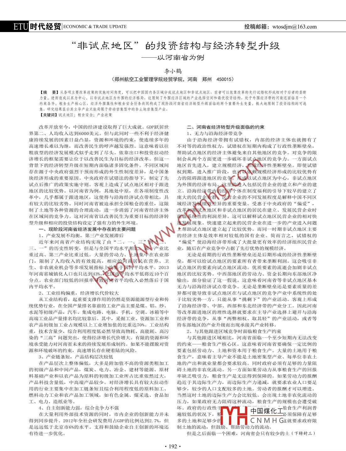 ETU時(shí)代經(jīng)貿(mào)|ECONOMIC & TRADE UPDATE投稿郵箱: wtosdjm@ 163.com“非試點(diǎn)地區(qū)”的投資結(jié)構(gòu)與經(jīng)濟(jì)轉(zhuǎn)型升級(jí)-以河南省為例李小鶴(鄭州航空工業(yè)管理學(xué)院經(jīng)貿(mào)學(xué)院,河南鄭州450015)摘要]從各項(xiàng)主要改革政策的實(shí)施時(shí)間角度,可以把中國(guó)國(guó)內(nèi)各區(qū)域分成試點(diǎn)地區(qū)和非試點(diǎn)地區(qū)。前者可以依靠改革的先行試錯(cuò)權(quán)形成相對(duì)于后者的壟斷量,進(jìn)而造成以其為中心,以非試點(diǎn)地區(qū)為外圍的經(jīng)濟(jì)格局。這限制了外圍經(jīng)濟(jì)區(qū)域的產(chǎn)業(yè)選擇空間和最優(yōu)投資結(jié)構(gòu)。處于外圍經(jīng)濟(jì)帶的河南還面臨另一個(gè)約束條件,糧食生產(chǎn)核心區(qū)。經(jīng)濟(jì)外圍屬性和糧食安全任務(wù)共同構(gòu)成了現(xiàn)階段河南省經(jīng)濟(jì)轉(zhuǎn)型升級(jí)面臨的兩個(gè)重要外生變量,極大地限制了投資結(jié)構(gòu)的可選集。研究結(jié)果顯示其主導(dǎo)產(chǎn)業(yè)只能局限于勞動(dòng)密集型中的非土地密集型產(chǎn)業(yè)。[關(guān)鍵詞]試點(diǎn)地區(qū);糧食安全;產(chǎn)業(yè)政策改革開放至今,中國(guó)的經(jīng)濟(jì)建設(shè)取得了巨大成就。GDP躍居世二、河南省經(jīng)濟(jì)轉(zhuǎn)型升級(jí)面臨的約束界第二、人均收入達(dá)到6000美元。但與此同時(shí)- -些不利于經(jīng)濟(jì)健1、無力與沿海經(jīng)濟(jì)帶競(jìng)爭(zhēng)康持續(xù)發(fā)展的因素日益凸顯,資源和環(huán)境的約束,使連續(xù)多年的由于沿海經(jīng)濟(jì)帶擁有試錯(cuò)權(quán),內(nèi)部的經(jīng)濟(jì)主體也就擁有了高速增長(zhǎng)難以為繼,而改善民生的呼聲越發(fā)強(qiáng)烈。這意味著以往不對(duì)等的政治性權(quán)力,試錯(cuò)權(quán)在短期內(nèi)構(gòu)成了行政性壟斷壁壘,粗放型的經(jīng)濟(jì)發(fā)展模式似乎走到了盡頭。依靠出口和投資拉動(dòng)經(jīng)幫助試點(diǎn)地區(qū)的經(jīng)濟(jì)主體避免來自其他地區(qū)的競(jìng)爭(zhēng)。對(duì)競(jìng)爭(zhēng)的限濟(jì)增長(zhǎng)的框架需要讓位于以改善民生為目標(biāo)的經(jīng)濟(jì)改革。但這一制會(huì)從兩個(gè)方面更進(jìn)一步破壞非試點(diǎn)地區(qū)的競(jìng)爭(zhēng)力。一方面試點(diǎn)背景下的經(jīng)濟(jì)轉(zhuǎn)型升級(jí)在短期內(nèi)面臨諸多固化條件。不同區(qū)域間地區(qū)首先進(jìn)入,建立規(guī)模經(jīng)濟(jì),形成經(jīng)濟(jì)性壟斷壁壘。即使試錯(cuò)存在源于中央政府強(qiáng)烈干預(yù)而形成的外生性制度差異,是中國(guó)條權(quán)到期,進(jìn)入推廣階段,也可以依賴規(guī)模經(jīng)濟(jì)形成的比較優(yōu)勢(shì)有塊經(jīng)濟(jì)形成的重要原因。中央政府在試錯(cuò)法的指導(dǎo)下,制定了先力的阻礙跟進(jìn)地區(qū)的競(jìng)爭(zhēng)。形成以試點(diǎn)地區(qū)為中心,非試點(diǎn)地區(qū)試點(diǎn)后推廣的政策實(shí)施守則??陀^.上造成了試點(diǎn)地區(qū)相對(duì)于跟進(jìn)為外圍的經(jīng)濟(jì)布局。這里的進(jìn)入包括民營(yíng)企業(yè)的建立和產(chǎn)業(yè)的建地區(qū)的比較優(yōu)勢(shì)。以河南省為例,其地處中原,在各項(xiàng)制度性改立。沿海經(jīng)濟(jì)帶內(nèi)的經(jīng)濟(jì)個(gè)體在制度福利的引導(dǎo)下較早的建立了革中,幾乎都屬于跟進(jìn)地區(qū),這使得與沿海經(jīng)濟(jì)試點(diǎn)帶相比,具龐大的民營(yíng)企業(yè)群,民營(yíng)企業(yè)的不同發(fā)展程度是解釋中國(guó)不同區(qū)有較大的比較劣勢(shì)。同時(shí)河南省被迫承擔(dān)全國(guó)糧倉(cāng)的重任,這限域經(jīng)濟(jì)發(fā)展績(jī)效差異的重要變量。受惠于中央政府的“偏愛”,制了土地等各種資源的合理流動(dòng),進(jìn)一步消弱了河南省經(jīng)濟(jì)主體改革初期試點(diǎn)地區(qū)和非試點(diǎn)地區(qū)的居民在建立、發(fā)展民營(yíng)企業(yè)時(shí)在區(qū)域間的競(jìng)爭(zhēng)力。這對(duì)河南省以改普民生為重要目標(biāo)的經(jīng)濟(jì)轉(zhuǎn)面臨系統(tǒng)性的利潤(rùn)差異。這可以解釋試點(diǎn)地區(qū)民營(yíng)企業(yè)的相對(duì)快型升級(jí)和相應(yīng)的投資結(jié)構(gòu)設(shè)定了強(qiáng)有力的外生環(huán)境。速發(fā)展現(xiàn)象??焖俳⑵饋淼拿駹I(yíng)企業(yè)在進(jìn)--步的產(chǎn)業(yè)進(jìn)入問題一--、現(xiàn)階段河南省經(jīng)濟(jì)發(fā)展中存在的主要問題上幫助試點(diǎn)地區(qū)建立起了比較優(yōu)勢(shì)。而同一時(shí)期非試點(diǎn)地區(qū)主要1、產(chǎn)業(yè)發(fā)展不均衡,第三產(chǎn)業(yè)發(fā)展滯后的經(jīng)濟(jì)主體是效率相對(duì)較低的國(guó)有企業(yè)。簡(jiǎn)而言之,試錯(cuò)權(quán)的近年來河南省產(chǎn)業(yè)結(jié)構(gòu)實(shí)現(xiàn)了由“二、三”到“二、“偏愛”使沿海經(jīng)濟(jì)帶形成了大批量更有效率的經(jīng)濟(jì)組織民營(yíng)企三、一”的歷史性轉(zhuǎn)變,但是與全國(guó)平均水平相比,第--產(chǎn)業(yè)比業(yè),隨后在產(chǎn)業(yè)競(jìng)爭(zhēng)中占據(jù)了先行優(yōu)勢(shì)的規(guī)模經(jīng)濟(jì)。重過高、第三產(chǎn)業(yè)比重過低