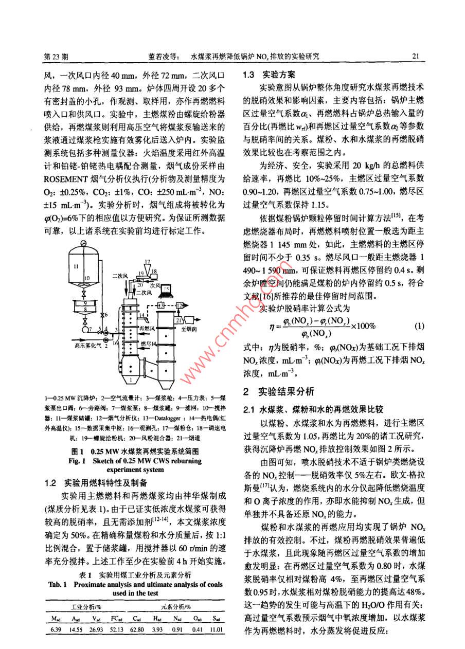 水煤漿再燃降低鍋爐NOx排放的實驗研究
