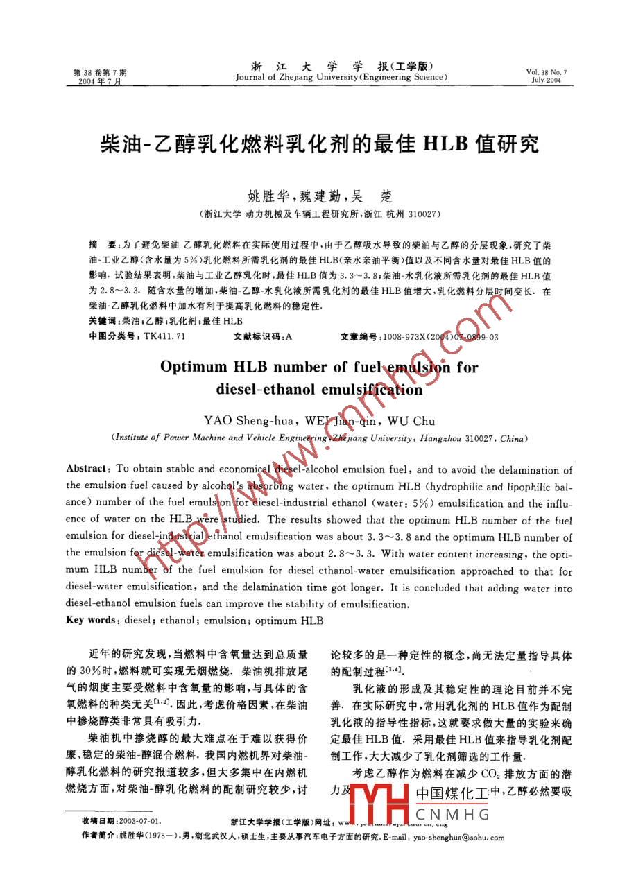 38卷第7期浙江大學學報(工學版)Journal of Zhe jiang Uniniversity(Engineering Science)柴油-乙醇乳化燃料乳化劑的最佳HLB值研究姚勝華,魏建勤,吳楚(浙江大學動力機械及車輛工程研究所,浙江杭州310027)摘要:為了避免柴油-乙醇乳化燃料在實際使用過程中,由于乙醇吸水導致的柴油與乙醇的分層現(xiàn)象,研究了柴油-工業(yè)乙醇(含水量為5%)乳化燃料所需乳化劑的最佳HLB(親水親油平衡)值以及不同含水量對最佳HLB值的影響,試驗結果表明,柴油與工業(yè)乙醇乳化時,最佳HLB值為3.3~38;柴油-水乳化液所需乳化劑的最佳HLB值為2.8~3.3.隨含水量的增加,柴油-乙醇水乳化液所需乳化劑的最佳HLB值增大,乳化燃料分層時間變長。在柴油-乙醇乳化燃料中加水有利于提高乳化燃料的穩(wěn)定性關鍵詞:柴油;乙醇;乳化劑;最佳HLB中圖分類號:TK411.71文獻標識碼:A文章編號:1008-973X(2004)07-089903Optimum HLB number of fuel emulsion fordiesel-ethanol emulsificationYAO Sheng-hua, WEI Jian-qin, WU ChuInstitute of Power Machine and Vehicle Engineering, Zhejiang University, Hangzhou 310027, ChirAbstract: To obtain stable and economical diesel-alcohol emulsion fuel, and to avoid the delamination ofthe emulsion fuel caused by alcohols absorbing water, the optimum HLB(hydrophilic and lipophilic balance)number of the fuel emulsion for diesel-industrial ethanol (water: 5%)emulsification and the inflence of water on the hlB were studied. The results showed that the optimum HLB number of the fuelemulsion for diesel-industrial ethanol emulsification was about 3.3-3. 8 and the optimum HLB number ofthe emulsion for diesel-water emulsification was about 2.8-3. 3. With water content increasing, the optimum HLB number of the fuel emulsion for diesel-ethanol-water emulsification approached to that fordiesel-water emulsification, and the delamination time got longer. It is concluded that adding water intodiesel-ethanol emulsion fuels can improve the stability of emulsificationKey words: diesel; ethanol; emulsion; optimum HLB近年的研究發(fā)現(xiàn),當燃料中含氧量達到總質量論較多的是一種定性的概念,尚無法定量指導具體的30%時,燃料就可實現(xiàn)無煙燃燒.柴油機排放尾的配制過程41氣的煙度主要受燃料中含氧量的影響,與具體的含乳化液的形成及其穩(wěn)定性的理論目前并不完氧燃料的種類無關:2.因此,考慮價格因素,在柴油善.在實際研究中,常用乳化劑的HLB值作為配制中摻燒醇類非常具有吸引力乳化液的指導性指標,這就要求做大量的實驗來確柴油機中摻燒醇的最大難點在于難以獲得價定最佳HLB值.采用最佳HLB值來指導乳化劑配廉、穩(wěn)定的柴油醇混合燃料.我國內燃機界對柴油-制工作,大大減少了乳化劑篩選的工作量醇乳化燃料的研究報道較多,但大多集中在內燃機考慮乙醇作為燃料在減少CO2排放方面的潛燃燒方面對柴油醇乳化燃料的配制研究較少,討力中國煤化工中,乙醇必然要吸收稿日期:2003-07-01浙江大學學報(工學版)網(wǎng)址:wCNMHG作者簡介:姚勝華(1975-),男,湖北武漢人,碩土生主要從事汽車電子方面的研究E-mailtyao-shenghus@sohu.com大學學報(工學版)第38卷水而使柴油與乙醇發(fā)生分層的現(xiàn)象,本文研究了柴油工業(yè)乙醇(v(H2O)為5%)最佳HLB值以及不同含水量對柴油乙醇最佳HILB值的影響1研究方法采用機械攪拌方式制備乳化劑.自行設計的攪圖2柴油-水擬乳化效率曲線拌器空載轉速在11000r/min以上,對柴油、醇混合Fig 2 Emulsification efficiency of diesel-water fuel by液的攪拌時間只需1min左右即可使柴油與醇均勻analogy混合·為了避免高速攪拌時溫度升高,從而影響乳化液的特性,制備乳化劑時連續(xù)攪拌時間不超過的擬乳化效率圖乳化液的組成為:V(柴油):V(工2min,相鄰兩次攪拌時間間隔不短于10min.本研業(yè)乙醇)=8:1,V(柴油):V(水)=8:1.將等體究在實際操作時,將柴油、醇或水按一定比例配制積但HLB值不同(1.8~6.0)的乳化劑加入到配制好,置入燒杯中攪拌,得到所需乳化液好的等體積的柴油工業(yè)乙醇混合液中圖中橫坐標采用靜置等待、自然分層的辦法來獲得分層時為HLB值縱坐標為分層時間比間.分層時間由目測確定.使用單側平行光源入射從圖1、2可知,當HLB值為3.3~3.8時,柴試樣,觀察者從垂直于入射光的方向觀測,觀測距離油工業(yè)乙醇的分層時間最長;當HLB值為2.8~不大于25cm,乳化柴油形成均質的乳白色或乳黃3.3時,柴油水的分層時間最長,因此柴油工業(yè)乙色液體。一旦這種均質液體中出現(xiàn)可觀測到的液滴醇所需乳化劑的最佳HLB值為3.3~3.8,柴油水或沉積物,那就意味著乳化柴油已經(jīng)開始分層規(guī)定所需乳化劑的最佳HLB值則為2.8~3.3從靜置開始到此時所經(jīng)歷的時間為分層時間22含水量對柴油-乙醇的乳化劑的最佳HLB值通過將等量、不同HLB值的乳化劑與相同的柴的影響油-工業(yè)乙醇溶液配制成多個試樣,然后測定各個試文獻[3]指出水對柴油-乙醇乳化液的分層時間樣的分層時間,確定具有最長分層時間的試樣,則這有很大影響.但缺少含水量對乳化效果影響的具體樣試樣所用乳化劑的HLB值就是最佳HLB.各試數(shù)據(jù),而且也未論及含水量不同時最佳HLB值是否樣分層時間與最長時間之比介于0~1.0,文中以變化.將不同含水量的乙醇水溶液與柴油按1:P來代表乳化效率繪出表面活性劑的擬乳化效率圖.的比例混合,在環(huán)境溫度為14℃的條件下,得到擬乳化效率曲線.圖3為不同體積分數(shù)(中(乙醇)=V2試驗結果及分析(乙醇)/(V(乙醇)+V(水)的乙醇與柴