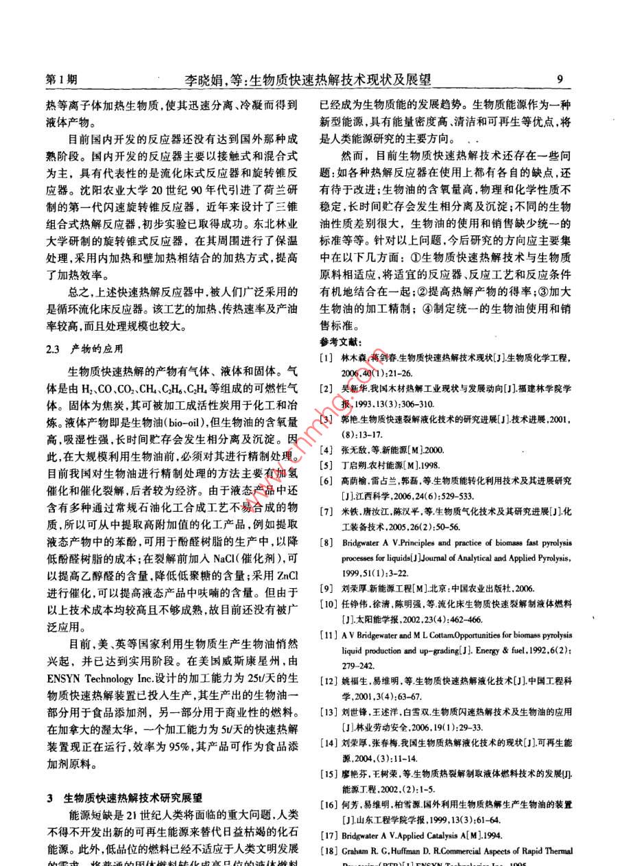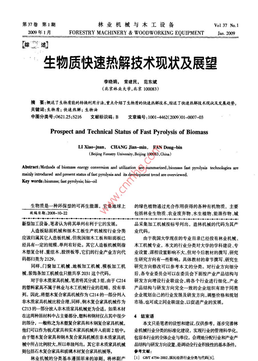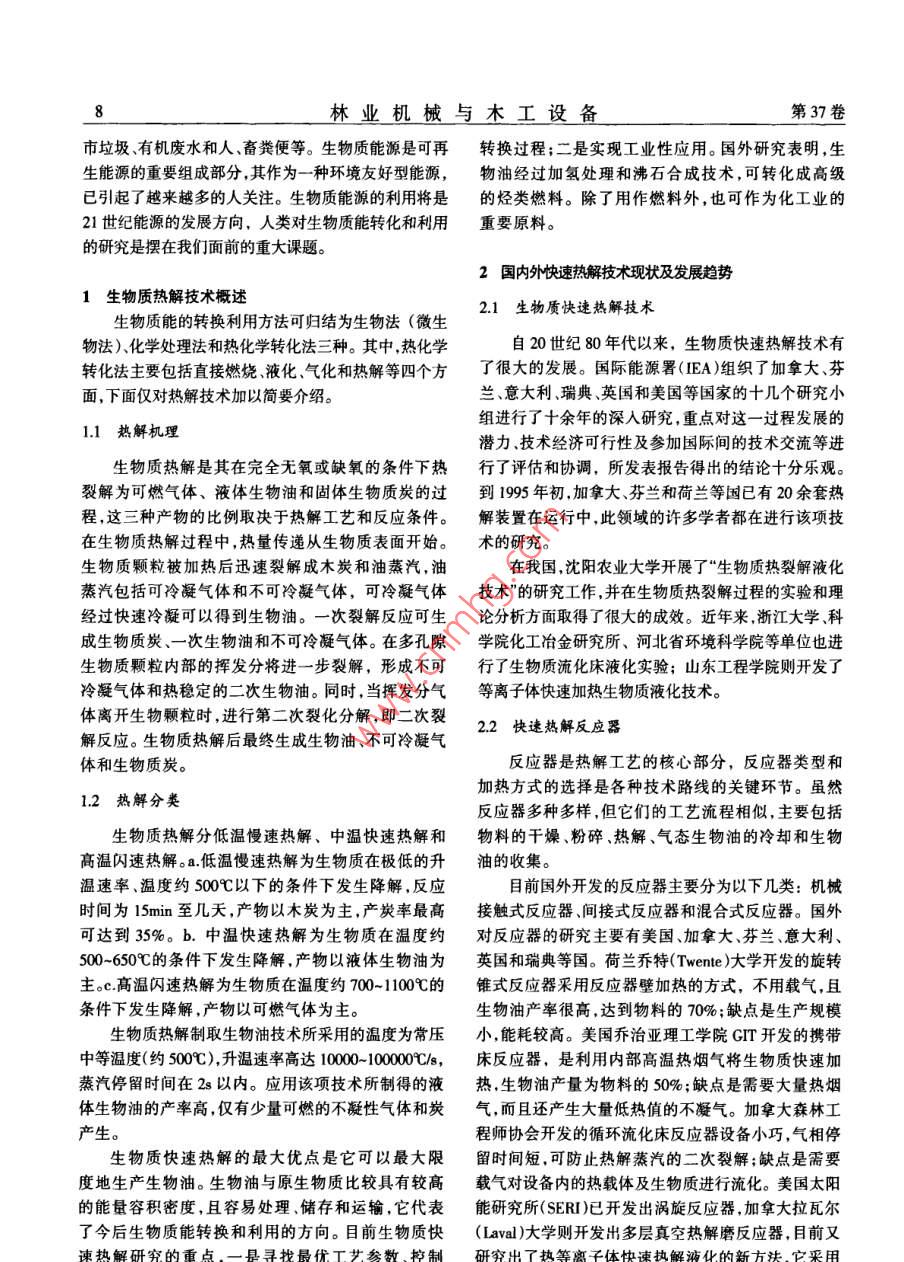第37卷第1期林業(yè)機(jī)械與木工設(shè)備Vol 37 No. 12009F1 A FORESTRY MACHINERY WOOD WORKING EQUIPMENTJan.2009綜述生物質(zhì)快速熱解技術(shù)現(xiàn)狀及展望李曉娟,常建民,范東斌(北京林業(yè)大學(xué),北京100083)摘要:概述了生物質(zhì)能的轉(zhuǎn)換利用方法,重點(diǎn)介紹了生物質(zhì)的快速熱解技術(shù),綜述了快速熱解技術(shù)現(xiàn)及發(fā)展趨勢(shì)。關(guān)鍵詞:生物質(zhì);快速熱解;生物油中圖分類號(hào):062125;5216文獻(xiàn)標(biāo)識(shí)碼:B文章編號(hào):1001-4462(20001-0007-03Prospect and Technical Status of Fast Pyrolysis of BiomassLI Xiao-juan, CHANG Jian-min, FAN Dong-bin( Beijing Forestry University, Beijing 100083, China)Abstract: Methods of biomass energy conversion and utilization are summarized biomass fast pyrolysis technologies aremainly introduced and present status of fast pyrolysis and its development trend are overviewed.Key words biomass; fast pyrolysis; bio-oil生物質(zhì)是一種環(huán)保型的可再生能源,它是地球上的綠色植物通過光合作用獲得的各種有機(jī)物質(zhì),主要收稿日期:2008-10-22包括林業(yè)生物質(zhì)農(nóng)業(yè)廢棄物、水生植物能源作物、城新型加工設(shè)備,筆者認(rèn)為將其單列有利于它的發(fā)展。品采集加工機(jī)械按標(biāo)號(hào)列出,造林機(jī)械的代碼為其產(chǎn)人造板貼面機(jī)械和細(xì)木工板生產(chǎn)機(jī)械按行業(yè)分類業(yè)代碼應(yīng)該歸屬其它人造板機(jī)械但我國(guó)細(xì)木工板和貼面板已由于我國(guó)大學(xué)現(xiàn)在的專業(yè)目錄已經(jīng)沒有林業(yè)機(jī)械經(jīng)具有一定的規(guī)模,單列有好處。其它人造板機(jī)械則指木工機(jī)械專業(yè),本文的行業(yè)分類對(duì)大學(xué)的學(xué)科建設(shè)專木塑復(fù)合材、重組木、膠拼板等,它們的行業(yè)產(chǎn)業(yè)方向代業(yè)設(shè)置課程設(shè)置影響不大但對(duì)今后教材的撰寫研究碼都?xì)w類為2129。生研究方向有一些影響。具體教材的章節(jié)撰寫、研究生同樣,門窗加工機(jī)被地板加工機(jī)械模板加工機(jī)研究方向修改可以參考本文的分類。對(duì)行業(yè)方向細(xì)分械裝飾條加工機(jī)械也只能共享2031這個(gè)代碼。后各專業(yè)委員會(huì)可以在委員會(huì)下面按產(chǎn)業(yè)產(chǎn)品結(jié)構(gòu)與對(duì)于非木質(zhì)家具機(jī)械筆者將其分成3組由于C24研發(fā)方向增設(shè)行業(yè)聯(lián)誼會(huì)將各個(gè)行業(yè)進(jìn)行細(xì)化,產(chǎn)業(yè)的塑料家具不屬于林業(yè)與木工機(jī)械行業(yè)的范疇,沒有單產(chǎn)品結(jié)構(gòu)與研發(fā)方向完全一致的企業(yè)組織有助于同類列。因此將塑木復(fù)合家具機(jī)械作為C4的一部分列入企業(yè)規(guī)劃自己的行業(yè)發(fā)展及研發(fā)方向調(diào)整價(jià)格和規(guī)劃非木質(zhì)家具機(jī)械比較合理同樣鋼木復(fù)合家具機(jī)械作為市場(chǎng)也可成立同業(yè)聯(lián)誼會(huì)以促進(jìn)產(chǎn)業(yè)的發(fā)展。c23的部分放入非木質(zhì)家具機(jī)械更為合適。如果木材在這兩種原材料中占主要部分塑料和鋼材僅占其中很少4結(jié)束語的部分,一般稱之為木塑復(fù)合家具和木鋼復(fù)合家具機(jī)械本文只是筆者的設(shè)想和建議,僅供參考。逐步完善林他們可以作為板式家具和實(shí)木家具機(jī)械并入前面2組中。業(yè)機(jī)械行業(yè)分類的標(biāo)準(zhǔn)化建設(shè),實(shí)現(xiàn)行業(yè)的管理科學(xué)化,由于塑木復(fù)合家具和鋼木復(fù)合家具機(jī)械在非木質(zhì)家具機(jī)包容本行業(yè)的全體企業(yè)與單位,合理地分配行業(yè)和產(chǎn)業(yè)產(chǎn)械中所占比例較大所以單獨(dú)列出。其它非木質(zhì)家具機(jī)械品結(jié)構(gòu)與研發(fā)方向設(shè)置是調(diào)動(dòng)全行業(yè)積極性的基本條件。則包括石木復(fù)合家具和玻璃木材復(fù)合家具機(jī)械等。參考文獻(xiàn):林業(yè)機(jī)械的分類基本遵循原來的原則,將林副產(chǎn)[1lGBr475420,國(guó)民經(jīng)濟(jì)行業(yè)分類與代碼S林業(yè)機(jī)械與木工設(shè)備第37卷市垃圾、有機(jī)廢水和人、畜糞便等。生物質(zhì)能源是可再轉(zhuǎn)換過程;二是實(shí)現(xiàn)工業(yè)性應(yīng)用。國(guó)外研究表明,生生能源的重要組成部分,其作為一種環(huán)境友好型能源,物油經(jīng)過加氫處理和沸石合成技術(shù),可轉(zhuǎn)化成高級(jí)已引起了越來越多的人關(guān)注。生物質(zhì)能源的利用將是的烴類燃料。除了用作燃料外,也可作為化工業(yè)的21世紀(jì)能源的發(fā)展方向,人類對(duì)生物質(zhì)能轉(zhuǎn)化和利用重要原料。的研究是擺在我們面前的重大課題。2國(guó)內(nèi)外快速熱解技術(shù)現(xiàn)狀及發(fā)展趨勢(shì)1生物質(zhì)熱解技術(shù)概述2.1生物質(zhì)快速熱解技術(shù)生物質(zhì)能的轉(zhuǎn)換利用方法可歸結(jié)為生物法(微生物法)化學(xué)處理法和熱化學(xué)轉(zhuǎn)化法三種。其中,熱化學(xué)自20世紀(jì)80年代以來,生物質(zhì)快速熱解技術(shù)有轉(zhuǎn)化法主要包括直接燃燒、液化、氣化和熱解等四個(gè)方了很大的發(fā)展。國(guó)際能源署(IEA)組織了加拿大、芬面,下面僅對(duì)熱解技術(shù)加以簡(jiǎn)要介紹。蘭、意大利、瑞典、英國(guó)和美國(guó)