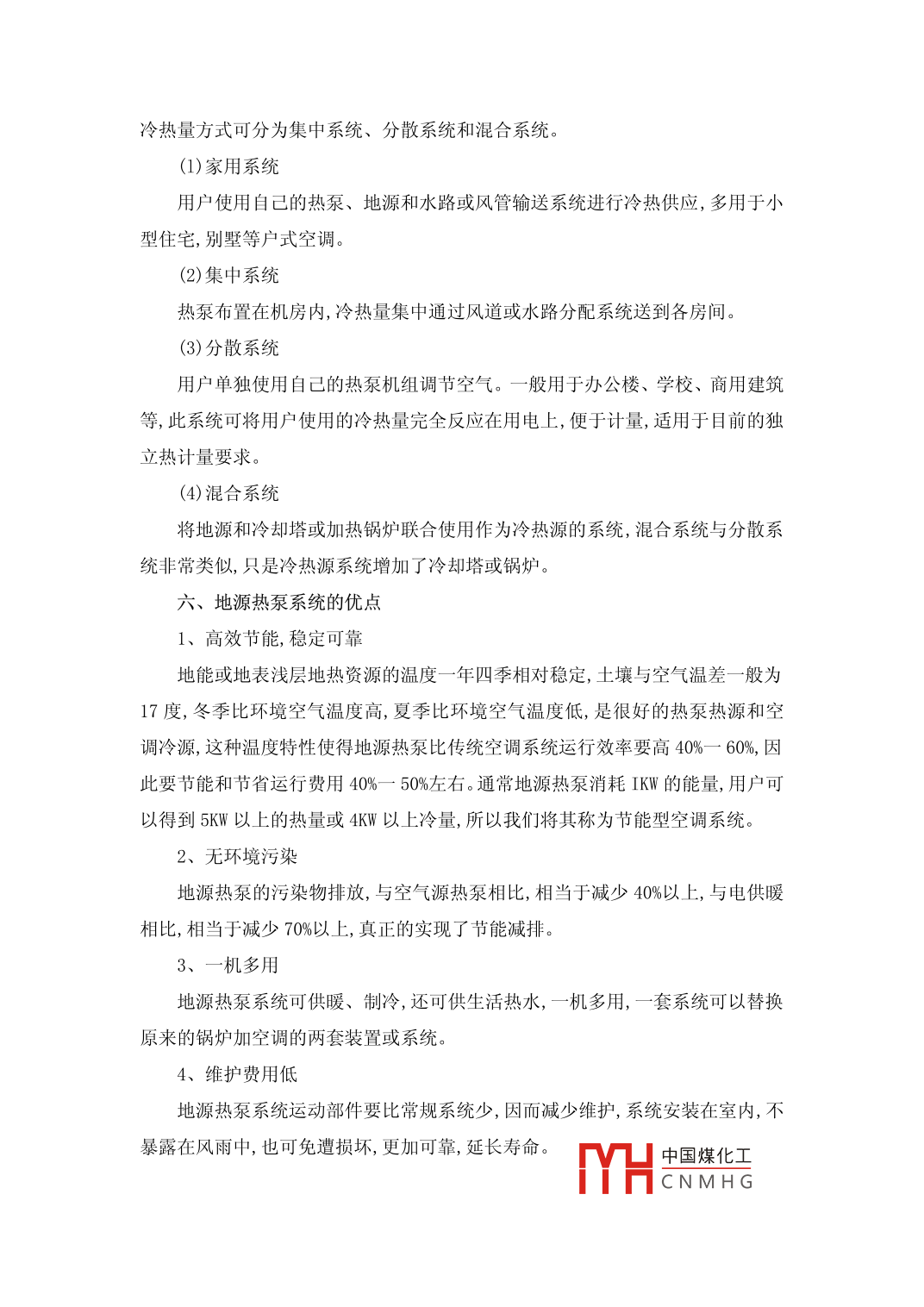 地源熱泵的節(jié)能機(jī)理陳保存河北拓為工程設(shè)計有限公司065000【摘要】隨著全球不可再生資源的急劇下降,人們開始對可再生資源的利用逐漸加強。地源熱泵技術(shù)就是其中的一項重大成果,本文將對這項技術(shù)進(jìn)行詳細(xì)介紹?!娟P(guān)鍵詞】地源熱泵;原理;節(jié)能中圖分類號:TM8文獻(xiàn)標(biāo)識碼:A文章編號前言人類社會經(jīng)濟(jì)的發(fā)展,是以浪費能源為代價。由于長期以來人們對能源消耗沒有引起足夠重視,而使得大量的能源被浪費。隨著近些年能源短缺,人們逐漸加強了對能源利用的關(guān)注程度。地源熱泵技術(shù)是一種新型的能源利用技術(shù),是利用豐富的地能來實現(xiàn)冬季取暖,夏季采涼的先進(jìn)技術(shù)。由于地能具有清潔無污染、能源取之不竭等特點,因此,地源熱泵技術(shù)的開發(fā)和應(yīng)用必將成為未來能源利用技術(shù)中的主要組成部分。地源熱泵節(jié)能系統(tǒng)的組成1、地源熱泵系統(tǒng)的構(gòu)成地源熱泵系統(tǒng)主要分三部分:室外地能換熱系統(tǒng)、地源熱泵機(jī)組和室內(nèi)采暖、采冷空調(diào)末端系統(tǒng)。其中地源熱泵機(jī)主要有兩種形式:水一水式、水一土壤或水空氣式。三個系統(tǒng)之間靠水或空氣換熱介質(zhì)進(jìn)行熱量的傳遞,地源熱泵與地能之間換熱介質(zhì)為水,與建筑物采暖空調(diào)末端換熱介質(zhì)可以是水或空氣。其中地源熱泵機(jī)組是其核心設(shè)備2、熱泵的組成熱泵與制冷的原理和系統(tǒng)設(shè)備組成及功能是一樣的,對蒸氣壓縮式熱泵(制冷)系統(tǒng)主要由壓縮機(jī)、蒸發(fā)器、冷凝器和節(jié)流閥組成。壓縮機(jī):起著壓縮和輸送循環(huán)工質(zhì)從低溫低壓處到高溫高壓處的作用,是熱泵(制冷)系統(tǒng)的心臟;蒸發(fā)器:是輸出冷量的設(shè)備,它的作用是使經(jīng)節(jié)流TH中國煤化工發(fā)CNMHG以吸收被冷卻物體的熱量,達(dá)到制冷的目的冷凝器:是輸岀熱量的設(shè)備,從蒸發(fā)器中吸收的熱量連同壓縮機(jī)消耗功所轉(zhuǎn)化的熱量在冷凝器中被冷卻介質(zhì)帶走,達(dá)到制熱的目的膨脹閥或節(jié)流閥:對循環(huán)工質(zhì)起到節(jié)流降壓作用,并調(diào)節(jié)進(jìn)人蒸發(fā)器的循環(huán)工質(zhì)流量。3、熱泵的工作原理熱泵的主要工作過程是:壓縮機(jī)吸人蒸發(fā)器內(nèi)產(chǎn)生的低溫低壓制冷劑蒸氣,保持蒸發(fā)器內(nèi)的低壓狀態(tài),創(chuàng)造了蒸發(fā)器內(nèi)制冷劑液體不斷地在低溫下吸收載冷劑熱量而沸騰的條件;吸人的蒸氣經(jīng)過壓縮,其溫度、壓力升高,創(chuàng)造了制冷劑被液化的條件;高溫高壓蒸氣排人冷凝器后,在壓力保持不變的情況下,被冷卻介質(zhì)(水)冷卻,放岀熱量,溫度降低,并進(jìn)一步凝結(jié)成液體,從冷凝器排出;高壓制冷劑液體經(jīng)過節(jié)流閥時,因受阻而使壓力下降,導(dǎo)致部分制冷劑液體氣化,吸收氣化潛熱,使其本身的溫度也相應(yīng)降低,成為低溫低壓下的濕蒸氣,進(jìn)人蒸發(fā)器;在蒸發(fā)器中,制冷劑液體在壓力不變的情況下,吸收載劑(水)的熱量(即制取冷量)而氣化,形成的低壓低溫蒸氣又被壓縮機(jī)吸走,如此周而復(fù)始的往復(fù)循環(huán)。4、熱泵的節(jié)能和能效熱泵的節(jié)能主要是體現(xiàn)在它可以將較低的能量轉(zhuǎn)換成較高的能量,在地源熱泵技術(shù)的應(yīng)用中主要表現(xiàn)在消耗較少的電能,再利用熱泵轉(zhuǎn)換出較多的熱能,以供用戶取暖。據(jù)相關(guān)研究顯示,當(dāng)熱泵消耗1單位的電能時,就可以產(chǎn)生3-5單位的熱能,這不僅能使能源利用率得到很大提升,也具有更高的經(jīng)濟(jì)性。、地源熱泵節(jié)能特點地表淺層土壤熱資源的溫度一年四季相對穩(wěn)定,冬季的地表淺層土壤比環(huán)境空氣溫度髙,夏季的地表淺層土壤比環(huán)境空氣溫度低,是很好的熱泵冷熱源。地表土壤的溫度特性使地源熱泵的運行效率比傳統(tǒng)空調(diào)系統(tǒng)高并且相對節(jié)能。地源熱泵是利用淺層土壤地?zé)豳Y源作為冷熱源進(jìn)行能量轉(zhuǎn)換的供暖空調(diào)系統(tǒng)。這種儲存于地表淺層的可再生能源,使地能成為一種可再生能源。地?zé)嵩礋岜孟到y(tǒng)可供暖、供冷,可應(yīng)用于賓館、商場、辦公樓、學(xué)校等建筑,更適合于賓館和學(xué)校生、生活用熱水,能產(chǎn)生顯著的效益。四、三種地源熱泵系統(tǒng)中國煤化工CNMHG地源熱泵系統(tǒng)根據(jù)所利用的地?zé)豳Y源分為地下水源熱泵系統(tǒng)、地表水熱泵系統(tǒng)和土壤源熱泵系統(tǒng)三類。1、地下水熱泵系統(tǒng)(1)地下水熱泵系統(tǒng)工作原理地下水熱泵系統(tǒng),也就是通常所說的深井回灌式水源熱泵系統(tǒng)。通過建造抽水井群將地下水抽出,通過二次換熱或直接送至水源熱泵機(jī)組,經(jīng)提取熱量或釋放熱量后,再由回灌井群灌回地下。(2)地下水熱泵系統(tǒng)的優(yōu)點①節(jié)約能量,環(huán)保無污染。在整個釆暖和制冷過程中,只向水源中吸熱或者排熱,并不消耗水量也不污染水。②節(jié)省面積。不使用冷水塔,不消耗冷卻水,節(jié)省占地面積③經(jīng)濟(jì)價值高(3)地下水熱泵系統(tǒng)的缺點大量利用水資源,適宜于地下水資源豐富的地區(qū),否則若處理