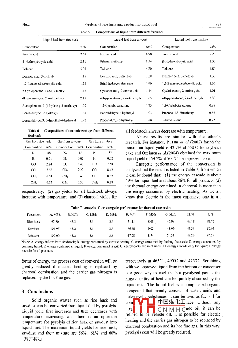 ISSN 1001-<0742Jurnd of FEnmirnmental Sciences Vol. I8, No.2, p.392- -396, 2006CN11- 2629/XArticle I. 10-0742006)02-0392-05CLC mumber: X706Document code:APyrolysis of rice husk and sawdust for liquid fuelZHU Xi-feng', ZHENG Jji-lu, GUO Qing xiang, ZHU Qing shi(Biomass Clean Energy L.aboratony, Unirersity of Science and Technology of China. Hefei 230026, China. E mail: xfzhu@ustc edu.cn)Abstract: The paper is focused on studying; how to convert ricc husk and sawdust into liquid fucl. Rice husk, sawdust and theirmixture were pyrolyzed at the temperature bctwcen 420C and 540C , and the main product of liquid fuel was obtaincd. Theexpecrimental result showed that the yield of liquid fuel heavily depended on the kind of feedstock and pyrolysis temperature. In theexperiments, thc maximum liquid yields for rice husk, sawdust and their mixture were 56% at 465C, 61% at 490C and 60% at 47SCrespectively. Allalysis with GC-MS and other apparatus indicated that the liquid fuel is a complicated organic cormpound with lowcaloric value and can be directly used as fuel oil without any up-grading. As a crude oil, the liquid fuel can be refined to be vehicle oil.Keywords: solid organic waste; rice husk; sawdust; pyrolysis; liquid fuelIntroductionEven though pyrolysis of sawdust had been studiedRice husk and sawdust from agriculture andby some researchers, there are yet many problems towood industry are abundant with an annual productionbe solved. For example, chemical composition ofof more than 900 million tons of dry mass in China.un-condensable gas from pyrolysis of sawdust is stillThe traditional methods such as composting andunknown; pyrolysis of rice busk or the mixture of riceincineration are not suitablc 10 process these organichusk and sawdust for liquid fuel in a fluidized bedsolid wastes as they contain lttle nitrogen forhave not ever been studicd. A life-cycle analysis of thecomposting and lot of solid grains and smoke will beenergetic performance of thermal conversion, whichreleased to pollute environment during incineration.has been not studied by other researchers, is presentedTherefore, an advisable method should be developedin this paper. Moreover, this paper speciallyto deal with rice husk and sawdust.emphasizes on and analyzes the significance ofIn fact, solid organic wastes such as rice husk andcnvironment protection when pyrolyzing sawdust andsawdust is a kind of renewable resource. Solid organicice husk for liquid fuel, namely the liquid fuelwastes can be pyrolyzcd and changed into liquid fuelconverted from rice husk and sawdust is much cleaner(Bridgwater et al, 1999; Bridgwater and Peacoke,than fossil fucls and un-condensable gas will not2000). For instance, wood Icaf (Zabanioto ancpollute air. .Karabelas, 1999), soybean cake (Puttn et al., 2002)The purpose on this paper was t0 find anand rapeseed cake (0zcimen and Karaosmanoglu,advisable method to deal with organic solid waste and2004) all can be converted to liquid fuel. Yi et al.present a systcmatic research about the method-(2000) obtained liquid fuel from corn stalk. Algae canpyrolysis, which will convert organic solid waste suchbe also converled into liquid fuel (Peng et al., 2000;as rice husk and sawdust into liquid fucl. Furthermore,Sawayamna el al, 1999; Ginburg, 1993). Dai et al.this paper was also aimed at that liquid fucl converted(2000) and Ren el al. (2002) studied the eficct offrom rice husk and sawdust which is cleaner comparedreaction tcmperature on the product yield whenwith fossil fuels and the proccss of pyrolysis of ricepyrolyzing sawdust. Luo et al.(2005) studiced pyrolysishusk and sawdust will not bring about polution.of rice straw, wood and obuained the kinetics models1 Experimentalof their conversion. All kinds of rcactors, such asrotating cone reactor (Wagenaar, 1987), vacuum1.1 Materialspyrolysis reactors (Lemieux el al, 1987) and vortexThe experimental malcrials include rice husk,reactors (Diebold and Scahill, 1987), are uscd tosawdust, sand and nitrogen. Their physica! properticspyrolyze organic solid wastes. Just as wood leaf,such as density and diameter arc listed in Table I. Therapesced cake and soybean cake, rice husk andproximate analysis of rice husk and sawdust are listedsawdust are also derived from green plants and aren Table 2. Sand is used as the thermal carrier toable to be converted into liquid fuel as follows:quickly transfer hcat from hot nitrogen to rice husk orCharcolsaw中國(guó)煤化工。Rice husk: gas to fluidize ricecoolhuskJMYHC N M H Guidized-bed reactor.Organic steam- Liquid fuelSawdust1.2 Experimental deviceAs shown in Fig.l, the experimental deviceUn-condensable gasmainly consists of a hopper, two screw feeders, a1Fogp數(shù)據(jù)The National Nanual Sciene Foundation of Chin(Nol.50576091); * Crreponding auhorNo.2Pyrolysie of rice husk and sawdust for liquid fucl393Table 1 Physical property of experimental materialsconfiguration and size, among them the first one isMatcrialDensily, kgim'Avernrageneter, mused to control the fceding rate and the second oneSawdust800.000344runs at relativly high speed to avoid jamming infeeding system. The fluidized-bed reactor has theRice husk300.003192height of 2 m and the diameter of 70 mm in which riceSand26000.00045husk or sawdust is rapidly heated for pyrolysis. Theelectric heater can pre-heat nitrogen to theTable 2 Proximate analysis of rice husk and sawdusttemperature of 450C to 550"C before entering intoMaterialMoisture, Ash, Volatile, Fixed carbon, Low heat value,the fluidized-bed reactor. The two cyclones are usedw1% wt% w1%wt%MJ/kgto separate solid particles such as charcoal and ashfrom the hot gas. The condenser has some nozzles inSawdust 9.06 7.36 71.905.21its topper and a heat exchanger in its middle, in whichRice husk 7.70 18.X0) 64.309.2013.36the pyrolyzed hot gas can be quickly cooled intoliquid by scrubbing with the condensed liquid pumpedelcctric heater, a fluidized-bed reactor; two cyclones,from the bottom of condenser, a