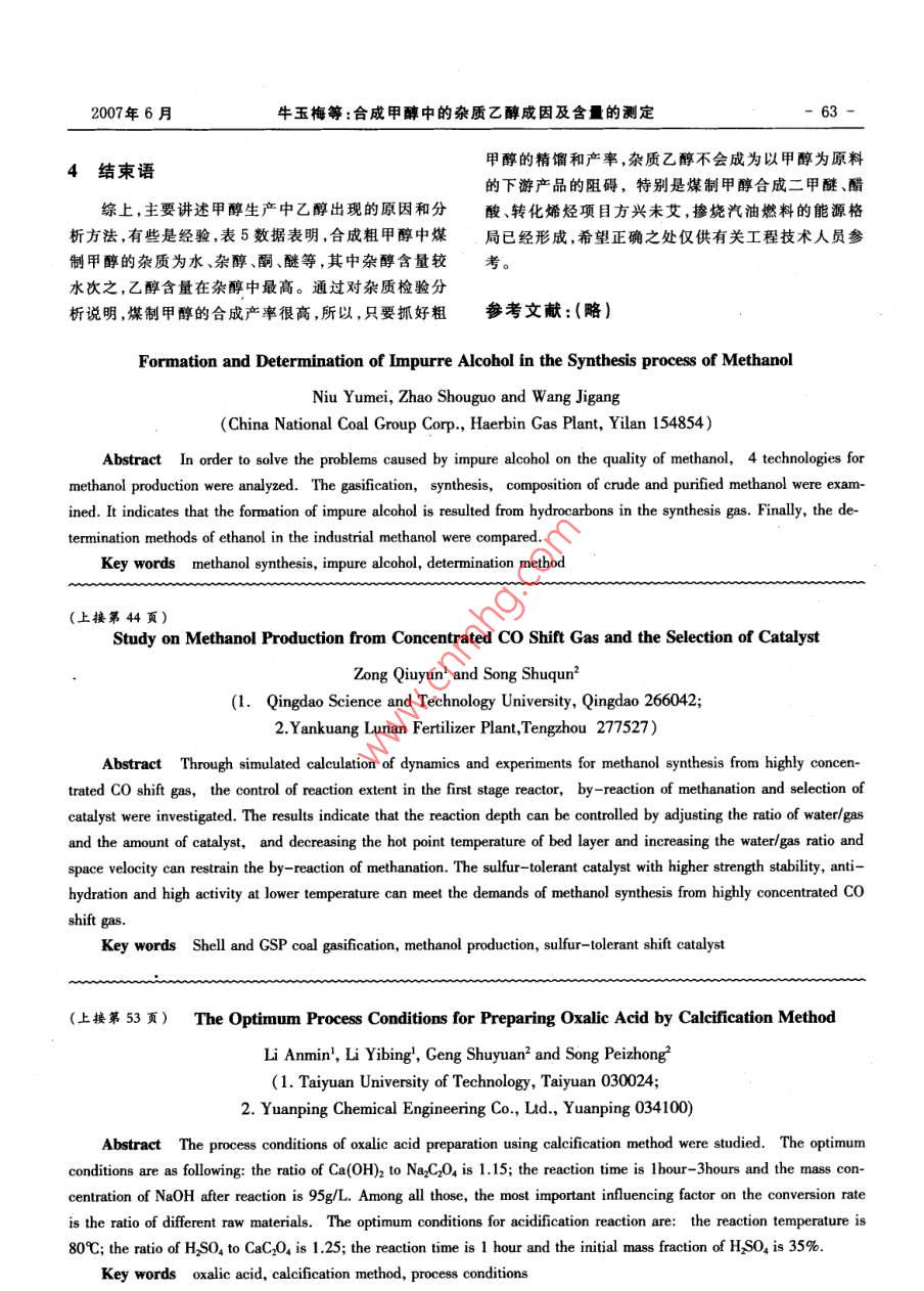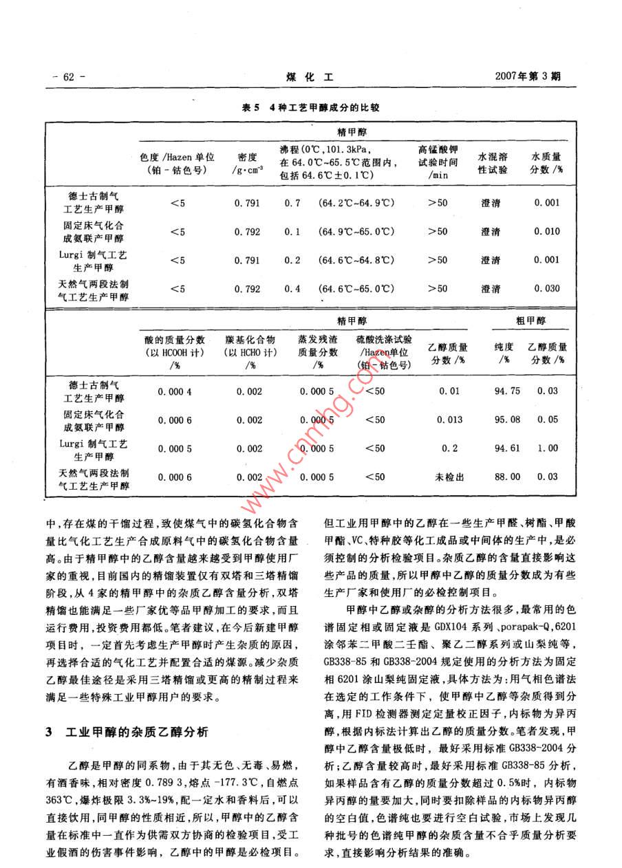 第3期(總第130期)No. 3 (Total No 130)2007年6月Coal Chemical IndustryJun.2007合成甲醇中的雜質(zhì)乙醇成因及含量的測(cè)定牛玉梅趙守國(guó)王繼剛(中煤龍化集團(tuán)哈爾濱氣化廠,依蘭154854摘要為解決甲醇產(chǎn)品中雜質(zhì)乙醇的影響問(wèn)題,對(duì)4種甲醇生產(chǎn)工藝中的造氣工藝、合成工藝、粗甲醇和精甲醇成分進(jìn)行考查并檢驗(yàn)分析,總結(jié)出合成甲醇過(guò)程中,雜質(zhì)乙醇的成因主要是合成氣中的碳?xì)浠衔锖恳鸬?并對(duì)工業(yè)甲醇中乙醇含量的測(cè)定方法進(jìn)行了比較。關(guān)鍵詞合成甲醇雜質(zhì)乙醇分析方法文章編號(hào):10059598(2007)-03-0060-04中圖分類號(hào):TQ223.122文獻(xiàn)標(biāo)識(shí)碼:B為了解決中煤龍化集團(tuán)哈爾濱氣化廠部分甲醇產(chǎn)品中乙醇含量影響產(chǎn)品質(zhì)量的問(wèn)題,筆者先后兩次1造氣工藝方法的對(duì)比參觀考查了4家生產(chǎn)甲醇的企業(yè),2個(gè)甲醇使用單位和省級(jí)分析檢測(cè)中心,主要考查合成甲醇工藝中的雜11德士古水煤漿氣化工藝質(zhì)乙醇成因及含量的測(cè)定。并對(duì)4家企業(yè)的造氣工德士古水煤漿氣化工藝為主的某廠,由于高溫氣藝、氣體成分,合成塔的溫度、壓力、催化劑、精餾塔、化反應(yīng)完全,生產(chǎn)中無(wú)焦油和烴類生成,對(duì)粗煤氣進(jìn)粗甲醇和精甲醇的試驗(yàn)方法和檢驗(yàn)規(guī)則進(jìn)行了研究行中溫變換、NHD脫硫脫碳技術(shù)后,CO2體積分?jǐn)?shù)3%~分析,認(rèn)為合成氣中的碳?xì)浠衔锖渴怯绊懞铣杉?%,總硫質(zhì)量濃度小于2mg/m3,干法活性炭精脫硫后醇時(shí)雜質(zhì)乙醇成因及含量成因的主要依據(jù)。合成氣總硫質(zhì)量濃度小于0.75mg/m3,氣體成分見(jiàn)表1。表1德士古水煤漿氣化工藝中氣體成分c0%B/%0/%N%0%a%cl%總S質(zhì)量濃度/E:m粗煤氣54.2034.1011.000.400.200.10未檢出0.35%凈煤氣24.0170.080.600.31未檢出2.0合成氣12.0179,033.000.434.54未檢出0.75甲醇合成塔采用urgi管殼型,催化劑為南化院栲膠法和888脫硫,合成氨和尿素后的尾氣為凈煤NC307型,觸媒于2005年1月投入運(yùn)行。生產(chǎn)能力為氣,液氨法脫碳技術(shù),夾心餅法精脫硫,總硫質(zhì)量濃度年產(chǎn)15萬(wàn)t甲醇,采用三塔精餾工藝,預(yù)塔為48層小于1mg/m3,氣體成分見(jiàn)表2。塔板,塔板采用規(guī)整填料,不加水,加堿量根據(jù)酸堿度甲醇合成塔采用 Lurgi管殼型,內(nèi)裝NC307型催間歇加入,低沸點(diǎn)醚類放空;加壓塔為浮閥塔,85層化劑,觸媒于2004年5月投入運(yùn)行。生產(chǎn)能力為年產(chǎn)塔板;常壓塔為浮閥塔,85層塔板,10層、26層進(jìn)料,5萬(wàn)t甲醇,采用兩塔精餾工藝,預(yù)塔釆用浮閥塔,485層、7層采出雜醇,一般不采。層塔板,加水量0.33m3/h,一般在開(kāi)車時(shí)加堿,低沸點(diǎn)12常壓固定床煤制氣工藝醚類放空;常壓塔為浮閥塔,85層塔板,22層、26層常壓固定床煤制氣工藝,采用全低溫變換,部分30層、34層進(jìn)料,13層、15層、17層、19層間歇采出雜醇,一般不采。收稿日期:2007-01-1213 Lurgi爐煤制氣工藝作者簡(jiǎn)介:牛玉梅(1963),女,1988年畢業(yè)于哈爾濱工Lurgi爐煤制氣工藝生產(chǎn)的粗煤氣,由于煤氣生大學(xué),高級(jí)工程師,主要從事煤化工技術(shù)和管理工2007年6月牛玉梅等:合成甲醇中的雜質(zhì)乙醇成因及含量的測(cè)定表2常壓固定床煤制氣工藝中氣體成分C0/%H2/%C02/%N/%0/%CH4/%Cnm/%總S質(zhì)量濃度/mg·m3凈煤氣14.567.43.6未檢出合成氣l1.77.50.2未檢出用低溫變換制氫、低溫甲醇洗脫硫脫碳、CO2體積分?jǐn)?shù)性炭精脫硫,合成氣總硫質(zhì)量濃度小于0.06mg/m3,氣控制在3%左右,總S質(zhì)量濃度小于2.3ng/m3,干法活體成分見(jiàn)表3。表3Lurg爐煤制氣工藝中氣體成分C/%CO2/%CnHm/%總S質(zhì)量濃度/mng·m3粗煤氣38.80.40.200.15%凈煤氣17.16l.53.00.40.2016.51.782.0合成氣7.960.03.00.60.4028.02.350.06甲醇合成塔共2套裝置,釆用林德均溫型工藝,業(yè)分析變化不大,只是合成溫度較末期低,各種氣NC307型合成催化劑,觸媒于2005年6月投入第2體參數(shù)一樣。套裝置運(yùn)行。生產(chǎn)能力為年產(chǎn)14萬(wàn)t甲醇,采用兩14以天然氣為原料的兩段法制氣工藝塔精餾工藝,預(yù)塔48層塔板,常壓塔為85層塔板以天然氣為原料的兩段法制氣工藝,需空分裝置有高沸點(diǎn)雜醇間歇采出,高沸點(diǎn)甲醇不加工直接外提供純氧在二段爐中進(jìn)行部分氧化反應(yīng),將CH4轉(zhuǎn)化售。2006年5月13日第1套裝置更換新觸媒成部分C0、CQ2和氫氣,后續(xù)原料氣加工簡(jiǎn)單。S含量NC307,新觸媒同前末期生產(chǎn)的粗甲醇、精甲醇的工低,一般不測(cè),氣體成分見(jiàn)表4表4以天然氣為原料的兩段法制氣工藝中氣體成分√%CnHm/%總S質(zhì)量濃度/合成氣21.4669.13760.020.021.38未檢出未檢出合成塔采用 Lurgi管殼型,南化院NC307型甲醇以上合成氣體成分含量看出,一般合成氣中的CH含合成催化劑,觸媒于2004年4月投入運(yùn)行。目前生產(chǎn)量高時(shí),Cnh恤m含量也高,而且烯烴水化后就是醇。筆能力10萬(wàn)t/a,采用三塔精餾工藝。者認(rèn)為,甲醇中的雜質(zhì)乙醇主要是由合成氣中的碳?xì)?種工藝的甲醇成分分析見(jiàn)表5?;衔顲2不飽和烴造成的,另外,甲醇中雜質(zhì)產(chǎn)生的2分析評(píng)價(jià)原因還有:催化劑末期和溫度升高的影響,循環(huán)氣中未分離的甲醇?xì)怏w再參與反應(yīng)