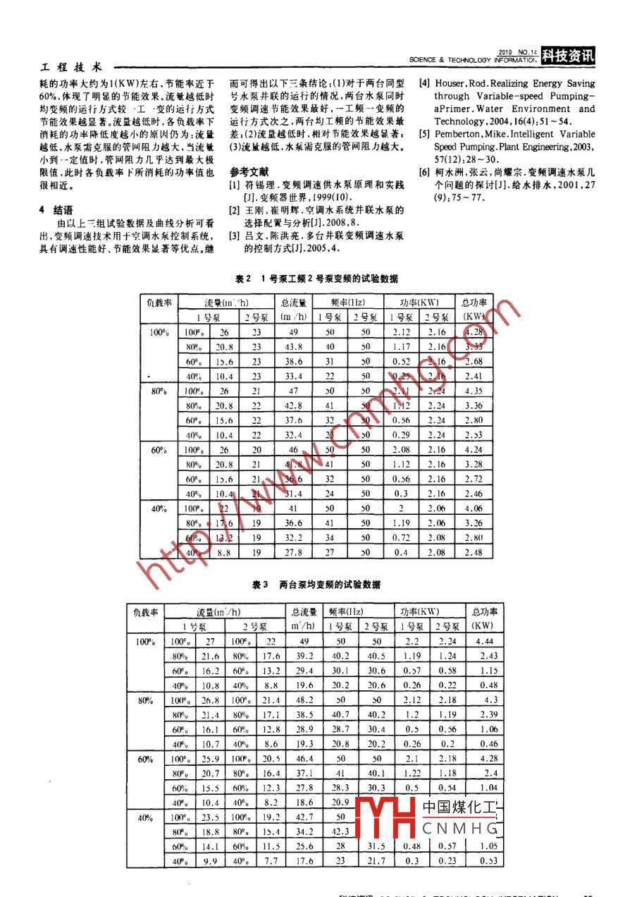 科技資訊NC公TENCO NFORMATON2010 NO.14工程技術(shù)空調(diào)循環(huán)水系統(tǒng)兩臺水泵并聯(lián)運行方式節(jié)能分析付靜劉辛國(北京建筑工程學(xué)院北京 100044)摘要:本文針對空調(diào)水累統(tǒng)中兩臺同型號水暴并聯(lián)運行的三種運行方式:均工頻運行.一工頻一變頻運行. 均變頻運行,對其節(jié)能效果進行了大量的實驗操作和數(shù)據(jù)處理,通過比較,分析并論證了負荷變化時三種運行方式的水聚節(jié)能情況。關(guān)鍵詞:并聯(lián)水聚變頻調(diào)達 中央空調(diào) 節(jié)能分析中圖分類號:TU83文獻標識碼:A文章編號:1672-3791(2010)05(b)-0064-02隨著大型和超大型建筑的不斷增多,在 設(shè)計負荷的50%- 70%以下運行.并且時兩臺變頻柜及功率表、流量計.轉(zhuǎn)速儀等。中央空調(diào)水系統(tǒng)越來越多的采用兩臺或多刻都 在波動.所以實際負荷總不能達到設(shè)設(shè)兩單元五層的10個閥1 ]均打開時,臺水泵并聯(lián)的運行方式,對于采用兩臺水計的滿負荷狀態(tài),造 成了能址的嚴重浪費,負載為100%,每關(guān)掉一個閥門,負載降低泵并聯(lián)運行的系統(tǒng),有些系統(tǒng)采用兩臺泵嚴 重影響經(jīng)濟效益和入們的生活水平,因10%,實驗中分別測試兩臺泵隨負載和流量均工頻運行方式,有些系統(tǒng)采用工頻一而 如何能降低空調(diào)的能耗,成為一個亟待的變化采用均工頻、 .工頻.變頻.均變頻變頻運行方式,還有些系統(tǒng)則采用兩臺泵解決的大課題。時的各泵頻率.流量.功率等參數(shù)值,通過同時變頻的運行方式,因為空調(diào)負荷是隨繪制P-Q曲線圖對三種運行方式進行對室內(nèi)室外環(huán)境的變化而不斷變化的,顯然2 中央空調(diào)水系統(tǒng)簡介及本論文所應(yīng)用試比,分析其節(jié)能效果。兩臺水泵均采用工頻運行會造成很大浪驗平 臺的描述費。節(jié)能空調(diào)系統(tǒng)大多采用變頻調(diào)速系統(tǒng),2.1 中央空調(diào)水系統(tǒng)的簡介3試驗及理論分析但既有I頻又有變頻的運行狀態(tài)和兩泵同中央空調(diào)系統(tǒng)供冷的冷源為冷水機.3.1兩臺泵均工頻時變頻哪個更節(jié)能,,針對此問題現(xiàn)有“同時組,其冷凝器側(cè)為冷卻水系統(tǒng).蒸發(fā)器側(cè)為此實驗中,始終保持兩臺泵的頻率為變頻更節(jié)能”的結(jié)論,但這些結(jié)論大多是基冷凍水系統(tǒng),因此空調(diào)水系統(tǒng)由冷東水系.額定值50HZ,通過關(guān)閉閥門降低負載,測于簡單的理論分析而得出,而本文則通過統(tǒng) 和冷卻水系統(tǒng)組成.冷卻水系統(tǒng)包括冷試各階段的參數(shù)值,記錄數(shù)值如表1所示。大量的試驗操作及數(shù)據(jù)處理,對此結(jié)論進卻循 環(huán)水泵.冷卻塔及相應(yīng)的閥門、管道。繪制總功事,總流晝隨負載率變化的曲行了定性和定量的分析。冷凍水系統(tǒng)包括冷凍循環(huán)水泵、分集水器、線圖如圖1所示。閥門1.管線和相應(yīng)的空調(diào)術(shù)端設(shè)備。由繪制曲線和試驗數(shù)據(jù)可看出:盡管1空調(diào)系統(tǒng)應(yīng)用現(xiàn)狀及存在的問題2.2試驗平臺的描述隨肴流量的降低水泵的功耗在減小,但即據(jù)統(tǒng)計,我因建筑物能耗約占能源總實驗設(shè)備:.套擬建的兩單元五層樓.使當負載率減少到30%,流皺減少到37.9消耗量的30%。在設(shè)有中央空調(diào)的公共建筑的空調(diào)冷 水機組的給水系統(tǒng),每單元分別(m'/h)時,此時的功率仍為3.92KW ,這就物中,中央空調(diào)的能耗約占本建筑總能耗裝 有風(fēng)機盤管,系統(tǒng)中的水盤由高位水箱意味眷即使很小的室內(nèi)負荷,仍需耗費很的60%,而且吳逐年增長的趨勢。根據(jù)有關(guān)補充,水流揚程 由兩臺同型號的變頻水泵大的水泵功率,造成電能的嚴重浪費,節(jié)能資料統(tǒng)計,實際中,在一年的絕大部分時間(3. 7KW )提供,每層樓供水由閥門控制,供效果很差。內(nèi)空調(diào)負荷遠比設(shè)計的負荷(全年最大負水管道 裝有壓力傳感器、流量計.閥門等,3.2一臺工頻一臺變頻.荷)要低,全年約有60%的時間實際負荷是其位置及標號如示意圖所示:此外還包括此試驗中,令1號泵隨流量的變化而變頻,2號泉T.頻,在負載率分別為100%.90%。兩臺泵均工頻的實驗數(shù)據(jù)80%、70% .60%, .50%. 40%時,通過調(diào)頻改變負載串流量(n'/h)_」 總流量頻率(H2)功率(KW)總功事流量(以每組負載率下的原始流敏的20%為1號泵2號泵(n'/h) 1號泵| 2號泵」1號泵。1號泉 (KW)梯度,依次下降,直包降到原始流量的20%為止),記錄各參數(shù)值見表2所示。100%2749soS0__L2.2_2.244.44-工頻.變頻時,同.負載情況下,隨80%26.8 21.448.2S0_502.122.184.3著流量的降低所耗功率的明顯呈指數(shù)型遞60%25.9 L 20.5 46.4050 2.1 2.18 4.28減,流址越低功耗遞減越饅,且流量低于30.40°。3.5 19.2 42.750_S2.01.074.08(m>/h)時,各負載率下所耗的功率差別不0%21.3 16.6 37.9_50 」1.94 1.98 3.92大,當流量大于35(m/h)后,相同流量下負載率越大水泵功耗越低,這是因為流晝越低管網(wǎng)阻力越大,水泵相當部分能鹽要用來克服阻力。3.3兩臺均變頻.4 t此試驗中,令1號泵.2號泵均隨流量的變化而變頻,在負載分別為100%、90%,80%、70%、60%、50%、40%時,通過調(diào)頻改變流量三4.2(以每組負載率下的原始流量的20%為梯度,依次下降,直至降到原始流址的20%為止),記錄各參數(shù)值見表3所示。當兩臺泉均變