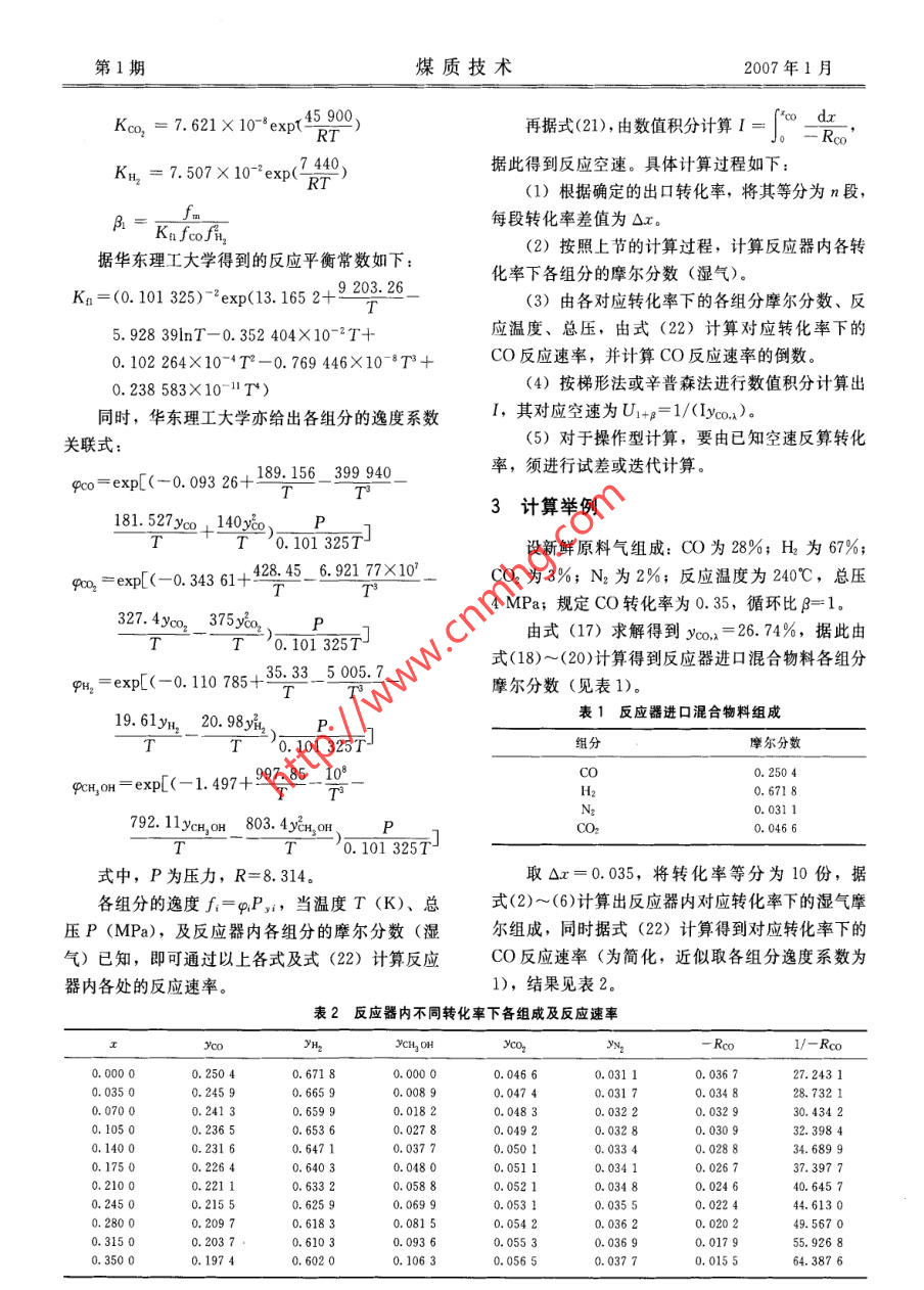 第1期煤質(zhì)技術(shù)2007年1月煤化工循環(huán)比對(duì)甲醇合成過程影響的計(jì)算分析紀(jì)任山,郭治,何海軍(煤炭科學(xué)研究總院北京煤化工分院,北京100013)摘要:通過計(jì)算分析,探討了循環(huán)比對(duì)甲醇合成過程的影響,以方便甲醇合成過程的設(shè)計(jì)與生產(chǎn)。關(guān)鍵詞:甲醇合成;循環(huán)比;計(jì)算分析中圖分類號(hào): TQ223. 1文獻(xiàn)標(biāo)識(shí)碼: B文章編號(hào): 1007-7677 (2007) 01-0064-04Computational analysis of effect of recycle ratio upon methanol systhesisJI Ren-shan, GUO Zhi, HE Hai-jun( Beijing Research Institute of Coal Chemistry, China Coal Research Institute, Beijing 100013, China)Abstract: In order to make the design and produce of the process of methanol systhesis for convenience, the effect of recycle ratioupon the process of methanol systhesis are discussed by computation in this paper.Key words: methanol systhesis; recycle ratio; computational analysis循環(huán)氣與新鮮原料氣的比值(循環(huán)比)會(huì)直接CO+2H2 =CH3OH(1)影響甲醇的產(chǎn)量、濃度、消耗與質(zhì)量。定性地分該反應(yīng)膨脹因子8co=-2,由計(jì)量關(guān)系得到析,根據(jù)甲醇合成反應(yīng)化學(xué)方程式,原料氣的氫碳反應(yīng)中各組分的摩爾分?jǐn)?shù)如下。比值應(yīng)該控制在2.05。但是,由于受合成原料氣1- .IcoYoo = Yco.(2)中CO的單程轉(zhuǎn)化率較低(一般為15%~20%)1- 2ycoxCo的影響,在單獨(dú)甲醇生產(chǎn)過程中,為了提高合成氣1一2Yco.xA Lco中CO的總轉(zhuǎn)化率,經(jīng)常采取反應(yīng)后低轉(zhuǎn)化率尾氣(3)打循環(huán)的方式來獲得較高的CO轉(zhuǎn)化率。由于合成反應(yīng)器在正常運(yùn)行時(shí)對(duì)氣體流速有一定的要求,因Y=1-22yco.,xTcoYD,a(4)此,循環(huán)尾氣量的增加必然導(dǎo)致新鮮原料氣量的減少,即人合成塔氣體中有效反應(yīng)物濃度的降低。從(5)化學(xué)反應(yīng)動(dòng)力學(xué)角度來看,反應(yīng)物濃度降低,化學(xué).過程推動(dòng)力減小,則反應(yīng)速率減慢,從而降低合成NcHgOH = JYco.1一2yco.x Ico(6)反應(yīng)器的生產(chǎn)能力??梢?,片面追求CO轉(zhuǎn)化率的生產(chǎn)方式將會(huì)降低合成裝置的利用效率[2]。同理,對(duì)于反應(yīng)產(chǎn)物將甲醇冷凝以后的干氣,針對(duì)上述矛盾,該文就調(diào)節(jié)循環(huán)比對(duì)甲醇合成其摩爾分?jǐn)?shù)如下:過程的影響通過計(jì)算分析進(jìn)行了探討。近似認(rèn)為甲1一xco醇合成主要是CO與H2的反應(yīng),忽略CO2對(duì)合成Yco.,ll = Vco.x1一3yco.xco(2')過程的影響;忽略反應(yīng)熱效應(yīng)對(duì)過程的影響,認(rèn)為1- 2 2C∞.x :Tic反應(yīng)為等溫過程;反應(yīng)器符合平推流模型;氣體質(zhì)(3')量流速較大,忽略內(nèi)外擴(kuò)散的影響,可借鑒C302催化劑的本征動(dòng)力學(xué)模型進(jìn)行分析計(jì)算。Yboe = - 3x0.x.YyD.2x(4')1化學(xué)計(jì)量 與物料衡算YCo.A(5')Jo.,.= - 3xvo.u.Co1.1 化學(xué)計(jì)量甲醇合成反應(yīng)的獨(dú)立計(jì)量方程如下:其中,y為反應(yīng)器人口處各組分的摩爾分?jǐn)?shù);64第1期煤質(zhì)技術(shù)2007年1月y為惰性組分的摩爾分?jǐn)?shù); y.or為反應(yīng)產(chǎn)物將甲當(dāng)轉(zhuǎn)化率、循環(huán)比確定后,可由式(17) 計(jì)算醇冷凝以后干氣的摩爾分?jǐn)?shù); xoo是以反應(yīng)器入口反應(yīng)器入口Co的摩爾分?jǐn)?shù),并據(jù)求解出的Vo,x,,CO摩爾數(shù)為基準(zhǔn)的轉(zhuǎn)化率,其定義如下:由式(3')~(5')及式(10), 可計(jì)算出反應(yīng)器入口處其它各組分的摩爾分?jǐn)?shù)。Nayc.n- Ntyo.d. Yco.n- N. Yo(7)βyco.xXcoNm (yco.in + Byo.oan)Yco.in + Pyco,ofe,二三3xox.cc(18)式中,β為循環(huán)比;N。為新鮮原料摩爾流率;1+β- iI - 3.co.x.Co. B_Nut為反應(yīng)后干氣摩爾流率; o.為反應(yīng)后干氣CO摩爾分?jǐn)?shù)。YD.a二YD.m(19)g以新鮮原料為基準(zhǔn)的轉(zhuǎn)化率為:1+β--3. 3yo.x Ico工= xo(1 +ρCc.o)(8)Yco2 .inYco,inYco,x = -(20)1.2物料衡算1+β-1一3co.x.co循環(huán)反應(yīng)的物流關(guān)系如圖1所示。1.3 計(jì)算過程BNm,yio對(duì)于設(shè)計(jì)型計(jì)算:Nm_↓N反應(yīng)器NostNot(1)規(guī)定反應(yīng)器出口CO轉(zhuǎn)化率(以反應(yīng)器進(jìn)Viayt,out口混合物料為基準(zhǔn),相當(dāng)于單程轉(zhuǎn)化率),并規(guī)定Na出口于氣中惰性組分摩爾分?jǐn)?shù)。圖1循環(huán)反應(yīng)物流關(guān)系(2)按新鮮原料中CO、惰性組分摩爾分?jǐn)?shù), .據(jù)圖1物流關(guān)系,有以下物料衡算結(jié)果:由式(16) 和式(17)迭代求解R、VCco.x.N,= (1 + β)N。(9)(3)由式(18)~(20)分別求出反應(yīng)器進(jìn)口處混y.. = 2'im + yio(10)合物料各組分摩爾分?jǐn)?shù)。1+β(4) 由式(2)~(6)及式(2' )~(5')計(jì)算出口濕Nout = N.(1 + β)(1 - 2yo,xco) (11)氣、干氣各組分的摩爾分?jǐn)?shù)。Noπ+βNin = N。(1 + p)(1一3yo,xco)(12)(5)由式(11)~(13)計(jì)算反應(yīng)器出口各氣體摩Na = (1 +β)Nxco.xICco .(13)爾流率。另外,據(jù)惰性組分的衡算有:NmYD,ia = NofrYD.ou(14)2反應(yīng)器空速的確定由式(12)可得:根據(jù)平推流反應(yīng)器設(shè)計(jì)方程:v.= 1-3(1+ β)vo,xT∞o(15)W1∞_ dxNn(1+β)co.x Ur+pYco.x」。-Roo(21)由式(14)和式(15)可知:YD.in其中,W為床層催化劑質(zhì)量,g; U1+p為 以反β= :3Jvco.x2coyD.of - 1(16)應(yīng)器進(jìn)口混合物料為基準(zhǔn)的空速,mol/g.h;- Roo為CO的反應(yīng)速率,mol/g. h。即反應(yīng)器人口CO摩爾分?jǐn)?shù)、CO轉(zhuǎn)