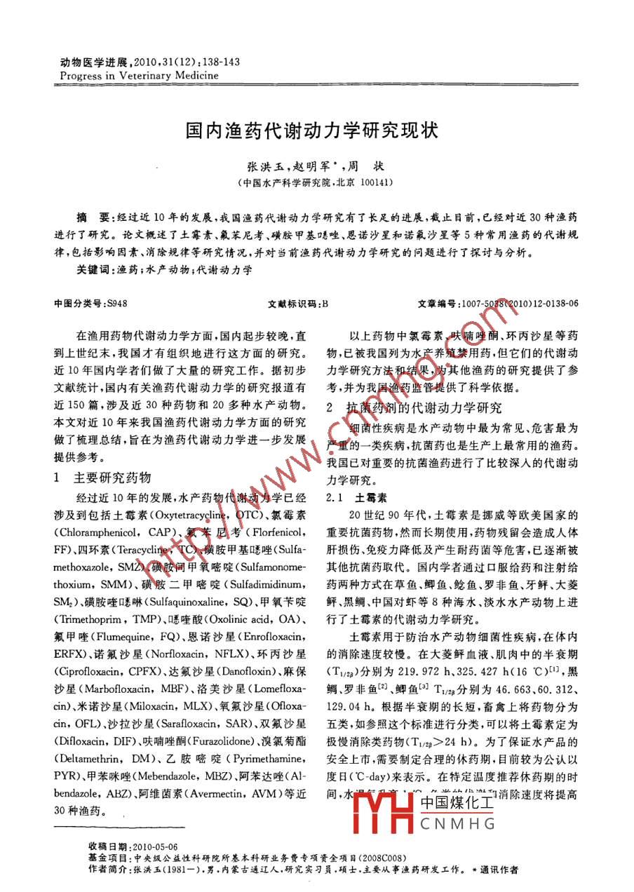 動物醫(yī)學(xué)進(jìn)展,2010,31(12):138-143Progress in Veterinary Medicine國內(nèi)漁藥代謝動力學(xué)研究現(xiàn)狀張洪玉,趙明軍’,周狀(中國水產(chǎn)科學(xué)研究院,北京100141)摘要:經(jīng)過近10年的發(fā)展,我國漁藥代謝動力學(xué)研究有了長足的進(jìn)展,截止目前,已經(jīng)對近30種漁藥進(jìn)行了研究。論文概述了土霉素、氟苯尼考、磺胺甲基晤唑、恩諾沙星和諾氟沙星等5種常用漁藥的代謝規(guī)律,包括影響因素、消除規(guī)律等研究情況,并對當(dāng)前漁藥代謝動力學(xué)研究的問題進(jìn)行了探討與分析。關(guān)鍵詞:漁藥;水產(chǎn)動物;代謝動力學(xué)中圖分類號:S948文獻(xiàn)標(biāo)識碼:B文章編號:1007-5038(2010)12-0138-06在漁用藥物代謝動力學(xué)方面,國內(nèi)起步較晚,直以上藥物中氯霉素、呋喃唑酮、環(huán)丙沙星等藥到上世紀(jì)末,我國才有組織地進(jìn)行這方面的研究。物已被我國列為水產(chǎn)養(yǎng)殖禁用藥,但它們的代謝動近10年國內(nèi)學(xué)者們做了大量的研究工作。據(jù)初步力學(xué)研究方法和結(jié)果,為其他漁藥的研究提供了參文獻(xiàn)統(tǒng)計,國內(nèi)有關(guān)漁藥代謝動力學(xué)的研究報道有考,并為我國漁藥監(jiān)管提供了科學(xué)依據(jù)近150篇,涉及近30種藥物和20多種水產(chǎn)動物。2抗菌藥劑的代謝動力學(xué)研究本文對近10年來我國漁藥代謝動力學(xué)方面的研究細(xì)菌性疾病是水產(chǎn)動物中最為常見、危害最為做了梳理總結(jié),旨在為漁藥代謝動力學(xué)進(jìn)一步發(fā)展嚴(yán)重的一類疾病抗菌藥也是生產(chǎn)上最常用的漁藥提供參考。我國已對重要的抗菌漁藥進(jìn)行了比較深人的代謝動1主要研究藥物力學(xué)研究。經(jīng)過近10年的發(fā)展,水產(chǎn)藥物代謝動力學(xué)已經(jīng)2.1土霉素涉及到包括土霉素( Oxytetracycline,OTC)、氯霉素20世紀(jì)90年代,土霉素是挪威等歐美國家的( Chloramphenicol,CAP)、氟苯尼考( Florfenicol,重要抗菌藥物,然而長期使用,藥物殘留會造成人體FF)、四環(huán)素( Tetracycline,TC)、磺胺甲基吒唑(Sula-肝損傷、免疫力降低及產(chǎn)生耐藥菌等危害,已逐漸被methoxazole,SMZ)、磺胺間甲氧嘧啶( Sulfamonome-其他抗菌藥取代。國內(nèi)學(xué)者通過口服給藥和注射給thoxiun,SMM)、磺胺二甲嘧啶( Sulfadimidinum,藥兩種方式在草魚、鯽魚、鯰魚、羅非魚、牙鲆、大菱SM)、磺胺喹啉( Sulfaquinoxaline,SQ)、甲氧芐啶鲆、黑鯛、中國對蝦等8種海水、淡水水產(chǎn)動物上進(jìn)( Trimethoprim,TMP)、瞟喹酸( Oxolinic acid,OA)、行了土霉素的代謝動力學(xué)研究。氟甲喹( Flumequine,FQ)、恩諾沙星( Enrofloxacin土霉素用于防治水產(chǎn)動物細(xì)菌性疾病,在體內(nèi)ERFX)、諾氟沙星( Norfloxacin,NFLX)、環(huán)丙沙星的消除速度較慢。在大菱鲆血液、肌肉中的半衰期( Ciprofloxacin,CPFX)、達(dá)氟沙星( Danofloxin)麻保(T1/a2)分別為219.972h、325.427h(16℃),黑沙星( Marbofloxacin,MBF)洛美沙星( Lomefloxa-鯛、羅非魚口、鯽魚Tma分別為46.663、60.312、cin)、米諾沙星( Miloxacin,MLX)、氧氟沙星(Ooxa-129.04h。根據(jù)半衰期的長短,畜禽上將藥物分為cin,OFL)、沙拉沙星( Sarafloxacin,SAR)、雙氟沙星五類,如參照這個標(biāo)準(zhǔn)進(jìn)行分類,可以將土霉素定為( Difloxacin,DIF)、呋喃唑酮( Furazolidone)、溴氯菊酯極慢消除類藥物(T/>24h)。為了保證水產(chǎn)品的Deltamethrin,DM)、乙胺嘧啶( Pyrimethamine,安全上市,需要制定合理的休藥期,目前較為公認(rèn)以PYR)、甲苯咪唑( Mebendazole,MBZ)、阿苯達(dá)唑(Al-度日(Cday)來表示。在特定溫度推薦休藥期的時bendazol,ABZ)、阿維菌素( Avermectin,AVM)等近間,水30種漁藥。HH中國煤化工消除速度將提高CNMHG收稿日期:2010-05-06基金項目:中央級公益性科研院所基本科研業(yè)務(wù)費(fèi)專項資全項目(2008C008)作者簡介:張洪玉(1981-)男,內(nèi)蒙古通遼人,研究實習(xí)員,碩士,主要從事漁藥研發(fā)工作?!巴ㄓ嵶髡邚埡橛竦?國內(nèi)漁藥代謝動力學(xué)研究現(xiàn)狀13910%。筆者認(rèn)為根據(jù)這個比例換算并估算出其他溫點叉尾血漿中吸收、分布和消除明顯加快。周群度下的休藥期,也是有一定的參考價值的。鑒于對蘭等(也證明氟苯尼考在羅氏沼蝦體內(nèi)高溫的代謝人體傷害以及產(chǎn)生耐藥性等問題,土霉素終將會淡速度比低溫的快。另外,鹽度對氟苯尼考代謝的影出漁藥市場。響也非常顯著, Feng j B等(分別在淡水和海水2.2氟苯尼考(16.5‰)條件下給羅非魚口服給藥,結(jié)果表明淡水作為氯霉素的替代藥物,具有廣譜高效的抗菌組氟苯尼考的分布水平高于海水組,但消除速率比效果,國外已在虹鱒、大西洋鮭等水產(chǎn)動物上進(jìn)行了海水組慢。系統(tǒng)深入的研究。1999年我國批準(zhǔn)氟苯尼考為國給藥方式對氟苯尼考的代謝動力學(xué)影響較大家二類新獸藥,在水產(chǎn)養(yǎng)殖上可用于治療鰻鱺愛德李靜云等以靜脈注射、肌肉注射和口服三種給藥華氏病和赤鰭病(NY5071-2002)。隨后,我國學(xué)方式研究氟苯尼考在中國明對蝦體內(nèi)的藥代動力學(xué)者在羅非魚、鯽魚、斑點叉尾鲴、中華鱉、歐洲鰻鱺、(表1),靜脈注射、肌肉注射兩種注射給藥方式的代中國對蝦、南美白對蝦、九孔鮑等8種水產(chǎn)動物上進(jìn)謝動力學(xué)特征比較相似,與藥餌給藥方式的差別較行了代謝動力
