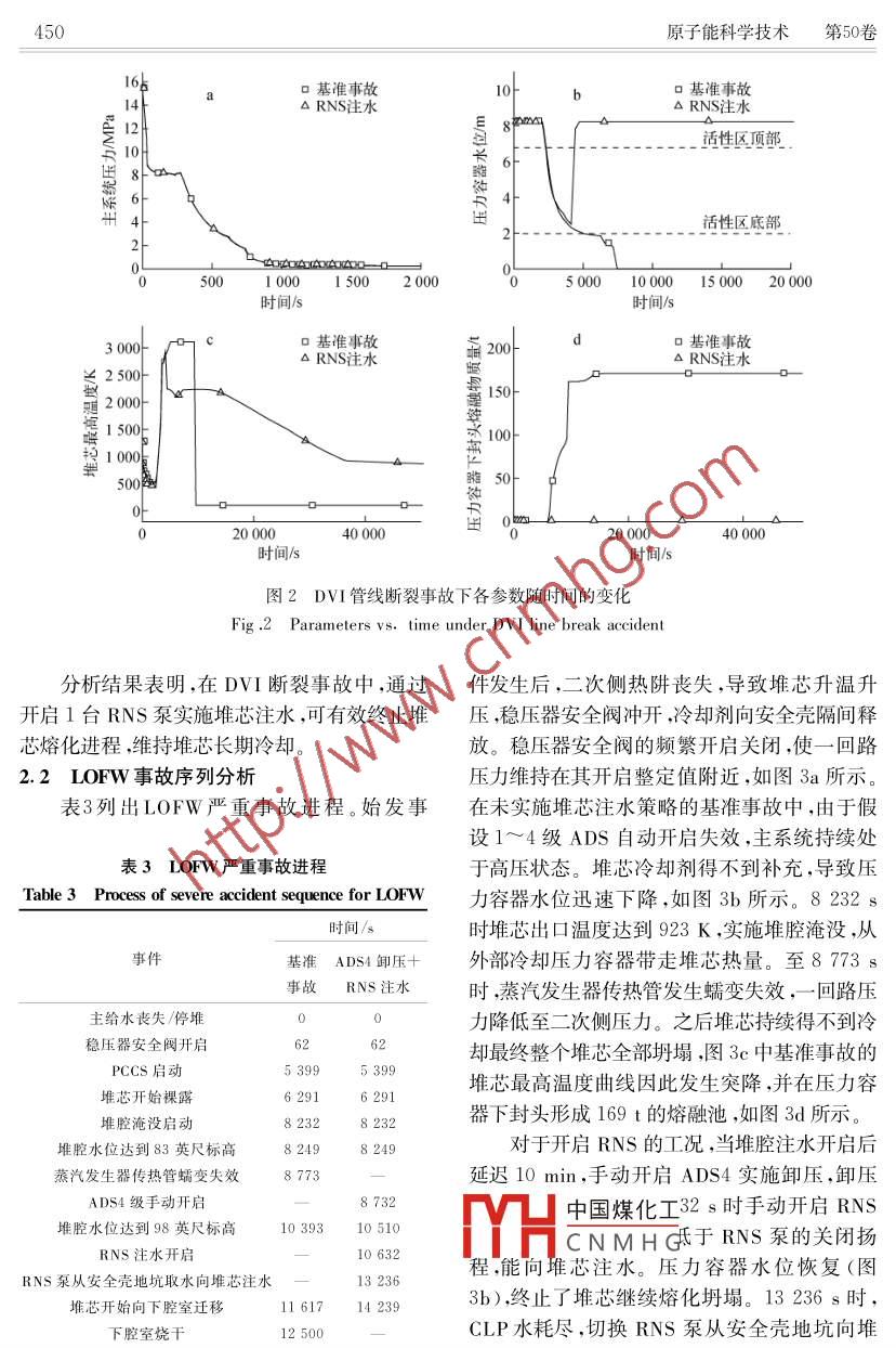 第50卷第3期原子能科學(xué)技術(shù)Vol 50. No. 3016年3月A tomic Energy Science and technologyMar.2016嚴(yán)重事故下正常余熱排出系統(tǒng)向堆芯注水策略分析李亞冰,郭丁情2,曹學(xué)武l(1,上海交通大學(xué)機(jī)械與動(dòng)力工程學(xué)院,上海200240;2.深圳中廣核工程設(shè)計(jì)有限公司,廣東深圳518031)摘要:選取導(dǎo)致堆芯熔化頻率最高的始發(fā)嚴(yán)重事故——直接注入(DVⅠ管線斷裂事故,以及典型高壓熔堆事故—喪失主給水始發(fā)事故(LOFW),利用MAAP4程序,分析反應(yīng)堆堆芯熱工水力行為,并對正常余熱排出系統(tǒng)(RNS)堆芯注水策略的有效性與負(fù)面效應(yīng)進(jìn)行評估。分析結(jié)果表明,在DVI管線斷裂事故和LOFW嚴(yán)重事故序列中,利用RNS進(jìn)行堆芯注水可有效終止堆芯熔化進(jìn)程,維持堆芯長期冷卻。但堆芯再淹沒會(huì)產(chǎn)生更多的氫氣,存在增加安全殼氫氣燃燒風(fēng)險(xiǎn)的可能性。此外通過分析利用嚴(yán)重事故管理導(dǎo)則中輔助計(jì)算文件給出的堆芯最小流量實(shí)施堆芯注水策略,討論注水流量對堆芯冷卻的影響,結(jié)果表明,在實(shí)施堆芯注水策略時(shí),建議在系統(tǒng)允許的情況下采用更高的流速進(jìn)行堆芯冷卻。關(guān)鍵詞:嚴(yán)重事故管理;正常余熱排出系統(tǒng);堆芯注水中圖分類號:TL364.4文獻(xiàn)標(biāo)志碼:A文章編號:1000-6931(2016)03-0446-08doi:10.7538/yzk2016.50.03.0446Analysis of ras Injection Strategyby rns during Severe AccidentLI Ya-bing, GUO Ding-qing, CAO Xue-wu1. School of Mechanical Engineering, Shanghai Jiao Tong University, Shanghai 200240, ChinaShenzhen China Nuclear Power Design Co. Lid. Shenzhen 518031, China)Abstract: In order to evaluate the effectiveness of normal residual heat removal system(RNS for RCS injection strategy during severe accidents, two ty pical severe accidentsequences were selected and analyzed with MaaP4 code, including direct vessel injection (dvi) line break induced severe accident which contributes most to the core damagefrequency, and loss of feed water (LOFW induced severe accident w hich is a ty picalhigh-pressure core melt accident. Both mitigation effect and negative impact of the RNSnjection strategy were evaluated. The results show that RNS injection can effectivelyterminate core melt progression and keep loin two ty pical seevereaccident sequences. However, more hy rogerCNMHG core reflooding中國煤化工收稿日期:2015-02-05;修回日期:2015-05-06基金項(xiàng)目:國家自然科學(xué)基金資助項(xiàng)目(11205099)作者簡介;李亞冰(1990—),女,河南平頂山人,博士研究生,核能科學(xué)與工程專業(yè)通信作者:曹學(xué)武,E-mail: caoxuew if@ sjtu,edu,en第3期李亞冰等:嚴(yán)重事故下正常余熱排出系統(tǒng)向堆芯注水策略分析stage which may lead to hydrogen hazard in the containment. Furthermore, thenfluence of injection flow rate was discussed with the minimum injection flow rate forlong term decay heat removal given by the computational aid documents from the severeaccident management guideline. The analysis results indicate that higher flow rate shouldbe preferred for RCs injection strategy during severe accidents if the injection systemwould be availableKey words: severe accident mitigation normal residual removal system; RCS injection壓水堆核電廠嚴(yán)重事故管理是指采取一系1分析模型列緩解措施盡可能維持三道安全屏障(堆芯、壓1.1核電廠模型力容器、安全殼)的完整性,減少廠外放射性釋利用MAAP4程序建立先進(jìn)非能動(dòng)壓水放2。為提高嚴(yán)重事故管理能力,嚴(yán)重事故情堆核電廠模型,包括反應(yīng)堆冷卻劑系統(tǒng)況下可采取的緩解策略有一回路卸壓、堆內(nèi)熔(RCS)、專設(shè)安全設(shè)施以及安全殼系統(tǒng),反應(yīng)融物保持、堆芯注水、氫氣控制、安全殼過堆冷卻劑系統(tǒng)模型由12個(gè)節(jié)點(diǎn)組成,每個(gè)節(jié)濾排放等。先進(jìn)非能動(dòng)壓水堆核電廠嚴(yán)重事點(diǎn)即為1個(gè)控制體,模擬實(shí)際主系統(tǒng)狀態(tài)。反故下,一回路冷卻劑喪失,堆芯冷卻不足會(huì)導(dǎo)致應(yīng)堆堆芯等效簡化為1個(gè)圓柱,軸向劃分為堆芯熔毀坍塌,高溫的堆芯熔融物聚集在壓力17個(gè)節(jié)點(diǎn),徑向劃分為η個(gè)同心圓環(huán),模擬堆容器下腔室,可能威脅到壓力容器和安全殼的芯在嚴(yán)重事故工況下的熱工水力行為。安全完整性。因此,嚴(yán)重事故下維持堆芯冷卻,防止殼劃分為12個(gè)隔間節(jié)點(diǎn),其中安全殼內(nèi)部劃堆芯繼續(xù)損壞是目前嚴(yán)重事故管理緩解措施研分為9個(gè)相互連接的隔間節(jié)點(diǎn),而其余3個(gè)隔究的重點(diǎn)間節(jié)點(diǎn)相互連接組成了非能動(dòng)安全殼冷卻系在不同的堆芯損壞狀態(tài)下,堆芯注水對嚴(yán)統(tǒng)。圖1為分析模型示意圖。圖1中:ACC重事故進(jìn)程會(huì)產(chǎn)生不同的、甚至有一些負(fù)面的為蓄壓箱;ADS為自動(dòng)卸壓系統(tǒng);CMT為堆影響。為提高現(xiàn)有運(yùn)行和未來核電廠嚴(yán)重事芯補(bǔ)水箱; IRWST為內(nèi)置換料水箱;PCCS為故的安全性,再淹沒階段堆芯和碎片的可冷卻非能動(dòng)安全殼冷卻系統(tǒng);PRHR為非能動(dòng)余性是需進(jìn)一步研究的高優(yōu)先級問題。國家核安全局要求現(xiàn)有運(yùn)行以及在建核電廠提高對嚴(yán)重事故的緩解能力,特別是嚴(yán)重事故下的堆芯PCCS應(yīng)急補(bǔ)水能力。針對非能動(dòng)先進(jìn)壓