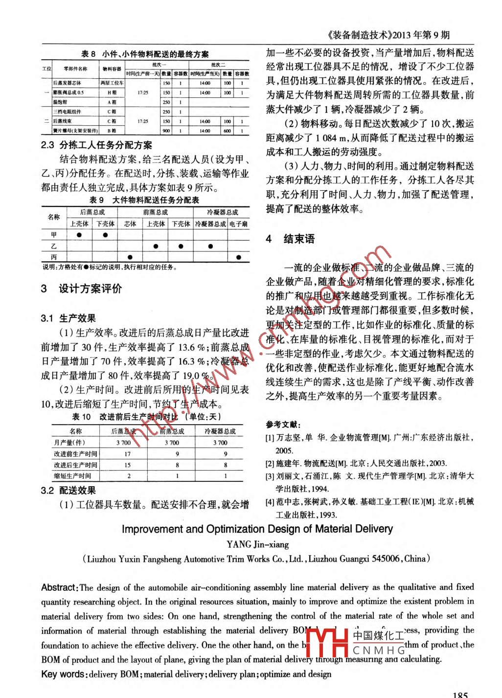 《裝備制造技術)2013年第9期物料配送改善及優(yōu)化設計陽金香(柳州裕信方盛汽車飾件有限公司,廣西柳州545006)摘要:本設計以汽車空調(diào)總裝流水線物料配送為定量、定性的研究對象。在原有資源的情況下,主要從兩方面改善和優(yōu)化物料配送中存在的問題:一方面,通過制定基于工藝流程的物料配送BOM,加強零部件成套率和物料信息的控制,為實現(xiàn)有效配送提供基礎;另一方面,根據(jù)物料分類、生產(chǎn)節(jié)拍、產(chǎn)品的BOM和車間的平面布置困,經(jīng)過計算與測量,得出物料配送方案。關鍵詞:配送BOM;物料配送;配送方案;優(yōu)化設計中圖分類號:F273文獻標識碼:B文章編號:1672- -545X(2013)09-0183-03某汽車空調(diào)有限公司是集開發(fā)生產(chǎn)、銷售為- -體清單為依據(jù)。的汽車空調(diào)系統(tǒng)專業(yè)制造商,微型汽車持續(xù)增長的態(tài)配送形式,企業(yè)在具體制定配送方案時,- -般按勢,使公司的業(yè)務也有了極大的發(fā)展。該公司總裝流水配送的時間、數(shù)量劃分,有:定時配送、定量配送、定線通過線平衡改進后,理論產(chǎn)量有了極大的提高,但是時定量配送、定時定線配送、及時配送。本物料配送實際并沒有達到應有的效果。其關鍵是高效的生產(chǎn)工屬于廠內(nèi)車間配送,計劃較好制定,所以選擇定時定藝和低效繁雜的物料配送之間的矛盾,制約了產(chǎn)量的量配送 的形式,便于配送執(zhí)行和管理。提高,問題主要有:物料配送時,配送的時間、批次、數(shù)工序同期化,配送時,不同的物料可用不同的標量等沒有具體的要求,分揀工人執(zhí)行任務時憑經(jīng)驗做準容器,并且不同的容器盛裝特征性的物料,使配送事,分工不明、職責不清,影響配送效率;物流信息不周期可能不同,但可以根據(jù)工序同期化原則,全部設暢,線邊物料不成套,容易產(chǎn)生缺料。因此,對物料的配為等于節(jié)拍或其倍數(shù),這樣可以減少配送次數(shù),提高送進行改善和優(yōu)化設計勢在必行。本文介紹了此方法。配送 的規(guī)模性。1設計概述2方案設計1.1設計目的本設計的目的是通過對現(xiàn)行總裝流水線物料配方案設計總的思路為:根據(jù)生產(chǎn)節(jié)拍,制定合理的配送節(jié)拍,由指定人員通過適當?shù)穆窂?利用合適送進行改善和優(yōu)化,做到:(1) 提供暢通無阻的物料的搬運器具,將經(jīng)過合理盛裝的合格物料,在所需求流轉,以保證生產(chǎn)順利高效率地進行;(2)減少物料的時間內(nèi)配送到準確的工位上,以滿足總裝流水線搬運的數(shù)量、頻率和距離,臧少搬運費用,降低搬運對物料需求的特征。成本;(3)防止搬運過程中的物料損失。2.1計算流水線生產(chǎn)節(jié)拍1.2優(yōu)化設計對象裝配線的生產(chǎn)節(jié)拍可通過測量瓶頸工位單位產(chǎn)根據(jù)生產(chǎn)流水線的特征,生產(chǎn)流水線是指勞動對量時間計算出,對瓶頸工位進行單位產(chǎn)量測時(每生象按照- -定的工藝路線,順序地通過各個工作中心,產(chǎn)- 臺所用的時間),數(shù)據(jù)如表 1所示。并按照一定的生產(chǎn)速度(節(jié)拍)完成作業(yè)的連續(xù)重復表1瓶頸工位(工位四 )單件產(chǎn)品裝配時間(單位:秒)的一種生產(chǎn)組織形式。生產(chǎn)流水線具有以下幾個基本一 測量日期測試1測試2測試3]測試4測試S特征:單純單向性連續(xù)高效性、專業(yè)性.平衡性。3月1日上午工102.699.196.7 97.43月1日下午工103.295.9 101.6 98.6 103.5物料清單(BOM)、制造物料清單(MBOM), BOM3月4日下午工104.395.5 100.8 _98.5 101.9是Bill of Material的縮寫,通常稱為“物料清單”。制造3月2日下午98.491.2工 101.4104.4102.2物料清單MBOM( Manufacturing BOM)用于執(zhí)行階段,注:隨機抽取兩天,共測時20次,其中上午9:00-10:00點,下午14:00= 15:00測時5次。接到訂單后,利用產(chǎn)品構造系統(tǒng)來決定產(chǎn)品規(guī)格,做為102秒中國煤化工總戚實際的裝配節(jié)拍出制造物料表。后續(xù)的領料單作業(yè)即以該制造物料在下面章節(jié)中:IYHCNMH G收量時,將以此為基礎。收稿日期:2013-06-08作者簡介:陽金香( 1984- ),女 ,湖南新寧人,助理工程師,本科,研究方向為:精益生產(chǎn)方式應用。183Equipment Manufacturing Technology No.9 ,20132.2制定合理的物料配送方案(4)根據(jù)生產(chǎn)節(jié)拍和工序同期化,制定物料配送由物料分類和生產(chǎn)節(jié)拍的結果分析可得:A類物的初步方案料適合多頻次少批量配送;B類物料適合中頻次、中批以單元容器的容量為切入點,制定初步配送方量配送;C類物料適合低頻次大批量配送,步驟如下:案一主要 是確定物料配送節(jié)拍和配送數(shù)量,步驟(1)總成物料分類如下:根據(jù)容器尺寸、物料尺寸、包裝單元物料數(shù)量,按物理特征進行分類的步驟為:(1)根據(jù)物料的確定單元容器的容量→根據(jù)單元容器的容量和生產(chǎn)外形尺寸、重量、形狀損壞可能性、狀態(tài)、數(shù)量、時限節(jié)拍,計算單元容器零部件可用時間-→結合單元容等七種主要因素,描述物料的特征;(2)把體積、重器零部件可用時間,確定合適的單元配送量(即每批量、包裝單元物料數(shù)量等作為決定性影響的特征,用配送的量),單元配送量一般等于單元容器容量或其字母A......等劃分出相似物料;(3)填寫物料整數(shù)倍- +確定單元配送節(jié)拍。大件物料考慮單獨配分類結