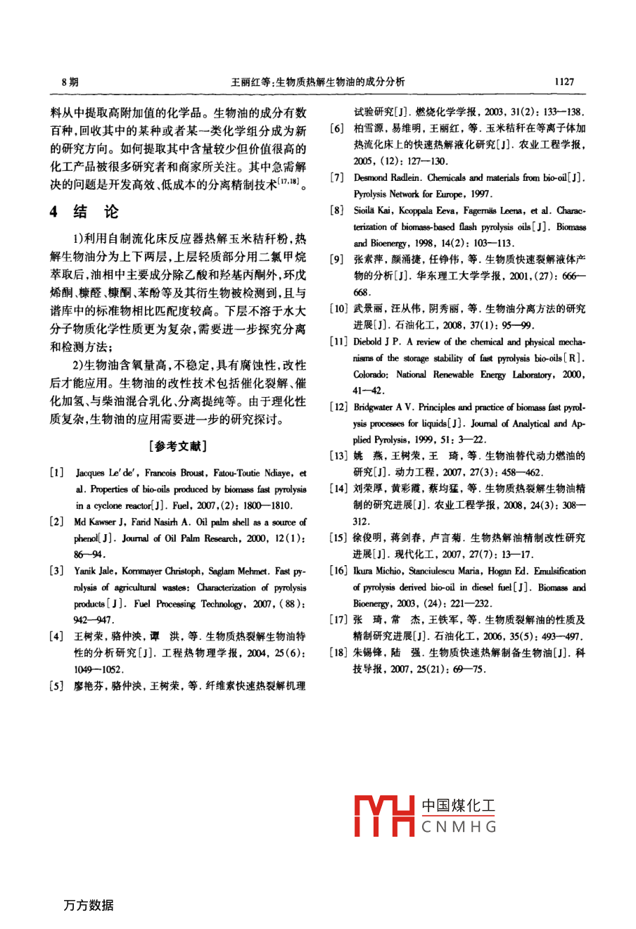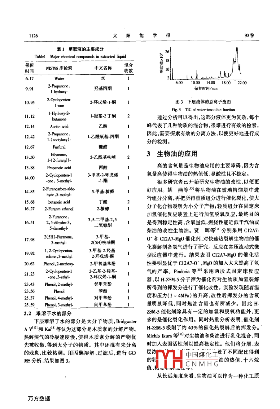 第30卷第8期太陽能學(xué)報Vol 30. No 82009年8月ICTA ENERGIAE SOLARIS SINICAAg.,2009文章編號:0254009%6(2009)03112405生物質(zhì)熱解生物油的成分分析王麗紅2,賈官臣3,柏雪源2,易維明2,殷哲2(1.沈陽農(nóng)業(yè)大學(xué)工程學(xué)院,沈陽10161;2.山東理工大學(xué)山東省清潔能源工程技術(shù)研究中心,淄博255049;3.淄博熱電股份有限公司,淄博2500)摘要:在流化床上快速熱解玉米秸稈粉得到成分復(fù)雜的生物油。生物油上層是溶于水的輕質(zhì)液體,下層是難溶于水的大分子物質(zhì)。用二氯甲烷萃取上層液體中的有機相,氣質(zhì)分析(GCMS)結(jié)果表明其主要成分除乙酸、羥基丙酮外,還有環(huán)戊烯酮糠醛糠酮苯酚等及其衍生物,與譜庫中的標準物對比有較高的匹配度。下層大分子部分化學(xué)性質(zhì)更為復(fù)雜需要進一步探究分離和檢測方法。由于理化性質(zhì)復(fù)雜,生物油的應(yīng)用需要進一步的研究探討。關(guān)鍵詞:熱解;生物油;萃取;氣相色譜/質(zhì)譜分析中圖分類號;TK6文獻標識碼:A0前言床反應(yīng)器,流化床系統(tǒng)如圖1熱解能力為5kg/h。采用兩級喂料裝置,確保生物質(zhì)粉連續(xù)均勻地進入反生物質(zhì)熱解液化制取生物油是生物質(zhì)利用方式應(yīng)管且不發(fā)生堵塞。熱載體選用高鋁釩土避免發(fā)中很有前景的一項技術(shù),其核心是快速加熱快速冷生團聚現(xiàn)象提高了與生物質(zhì)粉的傳熱效率。當反卻通過快速冷卻可冷凝的氣體以期得到最大化的應(yīng)溫度500℃時,玉米秸稈的生物油收集率最高為液體產(chǎn)物。熱解液化的主要產(chǎn)物是生物油生物油37.5%。是黑色酸性液體,有刺激性氣味,其構(gòu)成非常復(fù)雜,排管4廢氣除水以外,還有酸、醇、醛、酮、苯酚、呋喃等多種有含兩緩旋風(fēng)分離器」凝器氧官能團的有機物。生物油熱值一般為16~19M口kg,pH值介于3~5之間。因反應(yīng)原料、反應(yīng)器類溫度采集型、熱解參數(shù)的不同,生物油的成分也有所不同,主監(jiān)測系統(tǒng)要表現(xiàn)在主要成分及其含量上-6。目前常用的分料斗儲油箱離生物油的方法有用溶劑萃取9和通過柱層析或離心分離等技術(shù)分離,但是這些方法都有待進一步兩級螺旋喂料器完善本研究利用流化床快速熱解玉米秸稈粉,對熱熱載氣解生物油的兩部分進行氣質(zhì)分析,并對生物油的應(yīng)用做了簡單介紹。圖1流化床系統(tǒng)簡圖g 1 Simplified schematic of fluidized bed pyrolysis system1材料與裝置2生物油分析實驗原料為玉米秸稈粉,20月以下,粒徑在21輕質(zhì)液體lmm以內(nèi)。每次實驗前將原料放入烘箱內(nèi),在105℃熱解得到的生物油有分層現(xiàn)象,上層為溶于水條件下烘24h后使用。生物質(zhì)熱解反應(yīng)器采用流化的部不資干水的子重質(zhì)部分(占總產(chǎn)中國煤化工收稿日期:200802-19基金項目:國家高技術(shù)研究發(fā)展(863)計劃(2007AA065Z451);國家自然科學(xué)基CN MHGOSGGI10mm2);山東理工大學(xué)科技基金(4040305018)通訊作者:易維明(1963-)男博士、博士生導(dǎo)師教授,主要從事生物質(zhì)能利用方面的研究。 weiming@ sc址,dhm8期王麗紅等:生物質(zhì)熱解生物油的成分分析1125量的0%)。每次實驗后過濾上層溶液,除去其中少燒瓶放置在旋轉(zhuǎn)蒸餾裝置中,開始離心蒸餾。調(diào)節(jié)量殘?zhí)?因為殘?zhí)恐泻械挠袡C酸和其他一些成分水浴溫度到50℃,至二氯甲烷不再餾出后停止。是很多反應(yīng)的催化劑,生物油中含殘?zhí)吭缴?穩(wěn)定性由于大部分有機成分存在于油相中,所以我們越好)。主要針對油相進行氣質(zhì)聯(lián)用分析,分析儀器為Agi取一定量經(jīng)過過濾的上層生物油,按照以下步len6890/5793N。分析條件如下:驟進行操作:①將0.lmo/L的H2SO4加到生物油中,CC條件:1909lⅣV-136 NNOWAX型毛細管柱直到溶液pH值變?yōu)?;②加入二氯甲烷油相物質(zhì)60mx0.25mmx0.25ym,柱溫采用程序升溫:初始溫溶解到其中;③萃取分離;④重復(fù)②③步驟至少3次度60℃,以升溫速率為10℃/min加熱到120℃,然后(加二氯甲烷到水相溶液中,再萃取分離);⑤向分離以s℃/min的升溫速率加熱到200℃保溫4min,載氣后的水相中加入1moL的NaoH使得pH值為12;為氦氣進樣口溫度為280℃,分流比80:1⑥加入二氯甲烷萃取分離油相和水相;⑦重復(fù)步驟Ms條件:EI源,電子能量70eV,掃描范圍12⑥至少3次;⑧混合所有油相物質(zhì);⑨105℃,30min50am,離子源溫度150℃,接口溫度240℃。干燥50mL的蒸餾燒瓶;⑩取出燒瓶放入干燥器中冷分析結(jié)果如圖2所示??傠x子流圖主要峰分離卻至室溫;①將25mL樣品注入到燒瓶中;@將蒸餾效果較好對其檢索,結(jié)果在表1中給出1242l1,1216.2713.8823.5620626.1720040060080010001200140016001800200022002400保留時間/min圖2萃取液的總離子流圖Fig2 TIC(Total ion chromatograms)of extracted liquid由表1可以看出,萃取出的油相中,主要成分中酸+醇→酯+水除羥基丙酮和乙酸外,環(huán)戊烯酮、糠醛、糠酮、苯酚等醛+水→氫氧化物及其衍生物等的含量也較高,與譜庫中標準物的匹醛+醇→半縮醛+酯+水配度較高,因此用二氯甲烷萃取生物油的方法是有醛+酚→(在酸性油中)酚醛清漆樹脂+水效的。生物油可以作為化工原料,其中含有的羥基空氣中的氧+有機物→過氧化物(石蠟聚合的催化劑)丙酮、糠醛、糠酮、苯酚等是有價值的化工產(chǎn)品或化醛→低聚物+樹脂工中間體。提取高