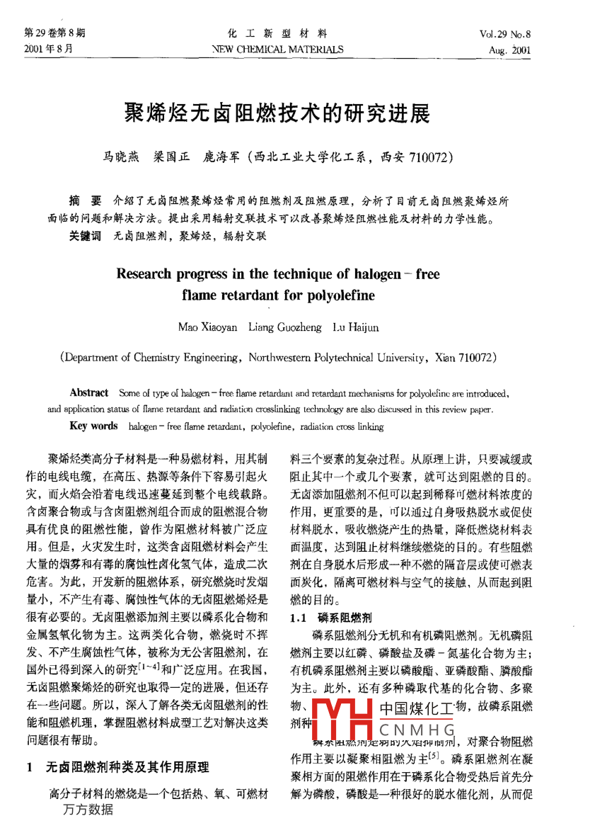 第29卷第8期化工新型材料Vol. 29 No.82001年8月NEW CHEMICAL MATERIALSAug. 2001聚烯烴無鹵阻燃技術(shù)的研究進(jìn)展馬曉燕梁國正鹿海軍(西北工業(yè)大學(xué)化工系,西安710072)摘要介紹了無鹵阻燃聚烯烴常用的阻燃劑及阻燃原理,分析了目前無鹵阻燃聚烯烴所面臨的問題和解決方法。提出采用輻射交聯(lián)技術(shù)可以改善聚烯烴阻燃性能及材料的力學(xué)性能。關(guān)鍵詞無鹵 阻燃劑,聚烯烴,輻射交聯(lián)Research progress in the technique of halogen - freeflame retardant for polyolefineMao Xiaoyan Liang Guozheng Lu Haijun(Department of Chemistry Engineering, Northwestern Polytechnical University, Xien 710072)Abstract Some of type o[ halogen - free flame retardanl and retardant mechanisns for plyoleline are introduced,and application status of lame retardant and radiaticn coslinking technology are also discussed in this review paper.Key words halogen - free flame retardanl, polyoleine, radiation eross linking聚烯烴類高分子材料是-種易燃材料,用其制料三個(gè)要素的復(fù)雜過程。從原理上講,只要減緩或作的電線電纜,在高壓、熱源等條件下容易引起火阻止其中一個(gè)或幾個(gè)要素,就可達(dá)到阻燃的目的。災(zāi),而火焰會(huì)沿著電線迅速蔓延到整個(gè)電線載路。無鹵添加阻燃劑不但可以起到稀釋可燃材料濃度的含鹵聚合物或與含鹵阻燃劑組合而成的阻燃混合物作用,更重要的是,可以通過白身吸熱脫水或促使具有優(yōu)良的阻燃性能,曾作為阻燃材料被廣泛應(yīng)材料脫水,吸收燃燒產(chǎn)生的熱量,降低燃燒材料表用。但是,火災(zāi)發(fā)生時(shí),這類含鹵阻燃材料會(huì)產(chǎn)生面溫度,達(dá)到阻止材料繼續(xù)燃燒的日的。有些阻燃大量的煙霧和有毒的腐蝕性鹵化氫氣體,造成二次劑在自身脫水后形成一種不燃的隔音層或使可燃表危害。為此,開發(fā)新的阻燃體系,研究燃燒時(shí)發(fā)煙面炭化,隔離可燃材料與空氣的接觸,從而起到阻量小,不產(chǎn)生有毒、腐蝕性氣體的無鹵阻燃烯烴是燃的目的。很有必要的。無鹵阻燃添加劑主要以磷系化合物和1.1 磷系阻燃劑金屬氫氧化物為主。這兩類化合物,燃燒時(shí)不揮磷系阻燃劑分無機(jī)和有機(jī)磷阻燃劑。無機(jī)磷阻發(fā)、不產(chǎn)生腐蝕性氣體,被稱為無公害阻燃劑,在燃劑主要以紅磷、磷酸鹽及磷-氮基化合物為主;國外已得到深入的研究[1~41和廣泛應(yīng)用。在我國,有機(jī)磷系阻燃劑主要以磷酸酯、亞磷酸酯、膦酸酯無鹵阻燃聚烯烴的研究也取得一定的進(jìn)展,但還存為主。此外,還有多種磷取代基的化合物、多聚在一些問題。所以,深人了解各類無鹵阻燃劑的性物、中國煤化工物,故磷系阻燃能和阻燃機(jī)理,掌握阻燃材料成型工藝對解決這類劑種.TH.CNMHG問題很有幫助。解於出於刑定羽的入陽偉前刑,對聚合物阻燃作用主要以凝聚相阻燃為主[51。磷系阻燃劑在凝1無鹵阻燃劑種類及其作用原理聚相方面的阻燃作用在于磷系化合物受熱后首先分高分子材料的燃燒是一個(gè)包括熱、 氧、可燃材解為磷酸,磷酸是一種很好的脫水催化劑,從而促第8期馬曉燕:聚烯烴尤鹵阻燃技術(shù)的研究進(jìn)展.27.使聚合物脫水炭化。在受強(qiáng)熱時(shí),磷酸聚合為聚磷裂伸長率下降。為了解決這些問題,一般采用硅烷偶酸,它是一種更強(qiáng)的脫水催化劑。磷酸脫水后所生聯(lián)劑和鈦酸酯類偶聯(lián)劑處理ATH,可取得較好的效成的焦炭層星石墨狀,能隔阻內(nèi)部聚合物與氧氣接果。張顯友5]等人采用硅烷交聯(lián)技術(shù)對無鹵阻燃電纜觸,焦炭層導(dǎo)熱性差,使聚合物與熱源隔絕,誠緩料進(jìn)行了研究,表明無論是阻燃性還是力學(xué)性能均獲了熱分解,從而起到阻燃的作用。得了提高。ATH的粒度對聚合物阻燃性能及力學(xué)性膨脹型多聚磷酸銨是近年研究較多的一種阻燃能很大的影響,研究表明16.17],等量的阻燃劑,粒度劑。其阻燃機(jī)理足:燃燒時(shí),膨脹型阻燃劑的各組越小,比表面積越大,阻燃效果越好;超細(xì)粒度的分之間發(fā)生一系列化學(xué)反應(yīng),并在聚合物表面形成ATH,可增強(qiáng)界面的相互作用,有效地改善共混物的-泡沫炭層,此層在凝聚相中不但能隔熱、隔氧及力學(xué)性能。高純化的AIH會(huì)使材料的電氣性能得以防熔滴,而且還可改善磷系阻燃劑發(fā)煙量大的缺點(diǎn)。提高(18。高純化是指氫氧化鋁含量大于99.9%,氧口本將這種膨脹型阻燃劑用在聚烯烴類化合物化鈉的含量低于0.2%質(zhì)量分?jǐn)?shù)。中取得很好的效果,并有多項(xiàng)專利相繼問世(6~8]。金屬氫氧化鎂也是一種有效的添加型無鹵阻燃其中,Kanoka, Kunio 等的專利表明,采用聚磷劑。其阻燃原理和氫氧化鋁相似。郭家聲19:研究酸銨阻燃劑對乙烯-丙烯共聚物進(jìn)行阻燃,可使氧表明,采用氫氧化鎂阻燃聚烯烴氧指數(shù)可達(dá)到41。指數(shù)達(dá)到31.3。我國中山大學(xué)的廖凱榮等人[9,102以氫氧化鎂 為無鹵阻燃劑的研究很多(20.21,均取以多聚磷酸銨為阻燃劑,在發(fā)泡劑三聚氰胺和成炭得較好的效果。氫氧化鎂阻燃劑和氫氧化鎂鋁類劑季戊四醇的協(xié)同作用下,對電線電纜用聚丙烯的似,也是高添加型阻燃劑,為此,對氫氧化鎂進(jìn)行限燃進(jìn)行了研究,表明它是聚丙烯類電纜阻燃很好各種表面處理是必要的。的無鹵低煙阻燃劑。北京理工大學(xué)的歐育湘