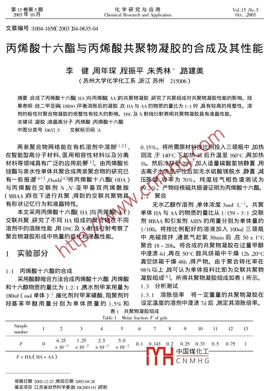 第15卷第5_期化學(xué)研究與應(yīng)用Vol.15 No.52003年10月Chemical Research and ApplicationOct. 2003文章編號(hào):1004-1656( 2003 )04-0635-04丙烯酸十六酯與丙烯酸共聚物凝膠的合成及其性能.李健周年琛程振平朱秀林* 路建美(蘇州大學(xué)化學(xué)化工系浙江蘇州215006 )摘要:合成了丙烯酸十六酯( HA )嶼丙烯酸( AA )的共聚物凝膠研究了共聚組成對(duì)共聚物凝膠性能的影響。結(jié)果表明經(jīng)二甲亞砜(DMSO平衡溶脹后的凝膠在HA與AA的物質(zhì)的量比為1:1時(shí)具有較高的規(guī)整性。溶.劑的極性對(duì)聚合物凝膠的規(guī)整性有較大的影響。DSC及X射線衍射表明共聚物凝膠具有液晶性能。關(guān)鍵詞凝膠液晶高分子丙烯酸丙烯酸十六酯中圖分類號(hào):0632.5文獻(xiàn)標(biāo)識(shí)碼A兩親聚合物網(wǎng)絡(luò)能在有機(jī)溶劑中溶脹12],0.15%。將所需原材料按比例投入三頸瓶中加熱在智能型高分子材料、醫(yī)用相容性材料以及分離回流于140°C 下加熱4h后升溫至160C再加熱材料等領(lǐng)域具有廣泛的應(yīng)用前景3]。由丙烯酸長1h。然后冷卻至70C加入適量碳酸氫鈉靜置,用鏈酯與親水性單體共聚合成兩親聚合物的研究已去離子水洗至中性后加無水硫酸鎂脫水靜置減有-些報(bào)道47],0sadd8]將丙烯酸十八酯(ODA)壓蒸餾,收率為70%。純度經(jīng)氣相色譜測試為與丙烯酸在交聯(lián)劑N,N'~亞甲基雙丙烯酰胺99.2%。產(chǎn)物經(jīng)核磁共振譜證明為丙烯酸十六酯。( MBAA )存在下進(jìn)行共聚,得到的交聯(lián)共聚物具1.2 聚合有形狀記憶行為和液晶特性。無水乙醇作溶劑,單體濃度3mot L-'。 共聚本文采用丙烯酸十六酯( HA )與丙烯酸( AA )單體HA與AA的物質(zhì)的量比從1:159~3:1,交聯(lián)交聯(lián)共聚研究了不同HA組成的聚合物在不同劑MBAA和引發(fā)劑AIBN的用量分別為單體量的溶劑中的溶脹性能用DSC及X_射線衍射考察了1/100。將按比例配好的溶液加入100ml三頸瓶聚合物凝膠形成中熱量的變化和液晶性能。中電磁攪拌,通氮?dú)廒s氧30min 后,在 50士1°C聚合18~ 20h。將合成的共聚物凝膠在過量甲醇1實(shí)驗(yàn)部分中浸漬4d ,再在50°C鼓風(fēng)烘箱中干燥12h ,20°C真空烘箱干燥48h得產(chǎn)物。由于聚合轉(zhuǎn)化率在1.1 丙烯酸十六酯的合成98%以上故可認(rèn)為單體投料比即為交聯(lián)共聚物采用酸醇縮合方法合成丙烯酸十六酯丙烯酸凝膠組成8。所得共聚物凝膠組成如表1所示。和十六醇物質(zhì)的量比為1.2:1 攜水劑甲苯用量為1.3分析測試180mt ( mol單體)-1催化劑對(duì)甲苯磺酸、阻聚劑對(duì)1.3.1溶脹倍率將一定重量的共聚物凝膠在羥基苯甲醚用量分別為單體質(zhì)量的1.5%和設(shè)定溫度的溶劑中浸漬7d后測定其溶脹倍率。表1共聚物凝膠組成Table 1 Molar fraction F of gelsSample4789l011213numberF6.251.252.55.00.1 0.143 0.20.25 0.330.50.75x10-3x10-2x10-2x10-2中國煤化工-F=HA( HA+ AA)MHCNMHG收稿日期2002-12-23 修回日期2003-04-28 .基金項(xiàng)目江蘇省自然科學(xué)基金( B2001141資助*通訊聯(lián)系人636化學(xué)研究與應(yīng)用第15卷溶脹凝膠重量_凝膠干重脹倍率隨F值的增加下降緩慢變化不大。溶脹倍率=凝膠干重1.3.2 DSC及XRD分析用美國TA instruments2.2共聚物凝膠的相變行為圖Xa)是F=0時(shí)聚合物凝膠(PAA)的DSC的DSC 2010進(jìn)行分析,試樣重0. 26mg ~ 0.30mg ,溫譜圖為一直線在升溫和降溫過程中不發(fā)生相升溫一降溫速率為 1°C min-' 氮?dú)饬魉?0mt變。圖Xb)是F=0.25的聚合物凝膠的DSC溫min-1 ,吸熱- -放熱量用Universal V2.6D TA譜圖,在升溫過程中,在31.18°C處有一吸熱峰,Instuments進(jìn)行處理計(jì)算?!鱄=3.201} g-1 轉(zhuǎn)換為HA則是△H= 7.99k}試樣經(jīng)特定溶劑充分溶脹后切片,用 X.射線(HA摩爾)-1 ;降溫過程中在23.88°C處有-放衍射儀(型號(hào):D/Max-IIC ,日本理學(xué)電機(jī)株式會(huì)熱峰,OH=2.537j g-' ,轉(zhuǎn)換為HA則是△H =社Rigaku進(jìn)行分析,電壓40kV ,電流35mA掃描6.33kJ( HA摩爾)。與Osadd 11]所報(bào)道的丙烯速率3°C min-'。酸十八酯ODA和丙烯酸的共聚物凝膠的相變溫度相比要低16. 82°(升溫和19.129降溫》該2結(jié)果與討論聚合物凝膠的結(jié)構(gòu)具有較高規(guī)整性,在升溫過程中在31.18°C從液晶相向等方相轉(zhuǎn)變;降溫過程2.1共聚組成對(duì)凝膠溶脹倍率的影響中在23. 88C從等方相向液晶相轉(zhuǎn)變。圖2(c)聚丙烯酸(PAA)是高分子電解質(zhì)凝膠,在結(jié).圖x d和圖x e分別是F=0.33、F=0.5和F=構(gòu)中引入疏水鏈段丙烯酸十六酯形成具有兩親結(jié)0.75的聚合物凝膠的DSC溫譜圖,在升溫過程構(gòu)的聚合物網(wǎng)絡(luò)具有既能在水中溶脹又能在有中分別在35. 10°C、36.41°C和36.529C處有- -吸熱峰,吸熱量分別為△H= 12.54J+ g-!、 △H =36.87J g-和△H=50.03.F g-1 ,轉(zhuǎn)換為HA則是△H= 15.64kJ ( HA摩爾)1、△H = 25.62kJ ( HA .G2摩爾) l和17 .52kJ( HA摩爾)-1降溫過程中分別在28. 51°C、30.73°C和30. 87°C處各有一放熱峰吸熱量分別為△H=9.358J g-!、 △H= 39.59}g-1 ,轉(zhuǎn)換為HA則是△H= 11.67kJ. (HA摩爾)、27.76k} (HA摩爾) !和15.04k.} (HA摩爾)-1表明這三組聚合物凝膠都有-定的規(guī)整圖1共聚物凝膠在 DMSO中的溶脹性能性。圖Xf)是F=1的聚合物PHA )凝膠在升溫Fig. 1 Dependence of degree of swelling in DMSO on F ofpol( HA-co-AA )gels過程中,在36.71°C處有一吸熱峰,△H = 59.30F機(jī)溶劑中溶脹的獨(dú)特性能。這種溶脹性能與共聚g1轉(zhuǎn)換為HA則是OH=23.78kJ.(HA