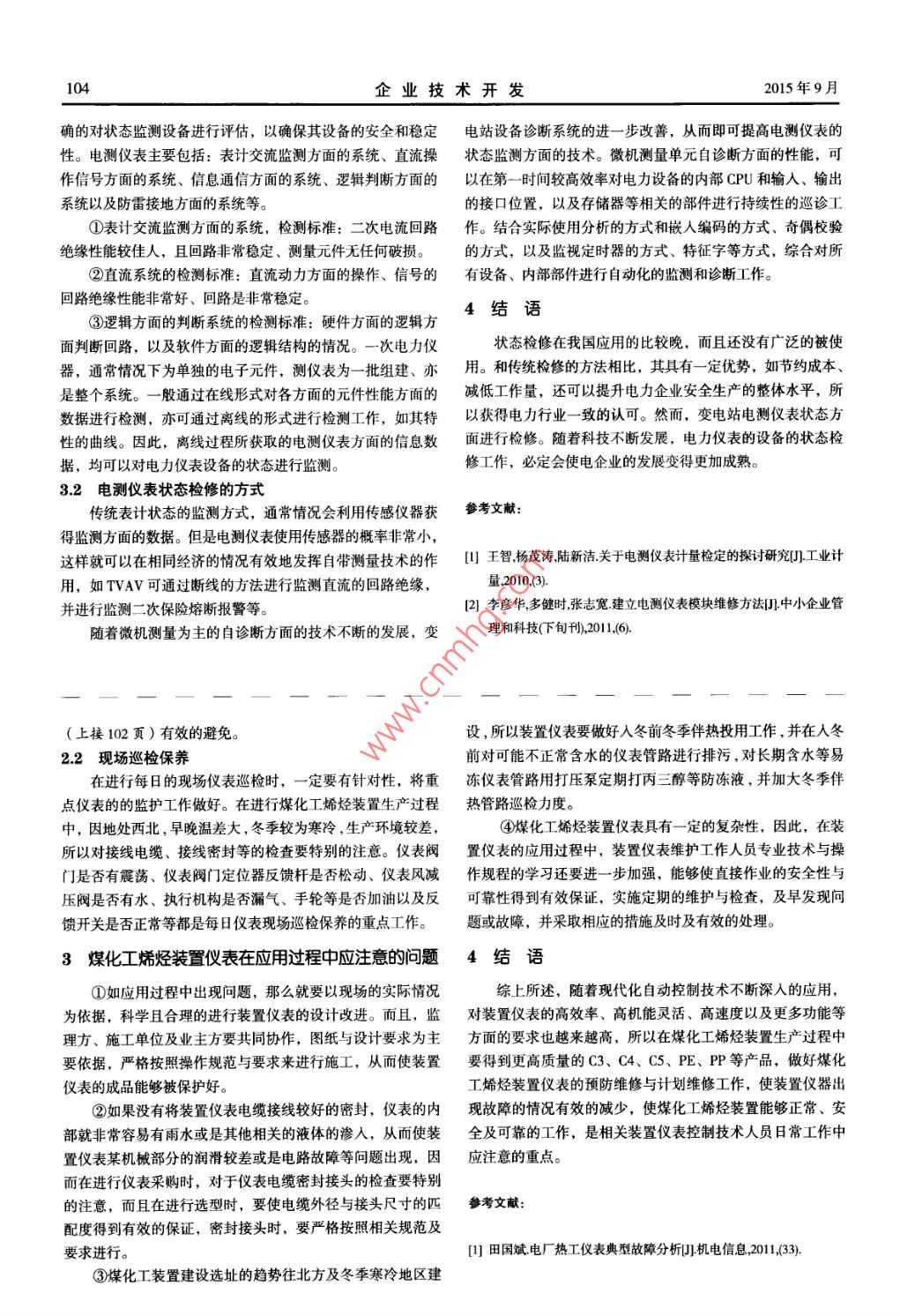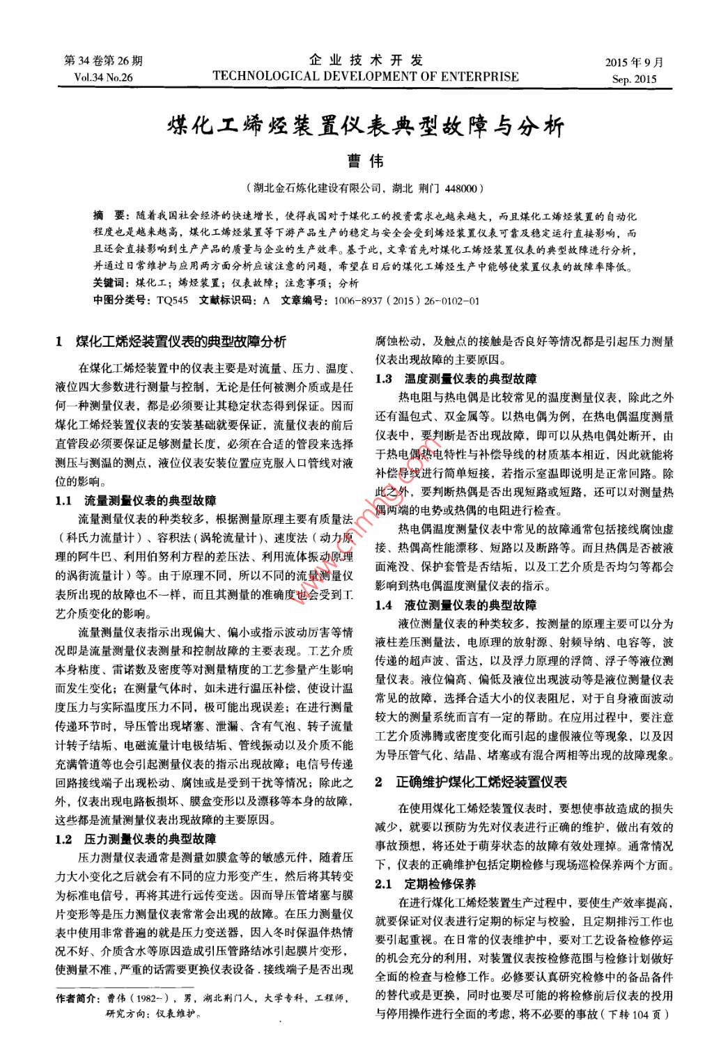 企業(yè)技術(shù)開發(fā)2015年9月第34卷第26期VolL34 No.26TECHNOLOCICAL DEVELOPMENT OF ENTERPRISESep. 2015煤化工烯烴裝置儀表典型故障與分析曹偉(湖北金石煉化建設(shè)有限公司,湖北荊門48000)i要:隨著我國(guó)社會(huì)經(jīng)濟(jì)的快速增長(zhǎng),使得我國(guó)對(duì)于堞化工的投資需求也越來越大,而且媒化工烯烴裝置的自動(dòng)化程度也是越來越高,越來越高,煤化工烯烴裝置等下游產(chǎn)品生產(chǎn)的穩(wěn)定與安全會(huì)受到烯烴裝置儀表可靠及穩(wěn)定運(yùn)行直接影響,西且還會(huì)直接影響到生產(chǎn)品的質(zhì)量與企業(yè)的生產(chǎn)效率。基于此,文章首先對(duì)煤化工烯烴裝置僅表的典型故障進(jìn)行分析,并通過日常維護(hù)與應(yīng)用兩方面分析應(yīng)該注意的問題,希望在日后的煤化工烯烴生產(chǎn)中能夠使裝置儀表的故障率降低。關(guān)鍵詞:煤化工;烯烴裝置;儀表故障;注意事項(xiàng);分析中圖分類號(hào): TQ545文獻(xiàn)標(biāo)識(shí)碼: ^文章編號(hào): 1006- 8937 (2015) 26-0102-011煤化工烯烴裝置儀表的典型故障分析腐蝕松動(dòng),及觸點(diǎn)的接觸是否良好等情況都是引起壓力測(cè)量?jī)x表出現(xiàn)故障的主要原因。在煤化工烯烴裝置中的儀表主要是對(duì)流量、壓力、溫度、1.3 溫度測(cè)量?jī)x表的典型故障液位四大參數(shù)進(jìn)行測(cè)量與控制,無(wú)論是任何被測(cè)介質(zhì)或是任熱電阻與熱電偶是比較常見的溫度測(cè)量?jī)x表,除此之外何- -種測(cè)量?jī)x表,都是必須要讓其穩(wěn)定狀態(tài)得到保證。因而還有溫包式、雙金屬等。以熱電偶為例,在熱電偶溫度測(cè)量煤化工烯烴裝置儀表的安裝基礎(chǔ)就要保證,流量?jī)x表的前后儀表中,要判斷是否出現(xiàn)故障,即可以從熱電偶處斷開,由直管段必須要保證足夠測(cè)量長(zhǎng)度,必須在合適的管段來選擇于熱電偶熱電特性與補(bǔ)償導(dǎo)線的材質(zhì)基本相近,因此就能將測(cè)壓與測(cè)溫的測(cè)點(diǎn),液位儀表安裝位置應(yīng)克服入口管線對(duì)液補(bǔ)償導(dǎo)線進(jìn)行簡(jiǎn)單短接,若指示室溫即說明是正常回路。除位的影響。此之外,要判斷熱偶是否出現(xiàn)短路或短路,還可以對(duì)測(cè)量熱1.1 流量測(cè)量?jī)x表的典型故障偶兩端的電勢(shì)或熱偶的電阻進(jìn)行檢查。流量測(cè)量?jī)x表的種類較多,根據(jù)測(cè)量原理主要有質(zhì)量法熱電偶溫度測(cè)量?jī)x表中常見的故障通常包括接線腐蝕虛(科氏力流量計(jì))、容積法(渦輪流量計(jì))、速度法(動(dòng)力原接、熱偶高性能漂移、短路以及斷路等。而且熱偶是否被液理的阿牛巴、利用伯努利方程的差壓法、利用流體振動(dòng)原理面淹沒、保護(hù)套管是否結(jié)垢,以及工藝介質(zhì)是否均勻等都會(huì)的渦街流量計(jì))等。由于原理不同,所以不同的流量測(cè)量?jī)x影響到熱電偶溫度測(cè)量?jī)x表的指示。表所出現(xiàn)的故障也不一樣, 而且其測(cè)量的準(zhǔn)確度也會(huì)受到工1.4液位測(cè)量?jī)x表的典型故障藝介質(zhì)變化的影響。液位測(cè)量?jī)x表的種類較多,按測(cè)量的原理主要可以分為流量測(cè)量?jī)x表指示出現(xiàn)偏大、偏小或指示波動(dòng)厲害等情液柱差壓測(cè)量法,電原理的放射源、射頻導(dǎo)納、電容等,波況即是流量測(cè)量?jī)x表測(cè)量和控制故障的主要表現(xiàn)。工藝介質(zhì)傳遞的超聲波、雷達(dá),以及浮力原理的浮筒、浮子等液位測(cè)本身粘度、雷諾數(shù)及密度等對(duì)測(cè)量精度的工藝參量產(chǎn)生影響量?jī)x表。液位偏高、偏低及液位出現(xiàn)波動(dòng)等是液位測(cè)量?jī)x表而發(fā)生變化;在測(cè)量氣體時(shí),如未進(jìn)行溫壓補(bǔ)償,使設(shè)計(jì)溫常見的故障,選擇合適大小的儀表阻尼,對(duì)于自身液面波動(dòng)度壓力與實(shí)際溫度壓力不同,極可能出現(xiàn)誤差;在進(jìn)行測(cè)量較大的測(cè)量系統(tǒng)而言有一定的幫助。 在應(yīng)用過程中,要注意傳遞環(huán)節(jié)時(shí),導(dǎo)壓管出現(xiàn)堵塞、 泄漏、含有氣泡、轉(zhuǎn)子流量工藝介質(zhì)沸騰或密度變化而引起的虛假液位等現(xiàn)象,以及因計(jì)轉(zhuǎn)子結(jié)垢、電磁流量計(jì)電極結(jié)垢、管線振動(dòng)以及介質(zhì)不能為導(dǎo)壓管氣化、結(jié)晶、堵塞或有混合兩相等出現(xiàn)的故障現(xiàn)象。充滿管道等也會(huì)引起測(cè)量?jī)x表的指示出現(xiàn)故障:電信號(hào)傳遞2正確維護(hù)煤化工烯烴裝置儀表回路接線端子出現(xiàn)松動(dòng)、腐蝕或是受到干擾等情況;除此之外,儀表出現(xiàn)電路板損壞、膜盒變形以及漂移等本身的故障,在使用媒化工烯烴裝置儀表時(shí),要想使事故造成的損失這些都是流量測(cè)量?jī)x表出現(xiàn)故障的主要原因。減少,就要以預(yù)防為先對(duì)儀表進(jìn)行正確的維護(hù),做出有效的1.2 壓力測(cè)量?jī)x表的典型故障事故預(yù)想,將還處于萌芽狀態(tài)的故障有效處理掉。通常情況壓力測(cè)量?jī)x表通常是測(cè)量如膜盒等的敏感元件,隨著壓下,儀表的正確維護(hù)包括定期檢修與現(xiàn)場(chǎng)巡檢保養(yǎng)兩個(gè)方面。力大小變化之后就會(huì)有不同的應(yīng)力形變產(chǎn)生,然后將其轉(zhuǎn)變2.1 定期檢修保養(yǎng