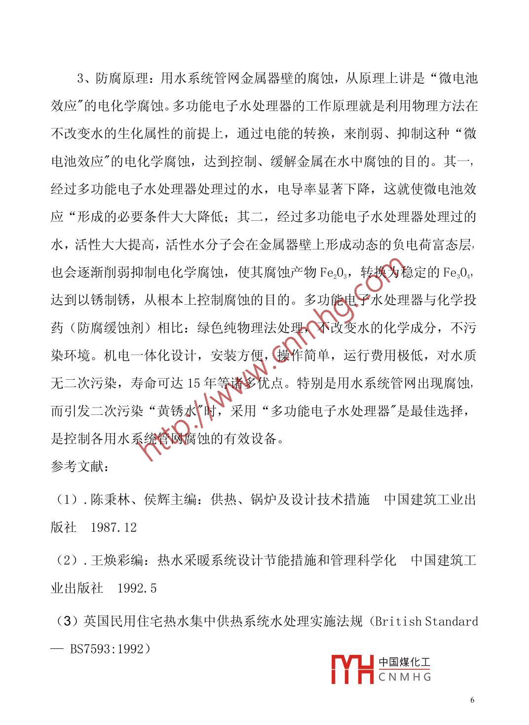 探析水處理方案在采暖循環(huán)水系統(tǒng)中的設(shè)計(jì)代麗芳.唐山市熱力公司河北唐山 064003摘要:對(duì)采暖循環(huán)水系統(tǒng)中存在的結(jié)垢、腐蝕、堵塞等主要問(wèn)題,采用鈉離子交換器和多功能電子水處理器兩者結(jié)合的方式從根源上進(jìn)行解決,并對(duì)產(chǎn)生的廢液進(jìn)行再利用。關(guān)鍵詞:鈉離子交換器;多功能電子水處理器;防腐;防垢;廢液再.利用.一、水處理應(yīng)用于采暖循環(huán)水系統(tǒng)的必要性采暖循環(huán)水系統(tǒng)存在的主要問(wèn)題是換熱設(shè)備的結(jié)垢影響換熱效率;系統(tǒng)管網(wǎng)的腐蝕以及腐蝕造成的水質(zhì)二次污染,管網(wǎng)末端散熱器鐵垢沉積、堵塞,影響散熱的問(wèn)題。另外,采暖循環(huán)水在封閉的系統(tǒng)中運(yùn)行,運(yùn)行溫度為95°C~75°C。由于系統(tǒng)長(zhǎng)期在高溫環(huán)境下運(yùn)行,系統(tǒng)管網(wǎng)、設(shè)備腐蝕情況比較嚴(yán)重。造成系統(tǒng)中雜質(zhì)不斷增多,水的色度、濁度不斷提高。如果系統(tǒng)中配備的過(guò)濾裝置不盡合理,將無(wú)法去除懸浮于水中的鐵銹等雜質(zhì)。隨著系統(tǒng)的運(yùn)行,水質(zhì)中的雜質(zhì)就會(huì)在水流速度較慢的裝置內(nèi)沉積下來(lái),導(dǎo)致管網(wǎng)堵塞。使系統(tǒng)運(yùn)行工況惡化,嚴(yán)重影響到鍋爐、換熱設(shè)備、水泵管道、閥門及整個(gè)供暖系統(tǒng)的能源效率、安全性和使用壽命,也嚴(yán)重阻礙新型節(jié)能型散熱器、散熱器恒溫控制閥和機(jī)械式分戶熱表的推廣應(yīng)用。為了適應(yīng)城鎮(zhèn)供熱體制改革的需要,必須改變上述落后的狀態(tài)。這就需要設(shè)計(jì)一套確實(shí)有效的水處理方案。中國(guó)煤化工二、單純安裝鈉離子交換器的局限性MHCNMH G1目前在采暖循環(huán)水系統(tǒng)的水處理中,通常采用軟化水方式,即在補(bǔ)水系統(tǒng)中單純安裝鈉離子交換器,將水質(zhì)軟化后注入循環(huán)系統(tǒng)。但這種方案存在很大的隱患,現(xiàn)詳述如下:(一)軟化水只能解決采暖循環(huán)系統(tǒng)中換熱設(shè)備結(jié)垢的問(wèn)題,而無(wú)法解決系統(tǒng)的腐蝕問(wèn)題和管網(wǎng)的堵塞問(wèn)題。相反,軟化水還會(huì)加劇管網(wǎng)的腐蝕,加速采暖循環(huán)水運(yùn)行工況的進(jìn)一步惡化。 經(jīng)驗(yàn)表明:使用軟化水做補(bǔ)水兩年后水系統(tǒng)即開(kāi)始有泄漏,腐蝕逐年加重,造成供熱管網(wǎng)跑、冒、滴、漏現(xiàn)象嚴(yán)重。1992 年英國(guó)集中供熱水處理總則中就明確:民用住宅熱水集中供熱系統(tǒng)水處理實(shí)施法規(guī)(British Standard一BS7593:1992)總則中規(guī)定:“在任何一個(gè)集中 供暖系統(tǒng)中都不應(yīng)該使用經(jīng)過(guò)軟水器的供水,除非特別地明確表示已經(jīng)為此添加了腐蝕抑制劑?!?二)單純安裝鈉離子交換器滿足不了較大系統(tǒng)的初期充水和大量跑水的情況,在這兩種情況下為了滿足短時(shí)間內(nèi)向管網(wǎng)大量注水的需求,往往是直接向管網(wǎng)注入自來(lái)水,這也使其失去了軟化除垢的意義。(三)鈉離子交換器再生廢液導(dǎo)致地下水日益嚴(yán)重的鹽污染。在我國(guó)僅供熱制取軟化水,每年有大約2000多萬(wàn)噸的食鹽排入地下水,工業(yè)蒸汽鍋爐為了制取軟化水每年需要排放到地下2000多萬(wàn)噸食鹽,電廠陰陽(yáng)離子交換再生廢液排到中和池后又形成遠(yuǎn)大于2000多萬(wàn)噸的食鹽。在北京市每制取1立方米鈉離子交換軟化水,就要排到地下2. 5公斤左右的食鹽。.中國(guó)煤化工YHCNMH G2綜上所述,單純安裝鈉離子交換器并不能全面解決采暖循環(huán)系統(tǒng)存在的問(wèn)題,也不適宜現(xiàn)代人類日益加強(qiáng)的環(huán)保需求。采暖循環(huán)系統(tǒng)存在的問(wèn)題是綜合性的,需要進(jìn)行綜合處理。三、水處理方案的再設(shè)計(jì)針對(duì)_上述弊病,我建議采用鈉離子交換器和多功能電子水處理器兩者結(jié)合的方式。具體設(shè)計(jì)如下:(一)采用現(xiàn)已較成熟的在補(bǔ)水系統(tǒng)中安裝鈉離子交換器來(lái)滿足平時(shí)的補(bǔ)水除垢需求,并對(duì)其產(chǎn)生的廢水進(jìn)行再利用。鈉離子交換器再生廢液占生產(chǎn)軟化水總量的5%一10%左右,人工操作的軟水器所產(chǎn)生的廢水則更多。從環(huán)保和節(jié)約用水的角度出發(fā),將軟水器的廢水再利用,是必須的, 而 且是可行的。1、廢水利用的措施(1)樹(shù)脂軟水器正洗廢水的性質(zhì):從鈉離子樹(shù)脂軟水器的工作原理得知,再生溶液 NaCl與失效鈉離子樹(shù)脂進(jìn)行置換后,軟水器內(nèi)的水中主要含有大量的氣離子,鈣和鎂離子。在進(jìn)行正洗工作時(shí),開(kāi)始從軟水器內(nèi)沖出來(lái)的氯根含量在1000mg/l 左右,它和鈣、 鎂離子形成CaCl2、 MgCl2。正洗終結(jié)的標(biāo)準(zhǔn)是出水硬度≤0.03mol/l,即達(dá)到鍋爐的水質(zhì)標(biāo)準(zhǔn)。由此可見(jiàn),由含有CaCl2、MgCl2 成分和軟水合成的正洗廢水其硬度優(yōu)于自來(lái)水。(2)水浴除塵器循環(huán)水的性質(zhì):煤在爐膛內(nèi)燃燒后產(chǎn)生的煙氣中,主要含有SO2成分,與煙氣、水浴除塵器中的水相互混合后,從水浴除塵器排出的水即成為煤灰和煙氣混合的灰水。煙氣中原有的SO2 