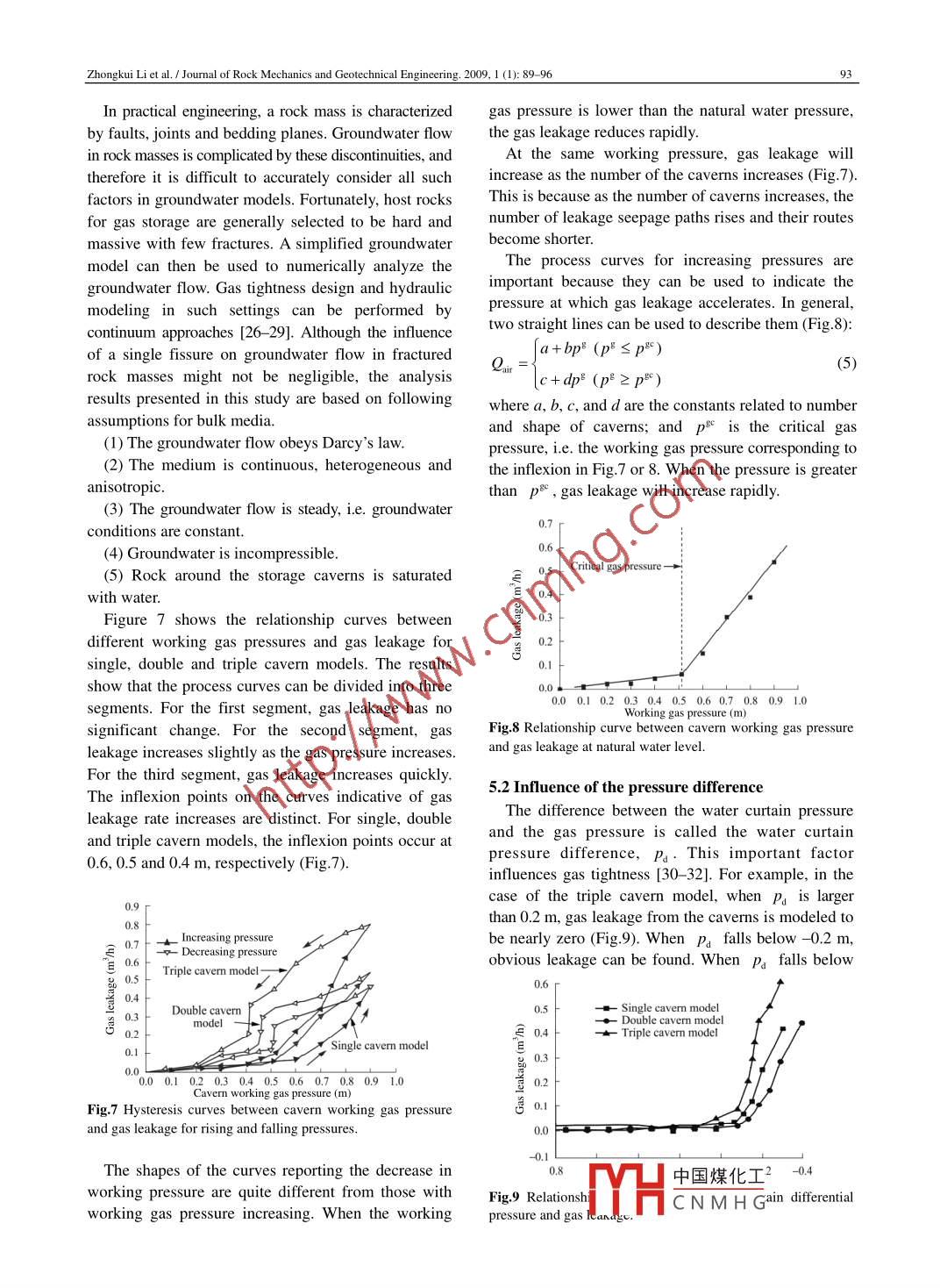 Journal of Rock Mechanics and Geotechnical Engineering. 2009, 1(1): 89-96Journal of rock mechanics and Geotechnical engineeringJournalonlinewww.rockgcotech.orgCSRMEExperimental study of water curtain performance for gas storage in anunderground cavernZhongkui Li, Kezhong Wang2 Anmin Wang,Hui LiuI State Key Laboratory of Hydroscience and Engineering, Tsinghua University, Beijing, 100084, chinaReceived 16 April 2008: received in revised form 22 August 2009: accepted 26 August 2o 0014, chinaSchool of Civil Engineering and Architecture, Zhejiang University of Technology, Hangzhou, 3/Abstract: An artificial water curtain system is composed of a network of underground galleries and horizontal boreholes drilledfrom these galleries. Pre-grouting measures are introduced to keep the bedrock saturated all the time. This system is deployedover an artificial or natural underground cavern used for the storage of gas (or some other fluids) to prevent the gas fromscaping through leakage paths in the rock mass. An experimental physical modeling system has been constructed to evaluatthe performance of artificial water curtain systems under various conditions. These conditions include different spacings ofcaverns and cavern radii located below the natural groundwater level. The principles of the experiment, devices, design of thephysical model, calculation of gas leakage, and evaluation of the critical gas pressure are presented in this paper. Experimentalresult shows that gas leakage is strongly affected by the spacing of water curtain boreholes, the critical gas pressure, and thenumber and proximity of storage caverns. The hydraulic connection between boreholes is observed to vary with depth orocation, which suggests that the distribution of water-conducting joint sets along the boreholes is also variable. When designingthe drainage system for a cavern, drainage holes should be orientated to maximize the frequency at which they encounter majorjoint sets and permeable intervals studying in order to maintain the seal on the cavern through water pressure. Our experimentalresults provide a significant contribution to the theoretical controls on water curtains, and they can be used to guide the desigand construction of practical storage cavernsKey words: artificial water curtain; model test; storage cavern; gas pressureIntroductionHowever, underground storage caverns requirespecific geological conditions that are not availableLarge underground caverns have been used for the everywhere For example, intact rock is never completelysafe and economical storage of hydrocarbon gases, impermeable. In unlined rock caverns, gas is keptgasoline, home heating oil, jet fuel and crude oil. The from escaping by ensuring that the groundwaterneed to support the rapid industrialization of the 1970srock around the caverns exceeds theand to avoid oil crises by creating significant storagein the storage caverns [5]. High gaapabilities stimulated the construction of underground pressure can be achieved by locating a cavern at astorage caverns for such materials as crude oil and sufficient depth or by installing a"water curtain'liquefied petroleum gas(LPG), and pumped storage around the cavern.power plants [1-3. A number of underground cavernsWater curtains are an array of boreholes that arehave been constructed for oil and gas storage in Chininstalled parallel to each other over the roof of aKorea has a short construction history of large-scale cavern and around the sidewalls if necessary. with awater curtain, the groundwater pressure around a cavernUnderground storage of pressurized gases in unlined can be increased sufficiently to prevent gas leakagerock caverns has advantages over above-ground storage The idea is to make water continuously flow towardin terms of safety, environmental protection and economy [4]. the cavern from outside so that the stored gas cannever escape out of the cavern. The cavern must beDoi:10.3724SPJ1235.2009.00089sited deep enough to ensure that the hydraulic pressure*Correspondingauthor.Tel:+86-531-88320153:E-mail:wkzl@zjut.edu.cnin rock fracturSupported by the National Natural Science Foundation of China (50779024d the cavern ic always higherthan the gas pre中國煤化50539090)and the Open Research Foundation of State Key Laboratory ofHydroscience and Engineering of Tsinghua University(20080533114is maintained tCNMH Grock throughZhongkui Li et al. Journal of Rock Mechanics and Geotechnical Engineering. 2009, 1(1): 89-96bores above the cavern to maintain a stable groundwater the systemlevel. The effectiveness of an unlined oil storage cavernFigure 2 shows different methods to limit oris strongly dependent on the water tightness of the rock eliminate leakage from an underground gas storagemass around the storage cavern. Thus, it is essential cavern. These methods are based on two main principlesthat all the cracks are filled with water during the of permeability and groundwater control. Permeabilityconstruction and operation of a storage cavern [6]. control means that the gas leakage is eliminated orThis method is termed as the water dynamics sealing kept at an acceptable level by ensuring that the rockmethod [7, 81mass around the storage has a sufficiently lowPrevious researches have developed the theory and permeability. The permeability coefficients of the rockapplication of water curtain installations. The extensiveImportanworks of Zimmels et al. 19-ll] have developed the controlling groundwater seepage and stress within theprinciples of water curtains, and provided useful rock. The permeability coefficient of a rock mass willsuggestions for practical installations. Lindblom et al. increase with the expansion of cracks. In faulted rock,[12, 13] advanced this work with simple numerical the permeability coefficients are different in differentsimulations. Kim et al. [14, 15] experimentally directions, i.e. anisotropic. Generally, in the directionmodeled and monitored underground LPG storage of fault, 