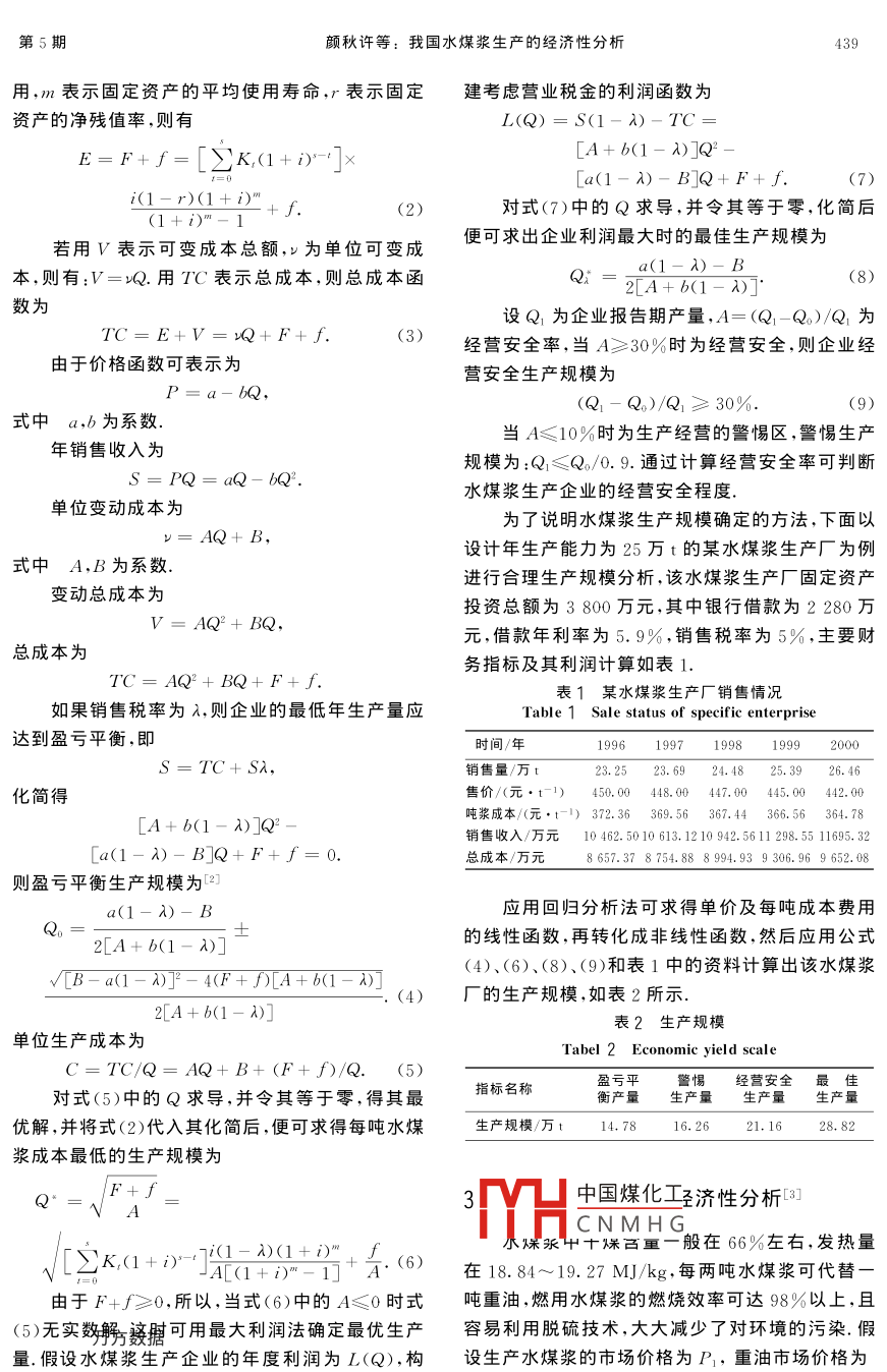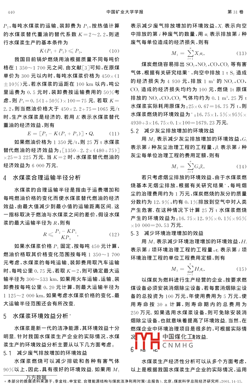 第31卷第5期中國礦業(yè)大學(xué)學(xué)報2002年9月Journal of China University of mining & Technology文章編號:1000-1964(2002)05-0438-04我國水煤漿生產(chǎn)的經(jīng)濟性分析顏秋許1,孫濤1.中國礦業(yè)大學(xué)經(jīng)濟管理系,北京100083:2.青島大學(xué)會計學(xué)系,山東青島266000)摘要:從我國水煤漿生產(chǎn)企業(yè)的實際情況岀發(fā),運用財務(wù)分析的理論和方法,對水煤漿生產(chǎn)規(guī)模的經(jīng)濟性、替代燃油的經(jīng)濟性、合理運輸半徑以及環(huán)境效益等方面的經(jīng)濟性分析進行了系統(tǒng)的分析,建立了水煤漿生產(chǎn)經(jīng)濟性分析的理論和方法體系,對水煤漿生產(chǎn)企業(yè)進行財務(wù)分析具有指導(dǎo)意義關(guān)鍵詞:水煤漿;水煤漿生產(chǎn);生產(chǎn)規(guī)模;經(jīng)濟分析中圖分類號:F062.4文獻標(biāo)識碼:A1我國水煤漿生產(chǎn)現(xiàn)狀及發(fā)展趨勢65t/h鍋爐,作為技術(shù)推廣的示范等等.由于我國水煤漿產(chǎn)業(yè)的快速發(fā)展,再加上國家政策支持,“十水煤漿是由65%~70%不同粒度分布的煤、五”期間可形成水煤漿生產(chǎn)能力600~800萬t/a,30%~35%的水和約1%的添加劑制成的混合物,其中,新建生產(chǎn)能力450~600萬t/a,可替代燃料是70年代石油危機中發(fā)展起來的一種新型低污染油約200~300萬t/a.基于以上的發(fā)展趨勢,我國代油燃料“我國自1982年開始,經(jīng)歷了“六五”到將在今后相當(dāng)長一段時間內(nèi)大力發(fā)展水煤漿產(chǎn)九五”4個五年計劃的攻關(guān),共取得水煤漿技術(shù)重業(yè).由于我國的水煤漿產(chǎn)業(yè)剛剛起步,生產(chǎn)技術(shù)大科技成果33項,在技術(shù)開發(fā)、工業(yè)化制漿及燃燒還不完善,缺乏建廠和生產(chǎn)經(jīng)營等方面的經(jīng)驗,因等方面具備了一定的基礎(chǔ)和能力,技術(shù)趨于成熟,此,應(yīng)加強對我國水煤漿生產(chǎn)的經(jīng)濟性分析.根據(jù)已能滿足工業(yè)化應(yīng)用的基本要求截止到2000年我國實際情況,應(yīng)主要對水煤漿生產(chǎn)規(guī)模的經(jīng)濟12月,已建成水煤漿廠13座(包括試驗廠),總生性、替代原油的經(jīng)濟性、合理運輸半徑以及環(huán)境效產(chǎn)能力達309萬t/a.我國水煤漿生產(chǎn)是根據(jù)能源益等方面進行分析,確保水煤漿生產(chǎn)在經(jīng)濟效益的市場需求發(fā)展起來的,發(fā)展的主要動力是由于水煤前提下正常發(fā)展?jié){具有替代燃油較好的經(jīng)濟效益,我國燃料油消費量很大,199年電力行業(yè)用2水煤漿生產(chǎn)規(guī)模的經(jīng)濟性分析油1660萬t,石油、石化、化工的工藝加熱和原料如果用K表示固定資產(chǎn)投資,K1表示第t年用油1180萬t,建材窯爐燃油300萬t,鋼鐵窯爐的貸款額,為貸款利率,s為建設(shè)期,則按復(fù)利計和發(fā)電燃油264萬t因此,水煤漿代油燃燒的主要算的建設(shè)期固定資產(chǎn)投資的本利和為市場在石油石化和電力行業(yè).目前,許多企業(yè)正在K進行水煤漿改造和試燒工作,如茂名熱電廠K,(1+i)(1)220t/h鍋爐改造,汕頭萬豐熱電廠220t/h燃油鍋為確定水煤漿生產(chǎn)的最低投資規(guī)模,假設(shè)水煤爐改造,西江電廠220t/h鍋爐改造,南海電廠3漿生產(chǎn)企業(yè)的年均生產(chǎn)能力為Q,每噸水煤漿的單臺670t/h燃油鍋爐改造,北京燕山石化公司在建價中國煤化工=PQ水煤漿生產(chǎn)的總設(shè)好第一臺220t/h燃用水煤漿鍋爐的基礎(chǔ)上再成CNMHG變動成本,若用E表示建一臺220t/h燃用水煤漿鍋爐,中原油田已將水呆泉廣業(yè)的固正成本總額,F表示年均固定4t/h快裝鏈條爐改用燃燒水煤漿,計劃再改造資產(chǎn)折舊,f表示固定資產(chǎn)折舊以外的年均固定費收稿日期:2002-01-14作者簡秀數(shù)據(jù)956),女,河南省許昌市人,中國礦業(yè)大學(xué)副教授,從事企業(yè)管理、人力資源管理、管理會計等方面的研究※申寶宏,熊飛.水煤漿技術(shù)政策研究報告.北京:煤炭科學(xué)總院,2001.2-5第5期顏秋許等:我國水煤漿生產(chǎn)的經(jīng)濟性分析439用,m表示固定資產(chǎn)的平均使用壽命,r表示固定建考慮營業(yè)稅金的利潤函數(shù)為資產(chǎn)的凈殘值率,則有L(Q)=S(I-2)-TC=F+f=[∑K(1+)-]A+b(1-)]Qa(1-A)-B]Q+F+f.i(1-r)(1+i)(1+t)m-1f.(2)對式(7)中的Q求導(dǎo),并令其等于零,化簡后若用V表示可變成本總額,為單位可變成便可求出企業(yè)利潤最大時的最佳生產(chǎn)規(guī)模為本,則有:V=地Q.用TC表示總成本,則總成本函(1-A)-B4+b(1-A)(8)數(shù)為設(shè)Q1為企業(yè)報告期產(chǎn)量,A=(Q1-Q)/Q1為TC=E+V=n+F+f.(3)經(jīng)營安全率,當(dāng)A≥30%時為經(jīng)營安全,則企業(yè)經(jīng)由于價格函數(shù)可表示為營安全生產(chǎn)規(guī)模為(Q1-Q)Q1≥30%式中a,b為系數(shù)當(dāng)A≤10%時為生產(chǎn)經(jīng)營的警惕區(qū),警惕生產(chǎn)年銷售收入為規(guī)模為:Q1≤Q。/0.9.通過計算經(jīng)營安全率可判斷s=PQ= aQ-bQ水煤漿生產(chǎn)企業(yè)的經(jīng)營安全程度單位變動成本為為了說明水煤漿生產(chǎn)規(guī)模確定的方法,下面以設(shè)計年生產(chǎn)能力為25萬t的某水煤漿生產(chǎn)廠為例式中A,B為系數(shù)進行合理生產(chǎn)規(guī)模分析,該水煤漿生產(chǎn)廠固定資產(chǎn)變動總成本為投資總額為3800萬元,其中銀行借款為2280萬V= AQ2+ BQ元,借款年利率為5.9%,銷售稅率為5%,主要財總成本為TC= AQ2+BQ+F+f務(wù)指標(biāo)及其利潤