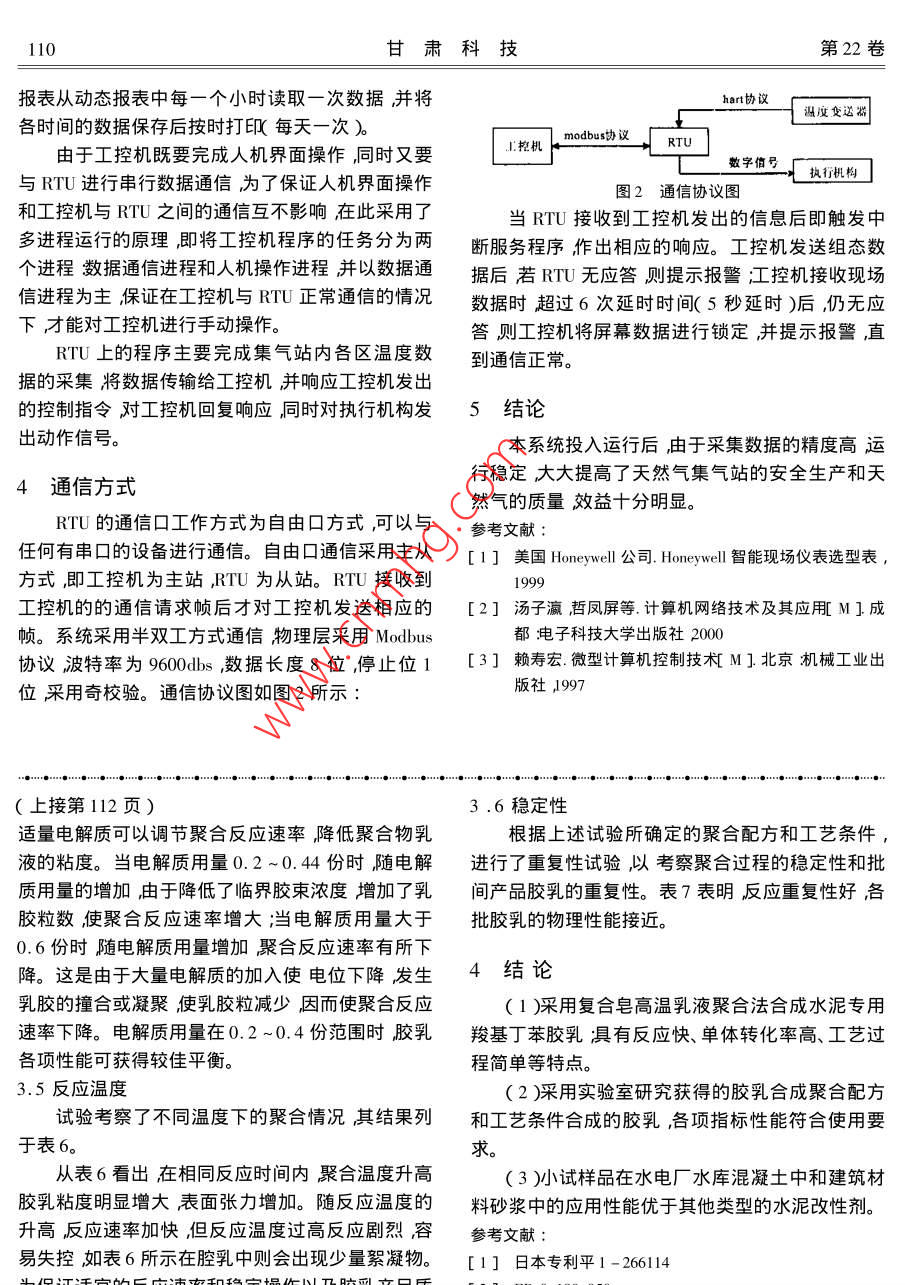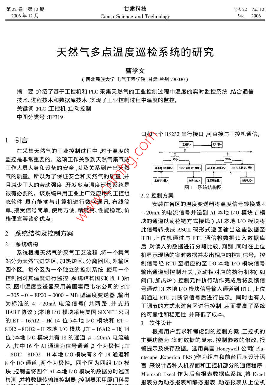 第22卷第12期甘肅科技Vol.22 No. 122006年12月Gansu Science and TechnologyDec. 2006天然氣多點(diǎn)溫度巡檢系統(tǒng)的研究曹學(xué)文.(西北民族大學(xué)電氣工程學(xué)院,甘肅蘭州730030 )摘要介紹了基于工控機(jī)和PLC采集天然氣的工業(yè)控制過程中溫度的實(shí)時(shí)監(jiān)控系統(tǒng)結(jié)合通信技術(shù)、進(jìn)程技術(shù)和數(shù)據(jù)庫技術(shù)實(shí)現(xiàn)了工業(yè)控制過程中溫度的監(jiān)控。關(guān)鍵詞:PLC ;工控機(jī);自動(dòng)控制中圖分類號(hào):TP319口和一個(gè)RS232串行接口,可直接與工控機(jī)通信。1引言工控機(jī)。在采集天然氣的工業(yè)控制過程中,對(duì)于溫度的監(jiān)控是非常重要的。這項(xiàng)工作關(guān)系到天然氣集氣站0工作人員人身和設(shè)備的安全,以及關(guān)系到產(chǎn)出天然I小本地IO物塊| DIUDO事越D塊0 Al事地風(fēng)模決DIDO不地0模塊。氣的質(zhì)量。所以為了保證安全和天然氣的質(zhì)量,并[ 建受送路執(zhí)行機(jī)構(gòu)。]溫要交運(yùn)題門執(zhí)行機(jī)構(gòu)-且減少工人的勞動(dòng)強(qiáng)度,開發(fā)多點(diǎn)溫度巡檢系統(tǒng)是圖1 系統(tǒng)結(jié)構(gòu)圖很有必要的。該系統(tǒng)采用工業(yè)上廣泛應(yīng)用的工控組2.2控制方案態(tài)軟件具有能夠與計(jì)算機(jī)進(jìn)行數(shù)字通訊、布線簡安裝在各區(qū)的溫度變送器將溫度信號(hào)轉(zhuǎn)換成4單、接受信號(hào)簡單、使用方便、精度高、性能穩(wěn)定價(jià)~ 20mA的電流信號(hào)并送到AI本地1/o模塊(模格便宜等諸多優(yōu)點(diǎn)。塊的通道以菊花鏈方式接線) ,AI本地I/O模塊將此信號(hào)轉(zhuǎn)換成ASCII碼形式巡回輸出這些數(shù)據(jù)至2系 統(tǒng)結(jié)構(gòu)及控制方案RTU ,上位機(jī)通過與RTU通信將數(shù)據(jù)讀入數(shù)據(jù)庫2.1系統(tǒng)結(jié)構(gòu)后對(duì)讀入的數(shù)據(jù)進(jìn)行分段比較、判別,同時(shí)在上位:系統(tǒng)根據(jù)天然氣的采氣工藝流程將一個(gè)集氣機(jī)顯示現(xiàn)場(chǎng)的實(shí)時(shí)數(shù)據(jù)并發(fā)出相應(yīng)的控制信號(hào)??卣痉譃樘烊粴膺M(jìn)站區(qū)、加熱爐區(qū)、分離器區(qū)、外輸區(qū).制信號(hào)經(jīng)RTU至相應(yīng)的至DO本地I/O模塊信號(hào)四個(gè)區(qū)。每個(gè)區(qū)為一個(gè)獨(dú)立的控制系統(tǒng)使用一個(gè)輸出通道到控制開關(guān),驅(qū) 動(dòng)相對(duì)應(yīng)的執(zhí)行機(jī)構(gòu)(如控制器對(duì)其溫度進(jìn)行監(jiān)控,系統(tǒng)結(jié)構(gòu)圖如(圖1 )所閥門、加熱爐)控制元件執(zhí)行動(dòng)作完成后將反饋信示圖中溫度變送器采用美國霍尼韋爾公司的STT號(hào)通過DI本地I/O模塊信號(hào)輸入通道到RTU ,上位-305-0-EP0O-000-MB型溫度變送器輸出機(jī)通過RTU判斷該信號(hào)后進(jìn)行提示。同時(shí)也有人為標(biāo)準(zhǔn)的4 ~ 20mA電流信號(hào)(共兩路,并支持工調(diào)節(jié)的方式來對(duì)各區(qū)進(jìn)行控制,從而提高了系統(tǒng)HART協(xié)議) ;本地I/O模塊采用美國SIXNET公司的可靠性和穩(wěn)定性并降低了成本。的ET- 16AI2 - H( 14位)本地I/O模塊和ET-3軟件設(shè)計(jì)8DI2 -8D02-H本地I/O模塊ET- 16AI2-H( 14根據(jù)用戶要求和考慮到的控制方案工控機(jī)的位)本地I/O模塊共有18的通道A~20mA電流輸主要功能為實(shí)時(shí)數(shù)據(jù)的顯示、控制參數(shù)的修改、報(bào)入其中16個(gè)AI通道為信號(hào)通道2個(gè)為極性;ET警提示及保存數(shù)據(jù)。選用美國Honeywell公司( Pla--8D12-8D02-H本地I/0模塊有8個(gè)DI通道和ntscape ,Experion PKS )作為組態(tài)和前臺(tái)程序設(shè)計(jì)語8個(gè)DO通道,兩個(gè)為極性。四個(gè)區(qū)為四組I/0模言來設(shè)計(jì)各種人機(jī)界面和工控機(jī)部分的通信程序,塊控制器將四個(gè)AI本地I/O模塊的數(shù)據(jù)分時(shí)巡回Microsoft Execl 作為后臺(tái)報(bào)表數(shù)據(jù)庫系統(tǒng)將Excel檢測(cè)并將數(shù)據(jù)傳輸給控制器控制器采用廈門科昊報(bào)表分為動(dòng)態(tài)報(bào)表和靜態(tài)報(bào)表,動(dòng)態(tài)報(bào)表從上位機(jī)110甘肅科技第22卷報(bào)表從動(dòng)態(tài)報(bào)表中每一個(gè)小時(shí)讀取一次數(shù)據(jù),并將hart協(xié)議溫度變送器各時(shí)間的數(shù)據(jù)保存后按時(shí)打印(每天一次)。由于工控機(jī)既要完成人機(jī)界面操作,同時(shí)又要工挖機(jī)modbus協(xié)議RTU數(shù)字信號(hào)C執(zhí)行機(jī)構(gòu)_與RTU進(jìn)行串行數(shù)據(jù)通信為了保證人機(jī)界面操作圖2通信協(xié)議圖和工控機(jī)與RTU之間的通信互不影響,在此采用了當(dāng)RTU接收到工控機(jī)發(fā)出的信息后即觸發(fā)中多進(jìn)程運(yùn)行的原理,即將工控機(jī)程序的任務(wù)分為兩斷服務(wù)程序,作出相應(yīng)的響應(yīng)。工控機(jī)發(fā)送組態(tài)數(shù)個(gè)進(jìn)程數(shù)據(jù)通信進(jìn)程和人機(jī)操作進(jìn)程并以數(shù)據(jù)通據(jù)后若RTU無應(yīng)答則提示報(bào)警;工控機(jī)接收現(xiàn)場(chǎng)信進(jìn)程為主保證在工控機(jī)與RTU正常通信的情況數(shù)據(jù)時(shí)超過6次延時(shí)時(shí)間(5秒延時(shí))后,仍無應(yīng)下,才能對(duì)工控機(jī)進(jìn)行手動(dòng)操作。答則工控機(jī)將屏幕數(shù)據(jù)進(jìn)行鎖定