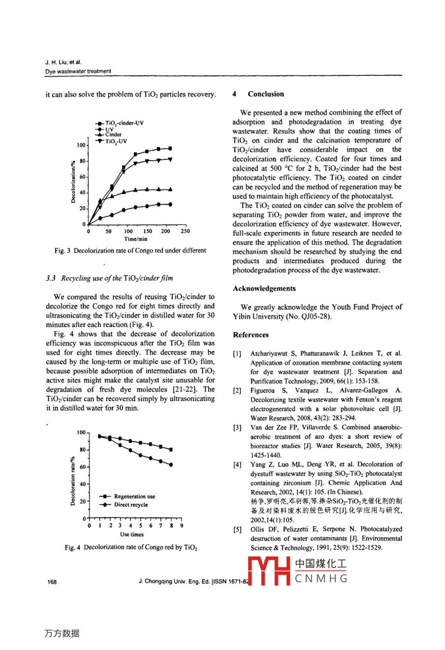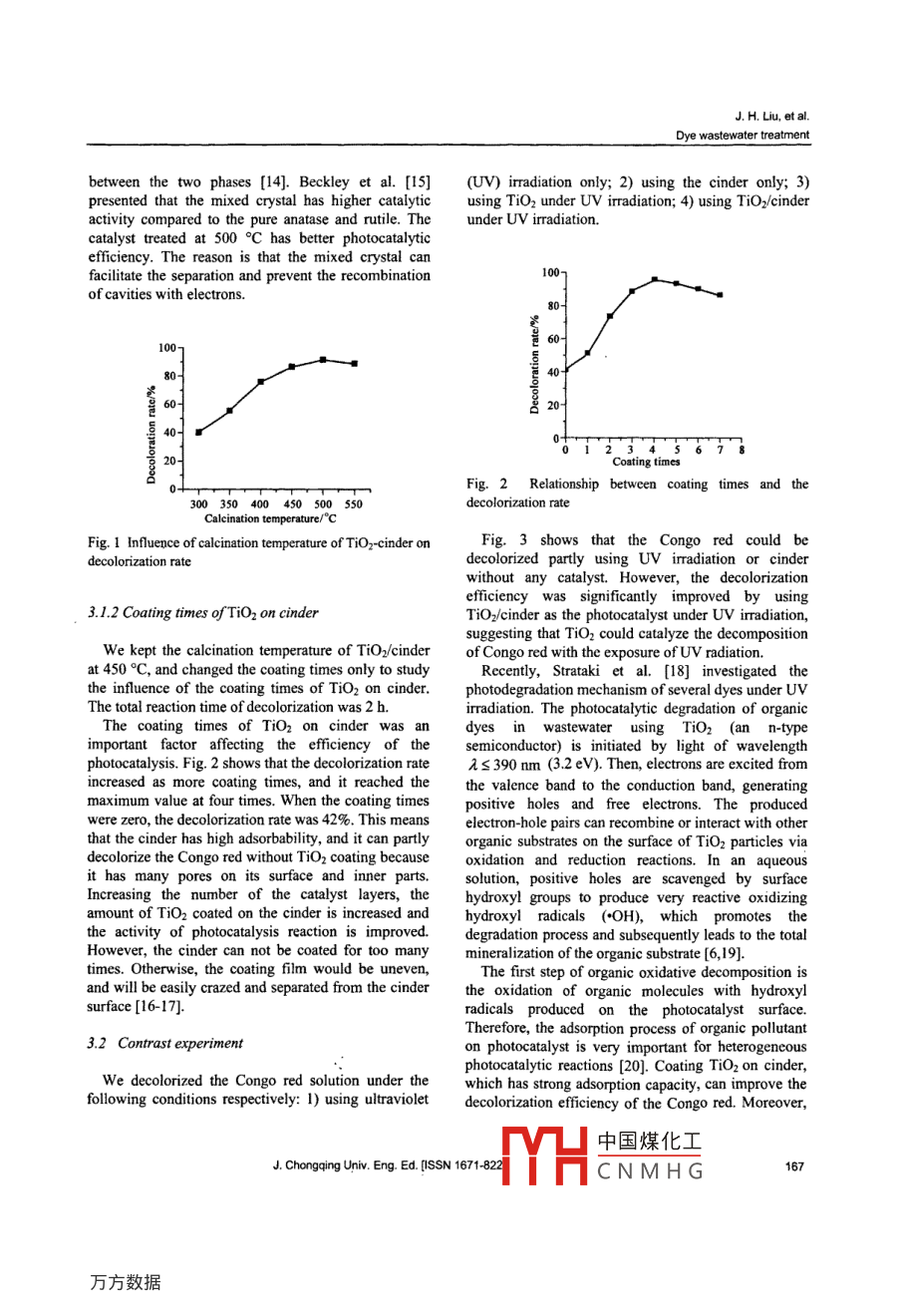 Vol 8 No. 3Joumal of Chongqing University(English Edition)[ISSN 1671-82241September 2009Article|D:1671-8224200903016505Toce this article: LIU Jian-hua, WANG Huai-jun Treating dye wastewater by TiOz coated on coal cinder J J Chongqing Univ. Eng Ed [IssN 1671-82241 2009. 8(3): 165-Treating dye wastewater by tiO, coated on coal cinderLIU Jian-hua 4T, WANG Hai-jun?1 Key La 1Department of Chemical and Material Engineering, Jiangnan University,oratory of Yangtze River Water Environment, Ministry of Education, Yibinity, Sichuan 644000, P R Chinau 214122 P.R. chinaReceived 21 April 2009: received in revised form 5 May 2009Abstract: We investigated the photocatalytic degradation of dye wastewater by using titanium dioxide(tiO2)coated on a coalcinder. The coal cinder was used as the carrier, with a thin film of TiO2 coated on it by using the sol-gel method. Using theCongo red as the model pollutant for dye wastewater, we studied the decolorization efficiency, and effects of Tio film thicknessand roasting temperature on the efficiency. We also evaluated the recycling and regeneration of the immobilized TiO 2(TiO/cinder). Results show that the decolorization rate of Congo red solution was more than 98% after 2 h treatment when wused TiO,/cinder calcined at 500C for 2 h and coated four times as the photocatalyst. At the same time, the TiO//cinderemained high catalytic activity after being reused and regenerated for many timesKeywords: titanium dioxide; coal cinder, Congo red; dye wastewater; photocatalysiCLC number: o643 36Document code: A1 Introductionmethods to reduce biological oxygen demand(BOD),chemical oxygen demand(COD), and suspended solidThe majority of dyes used in the textile industry are are generally satisfactory, except the removal of dyethe azo dyes, accounting for more than 50% of all color [3]. Therefore, the decolorizing treatment of dyecommercial dyes. These dyes include azo groups(N=N) wastewater is a difficult problem to solve. Manymainly bound to substituted benzene or naphthalene researchers have studied on the semiconductor as arings [1]. Dyes are visible even of small quantities photocatalyst in decolorization of dye wastewater [4](0.005 mg), and the color of dyes can interfere with Among a variety of photo catalysts, titanium dioxidetransmission of sunlight into natural streams. (TiO2) is the most preferable due to its non-toxic,Furthermore, many of the azo dyes and their insoluble, stability, high photoactivity and inexpensiveintermediate products, such as aromatic amines, are nature [5-6]. However, the technology oftoxic to aquatic life, carcinogenic and mutagenicphotocatalysis has not been industrially applied tohumans. Consequently, dyes have to be removed from treating wastewater. The main problem of thetextile wastewater before discharge [2]pplication is the separation and reuse of powderDye wastewater is characterized by high photocatalyst. Such difficulty is more serious withconcentration,complicated component, deep color, and nanometer-scale ultrafine powder [7-8difficult to biodegrade. Treatment of wastewater byWe used the coal cinder as a photocatalyst carrier toconventional chemical coagulation and biological solve this problem. Its main compositions are SiozAl2O,, Fe2 O3, and Cao [9-10]. TiO2 attached on it canact as a composite photocatalyst, which shows higherLIU Jian-hua(劉建華} Liujianhua418@126cmcatalytic activity for facilitating the separation ofFunded by the Youth Fund Project of Yibin University(No QJ05- electron and hole during the reaction of photocatalysisThe coal cinder has high adsorbability because it has中國煤化工CNMHGJ. H. Liu, et al.Dye wastewater treatmentmany pores on the surface and inner parts. Therefore, different temperature for 2 h and cooling it at roomwhen used as the photocatalyst carrier, it improves the temperature. Then the TiOz films on the cinder ofeffect of photodegradation of wastewater and changes different layers and roasting temperature were formedrom solid waste into valuables. At present, althoughmany researchers have studied on the wastewater 2.2 Photocatalysis experimentsphotocatalyst carriers, relatively less research has beerThe reactor was a glass beaker(250 mL), in whichcarried out on treating wastewater by using5 g cinder coated with TiO2 film were settled near thephotocatalyst fixed on cinder.surface of solution (about 1 cm). Then, 200 mLCongo red, which is a stable basic azo dye, is a solution of Congo red(20 mg/L)was added into thecompound that contains azo groups(N=N-) Due tobeaker and stirred by a magnetic stirrer. For indoorits high stability, Congo red is commonly used as a experiments, thelight source was a lamp(Philips tLDtitration indicator and a staining agent [ 11]. Moreover, 15 w) emitting between 300 nm and 450 nm. Durings a typical direct azo dye of biphenyl amine, Congothe reaction, the solution was sampled every 30 mined is commonly used in textile industries. Therefore,The decolorization rate (X was determined bywe chose it as a model pollutant in this study.measuring the absorbance at 504 nm using an UV-visible spectrophotometer.2 Experimental detailsX=(4-A)4×100%2.1 Preparation of TiO2 on cinderwhere Ao and A were the initial absorbance and thereacting absorbance of Congo red, respectively2.1. I Pretreatment of cinder3 Results and discussionCoal cinder was pretreated to remove the chlorineion and other organic compounds on it. Loose and 3. I Influence of preparing condition of TiO2 film onporous cinder from the stokehold of Yibin Universitydecolorizing efficiencywas used, which was broken into granule with thediameter of about 1.0 cm. The granules were soaked in 3. 1. I Calcination temperature of TiO.a solution of hydrochloric acid (H20: HCI= 1: 1)for24 h. then taken out and washed for three times withWe performed a set of tests to study the influence of thedistilled water and anhydrous ethanol, respectively. TiO /cinder calcination temperature on the decolorizationAfter dried in an oven