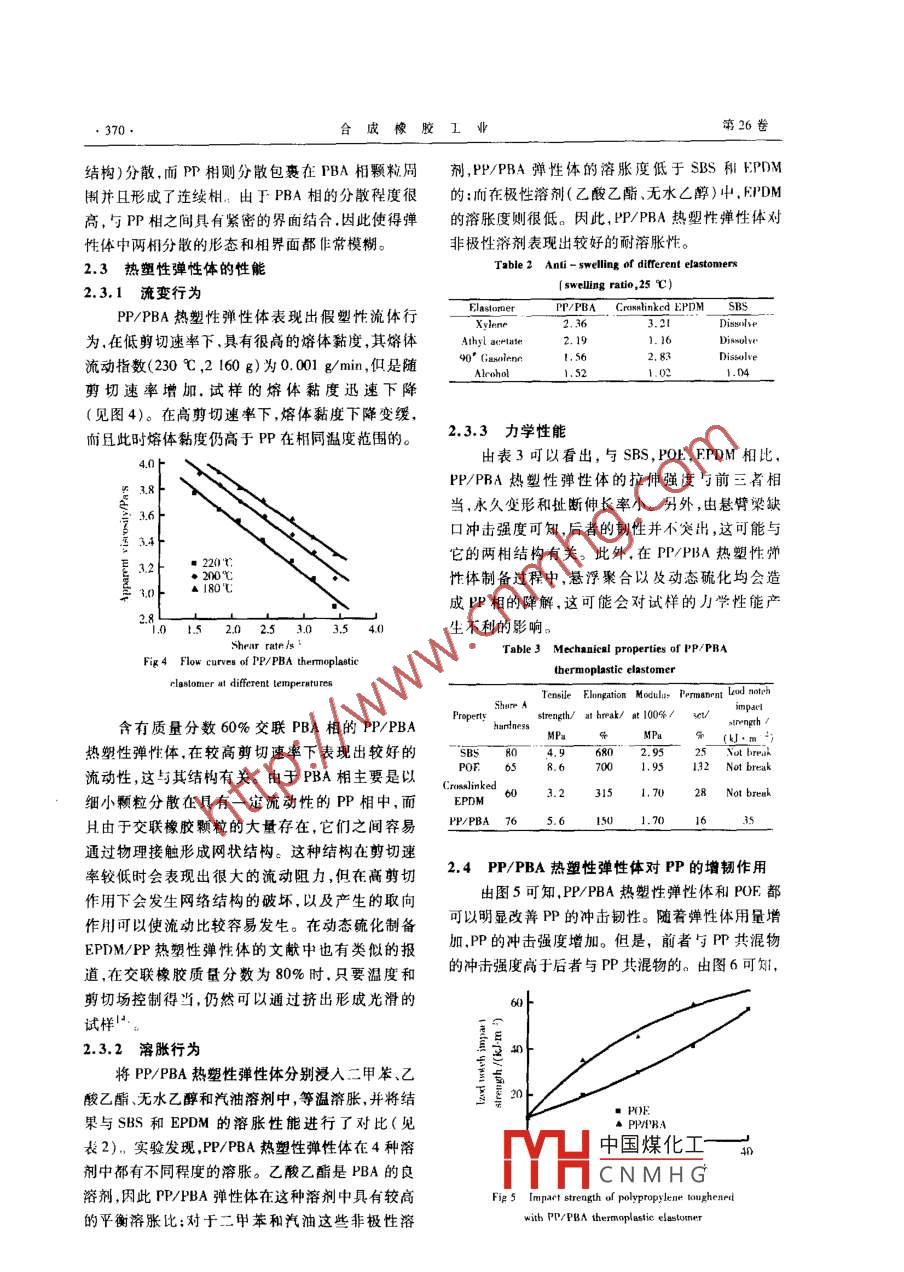 加工·應(yīng)用合成橡膠工業(yè),2003-11-15,26(6):368-371CHINA SYNTHETIC RUBBER INDUSTRY聚丙烯/聚丙烯酸丁酯熱塑性彈性體及其對聚丙烯的增韌作用俞強(qiáng),林明德,莊乃銀(1.江蘇工業(yè)學(xué)院材料工程系江蘇常州213016;2南京奧普特高分子材料有限公司江蘇南京210028)擴(kuò)要:用傅里葉變挾紅外光譜、掃描電鏡和差示掃描量熱計(jì)表征了聚兩端/聚丙烯酸丁酯(PPPBA)熱塑性彈性體的結(jié)構(gòu)和形態(tài)。蛞裏表明,PP/PBA熱塑性彈性體具有兩棡分散站構(gòu),在制備過程中形成的PP與PBA的枝共聚物促進(jìn)了兩相之間的分散以及櫚界面之閩的蚰合。PP/PBA熱塑性彈性體在髙剪切條件下具有良好的流動(dòng)性,而且在非極性溶劑中具有較低的涫脹度。PP/PBA熱壑性彈性體對PP具有明顯的增韌作用。關(guān)鵪詞:聚兩烯釀丁酯;聚丙烯;熱塑性彈性體;共泥物;增韌;力學(xué)性能中圖分類號:TQ334.3文獻(xiàn)標(biāo)識碼:B文章境號:1000-1255(2003)06-0368-04聚丙烯(PP)/聚丙烯酸丁酯(PBA)熱塑性彈(SBS):牌號4452,北京燕山石化公司生產(chǎn)。性體是通過固相接枝和動(dòng)態(tài)硫化技術(shù)制備的新型1.2共混物制備彈性體。其中以所含大量適度交聯(lián)的PBA作將PP/PBA熱塑性彈性體與PP按不同比例為橡膠相,它使PP/PBA熱塑性彈性體在常溫下均勻混合,于200-220℃在雙螺桿擠出機(jī)(TE顯示出橡膠的良好彈性;所含的硬質(zhì)PP,使該熱34型,江蘇南京科亞化工裝備有限公司生產(chǎn),長塑性彈性體在加熱到一定溫度后能夠發(fā)生塑性流徑比為38)上熔融共混。共混物粒料干燥后在注動(dòng),因此這種產(chǎn)品可以作為熱塑性彈性體使用。射機(jī)上注射成拉伸和沖擊標(biāo)準(zhǔn)試樣,分別按照日前有關(guān)這類復(fù)合型熱塑性彈性體的結(jié)構(gòu)和形態(tài)GB/T1042-92和GB/T1843-89測定試樣的拉還不清楚,有人曾提出過兩相互為連續(xù)相結(jié)構(gòu),也伸強(qiáng)度和懸臂梁缺口沖擊強(qiáng)度。有人認(rèn)為在這類彈性體中少量的PP形成了連續(xù)1.3試樣表征相2。本工作通過傅里葉變換紅外光譜計(jì)(FTPP/PBA熱塑性彈性體萃取分離及FTIR分析IR)、掃描電鏡(SEM)、差示掃描量熱計(jì)(DSC)和萃取分離工序?yàn)?(1)以丙酮為溶劑對P!PBA熱毛細(xì)管流變儀方法對PP/PBA熱塑性彈性體的結(jié)塑性彈性體進(jìn)行120h回流萃取,分離出未交聯(lián)構(gòu)和形態(tài)進(jìn)行了表征;同時(shí)對該試樣的耐溶劑行PBA;(2)以二甲苯為溶劑對剩余物進(jìn)行120h萃為以及常溫下的力學(xué)性能進(jìn)行了測定;此外還探取,分離出PP;萃取液經(jīng)沉淀,分離,干燥后稱討了以這種熱塑性彈性體作為增韌劑對PP的增壓膜進(jìn)行FTR分析(IR460型,日本島津公司生韌改性作用。產(chǎn))。抽提時(shí)間的確定以萃取殘余物恒重為準(zhǔn)。DSC分析使用美國PE公司的DSC-4型差示1實(shí)驗(yàn)部分掃描式量熱計(jì),在氮?dú)鈿夥罩袑υ嚇舆M(jìn)行等速升溫掃1.1原材料描,升溫速度為0℃/min,掃描為-50~200℃。PP/PBA熱塑性彈性體:牌號 Parrel7090,江SEM分析將試樣在液氮下冷卻后折斷,斷蘇南京金陵奧普特高分子材料有限公司生產(chǎn)。面經(jīng)中國煤化工 Itachi seM-PP:牌號F401,遼寧盤錦化工廠生產(chǎn)。聚烯烴熱5900CNMHGO塑性彈性體(POE):8150,美國Dow化學(xué)公司生產(chǎn)。三元乙內(nèi)橡膠(EPDM):牌號3745,美國Du收搞日期:2002-11-18;修改日期:203-7-18Pont公司生產(chǎn)。丁二烯-苯乙烯嵌段共聚物作者簡介:俞強(qiáng)(1957—),副教授。已發(fā)表論文40余篇俞強(qiáng)等.聚內(nèi)烯/聚內(nèi)烯酸丁酯熱塑性彈性休及其對聚丙烯的增韌作用流變行為用意大利 Ceast毛細(xì)管流變儀分的相容劑,促進(jìn)兩相之間的分散以及相界面之間別于180,200,220℃測定試樣在不同剪切速率下的結(jié)合。的剪切應(yīng)力,進(jìn)行非牛頓校正后計(jì)算出試樣的表2.2.2DSC分析觀黏度。由圖2可知,PP/PBA熱塑性彈性體具有兩溶脹實(shí)驗(yàn)將試樣在平板硫化機(jī)上壓制成試片,相結(jié)構(gòu),低溫區(qū)較寬的基線移動(dòng)(-40~-10℃分別在二甲苯、乙酸乙酯、無水乙醇和汽油中進(jìn)行與PBA的玻璃化轉(zhuǎn)變相對應(yīng),其玻璃化轉(zhuǎn)變溫度25℃等溫溶脹達(dá)到溶脹平衡后計(jì)算平衡溶脹比。約為-30℃。線型PBA的玻璃化轉(zhuǎn)變溫度約為50℃。PP/PBA熱塑性彈性體中,PBA相的玻2結(jié)果與討論璃化轉(zhuǎn)變區(qū)域向高溫區(qū)偏移,這是由于PBA相2.1萃取分高充分交聯(lián),使得玻璃化轉(zhuǎn)變溫度升高;另一方面交由表1可知,先后用丙酮和二甲苯對PP/聯(lián)也導(dǎo)致玻璃化轉(zhuǎn)變區(qū)域變寬。PBA熱塑性彈性體進(jìn)行萃取,結(jié)果表明試樣中仍含有少量的未交聯(lián)PBA(約為72%)。另外,根據(jù)2次抽提后試樣的減重,可計(jì)算出PP/PBA熱塑性彈性體中約含有1/3的PP剩余的則為交聯(lián)網(wǎng)狀結(jié)構(gòu)的PBA。Table 1 Extraction results of PP/PBa by acetone and xyleneXy】eneExtraction time/hMass of sample before extraction/ 5.7785.362Mase of sample after extraction/k35,422試樣表征DSC譜圖在155℃左右出現(xiàn)了PP相的結(jié)晶22.1FTIR分析熔融峰,與純P的熔融峰(167℃)相比,熔點(diǎn)明實(shí)驗(yàn)表明丙酮萃取物與PBA的FTR譜圖顯下降而熔限則很寬(見圖2)。這種現(xiàn)象表明,完全相同。由圖1可知,PP/PBA熱塑性彈性體P相與PBA相形成了較好的分散