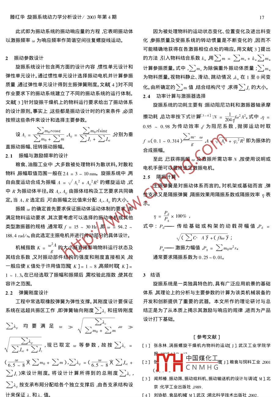 16糧食與飼料工業(yè)/2003年第4期 CEREAL&FEED| NDUSTRY/2003N4旋振系統(tǒng)動力學分析設計滕紅華(武漢工業(yè)學院,湖北武漢430023)摘要理論上分析了旋振系統(tǒng)的動力學問題在所抽象出的力學模型的基礎上給出了振動體系的主要參數設計計算方法。關鍵詞旋振系統(tǒng)動力學分析振動設計圖分類號S375文獻標識碼∶A文章編號:1003-62012003)4-0016-02Dynamical Analysis and Parameterization Design of a Helical vibration System滕紅華講師ABSTRACt The dynamics of a helical vibration system is analyzed, and the calculation method for theparametrization design of the system is put forth on the basis of an abstracted mechanical modelKEYWORDS helical vibration system dynamic analysis i vibration design在糧食、油脂原料的制備和預處理中以旋振系統(tǒng)為底分別為激振器總偏重在κ方向旳激振力和在水平面內繞ε軸層的設備越來越多地被應用于各個不同的作業(yè)中。其中最扭轉的激振力矩∑m為偏重總質量;為偏重塊中心對振典型的應用當屬旋振流化干燥機這是普通平臺式振動流化動器主軸的偏心距ε為激振器軸線偏置角γ為激振器旋床的一種創(chuàng)新設計。文獻1玢析了該類干燥機的使用特性轉相位為激振器主軸軸心半距m為振動體計算質量及其物料運動機制指出了其獨特的應用效果。另一種以旋f為振動體位移扭轉當量阻尼系數心k為支承振系統(tǒng)為激振源的應用裝備是振動式物料調質機2主要是彈簧z向剛度和繞z軸的扭轉剛度J為計算質量偏重完成物料的水分及溫度調節(jié)。文獻同時指出由于旋振系統(tǒng)對z軸的轉動慣量。給物料提供的復合空間螺線運動及交變的動力作用使得物料受到強制熱交換和振動活化因而該系統(tǒng)也能用于冷卻機、破拱器、旋振篩等裝置的設計中。本文在既有工作的基礎上撒開具體的機型從理論上抽象岀旋振系統(tǒng)的力學模型分析其動力學特性,為此類裝備的應用及其結構化設計提供理論上的指導。激振器激振器1旋振系統(tǒng)的動力學模型及動力響應分析旋振系統(tǒng)通常由兩臺振動電機為激振器激振器反向對圖1旋振力學模型稱安裝于由彈性元件支承的振動體兩側或底部。兩臺激振方程1)(2)為常系數二階微分方程根據工程應用的器同步反向轉動振動體在激振器的合力及力偶作用下產實際對方程作合理簡化。因自由振動分量隨時間而衰減至生垂直方向和水平扭轉方向兩自由度振動兩自由度振動合零只考慮其位形響應的強迫振動分量。又因阻尼對遠超共成為空間螺旋佳復運動。其簡化的力學模型如圖1。參見文振區(qū)工作的振體振幅的影響較小忽略系統(tǒng)阻尼作用并利獻3]可以建立該系統(tǒng)的數學模型——振動微分方程組用系統(tǒng)在慣性區(qū)工作的實際得方程的解為△)+fA:z=F(t)(1)中國煤化工(3)+∑)+A+∑A甲=M(1)(2)CNMHG式中(4)F(tmo@ rose sinat, M(t)mow rlsinesinatJ+∑J收稿日期3方數掘作者簡介滕紅華1968-)女講師從事糧油及食品機械的教學和科研工作,滕紅華旋振系統(tǒng)動力學分析設計/2003年第4期此式即為振動系統(tǒng)的振動響應量的方程,它表明振動體因為被處理物料的運動狀態(tài)變化、位置變化及進出料變以激振頻率ω為響應頻率作簡諧空間往復螺旋線運ˉ化參振質量及受振系統(tǒng)的轉動慣量是不斷變化的,因而不可能精確地獲得在各激振相位點處的響應。用文獻3]提出2振動參數設計的方法別入物料結合系數k用∑m=∑m,+k∑m旋振系統(tǒng)設計包含兩方面的設計內容慣性單元設計和計算參振質量。式中,∑m,為除偏重外振動體質量∑m彈性單元設計通過慣性單元設計選擇振動電杋機并計算參振為物料質量。視物料靜止、滑動跳動情況k在1至0間變質量通過彈性單元設計得到主振彈簧剛度文獻4]對不同化由所確定的∑m值結合結構尺寸求得∑!的大作業(yè)要求下的振動系統(tǒng)建立了不同的振動系統(tǒng)的運行體制。2.4功率計算與激振器選擇文獻3]針對旋振干燥機上的物料運行要求給出了振動體系旋振系統(tǒng)的功耗主要有振動阻尼功耗和激振器軸承摩的設計原則。事實上這些都是振動設計時的約束條件必須按照這些條件來設計和選擇主要參數擦功耗總功率按下式計算3-41:Nf2A2式中0.95~0.98為傳動效率f為阻尼系數,拋擲運動時取設A“+∑m4=3m分別為垂Jf=(0.1~0.314)4=√A2+92R即為振體的直振動振幅、扭轉振動振幅。合成振幅。2.1振幅與激勵頻率的設計至此已獲得振幅ω及激振所需功率N按使用說明或糧食、油脂工業(yè)中大多數被處理物料為散狀料。對散粒電機手冊可以最終選定激振電機。物料振幅取值范圍一般在2A=3~10m旋振系統(tǒng)中兩2.5隔振計算自由度運動合成為振幅A=√A2+A42R2的螺旋運動式主振彈簧是對振動體系而言的。對機架或基礎而言彈中R為振動體半徑故A、4由振體結構及工藝要求共同確性支承又是隔振彈簧隔振效果用隔振系數或隔振效率η表定。當A、R選定后可由振幅之比值來分配A、A的大振頻ω的確定首先要求保證振動體運動體制的要求即P滿足物料運動要求其次要考慮可以選擇的振動電機或其他n=p×100%類型激振器的規(guī)格通常取∫=15~30H即a=9.2-式中:P一傳給基礎或構架的動載荷幅值,P」=4rad/s由此選定主振電機并進行傳動部分的具體設計。√(∑C.A)+(A)機槭指數κ。c2A的大小既直接影響物料運行狀態(tài)及P—激振力幅值,P=△my2r其結合系數又