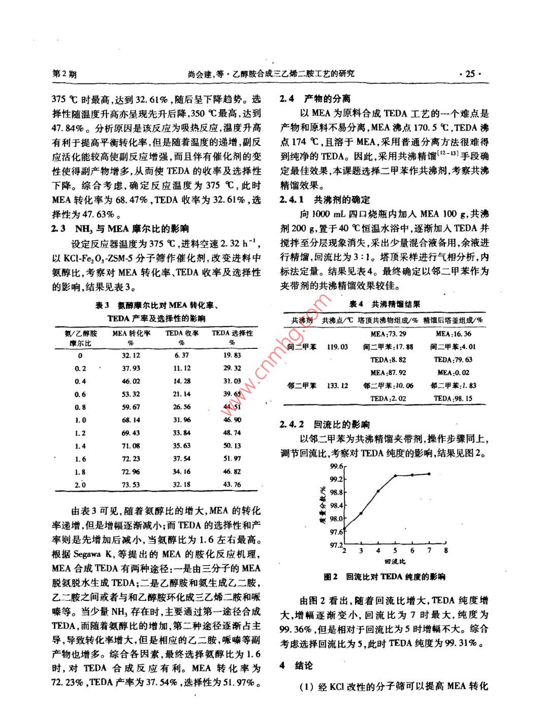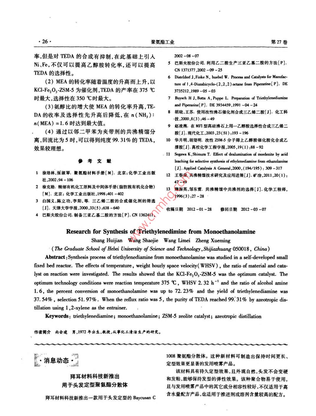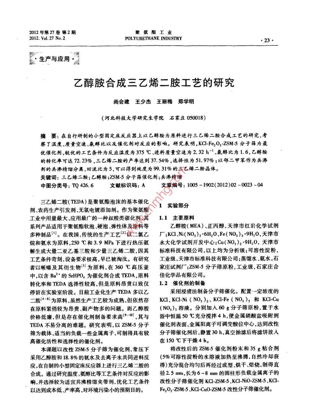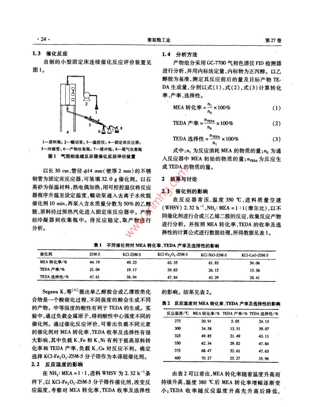 2012年第27卷第2期聚氨酯工業(yè)2012.Vol.27No.2POLYURETHANE INDUSTRY生產(chǎn)與應(yīng)用乙醇胺合成三乙烯二胺工藝的研究尚會建王少杰王麗梅鄭學(xué)明(河北科技大學(xué)研究生學(xué)院石家莊050018)摘要:在自行研制的小型固定床反應(yīng)器上以乙醇胺為原料進行三乙烯二胺合成工藝的研究,考察了溫度、質(zhì)量空速、氣醇比以及催化劑對反應(yīng)的影響。研究表明,KC-Fe2O3-ZSM5分子篩為最優(yōu)催化劑,較優(yōu)的工藝條件為反應(yīng)溫度為375℃、進料質(zhì)量空速為2.32h1、氨醇比為1.6,乙醇胺的轉(zhuǎn)化率可達72.23%,三乙烯二胺的產(chǎn)率達到37.54%,選擇性為51.97%;以鄰二甲苯作為共沸劑的共沸精餾分離,回流比為5,可以得到純度為99.31%的三乙烯二胺晶體。關(guān)鍵詞:三乙烯二胺;乙醇胺;ZSM5分子篩催化劑;共沸精餾中圖分類號:TQ426.6文獻標識碼:A文章編號:1005-1902(2012)02-0023-0三乙烯二胺(TEDA)是聚氨酯泡沫的基本催化1實驗部分劑、農(nóng)藥生產(chǎn)引發(fā)劑、無氯電鍍添加劑。作為聚氨酯工業(yè)中用量最大、應(yīng)用最廣的一種叔胺類催化劑,其1.1主要原料系列產(chǎn)品適用于聚氨酯軟泡硬泡、彈性體及涂料等乙醇胺(MEA)、正丙醇,天津市紅巖化學(xué)試劑多種制品。在我國傳統(tǒng)的生產(chǎn)工藝2以二氯乙廠;KCl、Ni(NO3)2·6H2O、Fe(NO3)39H2O,天津市烷和氨水為原料,250℃和3.9MPa下進行熱壓氨永大化學(xué)試劑開發(fā)中心;Cu(NO3)29H2O,天津市解生成大量二亞乙基三胺和少量三乙烯二胺,因其標準科技有限公司,以上均為分析級;可溶性淀粉,工藝條件苛刻設(shè)備要求極高,早已被淘汰。有研究工業(yè)級,天津市標準科技有限公司;蒸餾水、氨水,石者以哌嗪及其衍生物3為原料,在360℃高壓釜家莊試劑廠;zSM5分子篩原粉,工業(yè)級,石家莊合中,以含Ba2的 SrHPO4為催化劑合成TEDA,原料佳化學(xué)品有限公司。轉(zhuǎn)化率和TEDA選擇性較高但是原料昂貴以致僅1.2催化劑的制備停留在實驗室階段。目前工業(yè)化生產(chǎn)TEDA多以乙采用浸漬法制備分子篩催化。配置一定濃度的二胺為原料,雖然生產(chǎn)工藝較為成熟但依然存KCl、KCNi(NO3)2、KCFe(NO3)3和KCcu在原料緊俏較為昂貴副產(chǎn)物多的問題。而乙醇胺(NO3)2溶液。分別加入60g分子篩原粉,置于水價格低廉但是存在催化劑制備要求高-,其與浴中恒溫50℃充分攪拌4h,使金屬硝酸鹽吸附到TEDA不易分離的難題。研究表明,以ZSM5分子催化劑表面,金屬陽離子可調(diào)變酸位中心,達到改性篩為載體,適當(dāng)?shù)呢撦d一些金屬離子,可制得具有較分子篩催化劑后靜置30h,真空抽濾后將濾餅放入高催化活性和選擇性的催化劑。在150℃下干燥4h。本課題以改性ZSM分子篩為催化劑,常壓下將改性后的ZSM5催化劑粉末和35g粘合劑采用乙醇胺和188%的氨水及去離子水共同進料反(5%可溶性淀粉的水溶液加熱至沸騰,自然冷卻獲應(yīng),在自制的小型固定床反應(yīng)器上進行三乙烯二胺的得)充分混合均勻后再經(jīng)過成型烘干、焙燒制得直合成。通過研究溫度氨醇比等工藝條件對反應(yīng)的影徑2.5mm,長為6-8mm的圓柱形負載金屬離子的響,并選擇較為適宜共沸精餾夾帶劑,優(yōu)化工藝條件改性分子篩催化劑KCl-ZSM5、 KCl-NiO-ZSM5、KC1以達到成本低產(chǎn)率高對環(huán)境污染小的預(yù)期目的。Fe2O3ZSM5KC1 CuO-ZSM5改性分子篩催化劑24聚氨酯工業(yè)第27卷1.3催化反應(yīng)1.4分析方法自制的小型固定床連續(xù)催化反應(yīng)評價裝置見產(chǎn)物組分采用CC700氣相色譜儀FD檢測器圖1進行分析,并用內(nèi)標法定量,內(nèi)標物為正丙醇。以乙醇胺為基準測定其反應(yīng)前后的量及目標產(chǎn)物TEDA生成量,分別以式(1)式(2),式(3)計算轉(zhuǎn)化率、產(chǎn)率、選擇性。MEA轉(zhuǎn)化率=×100%(1)TEDA產(chǎn)率x100%tEDAx100%1一原料瓶;2一蠕動泵;3一溫控儀;4-固定床反應(yīng)器;TEDA選擇性(3)凝管;6—產(chǎn)物收集瓶;7一緩沖瓶;8—尾氣收集瓶式中:n1為反應(yīng)消耗MEA的物質(zhì)的量;no為通圖1氣固相連續(xù)反應(yīng)器催化反應(yīng)評價裝置人反應(yīng)器中MEA初始的物質(zhì)的量;nmA為反應(yīng)生以長30cm、管徑d14mm(壁厚2mm)的不銹成TEDA的物質(zhì)的量鋼管為固定床反應(yīng)器,可裝填32.0g催化劑。以石2結(jié)果與討論英砂為保溫材料熱電偶加熱,用可控控溫儀將反應(yīng)器程序升溫至設(shè)定溫度,蠕動泵通入去離子水吹脫2.1催化劑的影響催化劑10min,再泵入含水質(zhì)量分數(shù)為50%的乙醇在反應(yīng)器常壓、溫度350℃、進料質(zhì)量空速胺原料經(jīng)過預(yù)熱汽化進入固定床反應(yīng)器中。產(chǎn)物(WHSV)232h、NH3MEA=1:1(摩爾比),以不同催化劑進行合成三乙烯二胺的反應(yīng)收集反應(yīng)產(chǎn)物經(jīng)冷凝器到收集瓶中。待反應(yīng)穩(wěn)定,取產(chǎn)物進行進行分析。并按照MEA轉(zhuǎn)化率TEDA的收率及選分析。擇性的計算公式進行數(shù)據(jù)處理,所得數(shù)據(jù)見表1。1不同催化劑對MEA轉(zhuǎn)化率、TEDA產(chǎn)率及選擇性的影響催化劑ZSM-5KCl-ZSM-SKCI-Fe2O3-ZSM-5KCI-NiO-ZSM-5KCl-CuO-ZSM-5MEA轉(zhuǎn)化率/%44.1962.3561.83rEDA產(chǎn)率/%0419.29.8326.1515.36TEDA選擇性/%47.6138.9447.84Segawa K,等提出單乙醇胺合成乙撐胺類化的影響。結(jié)果見表2合物是一個酸催化過程,不同強度的酸會生成不同的產(chǎn)物。中等強度的酸性有利于TEDA的生
