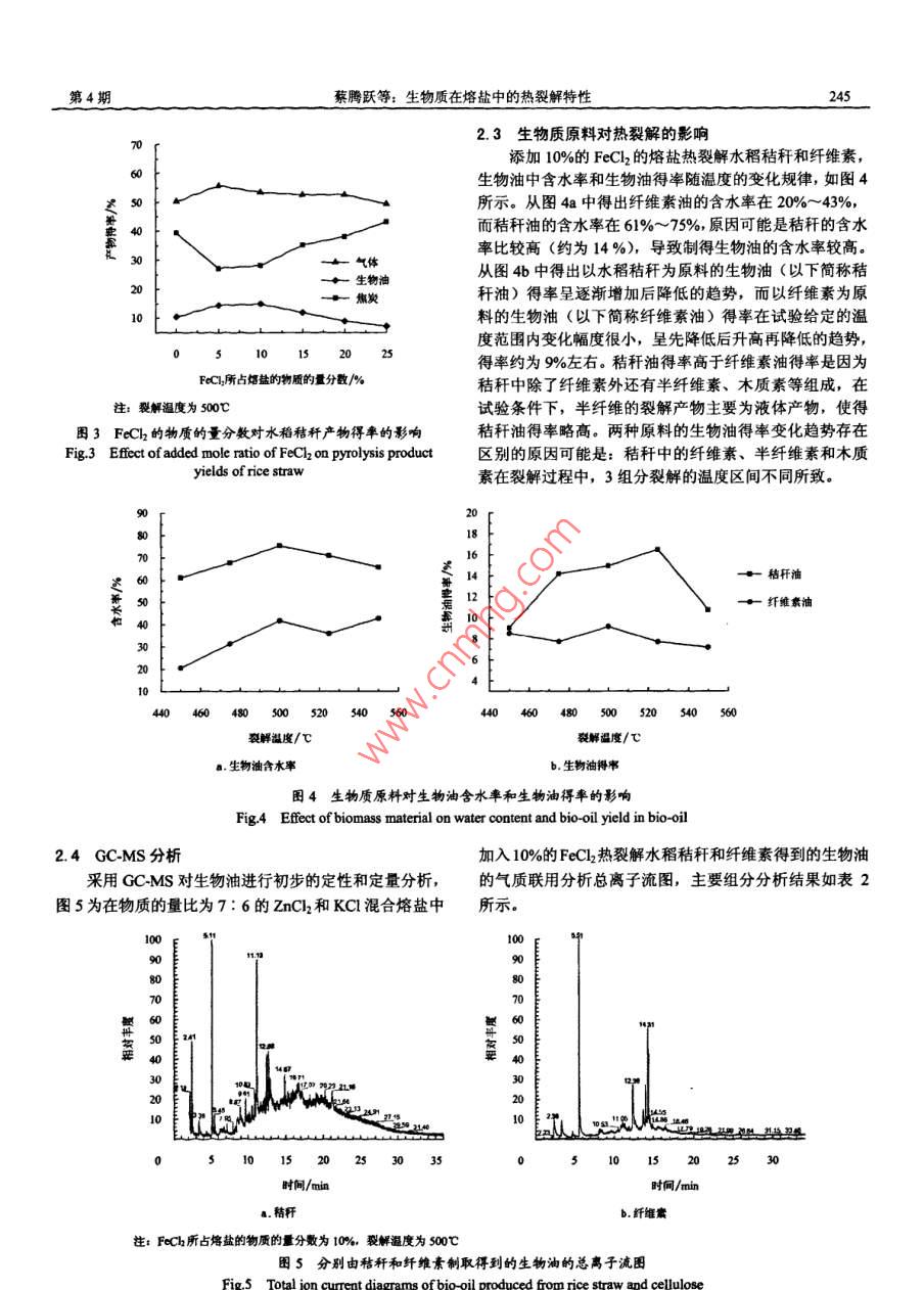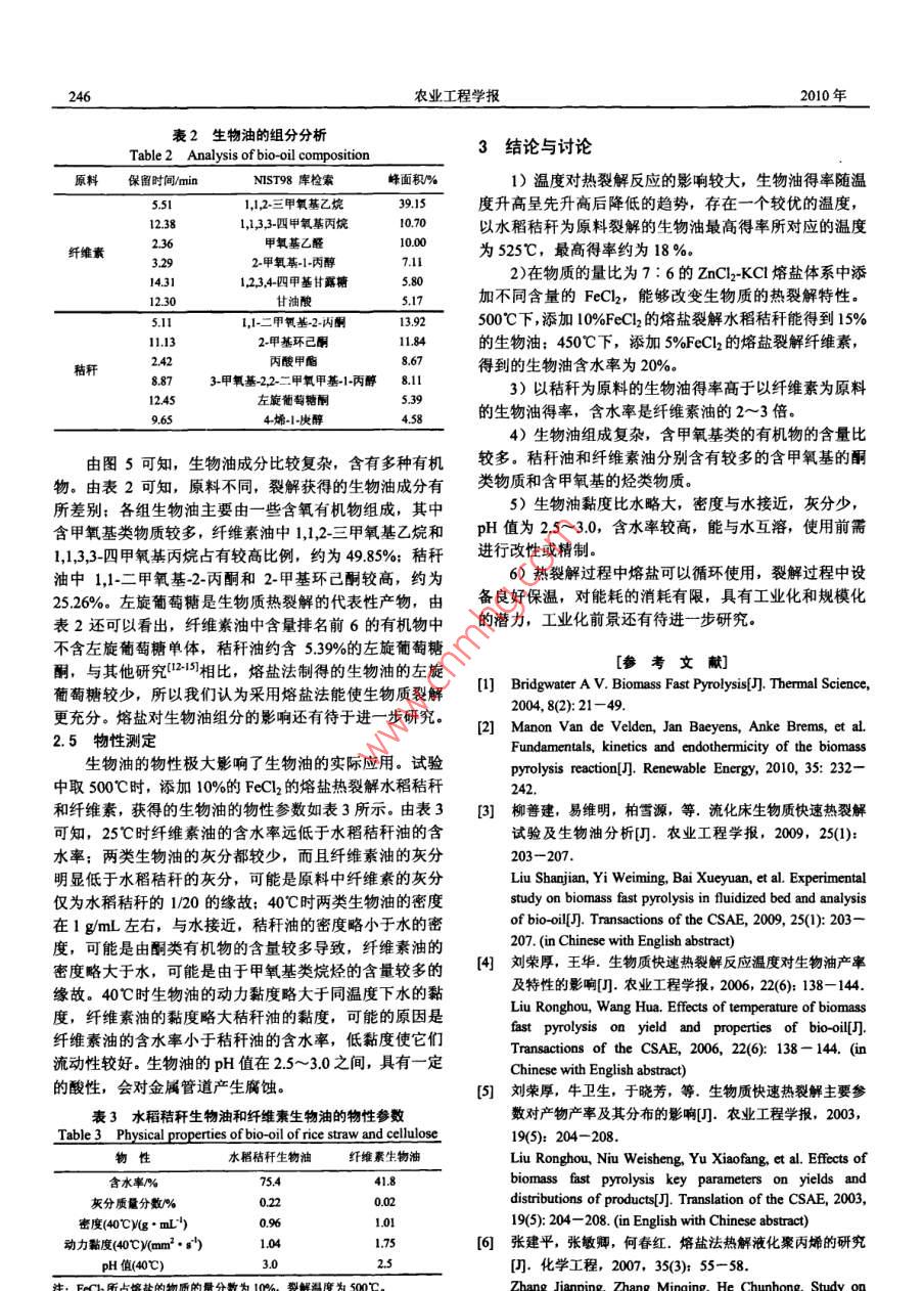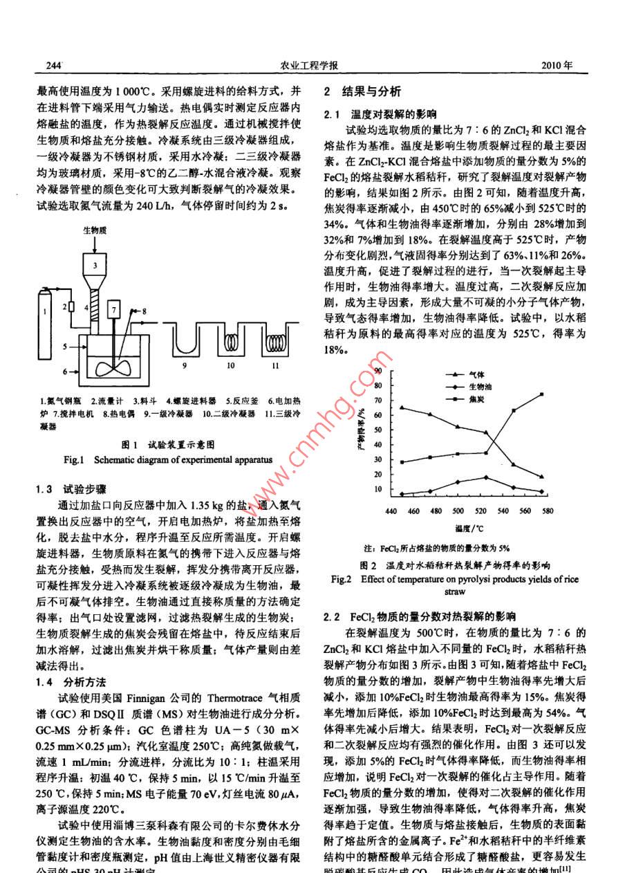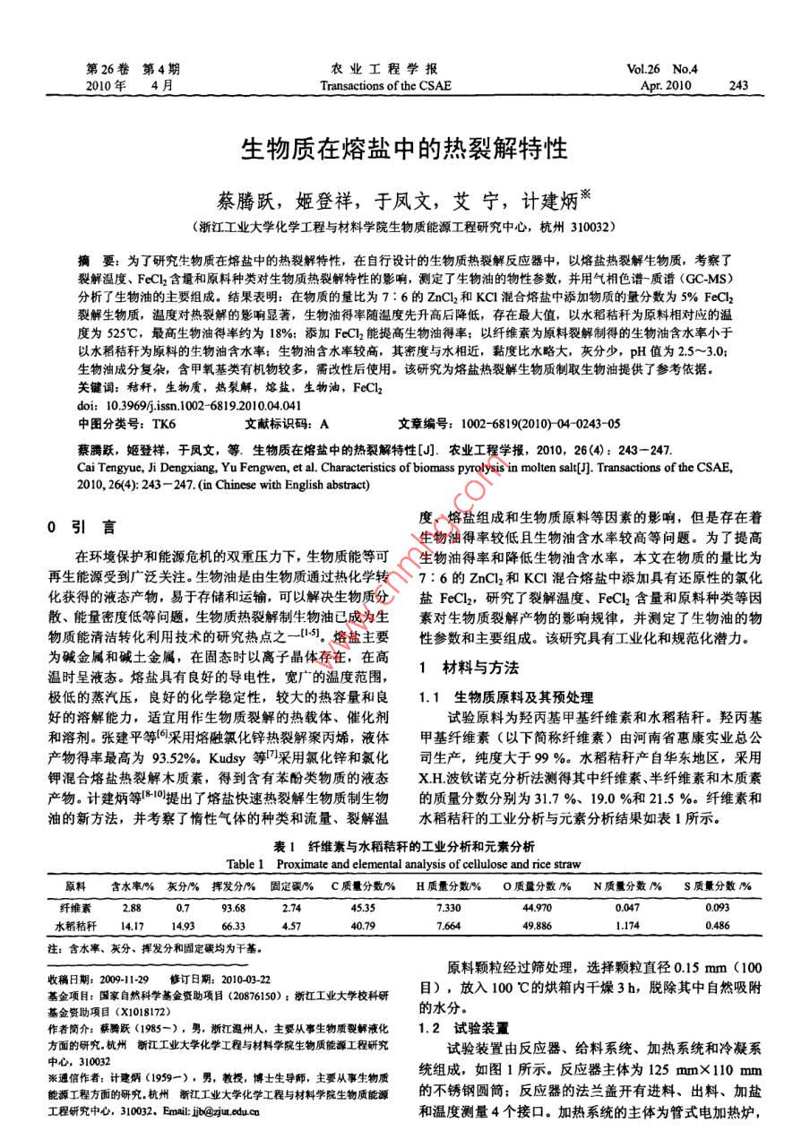 第26卷第4期農(nóng)業(yè)工程學(xué)報Vol 26 No, 4010年4月Transactions of the CSaeApr.2010243生物質(zhì)在熔鹽中的熱裂解特性蔡騰躍,姬登祥,于鳳文,艾寧,計建炳※(浙江工業(yè)大學(xué)化學(xué)工程與材料學(xué)院生物質(zhì)能源工程研究中心,杭州310032)摘要:為了研究生物質(zhì)在熔鹽中的熱裂解特性,在自行設(shè)計的生物質(zhì)熱裂解反應(yīng)器中,以熔鹽熱裂解生物質(zhì),考察了裂解溫度、FeCl2含量和原料種類對生物質(zhì)熱裂解特性的影響,測定了生物油的物性參數(shù),并用氣相色譜質(zhì)譜(GCMS)分析了生物油的主要組成。結(jié)果表明:在物質(zhì)的量比為7:6的ZnCl2和KC1混合熔鹽中添加物質(zhì)的量分數(shù)為5%FeCl裂解生物質(zhì),溫度對熱裂解的影響顯著,生物油得率隨溫度先升高后降低,存在最大值,以水稻秸稈為原料相對應(yīng)的溫度為525℃,最高生物油得率約為18%;添加FeCl2能提高生物油得率;以纖維素為原料裂解制得的生物油含水率小于以水稻秸稈為原料的生物油含水率:生物油含水率較高,其密度與水相近,黏度比水略大,灰分少,pH值為25~3.0;生物油成分復(fù)雜,含甲氧基類有機物較多,需改性后使用。該研究為熔鹽熱裂解生物質(zhì)制取生物油提供了參考依據(jù)關(guān)鍵詞:秸稈,生物質(zhì),熱裂解,熔鹽,生物油,FeCldoi:10.3969/issn.1002-6819201004041中圖分類號:TK6文獻標識碼:A文章編號:1002-6819(2010)040243-05蔡騰躍,姬登樣,于鳳文,等.生物質(zhì)在熔鹽中的熱裂解特性[J.農(nóng)業(yè)工程學(xué)報,2010,26(4):243-247Cai Tengyue, Ji Dengxiang, Yu Fengwen, et al. Characteristics of biomass pyrolysis in molten salt[J]. Transactions of the CSae,2010, 26(4): 243-247 (in Chinese with English abstract)引言度、熔鹽組成和生物質(zhì)原料等因素的影響,但是存在著生物油得率較低且生物油含水率較高等問題。為了提高在環(huán)境保護和能源危機的雙重壓力下,生物質(zhì)能等可生物油得率和降低生物油含水率,本文在物質(zhì)的量比為再生能源受到廣泛關(guān)注。生物油是由生物質(zhì)通過熱化學(xué)轉(zhuǎn)7:6的ZnCl2和KCl混合熔鹽中添加具有還原性的氯化化獲得的液態(tài)產(chǎn)物,易于存儲和運輸,可以解決生物質(zhì)分鹽FeCl2,研究了裂解溫度、FeCl2含量和原料種類等因散、能量密度低等問題,生物質(zhì)熱裂解制生物油已成為生素對生物質(zhì)裂解產(chǎn)物的影響規(guī)律,并測定了生物油的物物質(zhì)能清潔轉(zhuǎn)化利用技術(shù)的研究熱點之一15熔鹽主要性參數(shù)和主要組成。該研究具有工業(yè)化和規(guī)范化潛力為堿金屬和堿土金屬,在固態(tài)時以離子晶體存在,在高溫時呈液態(tài)。熔鹽具有良好的導(dǎo)電性,寬廣的溫度范圍,1材料與方法極低的蒸汽壓,良好的化學(xué)穩(wěn)定性,較大的熱容量和良1.1生物質(zhì)原料及其預(yù)處理好的溶解能力,適宜用作生物質(zhì)裂解的熱載體、催化劑試驗原料為羥丙基甲基纖維素和水稻秸稈。羥丙基和溶劑。張建平等采用熔融氯化鋅熱裂解聚丙烯,液體甲基纖維素(以下簡稱纖維素)由河南省惠康實業(yè)總公產(chǎn)物得率最高為9352%Kudy等采用氯化鋅和氯化司生產(chǎn),純度大于99%。水稻秸稈產(chǎn)自華東地區(qū),采用鉀混合熔鹽熱裂解木質(zhì)素,得到含有苯酚類物質(zhì)的液態(tài)XH波欽諾克分析法測得其中纖維素、半纖維素和木質(zhì)素產(chǎn)物。計建炳等提出了熔鹽快速熱裂解生物質(zhì)制生物的質(zhì)量分數(shù)分別為31.7%、19.0%和21.5%纖維素和油的新方法,并考察了惰性氣體的種類和流量、裂解溫水稻秸稈的工業(yè)分析與元素分析結(jié)果如表1所示。表1纖維素與水稻秸稈的工業(yè)分析和元素分析Table 1 Proximate and elemental analysis of cellulose and rice straw原料含水率%灰分%揮發(fā)分%固定碳%C質(zhì)量分數(shù)%H質(zhì)量分數(shù)%O質(zhì)量分數(shù)%N質(zhì)量分數(shù)%S質(zhì)量分數(shù)%纖維素2.8845.35733044.9700093水稻秸稈14174988611740486注:含水率、灰分、揮發(fā)分和固定碳均為干基原料顆粒經(jīng)過篩處理,選擇顆粒直徑0.15mm(100基金項目,國家自然科學(xué)基金資助項日(2650,浙江工業(yè)大學(xué)??蒲心?,放入100℃的烘箱內(nèi)干燥3b,脫除其中自然吸附基金資助項目(X1018172)的水分。作者簡介:蔡騰躍(1985-),男,浙江溫州人,主要從事生物質(zhì)裂解液化1.2試驗裝置方面的研究杭州新江工業(yè)大學(xué)化學(xué)工程與材料學(xué)院生物質(zhì)能源工程研究試驗裝置由反應(yīng)器、給料系統(tǒng)、加熱系統(tǒng)和冷凝系中心310032※通信作者:計建炳(1959-),男,教授,博士生導(dǎo)師,主要從事生物質(zhì)統(tǒng)組成,如圖1所示。反應(yīng)器主體為125mm×110mm能源工程方面的研究,杭州新江工業(yè)大學(xué)化學(xué)工程與材料學(xué)院生物質(zhì)能源的不銹鋼圓筒;反應(yīng)器的法蘭蓋開有進料、出料、加鹽工程研究中心,310032,Fma:i@小edu.cn和溫度測量4個接口。加熱系統(tǒng)的主體為管式電加熱爐,244農(nóng)業(yè)工程學(xué)報2010年最高使用溫度為1000℃。采用螺旋進料的給料方式,并2結(jié)果與分析在進料管下端采用氣力輸送熱電偶實時測定反應(yīng)器內(nèi)21溫度對裂解的影響熔融鹽的溫度,作為熱裂解反應(yīng)溫度。通過機械攪拌使試驗均選取物質(zhì)的量比為7:6的ZnCl2和KC1混合生物質(zhì)和熔鹽充分
